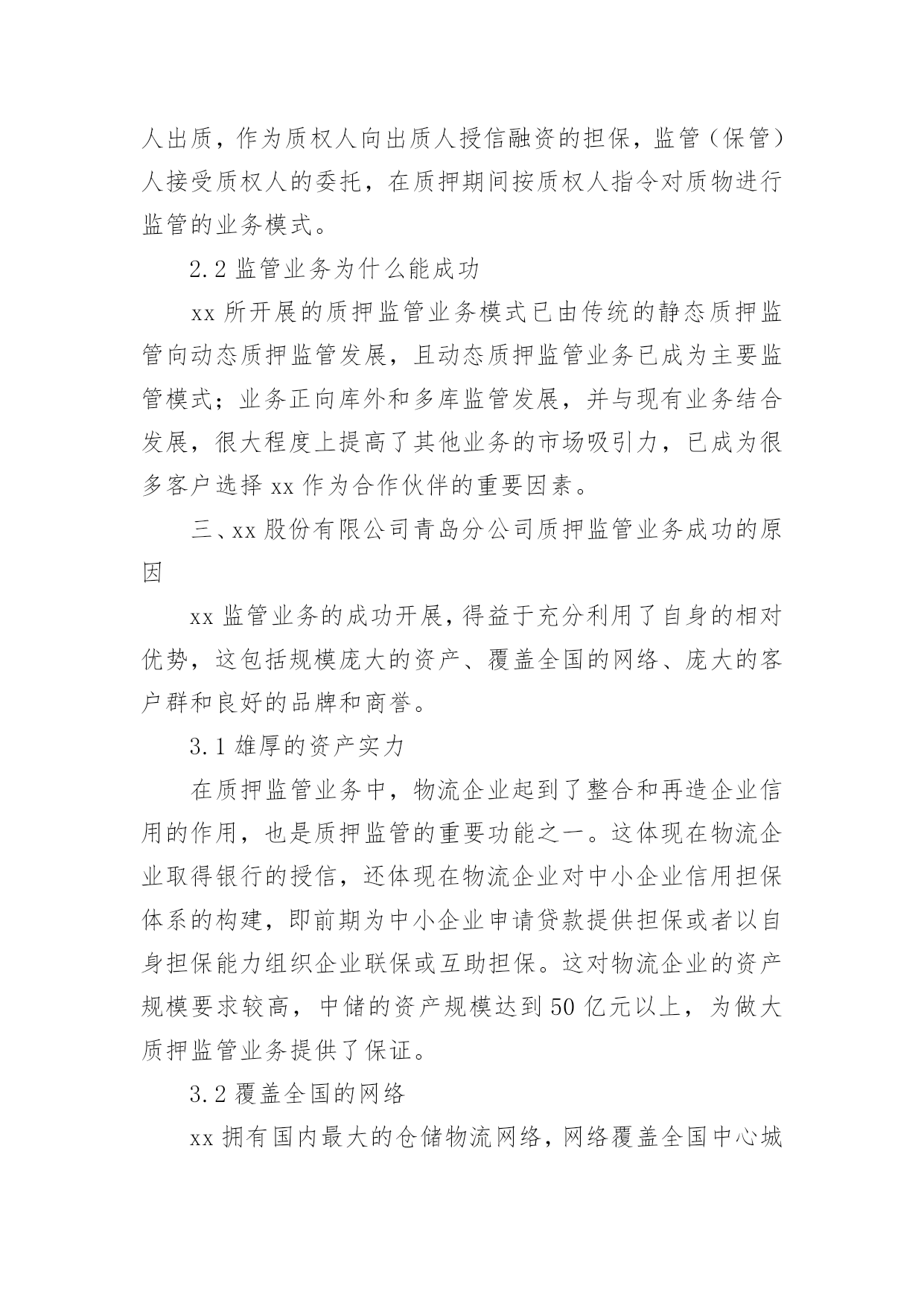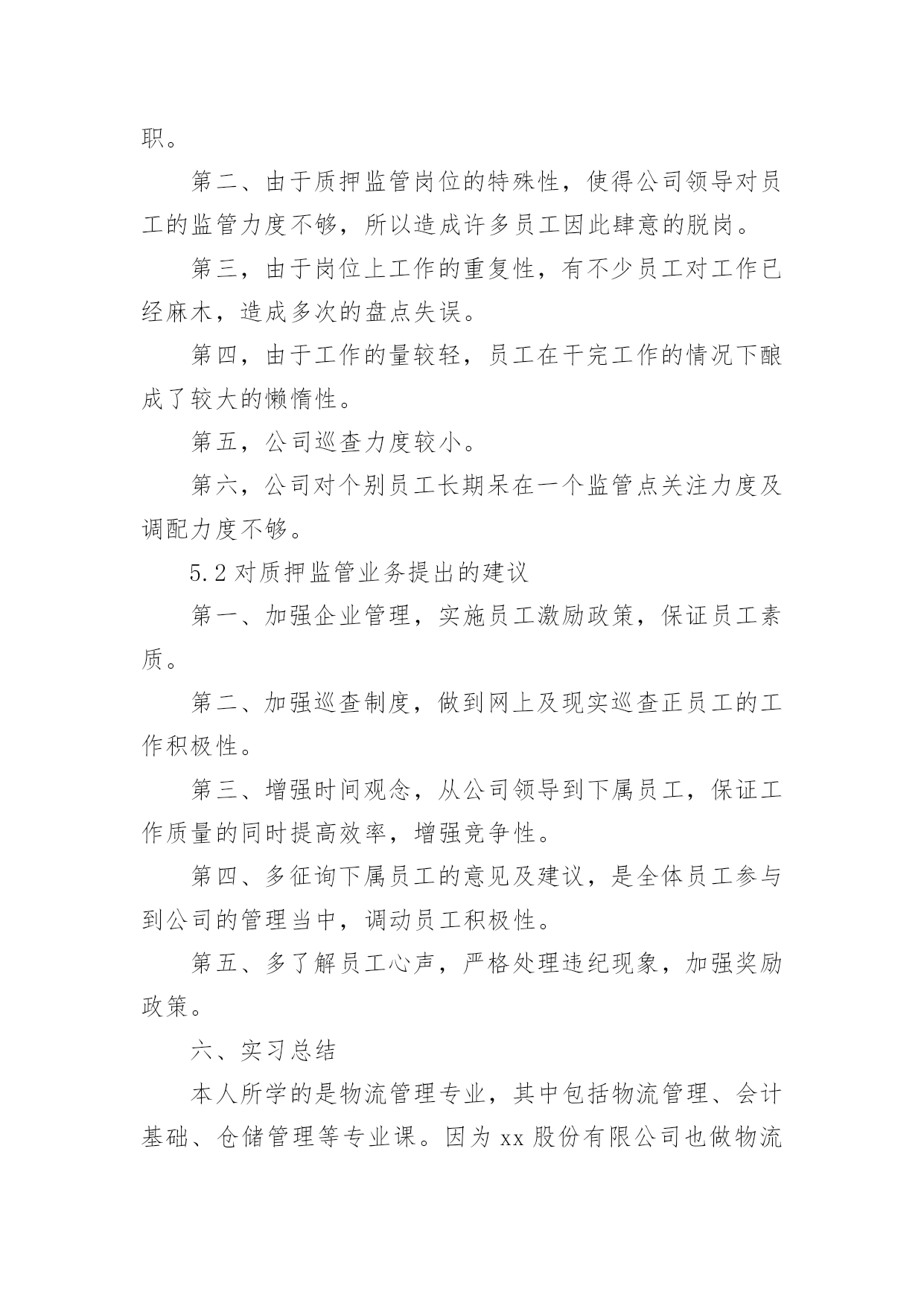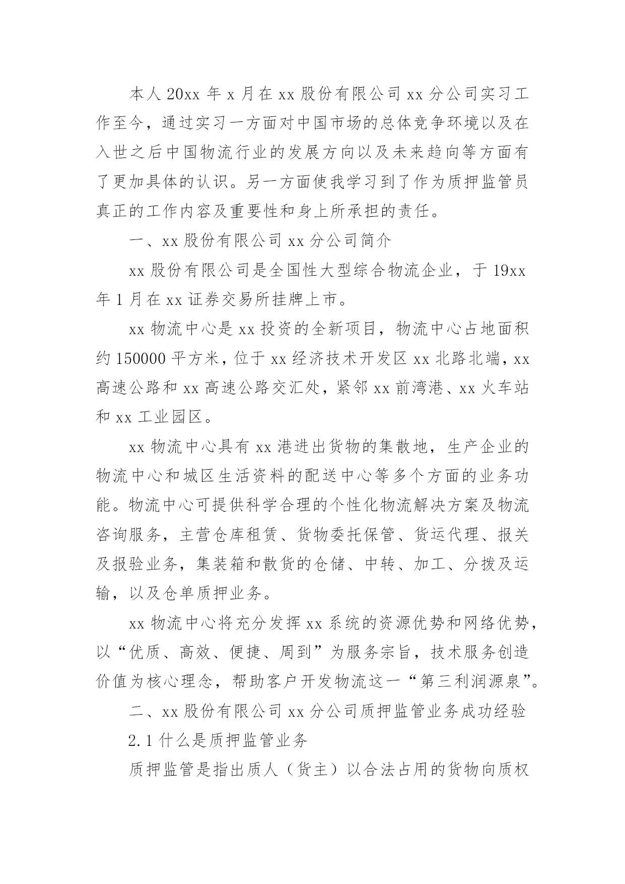 物流专业实习报告关于物流专业实习报告汇总七篇在当下这个社会中,报告的用途越来越大,通常情况下,报告的内容含量大、篇幅较长。相信很多朋友都对写报告感到非常苦恼吧,下面是小编精心整理的物流专业实习报告7篇,希望对大家有所帮助。物流专业实习报告篇1一:实习目标:为了以后能更好的适应工作和学习,学校组织到xx物流配送中心进行动期十天的实习。重要是为了懂得物流的作业流程,以便对我国的物流业能有更深的懂得。二:实习请求:了解物流的特色,佳吉货运,主要装备和作业流程,对其进行剖析.并根据学习的理论提出自己的看法.三:实习单位简介:配送中心是以组织配送性销售或供给,履行实物配送为重要职能的流通型结点。具有集货中心、分货中心的职能。xx公司是在xx连锁超市基本了发展起来的大型企业,拥有大型百货购物中心,社区连锁超市,中心城市方便岛为支柱的三大贸易,并以现代物流配送中心为支撑平台.xx物流配送中心是一个中等范围的物流配送基地,是综合性的物流配送中心。兼有转运和集散功效,也可以扩大至配送和流通加工的功效,因此在计划与设计方面可操作性更高。xxx物流配送中心重要分为:收货、分货、验货、退货四大部门,各个部分之间相互和谐和相互配合,密不可分。xx公司正逐步实现"以中心城市的中型百货购物中心和专业化超市为核心,以中小城市的大型综合超市和海方便岛为两翼,以现代化的大型物流配送中心为基本平台"的发展格式。诣在以多业态连锁发展、范围经营和方便服务为企业核心价值的西北地域最大的零售贸易平台。四:实习感触:随着世界经济一体化步伐的加快,国际经济贸易发展日益活泼,我国的物风行业得到敏捷发展.固然这次实习时光很短,却给我上了人生过程中不可或缺的一课.对于物流,我只是知道它是集:运输、储存、搬运、包装、流通加工、配送、信息处置等基础功效实行的有机联合。但没有想到它的实际操作却没有这么的简略。通过十一点作为国人的物流人士有着切肤的领会。货物运转速度慢,货差货损率高难以避免,高层货架利用率严天的简略懂得,使我对于物流配送有了更加深入的认识。中国的物流业固然没有国外发达,但这并代表中国物流业的落伍,一些原则性物流专业实习报告篇2本人20xx年x月在xx股份有限公司xx分公司实习工作至今,通过实习一方面对中国市场的总体竞争环境以及在入世之后中国物流行业的发展方向以及未来趋向等方面有了更加具体的认识。另一方面使我学习到了作为质押监管员真正的工作内容及重要性和身上所承担的责任。一、xx股份有限公司xx分公司简介xx股份有限公司是全国性大型综合物流企业,于19xx年1月在xx证券交易所挂牌上市。xx物流中心是xx投资的全新项目,物流中心占地面积约150000平方米,位于xx经济技术开发区xx北路北端,xx高速公路和xx高速公路交汇处,紧邻xx前湾港、xx火车站和xx工业园区。xx物流中心具有xx港进出货物的集散地,生产企业的物流中心和城区生活资料的配送中心等多个方面的业务功能。物流中心可提供科学合理的个性化物流解决方案及物流咨询服务,主营仓库租赁、货物委托保管、货运代理、报关及报验业务,集装箱和散货的仓储、中转、加工、分拨及运输,以及仓单质押业务。xx物流中心将充分发挥xx系统的资源优势和网络优势,以“优质、高效、便捷、周到”为服务宗旨,技术服务创造价值为核心理念,帮助客户开发物流这一“第三利润源泉”。二、xx股份有限公司xx分公司质押监管业务成功经验2.1什么是质押监管业务质押监管是指出质人(货主)以合法占用的货物向质权人出质,作为质权人向出质人授信融资的担保,监管(保管)人接受质权人的委托,在质押期间按质权人指令对质物进行监管的业务模式。2.2监管业务为什么能成功xx所开展的质押监管业务模式已由传统的静态质押监管向动态质押监管发展,且动态质押监管业务已成为主要监管模式;业务正向库外和多库监管发展,并与现有业务结合发展,很大程度上提高了其他业务的市场吸引力,已成为很多客户选择xx作为合作伙伴的重要因素。三、xx股份有限公司青岛分公司质押监管业务成功的原因xx监管业务的成功开展,得益于充分利用了自身的相对优势,这包括规模庞大的资产、覆盖全国的网络、庞大的客户群和良好的品牌和商誉。3.1雄厚的资产实力在质押监管业务中,物流企业起到了整合和再造企业信用的作用,也是质押监管的重要功能之一。这体现在物流企业取得银行的授信,还体现在物流企业对中小企业信用担保体系的构建,即前期为中小企业申请贷款提供担保或者以自身担保能力组织企业联保或互助担保。这对物流企业的资产规模要求较高,中储的资产规模达到50亿元以上,为做大质押监管业务提供了保证。3.2覆盖全国的网络xx拥有国内最大的仓储物流网络,网络覆盖全国中心城市和交通枢纽90%以上;拥有分布于全国各主要城市的直属大型仓库40多家和1300万平方米