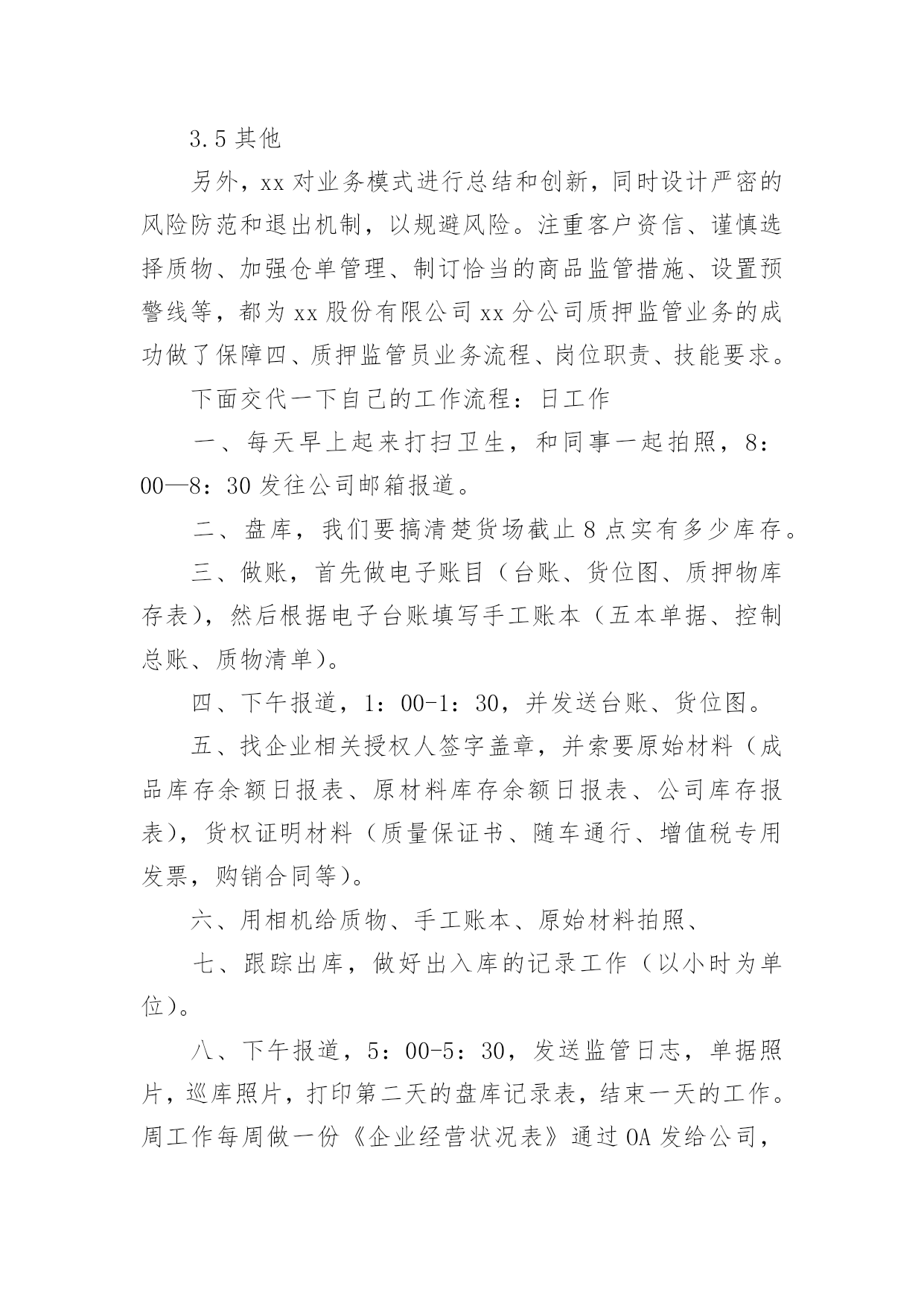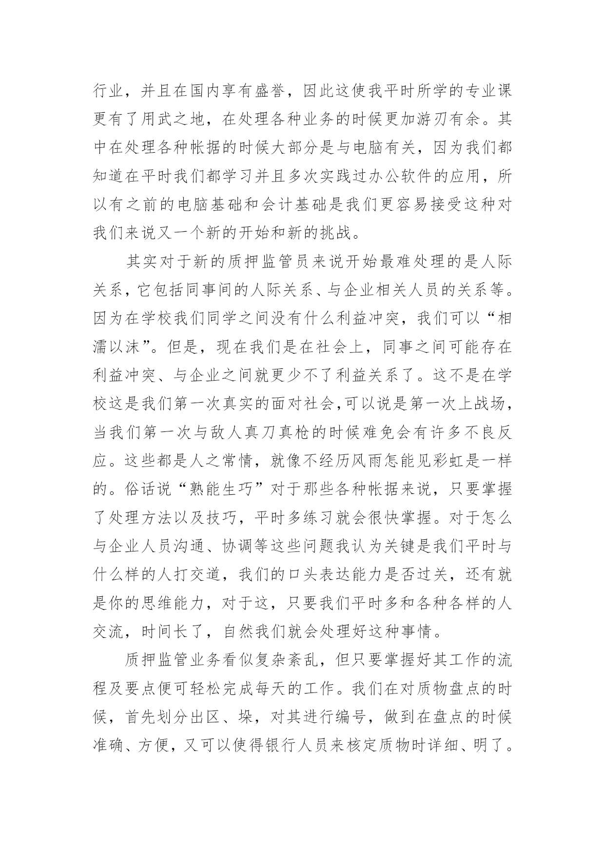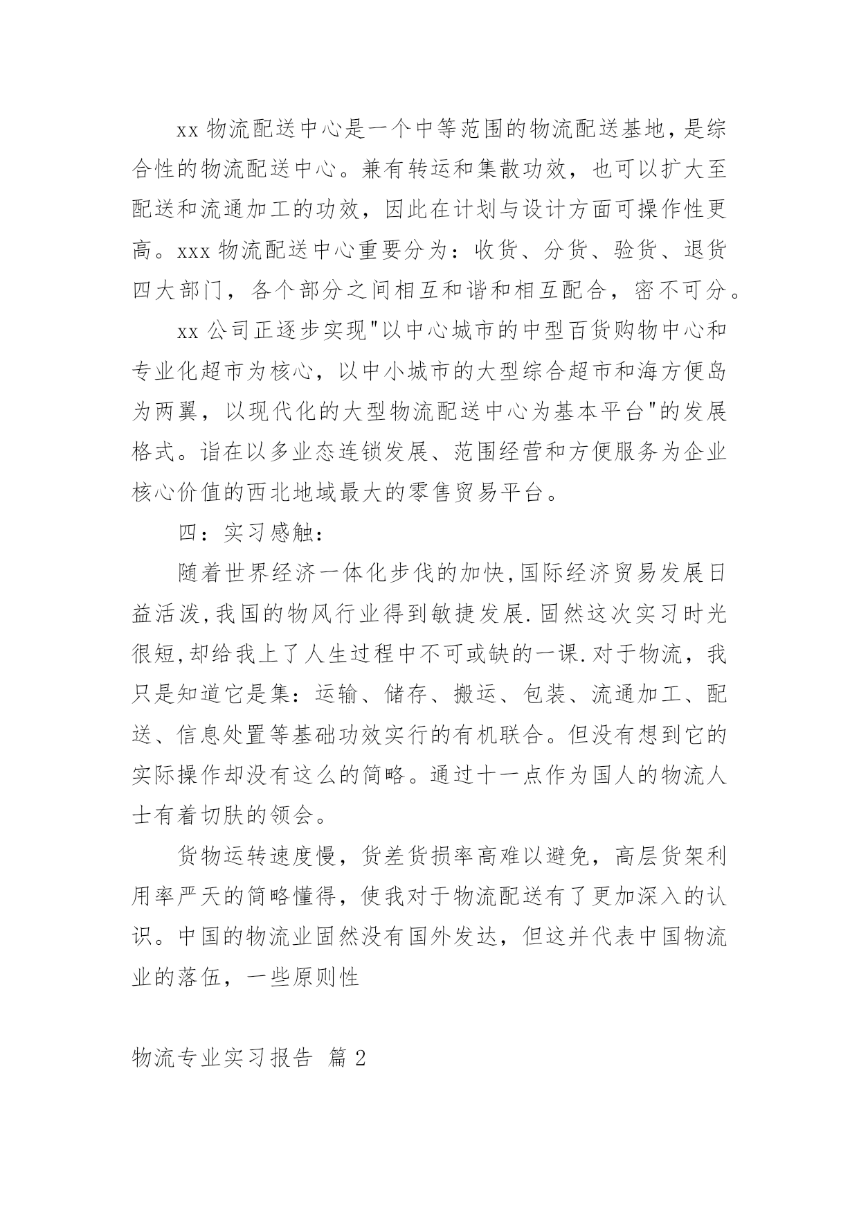 物流专业实习报告关于物流专业实习报告汇总七篇在当下这个社会中,报告的用途越来越大,通常情况下,报告的内容含量大、篇幅较长。相信很多朋友都对写报告感到非常苦恼吧,下面是小编精心整理的物流专业实习报告7篇,希望对大家有所帮助。物流专业实习报告篇1一:实习目标:为了以后能更好的适应工作和学习,学校组织到xx物流配送中心进行动期十天的实习。重要是为了懂得物流的作业流程,以便对我国的物流业能有更深的懂得。二:实习请求:了解物流的特色,佳吉货运,主要装备和作业流程,对其进行剖析.并根据学习的理论提出自己的看法.三:实习单位简介:配送中心是以组织配送性销售或供给,履行实物配送为重要职能的流通型结点。具有集货中心、分货中心的职能。xx公司是在xx连锁超市基本了发展起来的大型企业,拥有大型百货购物中心,社区连锁超市,中心城市方便岛为支柱的三大贸易,并以现代物流配送中心为支撑平台.xx物流配送中心是一个中等范围的物流配送基地,是综合性的物流配送中心。兼有转运和集散功效,也可以扩大至配送和流通加工的功效,因此在计划与设计方面可操作性更高。xxx物流配送中心重要分为:收货、分货、验货、退货四大部门,各个部分之间相互和谐和相互配合,密不可分。xx公司正逐步实现"以中心城市的中型百货购物中心和专业化超市为核心,以中小城市的大型综合超市和海方便岛为两翼,以现代化的大型物流配送中心为基本平台"的发展格式。诣在以多业态连锁发展、范围经营和方便服务为企业核心价值的西北地域最大的零售贸易平台。四:实习感触:随着世界经济一体化步伐的加快,国际经济贸易发展日益活泼,我国的物风行业得到敏捷发展.固然这次实习时光很短,却给我上了人生过程中不可或缺的一课.对于物流,我只是知道它是集:运输、储存、搬运、包装、流通加工、配送、信息处置等基础功效实行的有机联合。但没有想到它的实际操作却没有这么的简略。通过十一点作为国人的物流人士有着切肤的领会。货物运转速度慢,货差货损率高难以避免,高层货架利用率严天的简略懂得,使我对于物流配送有了更加深入的认识。中国的物流业固然没有国外发达,但这并代表中国物流业的落伍,一些原则性物流专业实习报告篇2本人20xx年x月在xx股份有限公司xx分公司实习工作至今,通过实习一方面对中国市场的总体竞争环境以及在入世之后中国物流行业的发展方向以及未来趋向等方面有了更加具体的认识。另一方面使我学习到了作为质押监管员真正的工作内容及重要性和身上所承担的责任。一、xx股份有限公司xx分公司简介xx股份有限公司是全国性大型综合物流企业,于19xx年1月在xx证券交易所挂牌上市。xx物流中心是xx投资的全新项目,物流中心占地面积约150000平方米,位于xx经济技术开发区xx北路北端,xx高速公路和xx高速公路交汇处,紧邻xx前湾港、xx火车站和xx工业园区。xx物流中心具有xx港进出货物的集散地,生产企业的物流中心和城区生活资料的配送中心等多个方面的业务功能。物流中心可提供科学合理的个性化物流解决方案及物流咨询服务,主营仓库租赁、货物委托保管、货运代理、报关及报验业务,集装箱和散货的仓储、中转、加工、分拨及运输,以及仓单质押业务。xx物流中心将充分发挥xx系统的资源优势和网络优势,以“优质、高效、便捷、周到”为服务宗旨,技术服务创造价值为核心理念,帮助客户开发物流这一“第三利润源泉”。二、xx股份有限公司xx分公司质押监管业务成功经验2.1什么是质押监管业务质押监管是指出质人(货主)以合法占用的货物向质权人出质,作为质权人向出质人授信融资的担保,监管(保管)人接受质权人的委托,在质押期间按质权人指令对质物进行监管的业务模式。2.2监管业务为什么能成功xx所开展的质押监管业务模式已由传统的静态质押监管向动态质押监管发展,且动态质押监管业务已成为主要监管模式;业务正向库外和多库监管发展,并与现有业务结合发展,很大程度上提高了其他业务的市场吸引力,已成为很多客户选择xx作为合作伙伴的重要因素。三、xx股份有限公司青岛分公司质押监管业务成功的原因xx监管业务的成功开展,得益于充分利用了自身的相对优势,这包括规模庞大的资产、覆盖全国的网络、庞大的客户群和良好的品牌和商誉。3.1雄厚的资产实力在质押监管业务中,物流企业起到了整合和再造企业信用的作用,也是质押监管的重要功能之一。这体现在物流企业取得银行的授信,还体现在物流企业对中小企业信用担保体系的构建,即前期为中小企业申请贷款提供担保或者以自身担保能力组织企业联保或互助担保。这对物流企业的资产规模要求较高,中储的资产规模达到50亿元以上,为做大质押监管业务提供了保证。3.2覆盖全国的网络xx拥有国内最大的仓储物流网络,网络覆盖全国中心城市和交通枢纽90%以上;拥有分布于全国各主要城市的直属大型仓库40多家和1300万平方米