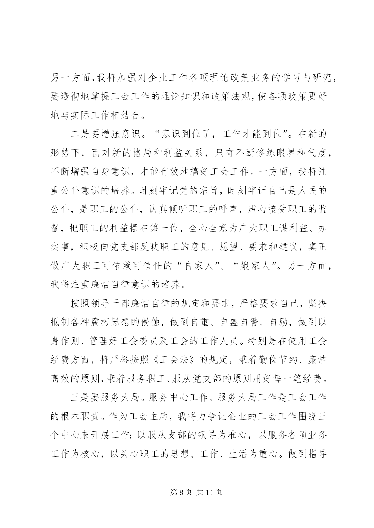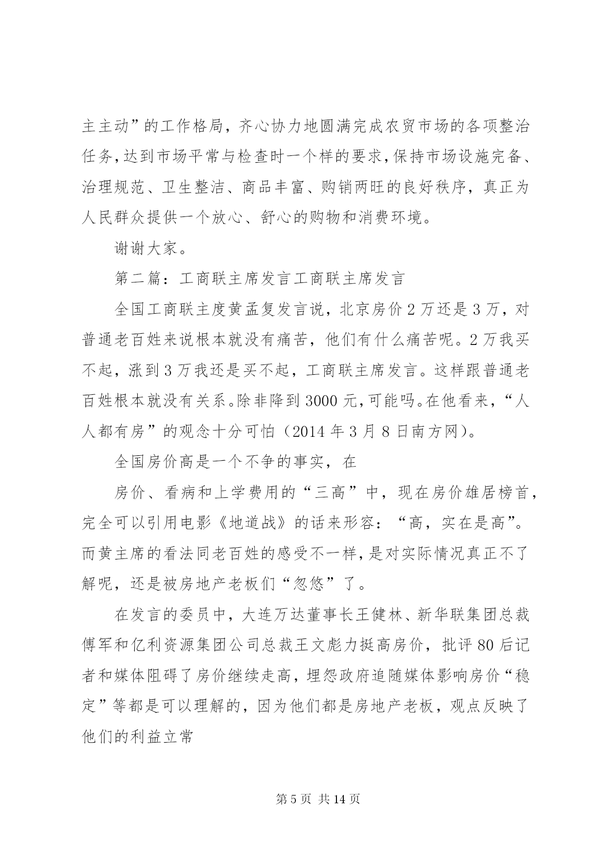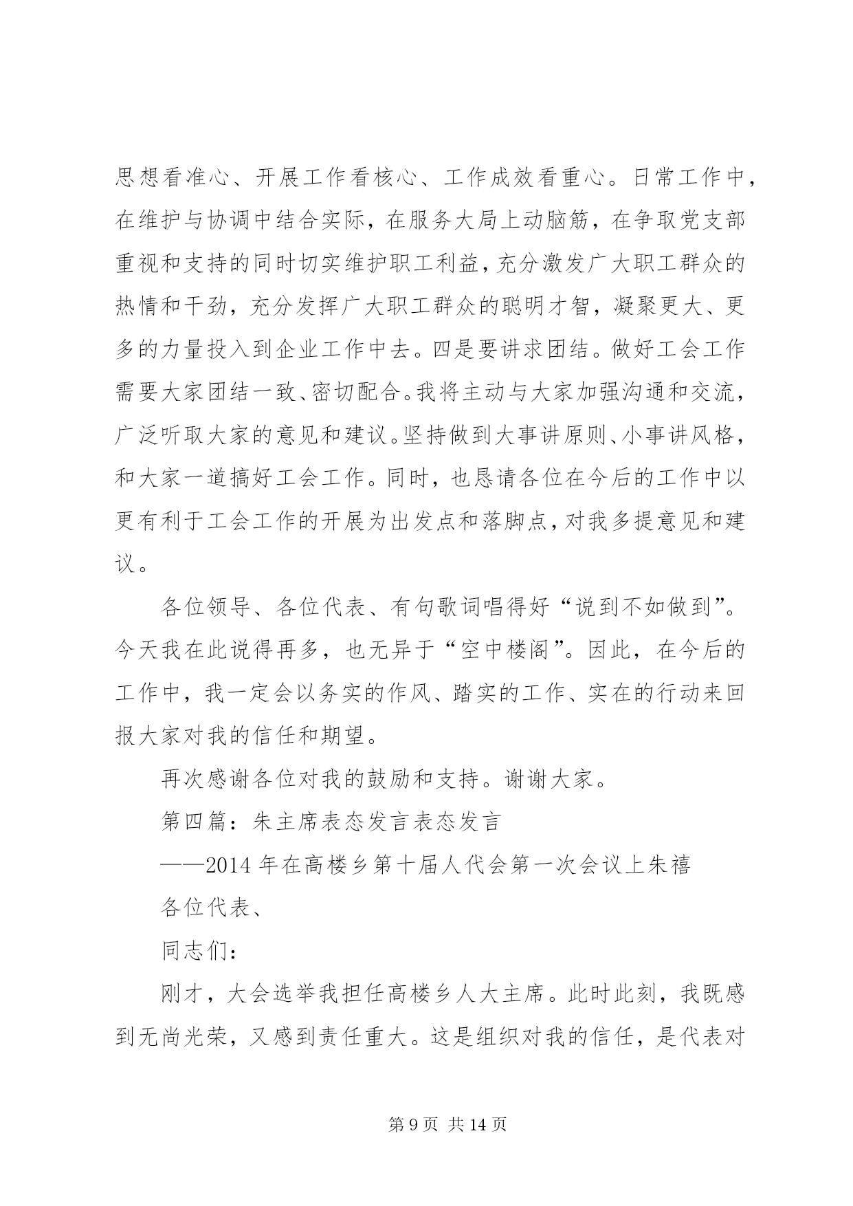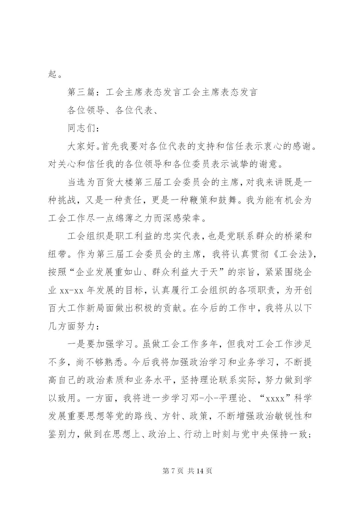 第PAGE\*Arabic\*MERGEFORMAT14页共NUMPAGES\*MERGEFORMAT14页工商联主席表态发言(精选多篇)第1篇第2篇第3篇第4篇第5篇更多顶部目录第一篇:工商联主席表态发言第二篇:工商联主席发言第三篇:工会主席表态发言第四篇:朱主席表态发言第五篇:工会主席表态发言更多相关范文正文第一篇:工商联主席表态发言各位领导,同志们:在全市创卫工作刚刚通过省检之后,市政府及时召开了规模盛大的创卫再动员大会,市长亲临大会再作部署、再作动员,再度体现了政府的坚强决心一站在手,写作无忧。]再次激发了全市的创卫信心。这次大会是一个找差距、添措施、增信心、鼓实劲的再动员大会,必将对全市创卫工作起到极大的推动作用。按照会议安排,我代表工商部门就农贸市场创卫工作做简要发言,不当之处,敬请指正。一、要切实落实市场创卫责任。市场是经济发展的载体之一,也是老百姓生活需求的公益场所,由于诸多历史原因,市场普遍基础很差,要达到创卫要求,必须从硬件升级和治理规范上进行大力整治。前段时间,虽经突击整治闯过了省级复检关,但要达到创“国卫”的标准,还只是万里长征刚起步,我们深感责任很大、难度很大、压力很大。因此,一定要在政府和创卫指挥部的领导下,主动配合相关部门,积极带领市场业主,切实把各自的职责落实到位。作为工商部门更应把市场创卫作为头等大事,主动为政府分忧,为业主解难,层层承担牵头责任,千方百计地攻克难关、突破重点,竭尽全力地完成建成区52个市场的创卫任务。二、要尽快抓好一批示范市常市政府农贸市场创卫动员大会后,全市虽已行动起来,52个市场也分别制定了整治方案,但步子太孝收效甚微,可以说还是在“原地踏步”。最近,省工商局在资阳、泸州、内江三地先行试点之后,召开了市场监管标准化、规范化、制度化建设现场会;市场监管“三化”与创卫的目标一致,要求相同。因此,我们立即确定了西海岸等5个示范市场,于12月中旬组织相关人员和示范市场业主共29人已到上述三地考察取经;目前正在借鉴经验,从5个示范市场的硬件升级、摊区设置、交易秩序、市场卫生、店招广告、规范治理等方面分别修改拟定改造方案,力争明年3月底前建成5个示范市场,使其率先离别市场脏、乱、差的历史,达到集市如超市的效果,成为全市的样板。同时,我们将采取学习、参观、召开现场会等多种形式,边示范、边总结、边推广,充分发挥示范的酵母作用,用榜样的力量去推动市场创卫工作的有效开展。除示范市场外,其余47个市场务必在春节前一一修定改造升级方案;并按方案逐项改造整治到位,确保创卫验收时全部达标。三、要充分发挥业主的主体作用。自xx年市场办管脱钩后,部分市场业主片面追求经济效益,淡化了公益责任意识,市场投入少、治理滑坡严重。因此,我们必须千方百计地督促市场业主切实履行第一责任人的职责,尽职尽责地治理好市场,充分发挥市场的公益效能,努力达到经济效益和社会效益双丰收的双赢效果。在创卫期间,要组织相关部门加强对业主的宣传、动员工作,坚持急事快办、特事特办,尽最大努力解决好业主在资金借贷、市场改造、兴建和整治方面的诸多困难;要落实两级政府以奖代补的资金,利用奖励机制激励业主;要组织业主认真执行好《全市农贸市场建设和治理的基本标准》,严格按标准进行市场的整治、改造和新建工作;要带动业主增强主人翁意识和创卫责任感、紧迫感,紧紧抓住创卫这个大好机遇,全力提升市场档次,促进市场繁荣增效;要启发业主采取银行贷一点、自己拿一点、经营者出一点等办法(淘),千方百计筹措资金,逐项落实市场创卫整治,确保市场改造升级。四、要尽早抓好分流市场的建设。三个区几乎都存在曝市现象,需新建市场分流。对此,工商部门要主动提请区政府确定新建市场的方案,落实市场业主,加强与国土、规划、商务等部门的协调,力争在春节前做好新建市场的选址、立项、审批、规划、设计等工作,促使各个新建市场务必在三、四月期间开工建设,在创卫验收前投入运营。工商机关对新建市场要提前介入,指导业主做好功能布局、摊区设置、划行归市等项工作,使新建市场建有标准、管有章法、建成就能达标、就有新的起点。五、要严格执行市场创卫的纪律。要坚持每月召开一次农贸市场创卫指挥部联系例会的制度,对创卫碰到的问题和困难要及时研究解决措施;要坚持每月至少编发两期快报,及时收集反应创卫情况;要坚持每月组织1-2次检查督查,采取明查暗访、交叉检查等方式,强化督查指导,做到有查必果、有果必报、有错必纠。对创卫中的失职、渎职行为,要提请同级纪检监察部门严厉查处;对不按时限和要求推进创卫工作的市场要公开曝光、限期整改,顶着不改或整改不符合要求的,要提请区政府强行实施关闭,区里要因地制宜设立临时市场,取代其功能,满足市民买菜、购物的需求。通过督查督办、严厉纪律,务必制约责任单位切实负起责任,