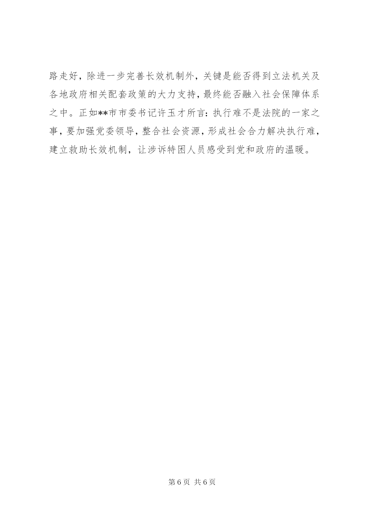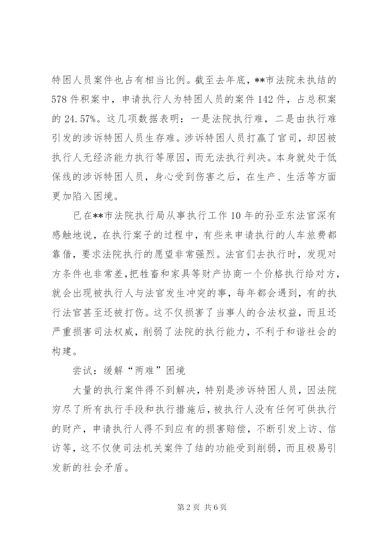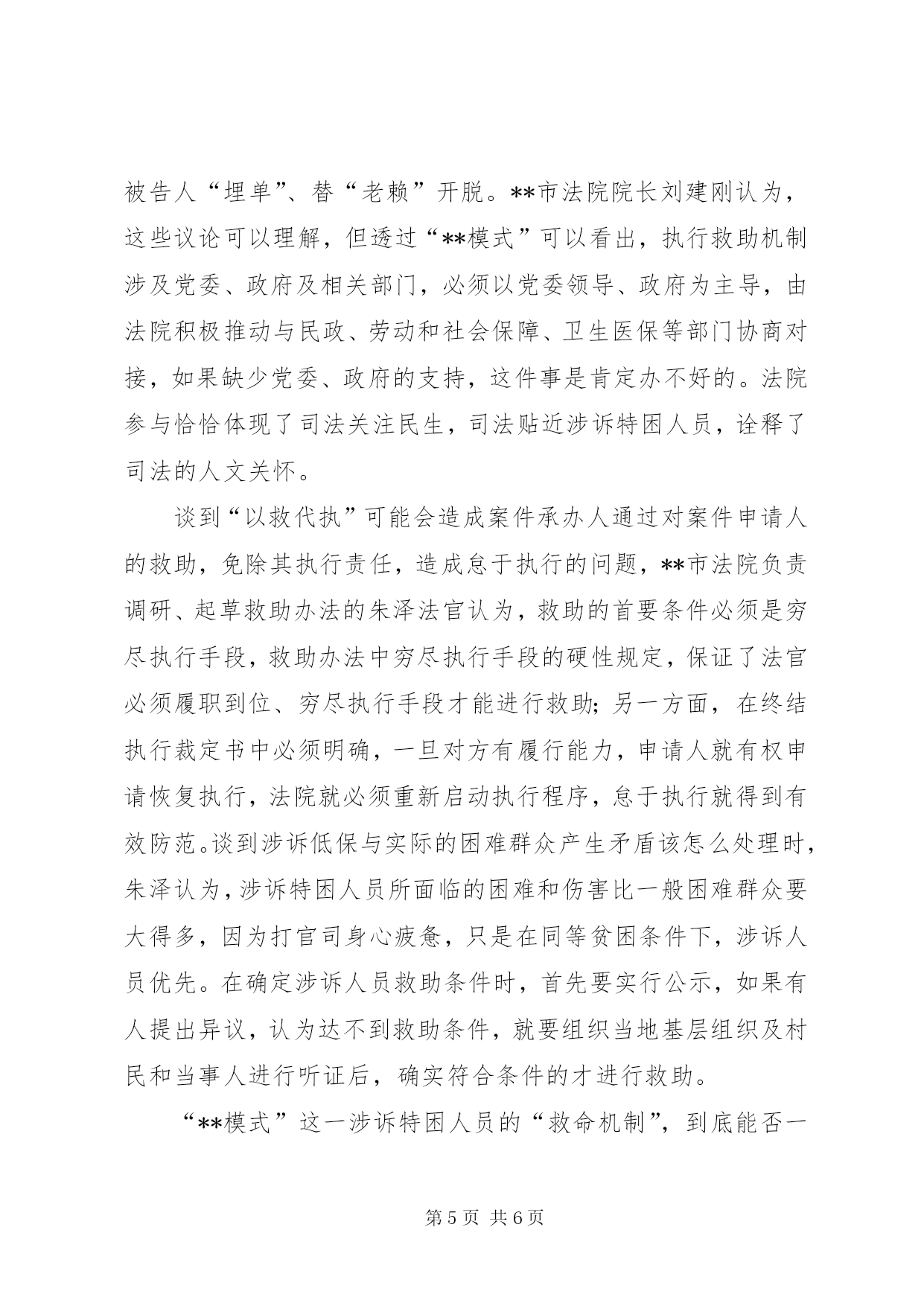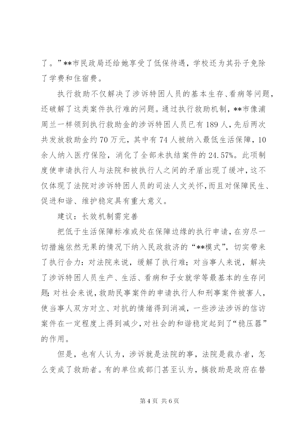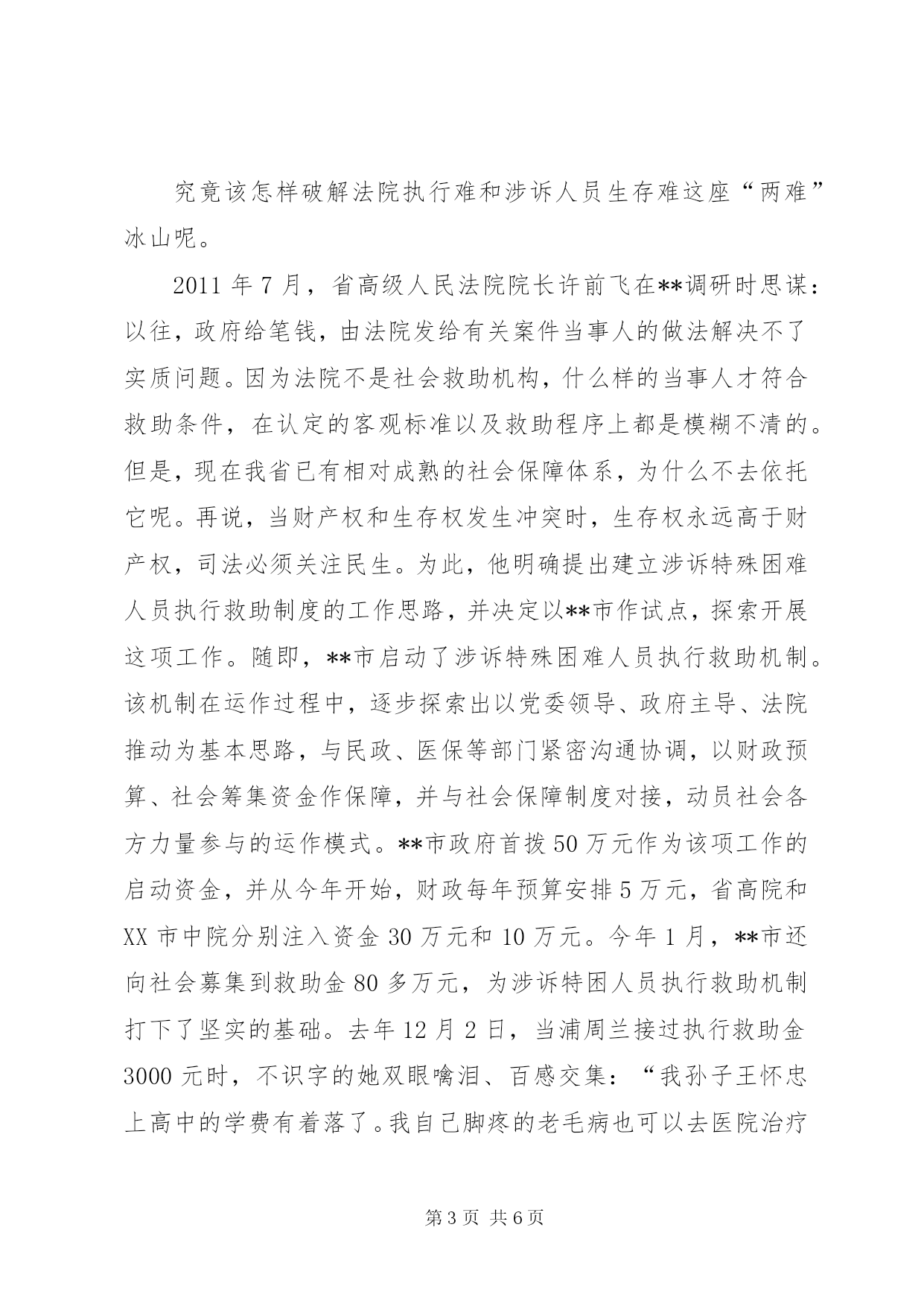 第PAGE\*Arabic\*MERGEFORMAT6页共NUMPAGES\*MERGEFORMAT6页司法新模式救助贫困人员经验材料1月13日,就读于西南财经大学的**籍学生唐金娥给**法院写了一封感谢信:“当听到母亲说父亲因车祸丧生的案子得到司法救助时,我和在河南财经大学读书的哥哥心里万分感激……也许对别人来说,5000元不算什么,但对于十分拮据的我家来说,就是雪中送炭。”这是自去年下半年以来,**市在全国率先启动涉诉特殊困难人员执行救助机制的一个案例。近日,记者带着“**模式”是在什么背景下“破冰”、到底取得了哪些成效、是不是在为“老赖”开脱、是否会滋生法院执行不作为等疑问到实地展开调查。困惑:执行难生存更难现年78岁的浦周兰是来宾镇来宾村委会大块田村村民,自从她患有精神病的儿子被同村村民李容高打死后,她便与在上学的孙子相依维命,靠种菜卖维持生计。**市法院虽然判决了李容高刑事附带民事赔偿1.8万元,但李容高家仅有一间土屋,且年均收入不到600元。拿什么执行。这让执行法官犯了难。从xx年开始,这个案子就“挂”起成了执行积案。执行难问题不仅是长期困扰法院乃至政法工作的突出问题,还是群众反映强烈、社会关注的焦点、热点问题。**全市140多万人口中,有38.1万贫困人口,贫困人口占**市总人口的26.71%,四分之一还多的贫困人口,使得法院涉诉特困人员案件也占有相当比例。截至去年底,**市法院未执结的578件积案中,申请执行人为特困人员的案件142件,占总积案的24.57%。这几项数据表明:一是法院执行难,二是由执行难引发的涉诉特困人员生存难。涉诉特困人员打赢了官司,却因被执行人无经济能力执行等原因,而无法执行判决。本身就处于低保线的涉诉特困人员,身心受到伤害之后,在生产、生活等方面更加陷入困境。已在**市法院执行局从事执行工作10年的孙亚东法官深有感触地说,在执行案子的过程中,有些来申请执行的人车旅费都靠借,要求法院执行的愿望非常强烈。法官们去执行时,发现对方条件也非常差,把牲畜和家具等财产协商一个价格执行给对方,就会出现被执行人与法官发生冲突的事,每年都会遇到,有的执行法官甚至还被打伤。这不仅损害了当事人的合法权益,而且还严重损害司法权威,削弱了法院的执行能力,不利于和谐社会的构建。尝试:缓解“两难”困境大量的执行案件得不到解决,特别是涉诉特困人员,因法院穷尽了所有执行手段和执行措施后,被执行人没有任何可供执行的财产,申请执行人得不到应有的损害赔偿,不断引发上访、信访等,这不仅使司法机关案件了结的功能受到削弱,而且极易引发新的社会矛盾。究竟该怎样破解法院执行难和涉诉人员生存难这座“两难”冰山呢。2011年7月,省高级人民法院院长许前飞在**调研时思谋:以往,政府给笔钱,由法院发给有关案件当事人的做法解决不了实质问题。因为法院不是社会救助机构,什么样的当事人才符合救助条件,在认定的客观标准以及救助程序上都是模糊不清的。但是,现在我省已有相对成熟的社会保障体系,为什么不去依托它呢。再说,当财产权和生存权发生冲突时,生存权永远高于财产权,司法必须关注民生。为此,他明确提出建立涉诉特殊困难人员执行救助制度的工作思路,并决定以**市作试点,探索开展这项工作。随即,**市启动了涉诉特殊困难人员执行救助机制。该机制在运作过程中,逐步探索出以党委领导、政府主导、法院推动为基本思路,与民政、医保等部门紧密沟通协调,以财政预算、社会筹集资金作保障,并与社会保障制度对接,动员社会各方力量参与的运作模式。**市政府首拨50万元作为该项工作的启动资金,并从今年开始,财政每年预算安排5万元,省高院和XX市中院分别注入资金30万元和10万元。今年1月,**市还向社会募集到救助金80多万元,为涉诉特困人员执行救助机制打下了坚实的基础。去年12月2日,当浦周兰接过执行救助金3000元时,不识字的她双眼噙泪、百感交集:“我孙子王怀忠上高中的学费有着落了。我自己脚疼的老毛病也可以去医院治疗了。”**市民政局还给她享受了低保待遇,学校还为其孙子免除了学费和住宿费。执行救助不仅解决了涉诉特困人员的基本生存、看病等问题,还破解了这类案件执行难的问题。通过执行救助机制,**市像浦周兰一样领到执行救助金的涉诉特困人员已有189人,先后两次共发放救助金约70万元,其中有74人被纳入最低生活保障,10余人纳入医疗保险,消化了全部未执结案件的24.57%。此项制度使申请执行人与法院和被执行人之间的矛盾出现了缓冲,这不仅体现了法院对涉诉特困人员的司法人文关怀,而且对保障民生、促进和谐、维护稳定具有重大意义。建议:长效机制需完善把低于生活保障标准或处在保障边缘的执行申请,在穷尽一切措施依然无果的情况下纳入民政救济的“**模式”,切实带来了执行合力:对法院