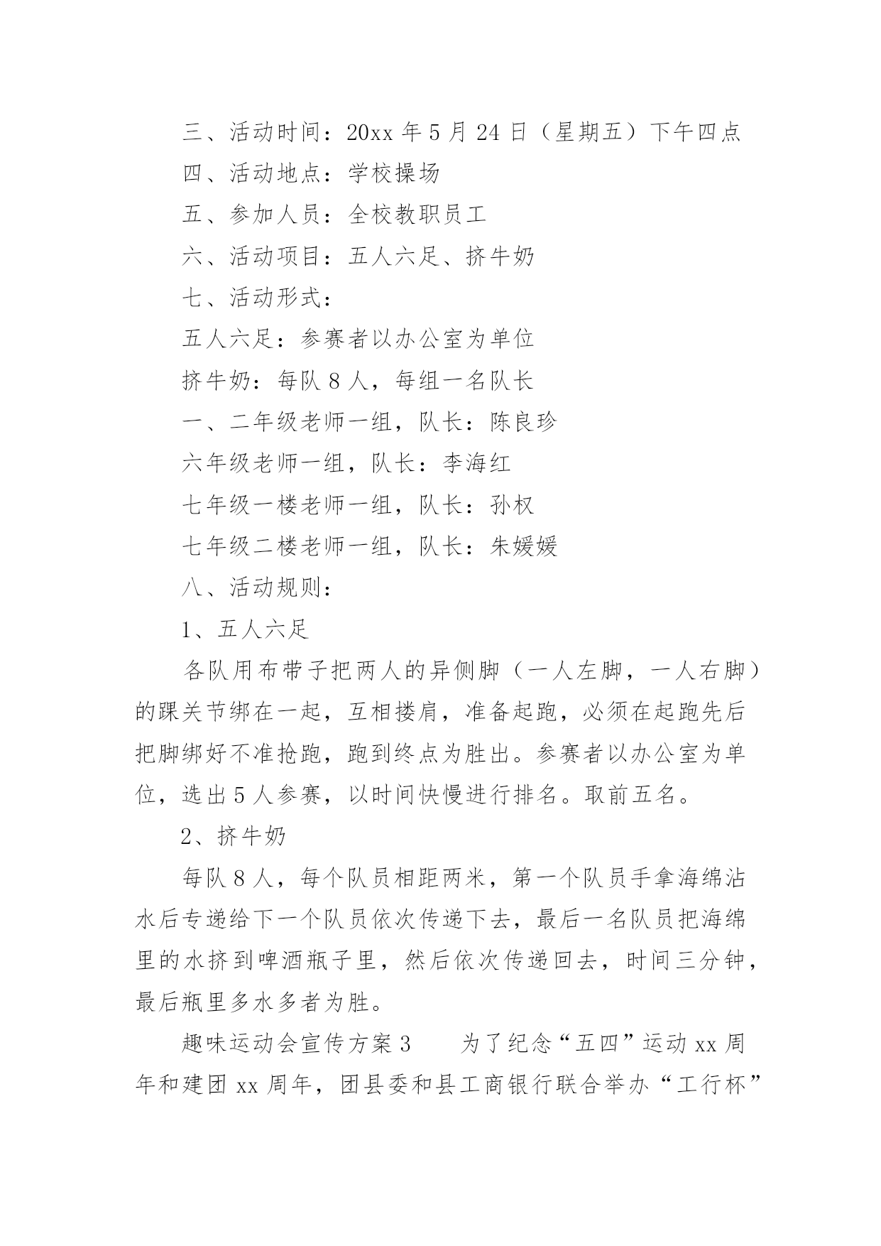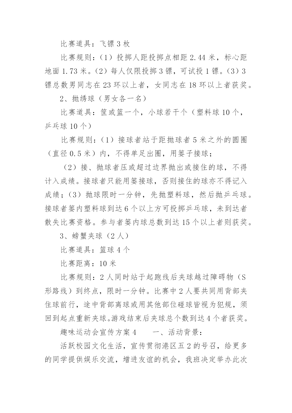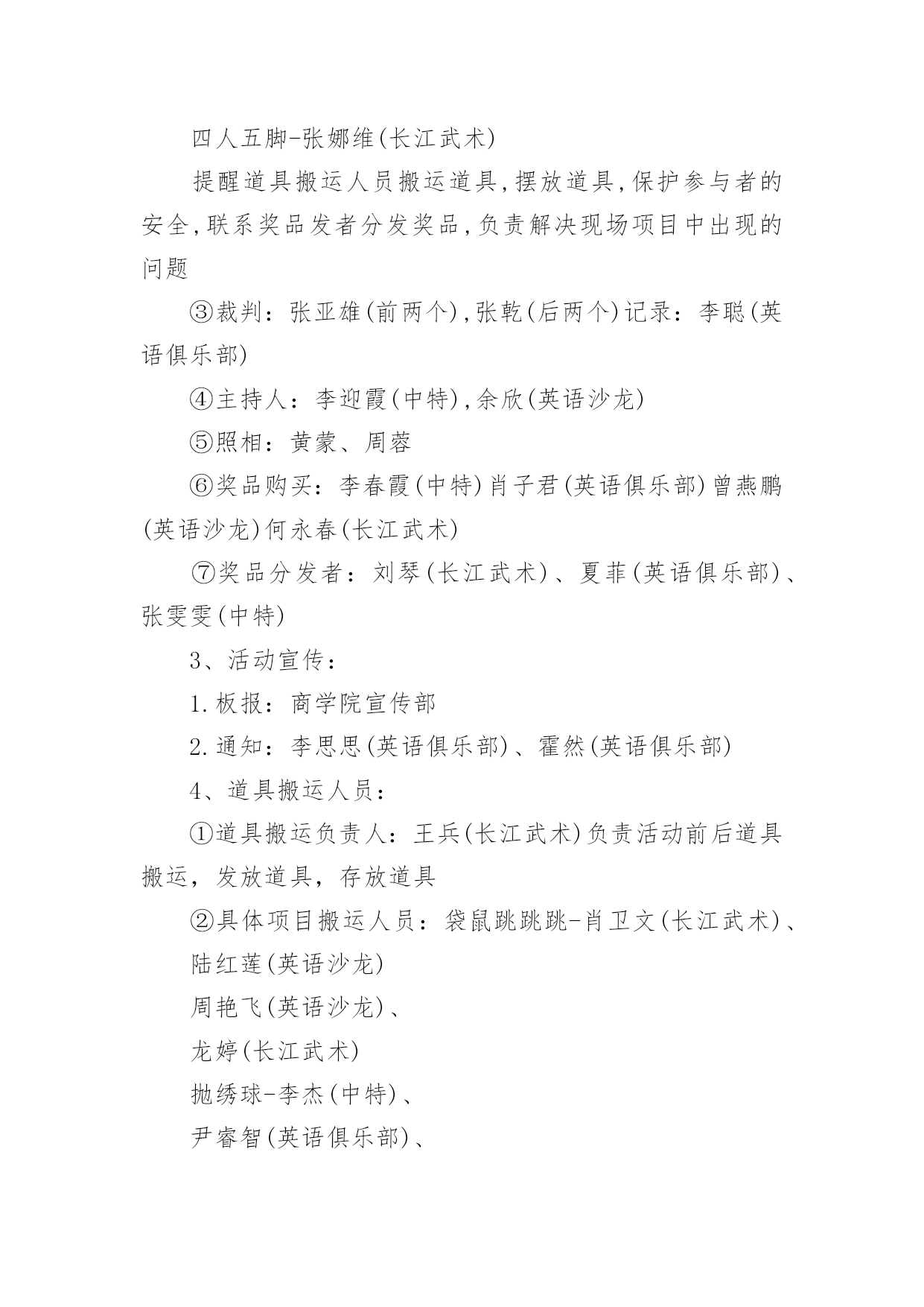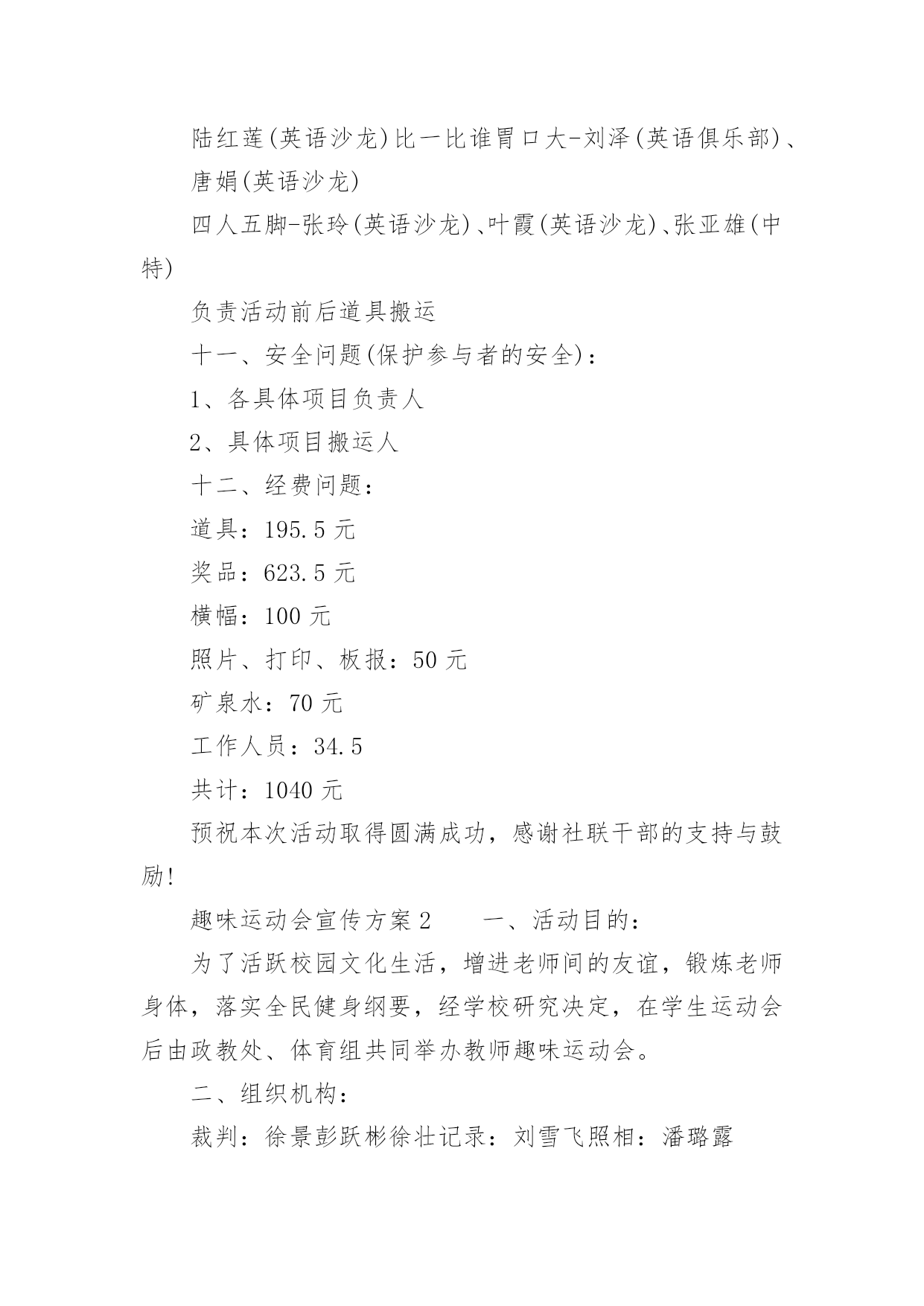 趣味运动会宣传方案趣味运动会宣传方案(通用10篇)为保障事情或工作顺利开展,往往需要预先进行方案制定工作,方案指的是为某一次行动所制定的计划类文书。那么方案应该怎么制定才合适呢?下面是小编帮大家整理的趣味运动会宣传方案(通用10篇),欢迎大家借鉴与参考,希望对大家有所帮助。趣味运动会宣传方案1一、活动名称:趣味运动会二、参与主题:参与、健康、娱乐、和谐三、活动目的:为丰富我们的课外生活,培养积极参与的热情和团队合作意识,同时,促进校园文化氛围,特举办此次趣味运动会四、活动时间:20xx年5月的第一周(具体时间另行通知)五、活动地点:学校篮球场六、活动可参与的对象:湘潭职院学生七、报名方式:1、樟树林报名(5月的第一周)周蓉(英语沙龙)黄蒙(英语俱乐部)、邹丽萍(英语俱乐部)、郝艳艳(英语沙龙)、宋蓉(中特)2、活动现场报名八、主办社团:商学院英语俱乐部长江武术协会英语沙龙中国特色社会主义理论研究协会九、活动程序:1、袋鼠跳跳跳2、抛绣球3、比一比谁胃口大4、四人五脚(活动项目具体规则请见附件1)十、活动工作人员的安排:1、活动总策划:各主办社团部长及副部长活动方案的拟定,分配各社团参加本次活动的工作人员的任务,准备道具2、活动现场负责人员:①活动现场主要负责人:黄蒙(英语俱乐部)、周蓉(英语沙龙)提醒个项目负责人准备好道具,负责解决现场工作中出现的问题②各具体项目负责人:袋鼠跳跳跳-谢文玉(英语俱乐部)抛绣球-孟晴(中特)比一比谁胃口大-李艳平(英语沙龙)四人五脚-张娜维(长江武术)提醒道具搬运人员搬运道具,摆放道具,保护参与者的安全,联系奖品发者分发奖品,负责解决现场项目中出现的问题③裁判:张亚雄(前两个),张乾(后两个)记录:李聪(英语俱乐部)④主持人:李迎霞(中特),余欣(英语沙龙)⑤照相:黄蒙、周蓉⑥奖品购买:李春霞(中特)肖子君(英语俱乐部)曾燕鹏(英语沙龙)何永春(长江武术)⑦奖品分发者:刘琴(长江武术)、夏菲(英语俱乐部)、张雯雯(中特)3、活动宣传:1.板报:商学院宣传部2.通知:李思思(英语俱乐部)、霍然(英语俱乐部)4、道具搬运人员:①道具搬运负责人:王兵(长江武术)负责活动前后道具搬运,发放道具,存放道具②具体项目搬运人员:袋鼠跳跳跳-肖卫文(长江武术)、陆红莲(英语沙龙)周艳飞(英语沙龙)、龙婷(长江武术)抛绣球-李杰(中特)、尹睿智(英语俱乐部)、陆红莲(英语沙龙)比一比谁胃口大-刘泽(英语俱乐部)、唐娟(英语沙龙)四人五脚-张玲(英语沙龙)、叶霞(英语沙龙)、张亚雄(中特)负责活动前后道具搬运十一、安全问题(保护参与者的安全):1、各具体项目负责人2、具体项目搬运人十二、经费问题:道具:195.5元奖品:623.5元横幅:100元照片、打印、板报:50元矿泉水:70元工作人员:34.5共计:1040元预祝本次活动取得圆满成功,感谢社联干部的支持与鼓励!趣味运动会宣传方案2一、活动目的:为了活跃校园文化生活,增进老师间的友谊,锻炼老师身体,落实全民健身纲要,经学校研究决定,在学生运动会后由政教处、体育组共同举办教师趣味运动会。二、组织机构:裁判:徐景彭跃彬徐壮记录:刘雪飞照相:潘璐露三、活动时间:20xx年5月24日(星期五)下午四点四、活动地点:学校操场五、参加人员:全校教职员工六、活动项目:五人六足、挤牛奶七、活动形式:五人六足:参赛者以办公室为单位挤牛奶:每队8人,每组一名队长一、二年级老师一组,队长:陈良珍六年级老师一组,队长:李海红七年级一楼老师一组,队长:孙权七年级二楼老师一组,队长:朱媛媛八、活动规则:1、五人六足各队用布带子把两人的异侧脚(一人左脚,一人右脚)的踝关节绑在一起,互相搂肩,准备起跑,必须在起跑先后把脚绑好不准抢跑,跑到终点为胜出。参赛者以办公室为单位,选出5人参赛,以时间快慢进行排名。取前五名。2、挤牛奶每队8人,每个队员相距两米,第一个队员手拿海绵沾水后专递给下一个队员依次传递下去,最后一名队员把海绵里的水挤到啤酒瓶子里,然后依次传递回去,时间三分钟,最后瓶里多水多者为胜。趣味运动会宣传方案3为了纪念“五四”运动xx周年和建团xx周年,团县委和县工商银行联合举办“工行杯”机关青年趣味运动会,具体实施方案如下:一、活动时间:20xx年5月4日13点二、活动地点:县政府大院三、活动项目分为团体和个人团体项目:1、手足情深;2、滚雪球;3、协力过河个人项目:1、小李飞镖;2、抛绣球;3、螃蟹夹球四、报名办法1、参与队伍组成:团体项目:以单位为队,也可自行组队参加,每队由5人组成(女青年2名以上),需有队名和领队1人。个人项目:以1人或2人为单位参与,主要以现场报名为主,团队成员同时也可参加个人项目。2、活动对象为单位或个人,但团体赛中一人不能同时代表两个队伍参与,在个人项