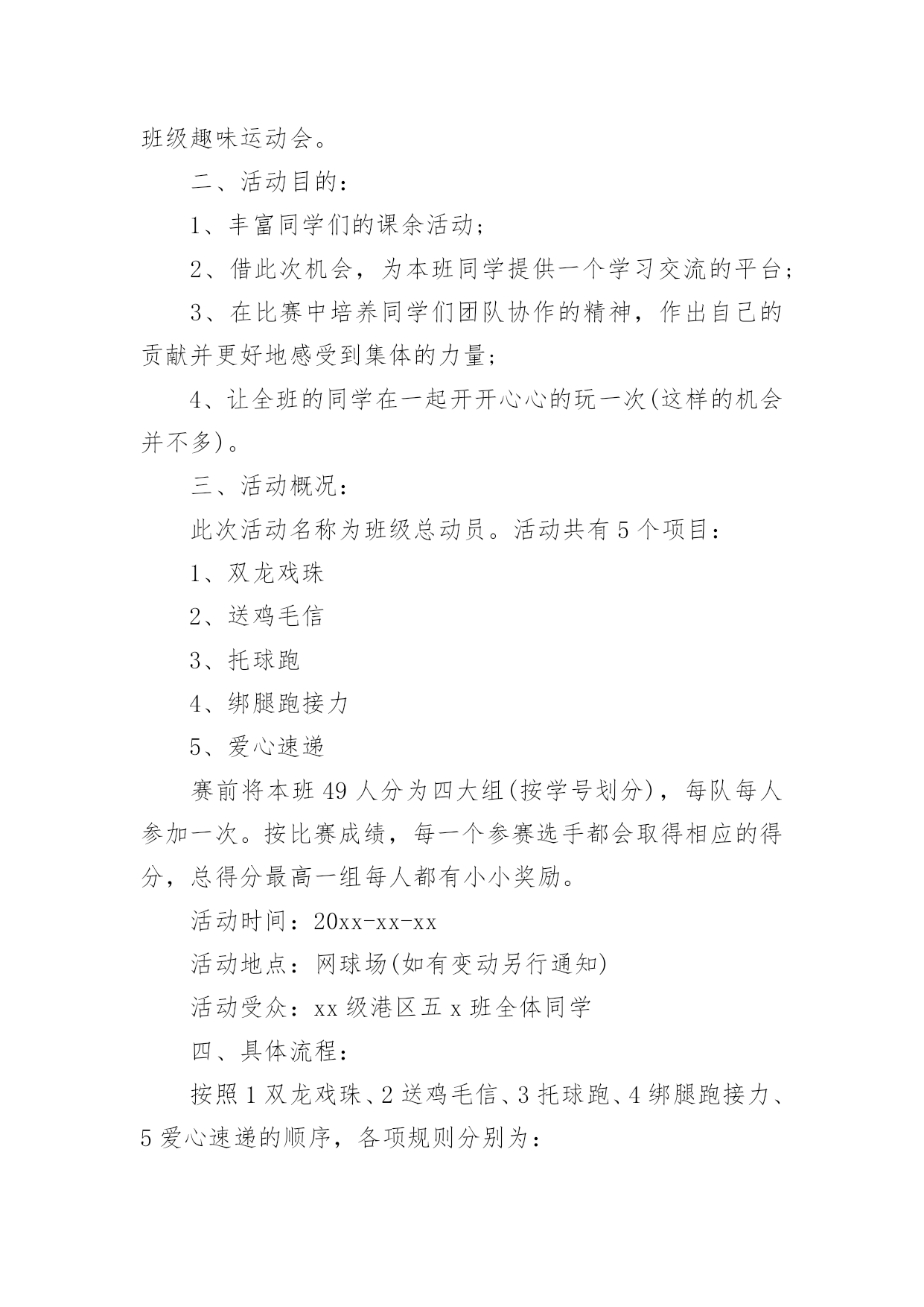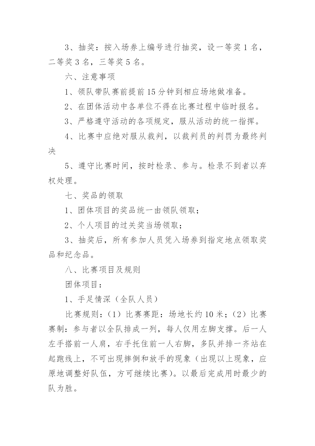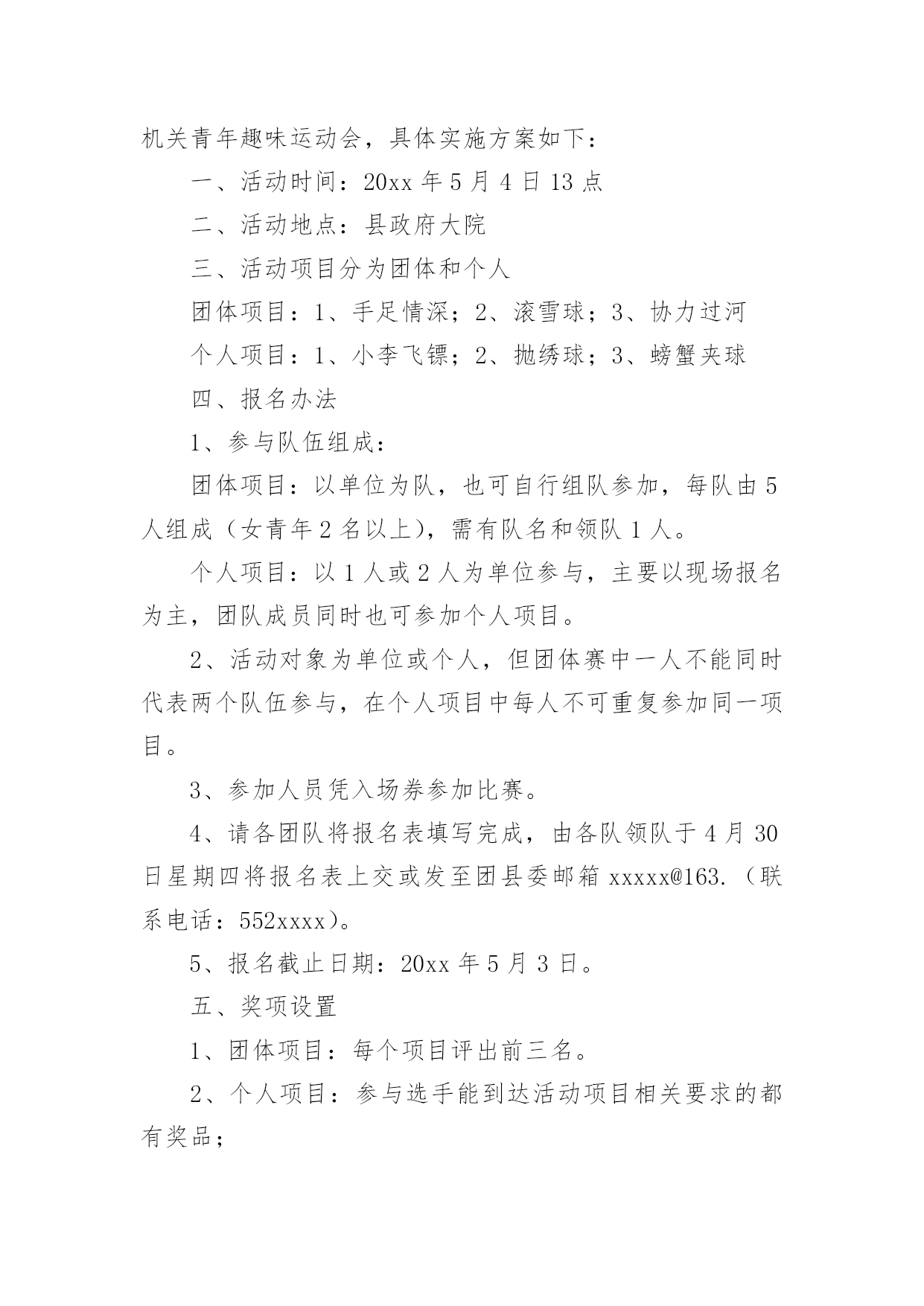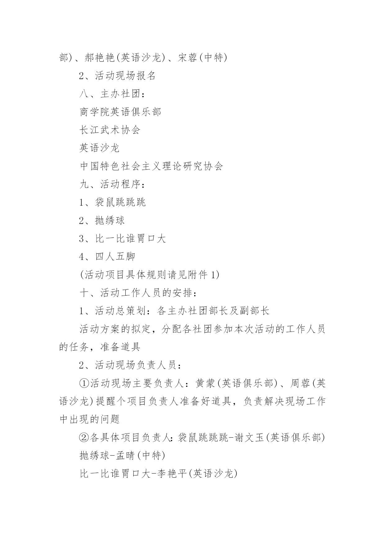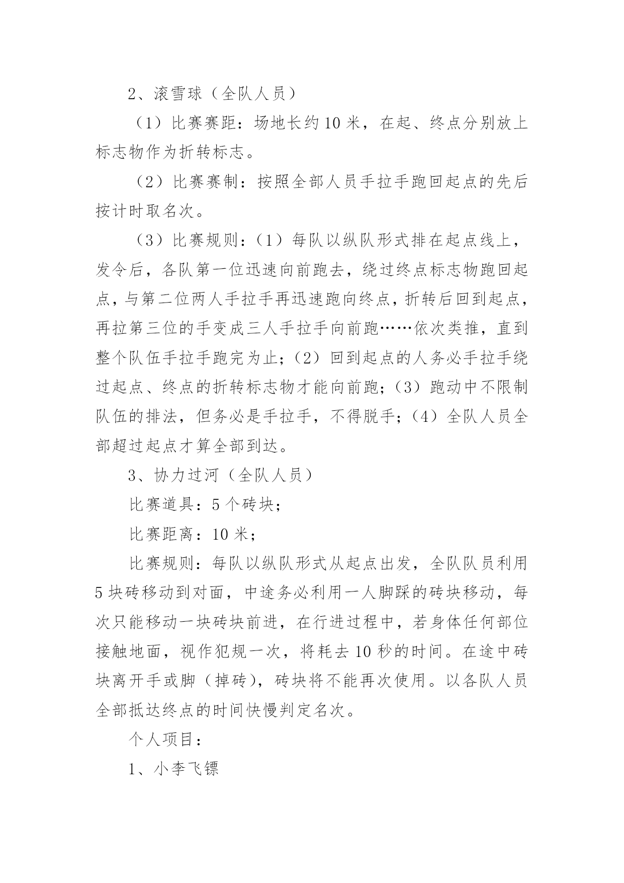 趣味运动会宣传方案趣味运动会宣传方案(通用10篇)为保障事情或工作顺利开展,往往需要预先进行方案制定工作,方案指的是为某一次行动所制定的计划类文书。那么方案应该怎么制定才合适呢?下面是小编帮大家整理的趣味运动会宣传方案(通用10篇),欢迎大家借鉴与参考,希望对大家有所帮助。趣味运动会宣传方案1一、活动名称:趣味运动会二、参与主题:参与、健康、娱乐、和谐三、活动目的:为丰富我们的课外生活,培养积极参与的热情和团队合作意识,同时,促进校园文化氛围,特举办此次趣味运动会四、活动时间:20xx年5月的第一周(具体时间另行通知)五、活动地点:学校篮球场六、活动可参与的对象:湘潭职院学生七、报名方式:1、樟树林报名(5月的第一周)周蓉(英语沙龙)黄蒙(英语俱乐部)、邹丽萍(英语俱乐部)、郝艳艳(英语沙龙)、宋蓉(中特)2、活动现场报名八、主办社团:商学院英语俱乐部长江武术协会英语沙龙中国特色社会主义理论研究协会九、活动程序:1、袋鼠跳跳跳2、抛绣球3、比一比谁胃口大4、四人五脚(活动项目具体规则请见附件1)十、活动工作人员的安排:1、活动总策划:各主办社团部长及副部长活动方案的拟定,分配各社团参加本次活动的工作人员的任务,准备道具2、活动现场负责人员:①活动现场主要负责人:黄蒙(英语俱乐部)、周蓉(英语沙龙)提醒个项目负责人准备好道具,负责解决现场工作中出现的问题②各具体项目负责人:袋鼠跳跳跳-谢文玉(英语俱乐部)抛绣球-孟晴(中特)比一比谁胃口大-李艳平(英语沙龙)四人五脚-张娜维(长江武术)提醒道具搬运人员搬运道具,摆放道具,保护参与者的安全,联系奖品发者分发奖品,负责解决现场项目中出现的问题③裁判:张亚雄(前两个),张乾(后两个)记录:李聪(英语俱乐部)④主持人:李迎霞(中特),余欣(英语沙龙)⑤照相:黄蒙、周蓉⑥奖品购买:李春霞(中特)肖子君(英语俱乐部)曾燕鹏(英语沙龙)何永春(长江武术)⑦奖品分发者:刘琴(长江武术)、夏菲(英语俱乐部)、张雯雯(中特)3、活动宣传:1.板报:商学院宣传部2.通知:李思思(英语俱乐部)、霍然(英语俱乐部)4、道具搬运人员:①道具搬运负责人:王兵(长江武术)负责活动前后道具搬运,发放道具,存放道具②具体项目搬运人员:袋鼠跳跳跳-肖卫文(长江武术)、陆红莲(英语沙龙)周艳飞(英语沙龙)、龙婷(长江武术)抛绣球-李杰(中特)、尹睿智(英语俱乐部)、陆红莲(英语沙龙)比一比谁胃口大-刘泽(英语俱乐部)、唐娟(英语沙龙)四人五脚-张玲(英语沙龙)、叶霞(英语沙龙)、张亚雄(中特)负责活动前后道具搬运十一、安全问题(保护参与者的安全):1、各具体项目负责人2、具体项目搬运人十二、经费问题:道具:195.5元奖品:623.5元横幅:100元照片、打印、板报:50元矿泉水:70元工作人员:34.5共计:1040元预祝本次活动取得圆满成功,感谢社联干部的支持与鼓励!趣味运动会宣传方案2一、活动目的:为了活跃校园文化生活,增进老师间的友谊,锻炼老师身体,落实全民健身纲要,经学校研究决定,在学生运动会后由政教处、体育组共同举办教师趣味运动会。二、组织机构:裁判:徐景彭跃彬徐壮记录:刘雪飞照相:潘璐露三、活动时间:20xx年5月24日(星期五)下午四点四、活动地点:学校操场五、参加人员:全校教职员工六、活动项目:五人六足、挤牛奶七、活动形式:五人六足:参赛者以办公室为单位挤牛奶:每队8人,每组一名队长一、二年级老师一组,队长:陈良珍六年级老师一组,队长:李海红七年级一楼老师一组,队长:孙权七年级二楼老师一组,队长:朱媛媛八、活动规则:1、五人六足各队用布带子把两人的异侧脚(一人左脚,一人右脚)的踝关节绑在一起,互相搂肩,准备起跑,必须在起跑先后把脚绑好不准抢跑,跑到终点为胜出。参赛者以办公室为单位,选出5人参赛,以时间快慢进行排名。取前五名。2、挤牛奶每队8人,每个队员相距两米,第一个队员手拿海绵沾水后专递给下一个队员依次传递下去,最后一名队员把海绵里的水挤到啤酒瓶子里,然后依次传递回去,时间三分钟,最后瓶里多水多者为胜。趣味运动会宣传方案3为了纪念“五四”运动xx周年和建团xx周年,团县委和县工商银行联合举办“工行杯”机关青年趣味运动会,具体实施方案如下:一、活动时间:20xx年5月4日13点二、活动地点:县政府大院三、活动项目分为团体和个人团体项目:1、手足情深;2、滚雪球;3、协力过河个人项目:1、小李飞镖;2、抛绣球;3、螃蟹夹球四、报名办法1、参与队伍组成:团体项目:以单位为队,也可自行组队参加,每队由5人组成(女青年2名以上),需有队名和领队1人。个人项目:以1人或2人为单位参与,主要以现场报名为主,团队成员同时也可参加个人项目。2、活动对象为单位或个人,但团体赛中一人不能同时代表两个队伍参与,在个人项