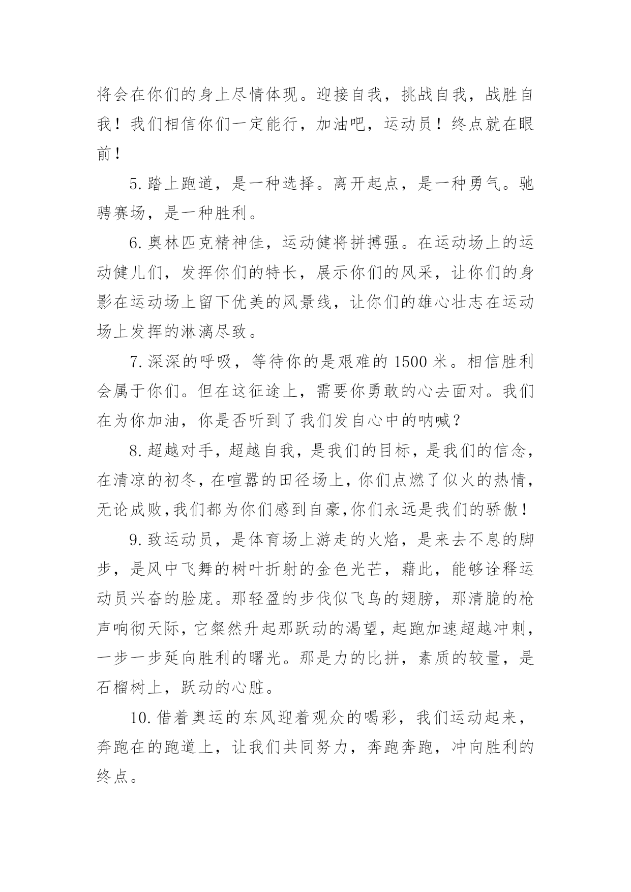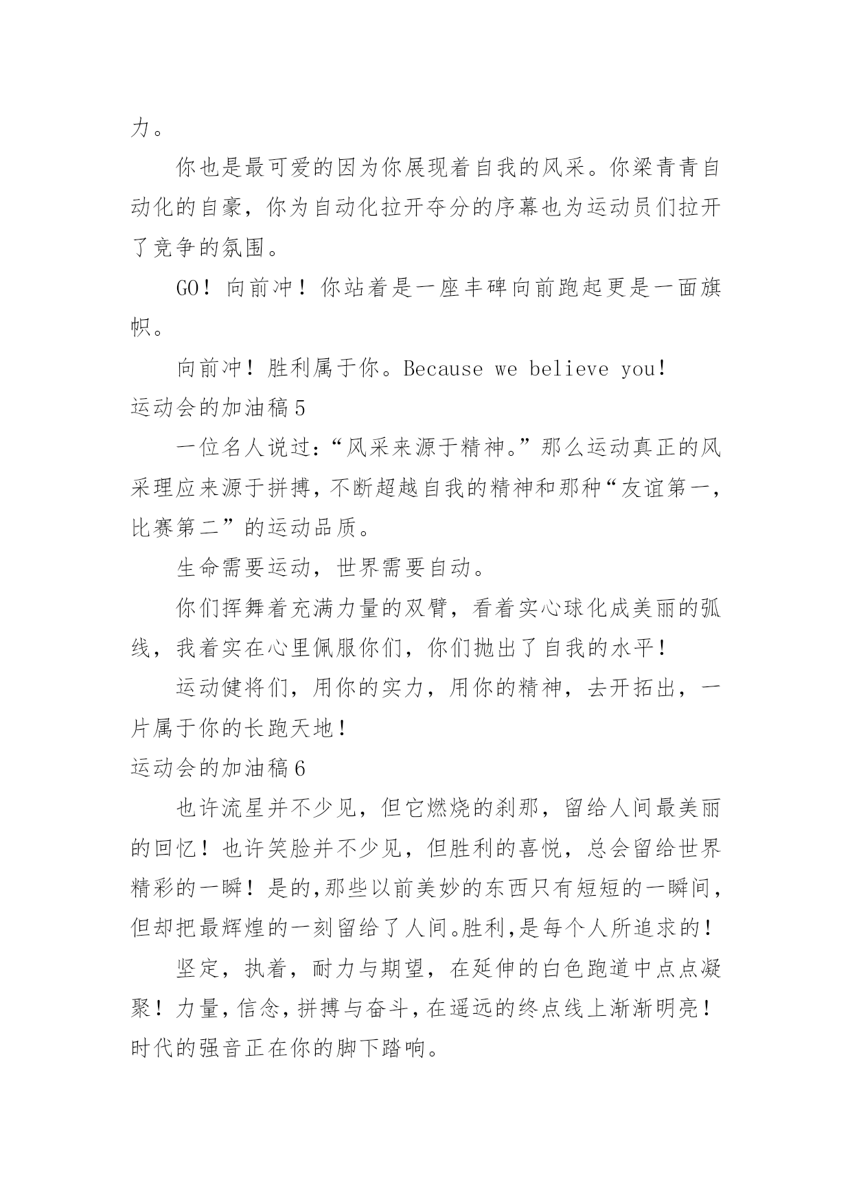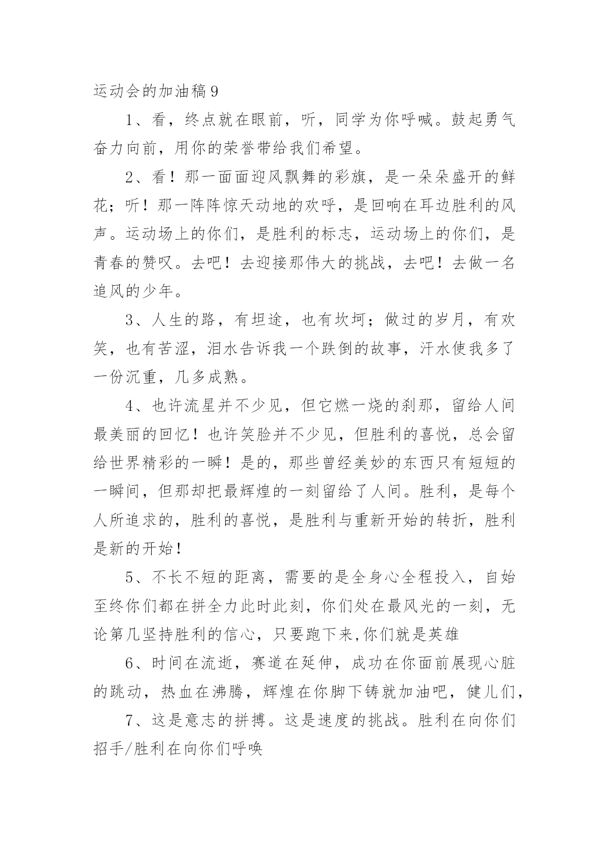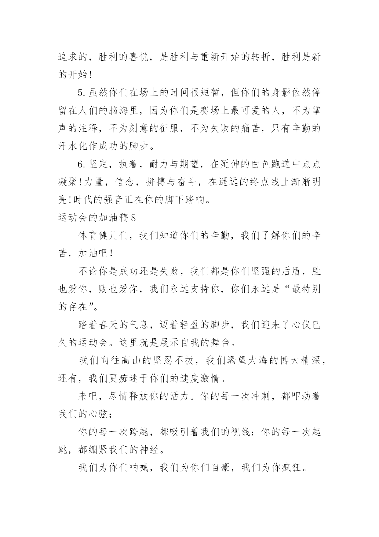 运动会的加油稿运动会的加油稿【精】在社会一步步向前发展的今天,我们需要用到加油稿的情形越来越多,借助加油稿可以更好地为他人加油打气。大家知道加油稿怎么写才正确吗?下面是小编整理的运动会的加油稿,希望对大家有所帮助。运动会的加油稿11..年轻的我们自信飞扬,青春的气息如同出生的朝阳,蓬勃的力量如同阳光的挥洒。此时此刻,跑道便是我们精彩的舞台,声声加油便是我们最高的奖项!论何成功,谈何荣辱,心中的信念只有一个拼搏!萧瑟的秋风,挡不住你们破竹的锐气,2..广阔的绿茵场,是为你们搭建的舞台。张扬吧,年轻的心,我们将为你永远喝彩!3..朋友,在你走上跑道那一刻,告诉自己,无论成功与否,微笑着跑完全程,只要年轻的心还在不停地跳动,就要大声告诉自己——我无所畏惧。4.亲爱的运动健儿们,加油吧!洒一把艰辛的汗水,继续抬起疲倦的脚步,爆发的一吼气贯长虹,继续向前,不论成功与否,你已曾经拥有。曾记否,在终点欢呼,震惊四周。5.无论成功与否,我们永远铭记这充满奋斗印记的阳光灿烂的日子6.无论你成功与否,刹那属于你。而你,一定属于永恒!7.只要你没有遗憾地奋斗,你就不必失望,你的生命已放出闪光!8.成功永远属于每一个勇敢者!9.不为掌声的注释,不为刻意的征服,不为失败的痛苦,只有辛勤的汗水,化作成功的脚步!10.不为鲜花的围绕,不为刹那的荣耀,只有执着的信念,化作不停的奔跑,心中燃烧着梦想,脚下不停的步伐!运动会的加油稿21.“沙场秋点兵”的壮阔,想必给了我们难以言喻的激情。于是,我放下手中的笔,去感受脉搏与心跳的激烈。在期盼中,在意料中,是悲是喜,是欢是狂,都未可知,但可知的是我们拥有这样一场运动盛会。2.秋风羽,天气淡淡的转凉。然而这人的秋在今天更加迷人,不是因为它的秋高气爽,也不是因为它的明媚阳光,是因为今天的人儿倍加精神气爽。看!运动场上那一幕幕,一股股,无论是哭是笑,市喜是悲,其中都融入了他们的汗水、辛劳。他们是真正的矫健者,是运动场上的骄儿,更是我们心中的英雄。加油吧!英雄们!3.场上英姿显自豪,脚下步伐在飞奔。你们是骄傲。你们是自豪,跑道因你幻彩,面对红色跑道,你们挥洒自如,不惧一切冲向终点。4.青春的脚步,青春的速度,青春的活力,青春的激情,将会在你们的身上尽情体现。迎接自我,挑战自我,战胜自我!我们相信你们一定能行,加油吧,运动员!终点就在眼前!5.踏上跑道,是一种选择。离开起点,是一种勇气。驰骋赛场,是一种胜利。6.奥林匹克精神佳,运动健将拼搏强。在运动场上的运动健儿们,发挥你们的特长,展示你们的风采,让你们的身影在运动场上留下优美的风景线,让你们的雄心壮志在运动场上发挥的淋漓尽致。7.深深的呼吸,等待你的是艰难的1500米。相信胜利会属于你们。但在这征途上,需要你勇敢的心去面对。我们在为你加油,你是否听到了我们发自心中的呐喊?8.超越对手,超越自我,是我们的目标,是我们的信念,在清凉的初冬,在喧嚣的田径场上,你们点燃了似火的热情,无论成败,我们都为你们感到自豪,你们永远是我们的骄傲!9.致运动员,是体育场上游走的火焰,是来去不息的脚步,是风中飞舞的树叶折射的金色光芒,藉此,能够诠释运动员兴奋的脸庞。那轻盈的步伐似飞鸟的翅膀,那清脆的枪声响彻天际,它粲然升起那跃动的渴望,起跑加速超越冲刺,一步一步延向胜利的曙光。那是力的比拼,素质的较量,是石榴树上,跃动的心脏。10.借着奥运的东风迎着观众的喝彩,我们运动起来,奔跑在的跑道上,让我们共同努力,奔跑奔跑,冲向胜利的终点。11.年轻的我们自信飞扬,青春的气息如同出生的朝阳,蓬勃的力量如同阳光的挥洒。此时此刻,跑道便是我们精彩的舞台,声声加油便是我们的奖项!论何成功,谈何荣辱,心中的信念只有一个:拼搏!12.就像花儿准备了春秋冬,就是为了红透整个盛夏。就像雪花经历了春夏秋就是为了洁白整个严冬。蹲下,昂首,出发……轻轻的一抬脚,便牵动了全场的目光潇洒的迫挥挥手,便满足了那一份无言的等待。迎着朝阳,你们踏歌而去,背着希望,我们等待你们的归来。13.真心祝愿机会是什么?是不可错过的刹那间。呐喊是什么?是为那刹那间的真心祝愿。加油,加油你肯定听到了那一声声呐喊你肯定看到了那双双期待的眼睛你肯定感受到了那发自内心的祝愿。14.人生的路,有坦途,也有坎坷,做过的岁月,有欢笑,也有苦涩,泪水告诉我一个跌倒的故事,汗水使我多了一份沉重,几多成熟。理想毕竟不同于现实,失败是生活的一部分,谁也无法选择,无法抗拒,人生要自己去拼搏,去奋斗,在风雨中百折不饶勇往直前。流泪不是失落,徘徊不是迷惑,成功属于那些战胜失败,坚持不懈,勇于追求梦想的人。15.你用行动述说着过城的重要,没有无尽的终点,没有无法攀登的险峰,希望载着终点在向你微笑,拼搏吧!经历是一种精彩,迸发你全部的能量,成功是你汗水的写照。16.虽然你