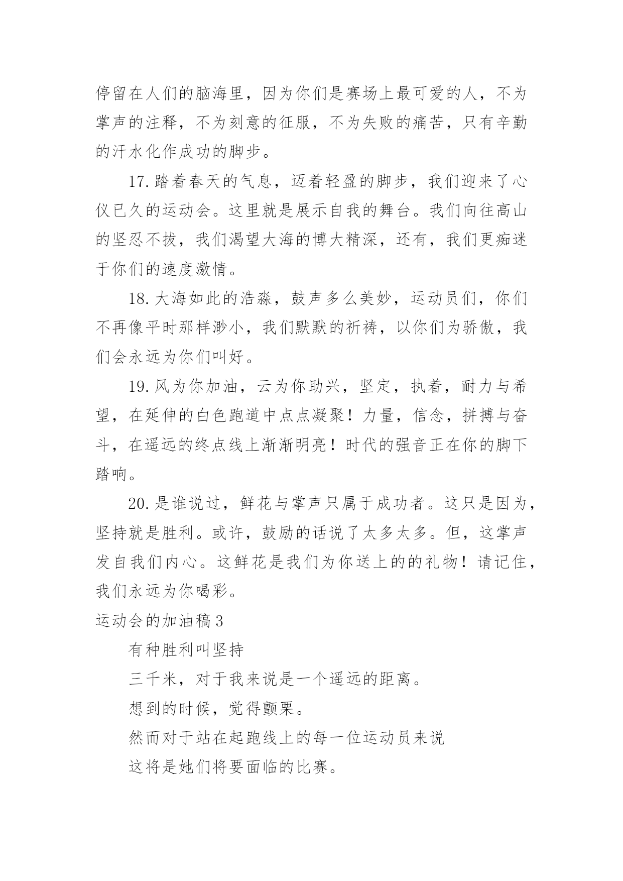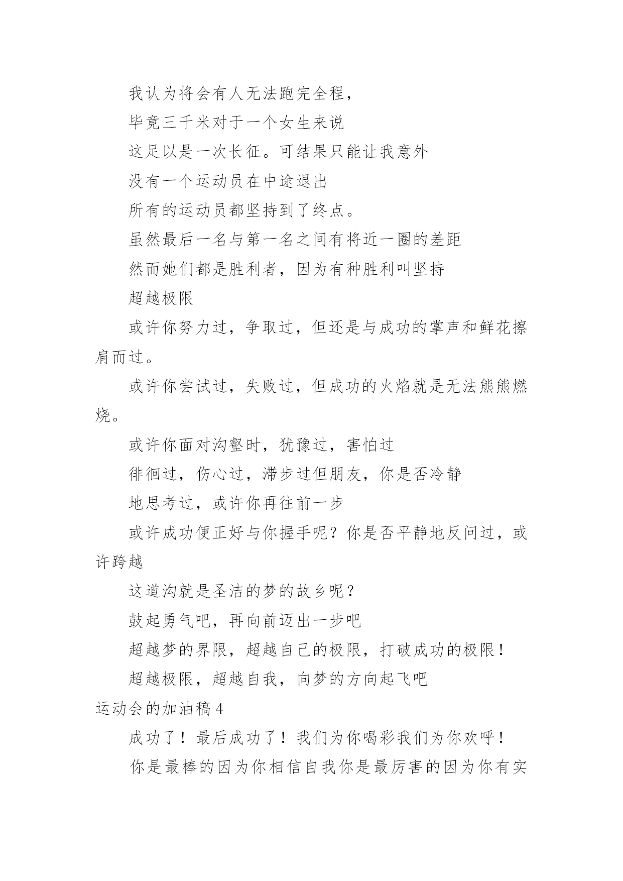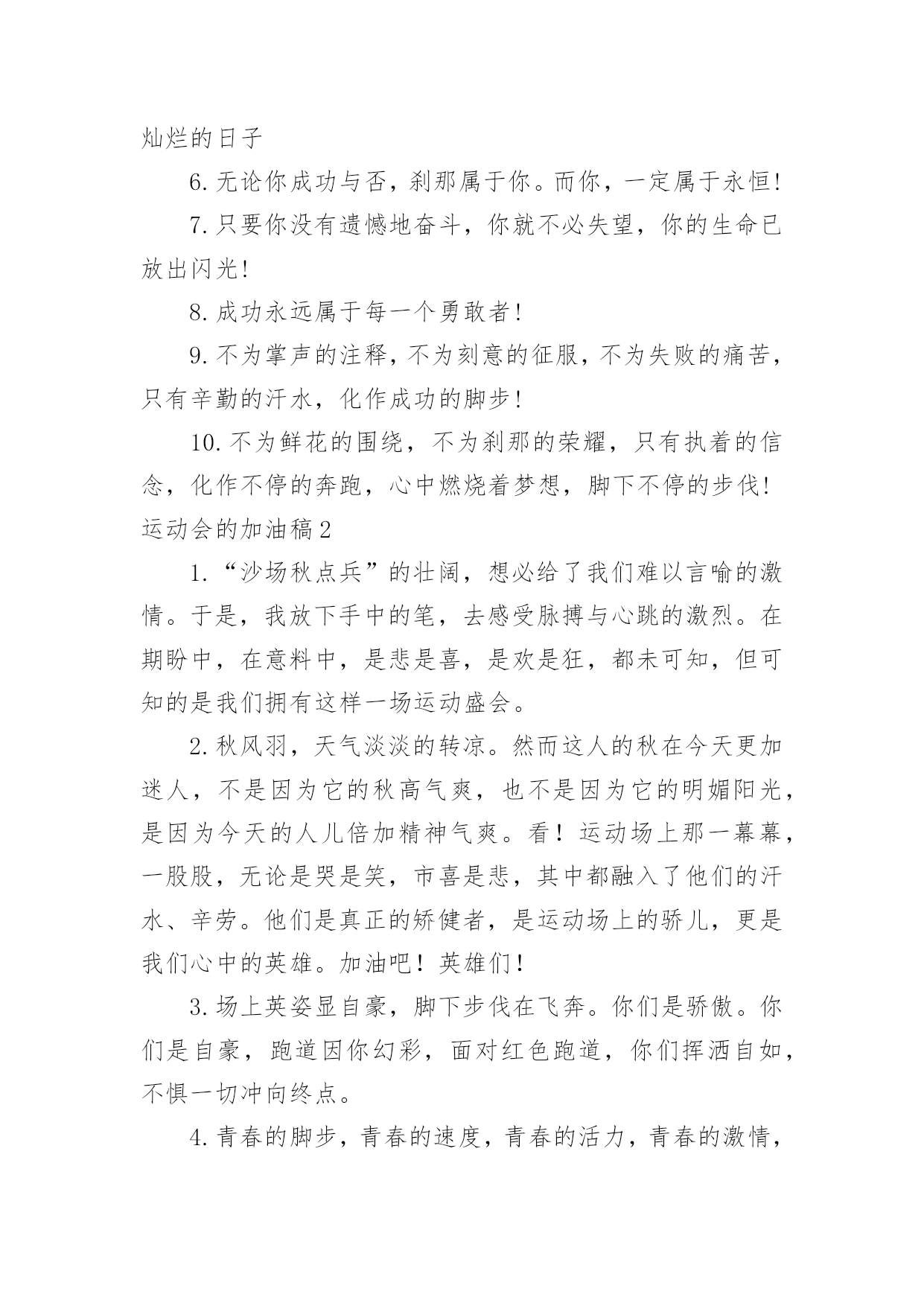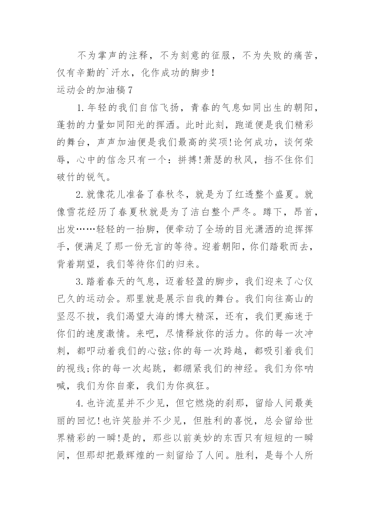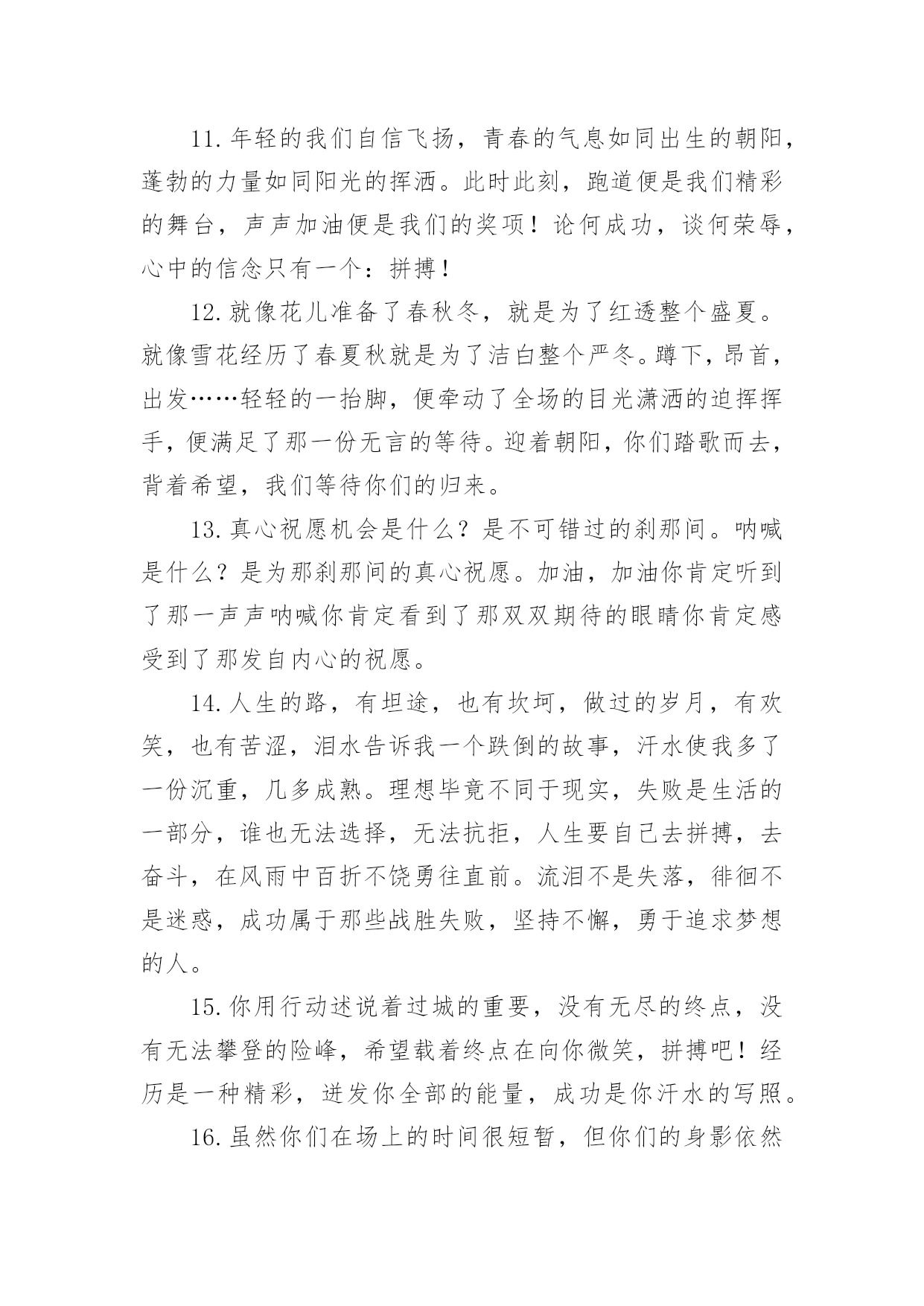 运动会的加油稿运动会的加油稿【精】在社会一步步向前发展的今天,我们需要用到加油稿的情形越来越多,借助加油稿可以更好地为他人加油打气。大家知道加油稿怎么写才正确吗?下面是小编整理的运动会的加油稿,希望对大家有所帮助。运动会的加油稿11..年轻的我们自信飞扬,青春的气息如同出生的朝阳,蓬勃的力量如同阳光的挥洒。此时此刻,跑道便是我们精彩的舞台,声声加油便是我们最高的奖项!论何成功,谈何荣辱,心中的信念只有一个拼搏!萧瑟的秋风,挡不住你们破竹的锐气,2..广阔的绿茵场,是为你们搭建的舞台。张扬吧,年轻的心,我们将为你永远喝彩!3..朋友,在你走上跑道那一刻,告诉自己,无论成功与否,微笑着跑完全程,只要年轻的心还在不停地跳动,就要大声告诉自己——我无所畏惧。4.亲爱的运动健儿们,加油吧!洒一把艰辛的汗水,继续抬起疲倦的脚步,爆发的一吼气贯长虹,继续向前,不论成功与否,你已曾经拥有。曾记否,在终点欢呼,震惊四周。5.无论成功与否,我们永远铭记这充满奋斗印记的阳光灿烂的日子6.无论你成功与否,刹那属于你。而你,一定属于永恒!7.只要你没有遗憾地奋斗,你就不必失望,你的生命已放出闪光!8.成功永远属于每一个勇敢者!9.不为掌声的注释,不为刻意的征服,不为失败的痛苦,只有辛勤的汗水,化作成功的脚步!10.不为鲜花的围绕,不为刹那的荣耀,只有执着的信念,化作不停的奔跑,心中燃烧着梦想,脚下不停的步伐!运动会的加油稿21.“沙场秋点兵”的壮阔,想必给了我们难以言喻的激情。于是,我放下手中的笔,去感受脉搏与心跳的激烈。在期盼中,在意料中,是悲是喜,是欢是狂,都未可知,但可知的是我们拥有这样一场运动盛会。2.秋风羽,天气淡淡的转凉。然而这人的秋在今天更加迷人,不是因为它的秋高气爽,也不是因为它的明媚阳光,是因为今天的人儿倍加精神气爽。看!运动场上那一幕幕,一股股,无论是哭是笑,市喜是悲,其中都融入了他们的汗水、辛劳。他们是真正的矫健者,是运动场上的骄儿,更是我们心中的英雄。加油吧!英雄们!3.场上英姿显自豪,脚下步伐在飞奔。你们是骄傲。你们是自豪,跑道因你幻彩,面对红色跑道,你们挥洒自如,不惧一切冲向终点。4.青春的脚步,青春的速度,青春的活力,青春的激情,将会在你们的身上尽情体现。迎接自我,挑战自我,战胜自我!我们相信你们一定能行,加油吧,运动员!终点就在眼前!5.踏上跑道,是一种选择。离开起点,是一种勇气。驰骋赛场,是一种胜利。6.奥林匹克精神佳,运动健将拼搏强。在运动场上的运动健儿们,发挥你们的特长,展示你们的风采,让你们的身影在运动场上留下优美的风景线,让你们的雄心壮志在运动场上发挥的淋漓尽致。7.深深的呼吸,等待你的是艰难的1500米。相信胜利会属于你们。但在这征途上,需要你勇敢的心去面对。我们在为你加油,你是否听到了我们发自心中的呐喊?8.超越对手,超越自我,是我们的目标,是我们的信念,在清凉的初冬,在喧嚣的田径场上,你们点燃了似火的热情,无论成败,我们都为你们感到自豪,你们永远是我们的骄傲!9.致运动员,是体育场上游走的火焰,是来去不息的脚步,是风中飞舞的树叶折射的金色光芒,藉此,能够诠释运动员兴奋的脸庞。那轻盈的步伐似飞鸟的翅膀,那清脆的枪声响彻天际,它粲然升起那跃动的渴望,起跑加速超越冲刺,一步一步延向胜利的曙光。那是力的比拼,素质的较量,是石榴树上,跃动的心脏。10.借着奥运的东风迎着观众的喝彩,我们运动起来,奔跑在的跑道上,让我们共同努力,奔跑奔跑,冲向胜利的终点。11.年轻的我们自信飞扬,青春的气息如同出生的朝阳,蓬勃的力量如同阳光的挥洒。此时此刻,跑道便是我们精彩的舞台,声声加油便是我们的奖项!论何成功,谈何荣辱,心中的信念只有一个:拼搏!12.就像花儿准备了春秋冬,就是为了红透整个盛夏。就像雪花经历了春夏秋就是为了洁白整个严冬。蹲下,昂首,出发……轻轻的一抬脚,便牵动了全场的目光潇洒的迫挥挥手,便满足了那一份无言的等待。迎着朝阳,你们踏歌而去,背着希望,我们等待你们的归来。13.真心祝愿机会是什么?是不可错过的刹那间。呐喊是什么?是为那刹那间的真心祝愿。加油,加油你肯定听到了那一声声呐喊你肯定看到了那双双期待的眼睛你肯定感受到了那发自内心的祝愿。14.人生的路,有坦途,也有坎坷,做过的岁月,有欢笑,也有苦涩,泪水告诉我一个跌倒的故事,汗水使我多了一份沉重,几多成熟。理想毕竟不同于现实,失败是生活的一部分,谁也无法选择,无法抗拒,人生要自己去拼搏,去奋斗,在风雨中百折不饶勇往直前。流泪不是失落,徘徊不是迷惑,成功属于那些战胜失败,坚持不懈,勇于追求梦想的人。15.你用行动述说着过城的重要,没有无尽的终点,没有无法攀登的险峰,希望载着终点在向你微笑,拼搏吧!经历是一种精彩,迸发你全部的能量,成功是你汗水的写照。16.虽然你