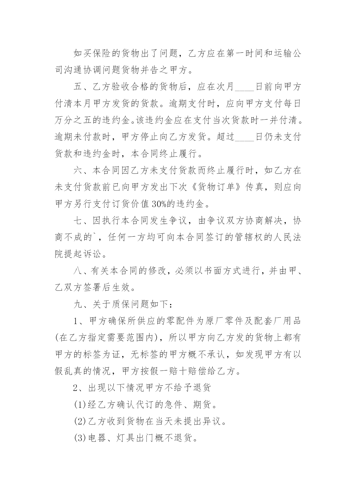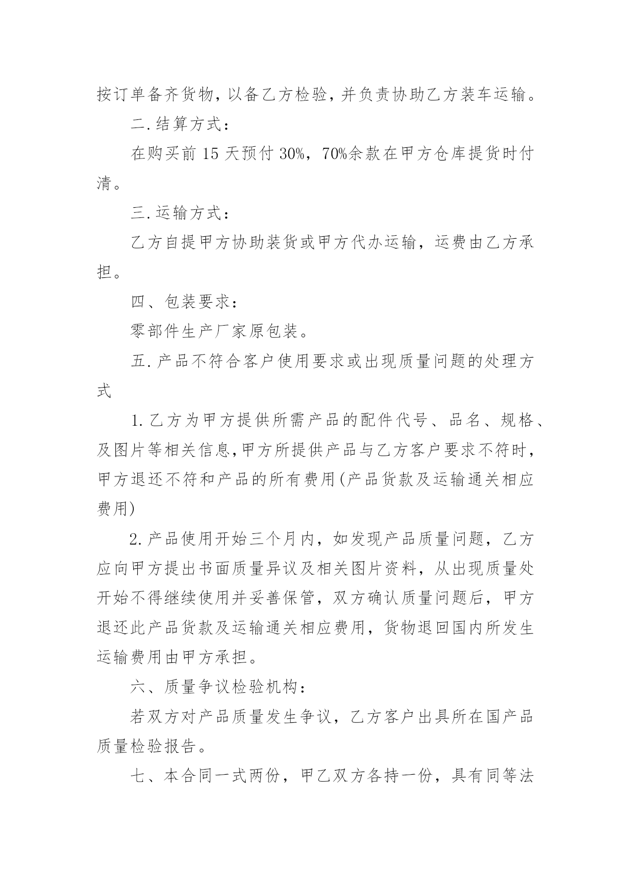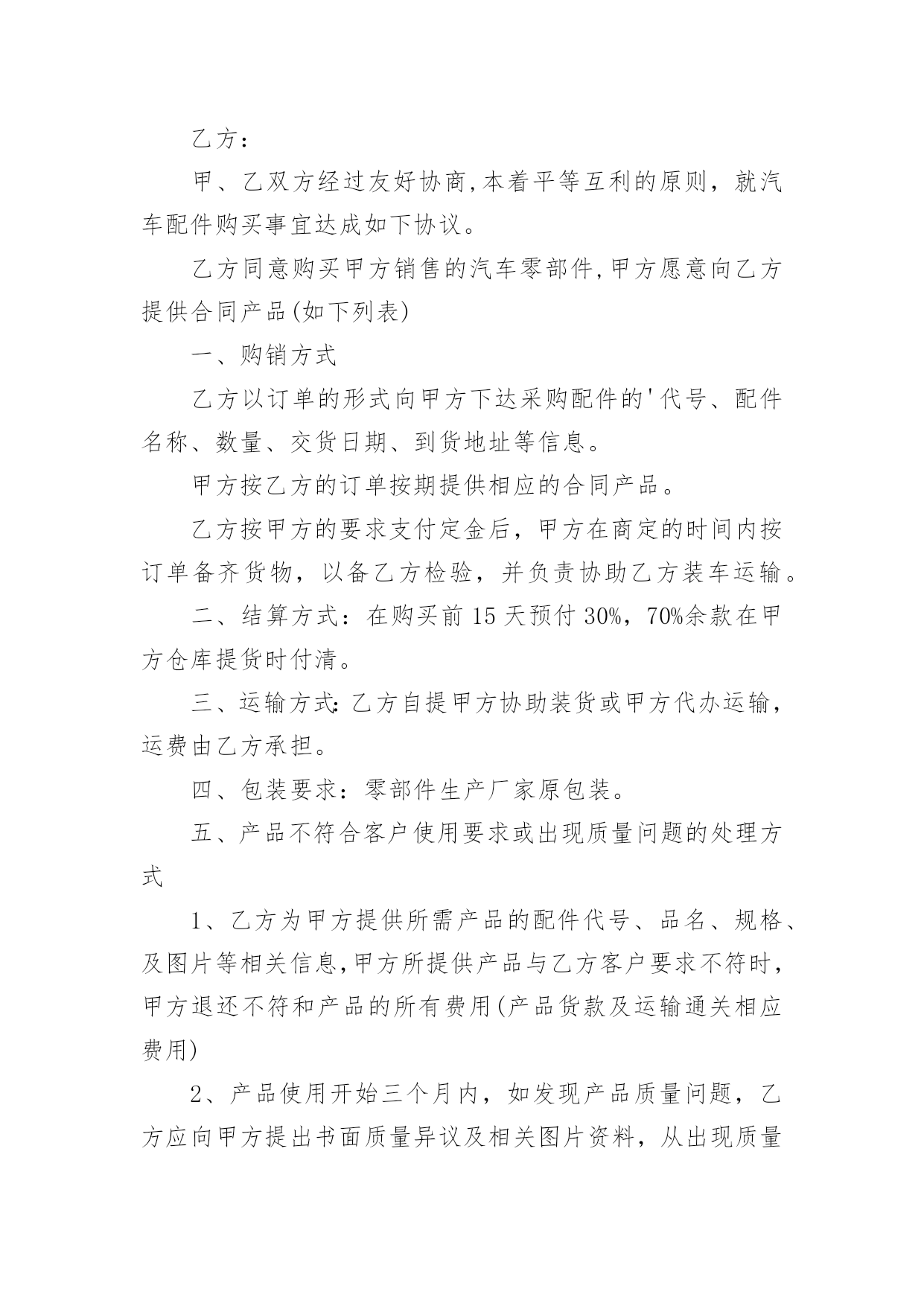 汽车配件销售合同汽车配件销售合同6篇现今很多公民的维权意识在不断增强,越来越多的人通过合同来调和民事关系,它也是减少和防止发生争议的重要措施。你所见过的合同是什么样的呢?以下是小编整理的汽车配件销售合同,仅供参考,大家一起来看看吧。汽车配件销售合同1甲方:_________________________乙方:_________________________甲乙双方经过友好协商,本着自愿的原则,就甲方向乙方销售________汽车零配等事宜,订立如下合同条款:一、甲方自本合同签订之日起。甲方依据本合同第三条约订的方式向乙方销售商标号码为__________的汽车用品等(简称货物)。二、甲方销售给乙方的货物应是___________原厂或合作公司生产(乙方指定配件)三、乙方将根据甲方电话确认、传真确认、或E-a确认订购的汽车配件项目清单向甲方供应所需零配件.四、乙方自己选择运输方式,委托运输公司办理货物的运输,并向运输公司支付运杂费用和保险费用。(因考虑到货物安全,所发货必须买保险)如买保险的货物出了问题,乙方应在第一时间和运输公司沟通协调问题货物并告之甲方。五、乙方验收合格的货物后,应在次月____日前向甲方付清本月甲方发货的货款。逾期支付时,应向甲方支付每日万分之五的违约金。该违约金应在支付当次货款时一并付清。逾期未付款时,甲方停止向乙方发货。超过____日仍未支付货款和违约金时,本合同终止履行。六、本合同因乙方未支付货款而终止履行时,如乙方在未支付货款前已向甲方发出下次《货物订单》传真,则应向甲方另行支付订货价值30%的违约金。七、因执行本合同发生争议,由争议双方协商解决,协商不成的`,任何一方均可向本合同签订的管辖权的人民法院提起诉讼。八、有关本合同的修改,必须以书面方式进行,并由甲、乙双方签署后生效。九、关于质保问题如下:1、甲方确保所供应的零配件为原厂零件及配套厂用品(在乙方指定需要范围内),所以甲方向乙方发的货物上都有甲方的标签为证,无标签的甲方概不承认,如发现甲方有以假乱真的情况,甲方按假一赔十赔偿给乙方。2、出现以下情况甲方不给予退货(1)经乙方确认代订的急件、期货。(2)乙方收到货物在当天未提出异议。(3)电器、灯具出门概不退货。(4)零件安装过、包装丢失、损坏的概不退货十、甲方的违约责任乙方向甲方订购所需货物时,甲方会将订货清单传真至乙方,乙方认可后签字回传。如甲方不能按约定时间供货给乙方(在厂家有货的前提下),按总价的每日万分之五赔偿给乙方。直至货物到达乙方为止。十一、协议签定时,乙方应向甲方提供真实有效的营业执照和法人身份证复印件。十二、本合同未尽事宜,由甲方在双方在平等协商的基础上签订补充协议。本合同自双方盖章、签字之日起生效。甲方:地址:法定代表人:委托代理人:签订日期:________年____月____日乙方:地址:法定代表人:委托代理人:签订日期:________年____月____日汽车配件销售合同2甲方:乙方:甲、乙双方经过友好协商,本着平等互利的原则,就汽车配件购买事宜达成如下协议。乙方同意购买甲方销售的汽车零部件,甲方愿意向乙方提供合同产品(如下列表)一、购销方式乙方以订单的形式向甲方下达采购配件的'代号、配件名称、数量、交货日期、到货地址等信息。甲方按乙方的订单按期提供相应的合同产品。乙方按甲方的要求支付定金后,甲方在商定的时间内按订单备齐货物,以备乙方检验,并负责协助乙方装车运输。二、结算方式:在购买前15天预付30%,70%余款在甲方仓库提货时付清。三、运输方式:乙方自提甲方协助装货或甲方代办运输,运费由乙方承担。四、包装要求:零部件生产厂家原包装。五、产品不符合客户使用要求或出现质量问题的处理方式1、乙方为甲方提供所需产品的配件代号、品名、规格、及图片等相关信息,甲方所提供产品与乙方客户要求不符时,甲方退还不符和产品的所有费用(产品货款及运输通关相应费用)2、产品使用开始三个月内,如发现产品质量问题,乙方应向甲方提出书面质量异议及相关图片资料,从出现质量处开始不得继续使用并妥善保管,双方确认质量问题后,甲方退还此产品货款及运输通关相应费用,货物退回国内所发生运输费用由甲方承担。六、质量争议检验机构:若双方对产品质量发生争议,乙方客户出具所在国产品质量检验报告。七、本合同一式两份,甲乙双方各持一份,具有同等法律效力,定金到帐合同生效。本合同传真签署有效。甲方(章):乙方(章):日期:日期:汽车配件销售合同3甲方:乙方:甲.乙双方经过友好协商,本着平等互利的原则,就汽车配件购买事宜达成如下协议。乙方同意购买甲方销售的汽车零部件,甲方愿意向乙方提供合同产品(如下列表)一.购销方式乙方以订单的形式向甲方下达采购配件的代号、配件名称、数量、交货日期、到货地址等信息。甲方按乙方的订单