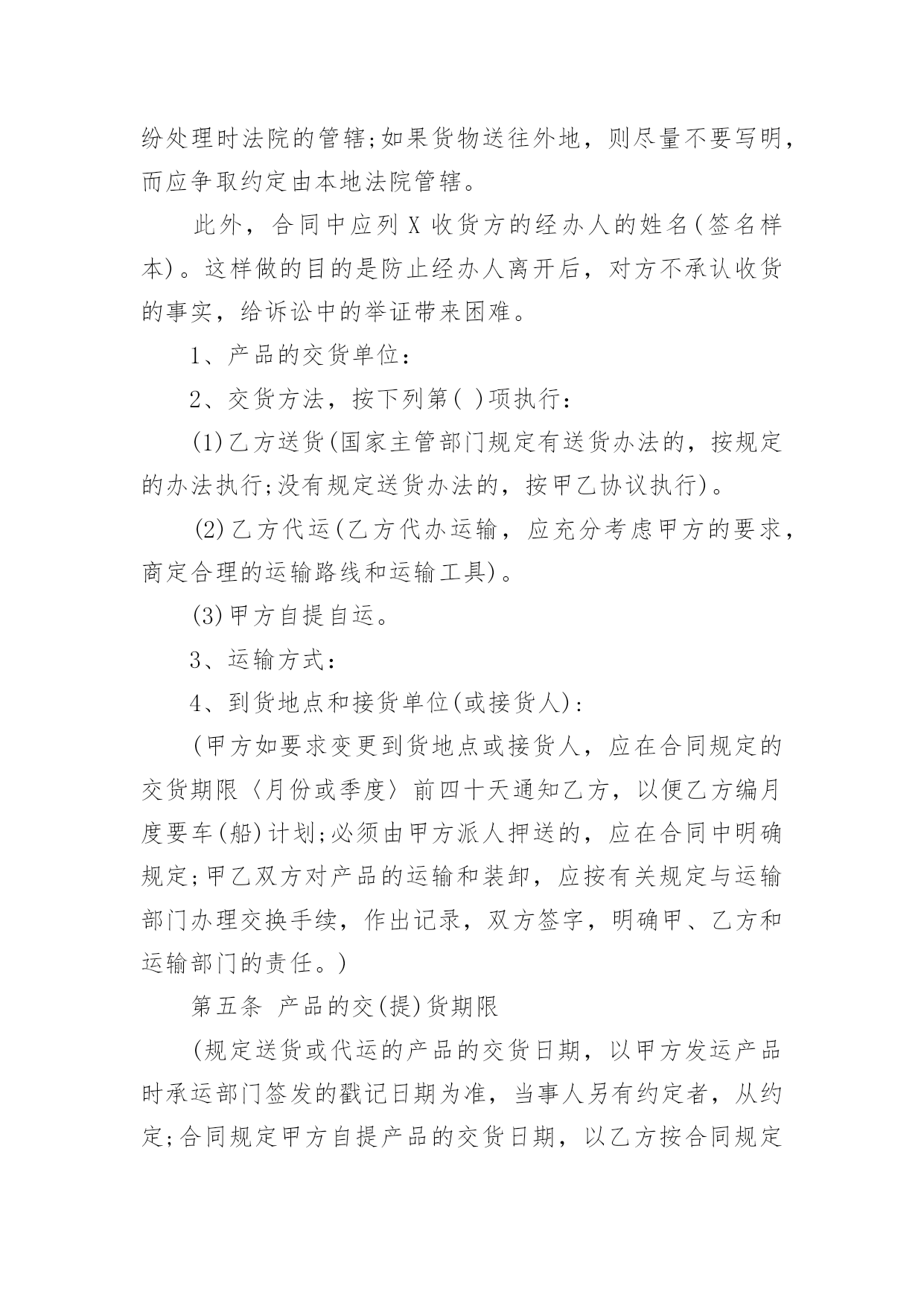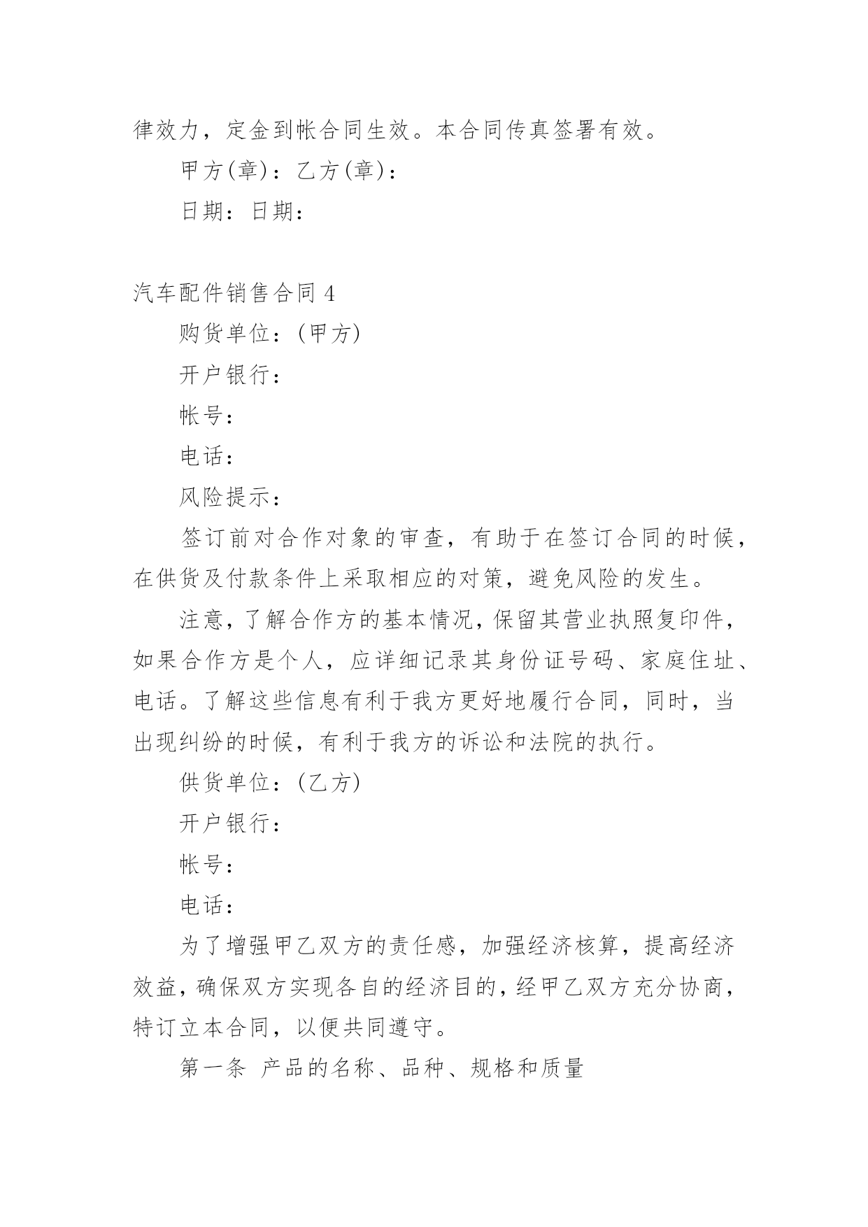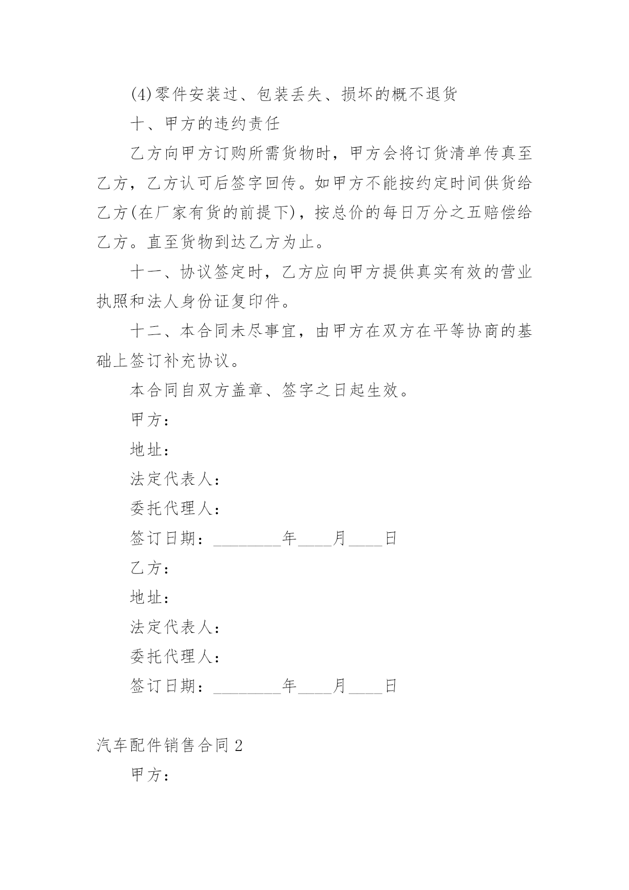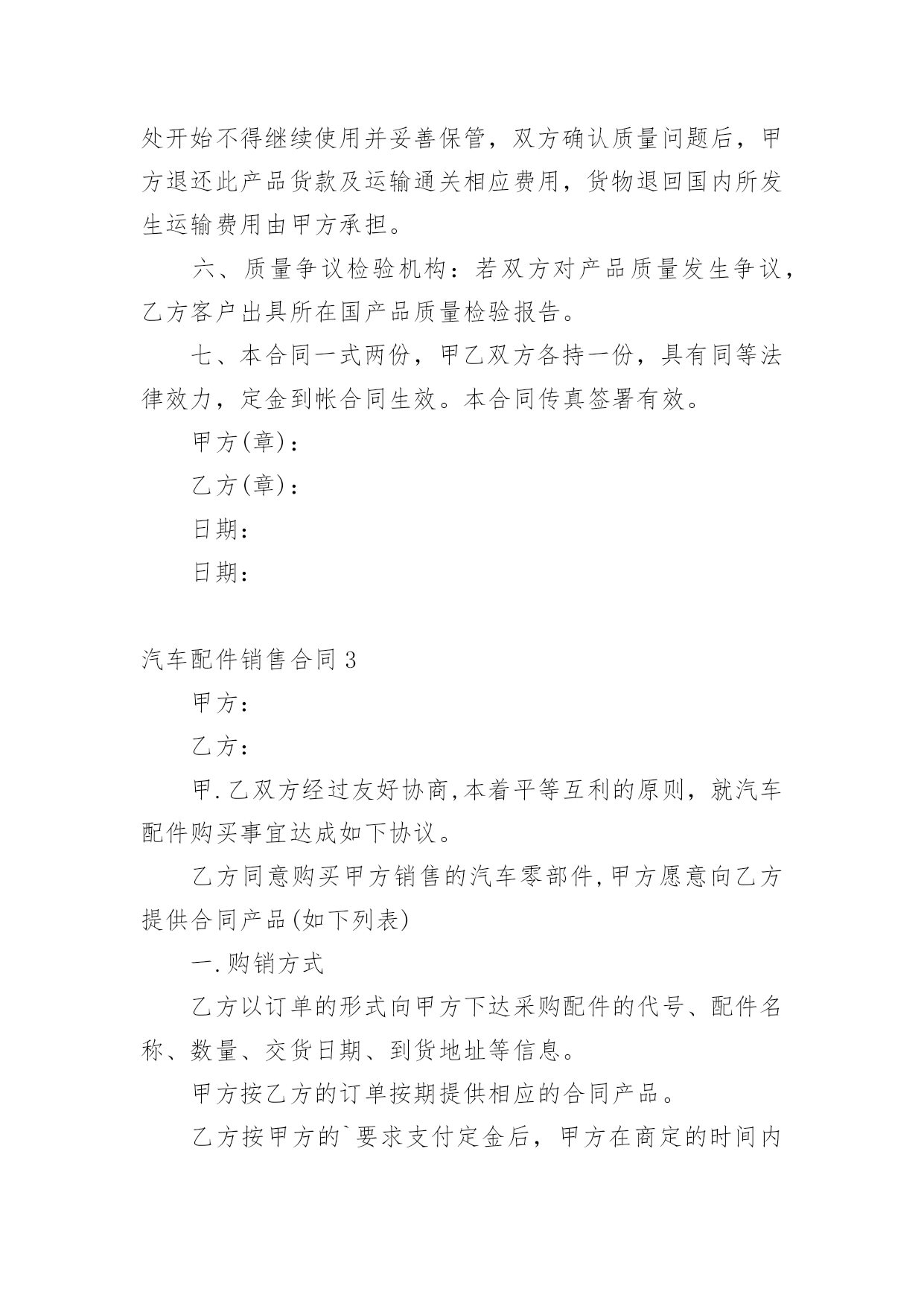 汽车配件销售合同汽车配件销售合同6篇现今很多公民的维权意识在不断增强,越来越多的人通过合同来调和民事关系,它也是减少和防止发生争议的重要措施。你所见过的合同是什么样的呢?以下是小编整理的汽车配件销售合同,仅供参考,大家一起来看看吧。汽车配件销售合同1甲方:_________________________乙方:_________________________甲乙双方经过友好协商,本着自愿的原则,就甲方向乙方销售________汽车零配等事宜,订立如下合同条款:一、甲方自本合同签订之日起。甲方依据本合同第三条约订的方式向乙方销售商标号码为__________的汽车用品等(简称货物)。二、甲方销售给乙方的货物应是___________原厂或合作公司生产(乙方指定配件)三、乙方将根据甲方电话确认、传真确认、或E-a确认订购的汽车配件项目清单向甲方供应所需零配件.四、乙方自己选择运输方式,委托运输公司办理货物的运输,并向运输公司支付运杂费用和保险费用。(因考虑到货物安全,所发货必须买保险)如买保险的货物出了问题,乙方应在第一时间和运输公司沟通协调问题货物并告之甲方。五、乙方验收合格的货物后,应在次月____日前向甲方付清本月甲方发货的货款。逾期支付时,应向甲方支付每日万分之五的违约金。该违约金应在支付当次货款时一并付清。逾期未付款时,甲方停止向乙方发货。超过____日仍未支付货款和违约金时,本合同终止履行。六、本合同因乙方未支付货款而终止履行时,如乙方在未支付货款前已向甲方发出下次《货物订单》传真,则应向甲方另行支付订货价值30%的违约金。七、因执行本合同发生争议,由争议双方协商解决,协商不成的`,任何一方均可向本合同签订的管辖权的人民法院提起诉讼。八、有关本合同的修改,必须以书面方式进行,并由甲、乙双方签署后生效。九、关于质保问题如下:1、甲方确保所供应的零配件为原厂零件及配套厂用品(在乙方指定需要范围内),所以甲方向乙方发的货物上都有甲方的标签为证,无标签的甲方概不承认,如发现甲方有以假乱真的情况,甲方按假一赔十赔偿给乙方。2、出现以下情况甲方不给予退货(1)经乙方确认代订的急件、期货。(2)乙方收到货物在当天未提出异议。(3)电器、灯具出门概不退货。(4)零件安装过、包装丢失、损坏的概不退货十、甲方的违约责任乙方向甲方订购所需货物时,甲方会将订货清单传真至乙方,乙方认可后签字回传。如甲方不能按约定时间供货给乙方(在厂家有货的前提下),按总价的每日万分之五赔偿给乙方。直至货物到达乙方为止。十一、协议签定时,乙方应向甲方提供真实有效的营业执照和法人身份证复印件。十二、本合同未尽事宜,由甲方在双方在平等协商的基础上签订补充协议。本合同自双方盖章、签字之日起生效。甲方:地址:法定代表人:委托代理人:签订日期:________年____月____日乙方:地址:法定代表人:委托代理人:签订日期:________年____月____日汽车配件销售合同2甲方:乙方:甲、乙双方经过友好协商,本着平等互利的原则,就汽车配件购买事宜达成如下协议。乙方同意购买甲方销售的汽车零部件,甲方愿意向乙方提供合同产品(如下列表)一、购销方式乙方以订单的形式向甲方下达采购配件的'代号、配件名称、数量、交货日期、到货地址等信息。甲方按乙方的订单按期提供相应的合同产品。乙方按甲方的要求支付定金后,甲方在商定的时间内按订单备齐货物,以备乙方检验,并负责协助乙方装车运输。二、结算方式:在购买前15天预付30%,70%余款在甲方仓库提货时付清。三、运输方式:乙方自提甲方协助装货或甲方代办运输,运费由乙方承担。四、包装要求:零部件生产厂家原包装。五、产品不符合客户使用要求或出现质量问题的处理方式1、乙方为甲方提供所需产品的配件代号、品名、规格、及图片等相关信息,甲方所提供产品与乙方客户要求不符时,甲方退还不符和产品的所有费用(产品货款及运输通关相应费用)2、产品使用开始三个月内,如发现产品质量问题,乙方应向甲方提出书面质量异议及相关图片资料,从出现质量处开始不得继续使用并妥善保管,双方确认质量问题后,甲方退还此产品货款及运输通关相应费用,货物退回国内所发生运输费用由甲方承担。六、质量争议检验机构:若双方对产品质量发生争议,乙方客户出具所在国产品质量检验报告。七、本合同一式两份,甲乙双方各持一份,具有同等法律效力,定金到帐合同生效。本合同传真签署有效。甲方(章):乙方(章):日期:日期:汽车配件销售合同3甲方:乙方:甲.乙双方经过友好协商,本着平等互利的原则,就汽车配件购买事宜达成如下协议。乙方同意购买甲方销售的汽车零部件,甲方愿意向乙方提供合同产品(如下列表)一.购销方式乙方以订单的形式向甲方下达采购配件的代号、配件名称、数量、交货日期、到货地址等信息。甲方按乙方的订单