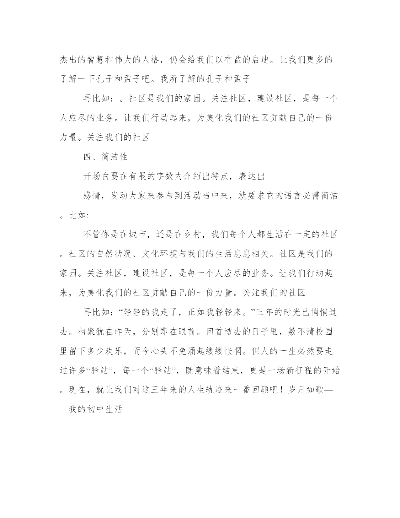 中考开场白的写法推荐一、介绍性因为是开场白,有向读者介绍有关相关内容的必要,所以它要对所介绍的对象或解释其特点,或说明其作用。比如:有人远离故土,原因各不相同,但乡愁是共同的。女娲造人的神话说明了祖先对土地的崇拜;开疆拓土是古代许多统治者成就霸业的目标;而保卫土地的故事更是不计其数。脚踏一方土再比如:提起小说,你一定不陌生。那生动的故事,鲜活的人物,一定给你留下过深刻的印象。走进小说天地二、抒情性既然是活动,总是大家关注的对象,是热点,大家总是对它充满感情的,所以要在开场白中表达出这种情绪。比如:三年的时光已悄悄过去。相聚犹在昨天,分别即在眼前。回首逝去的日子里,数不清校园里留下多少欢乐,而今心头不免涌起缕缕怅惘。岁月如歌——我的初中生活。再比如:音乐诠释人生的酸甜苦辣,表达生活的喜怒哀乐。有时,身体是沉重的,歌声却长着翅膀,带你飞翔。乘着音乐的翅膀三、鼓动性开场白是号召大家一起来参与到活动当中来所以它必须具有号召力和鼓动性。比如:孔子、孟子离我们的时代已十分久远,然而他们那杰出的智慧和伟大的人格,仍会给我们以有益的启迪。让我们更多的了解一下孔子和孟子吧。我所了解的孔子和孟子再比如:。社区是我们的家园。关注社区,建设社区,是每一个人应尽的业务。让我们行动起来,为美化我们的社区贡献自己的一份力量。关注我们的社区四、简洁性开场白要在有限的字数内介绍出特点,表达出感情,发动大家来参与到活动当中来,就要求它的语言必需简洁。比如:不管你是在城市,还是在乡村,我们每个人都生活在一定的社区。社区的自然状况、文化环境与我们的生活息息相关。社区是我们的家园。关注社区,建设社区,是每一个人应尽的业务。让我们行动起来,为美化我们的社区贡献自己的一份力量。关注我们的社区再比如:“轻轻的我走了,正如我轻轻来。”三年的时光已悄悄过去。相聚犹在昨天,分别即在眼前。回首逝去的日子里,数不清校园里留下多少欢乐,而今心头不免涌起缕缕怅惘。但人的一生必然要走过许多“驿站”,每一个“驿站”,既意味着结束,更是一场新征程的开始。现在,就让我们对这三年来的人生轨迹来一番回顾吧!岁月如歌——我的初中生活明确了开场白的特点,我们动起手来写就方便多了。怎么写呢?通过阅读以上开场白,我们发现:可引用,可抒情,可介绍,可比喻,可号召。