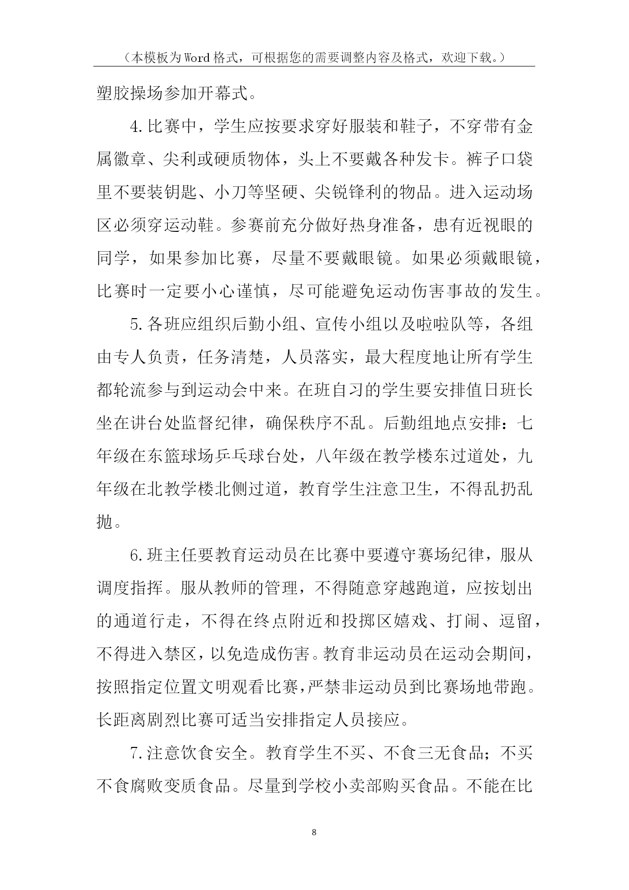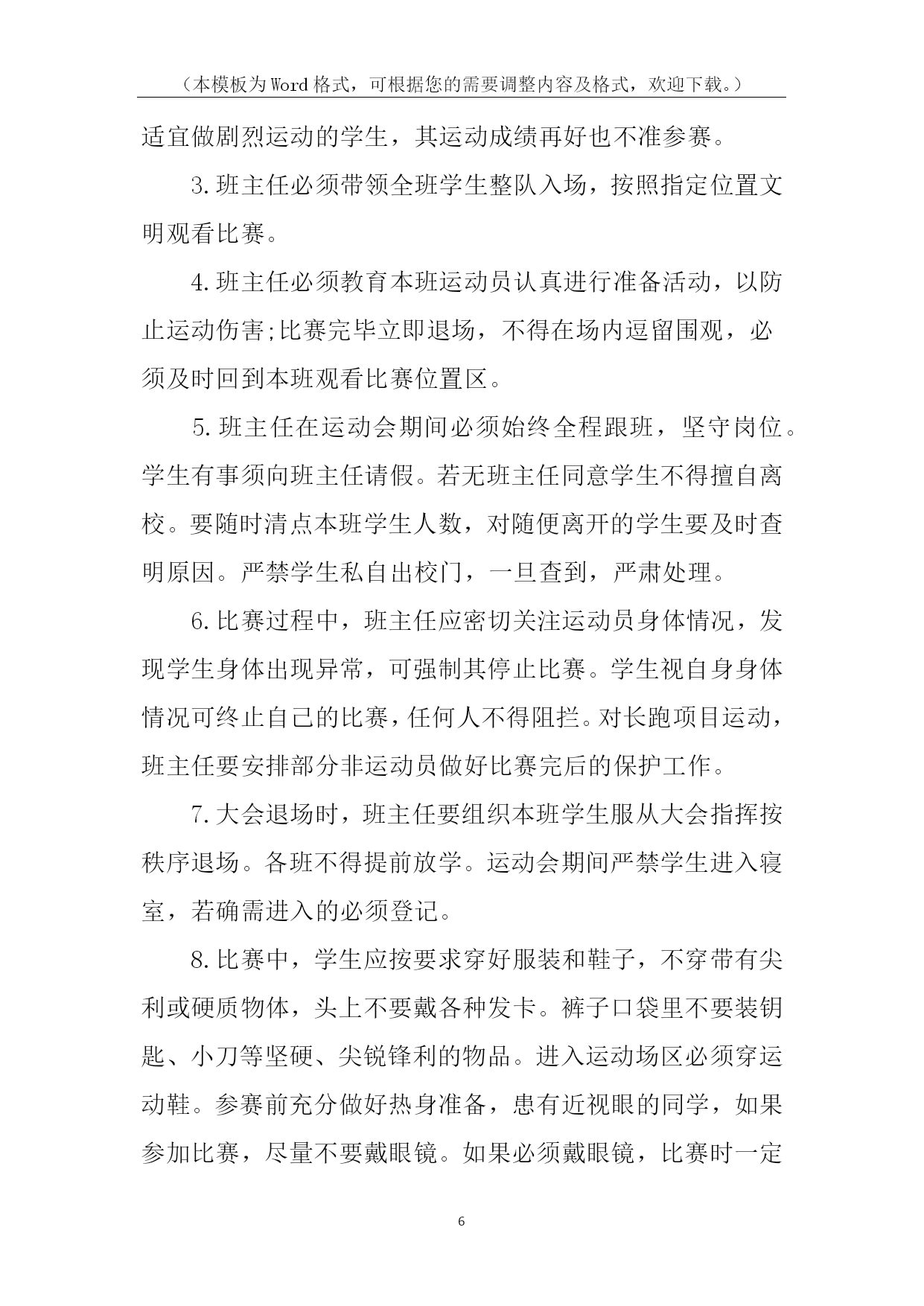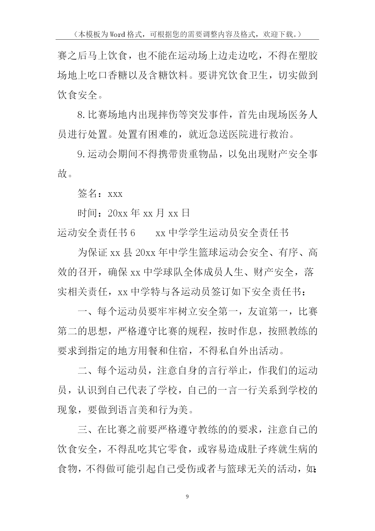 (本模板为Word格式,可根据您的需要调整内容及格式,欢迎下载。)PAGE\*MERGEFORMAT20运动安全责任书运动安全责任书1各位班主任:王家岗乡将于20xx年4月17日举办中小学春季运动会,届时我校将以班为单位参加这次运动会,班主任是所在班级的第一责任人,为使运动会顺利进行,确保我校学生人身安全,做到安全第一、比赛第二、充分准备、责任到人,特与班主任签订如下安全责任书:1、班主任必须向本班运动员就运动会过程中的每个细节提出纪律要求和注意事项,把安全教育放在首位。必须教育学生在比赛中要听从指挥。2、班主任必须精心组织,严格把关。对所有参赛学生的身体健康状况,要进行全面细致的了解。对目前身体状况不适宜做剧烈运动的学生,其运动成绩再好也不准参赛。3、班主任必须带领本班运动员整队往返学校到比赛场,班主任负责沿途本班运动员的交通安全。4,班主任必须教育本班运动员认真进行准备活动,以防止运动伤害。5、班主任在运动会期间必须始终全程跟班,坚守岗位。运动员有事须向班主任请假。若无班主任同意运动员不得擅自离开运动场。要随时清点本班运动员人数,对随便离开的要及时查明原因。6、比赛过程中,班主任应密切关注运动员身体情况,发现学生身体出现异常,可强制其停止比赛。学生视自身身体情况可终止自己的比赛,任何人不得阻拦。对长跑项目运动,班主任要安排部分非运动员做好比赛完后的保护工作。7、比赛中,学生应按要求穿好服装和鞋子,不穿带有尖利或硬质物体,头上不要戴各种发卡。裤子口袋里不要装钥匙、小刀等坚硬、尖锐锋利的物品。尽可能避免运动伤害事故的发生。8、比赛中,如果出现各种不可预知的紧急情况,由班主任及时组织好学生,听从大会组委会的统一指挥,按指定的路线有序撤离。9、工作不负责任造成重大事件和不良影响,学校将追究相关责任人的责任。班主任(签字):xxx运动安全责任书2本人自愿聚会组织参加xxxx年xx月xx日的户外露营踏青活动。Justwalkout群组织只是提供了活动的方案和聚集参加活动人员的平台。大家自愿结合出游,相互之间没有任何法律上的权利和义务。我声明:我自愿参加本次活动,并完全理解和认同活动计划。在活动中一切行为均属于个人行为,在活动中如果发生导致一切后果时,一切责任由本人自己承担,与Justwalkout组织及他人无关,并且由本人独自承担关于本人在活动中的任何法律责任。我了解本次活动是一次遵守《绿色营地公约》的纯AA制自助结伴户外活动,并非商业活动。我保证:1、一切行动听从领队指挥安排,绝不擅自离队出行;2、在整个活动期间,我将对自己的安全负责。3、拥有团结、友爱、奉献的精神。4、整个活动期间,我保证携带合适的装备、足够的食品、饮水,并对自己的一切行为负责。5、保护环境,不得在野外乱扔垃圾、有意破坏自然环境;6、身体健康,无不适合参与户外活动的疾病,具备参与本次活动的体能要求。全队统一出发、统一归队,出现任何事故责任自担,均与Justwalkout他人无关。签名:xxxx年xx月xx日运动安全责任书3张泽小学20xx年田径运动会,将于11月21日举行。为使我校运动会顺利进行,确保学生人身安全,做到安全第一、比赛第二、充分准备、渠道畅通、责任到人,特制定如下安全责任书:1.班主任必须利用晨会时间向学生就运动会过程中的每个细节提出纪律要求和注意事项,把安全教育放在首位。必须教育运动员在比赛中要听从指挥,特别是投掷运动员在未轮到比赛时不要乱拿器材,轮到比赛时要注意看看前、后、左、右有无观看的同学在禁区内,应在无人的时候方可投掷,以防失误,损伤别人;非运动员严禁到比赛场地围观、接人、带跑。2.班主任必须精心组织,严格把关。对所有参赛学生的身体健康状况,要进行全面细致的了解。对目前身体状况不适宜做剧烈运动的`学生,其运动成绩再好也不准参赛。3.班主任必须带领全班学生整队入场,按照指定位置就座,文明观看比赛。4.班主任必须带领本班运动员去检录处点名,运动员在点名后方能进入比赛场地。必须教育运动员认真进行准备活动,以防止运动伤害;比赛完毕立即退场,不得在场内逗留围观,必须及时回到本班观看比赛位置区。5.班主任在开会期间必须始终全程跟班,坚守岗位。学生有事须向班主任请假。若无班主任同意学生不得擅自离班。要随时清点本班学生人数,对随便离开的学生要及时查明原因。严禁学生私自出校门,一旦查到,严肃处理。6.比赛过程中,班主任应密切关注运动员身体情况,发现学生身体出现异常,可强制其停止比赛。学生视自身身体情况可终止自己的比赛,任何人不得阻拦。对长跑项目运动,班主任要安排部分非运动员做好比赛完后的保护工作。7.大会退场时,班主任要组织本班学生服从大会指挥按秩序退场。各班不得提前放学。8.比赛中,如果出现各种不可预知的紧急情况,由班主任及时组织好学生,