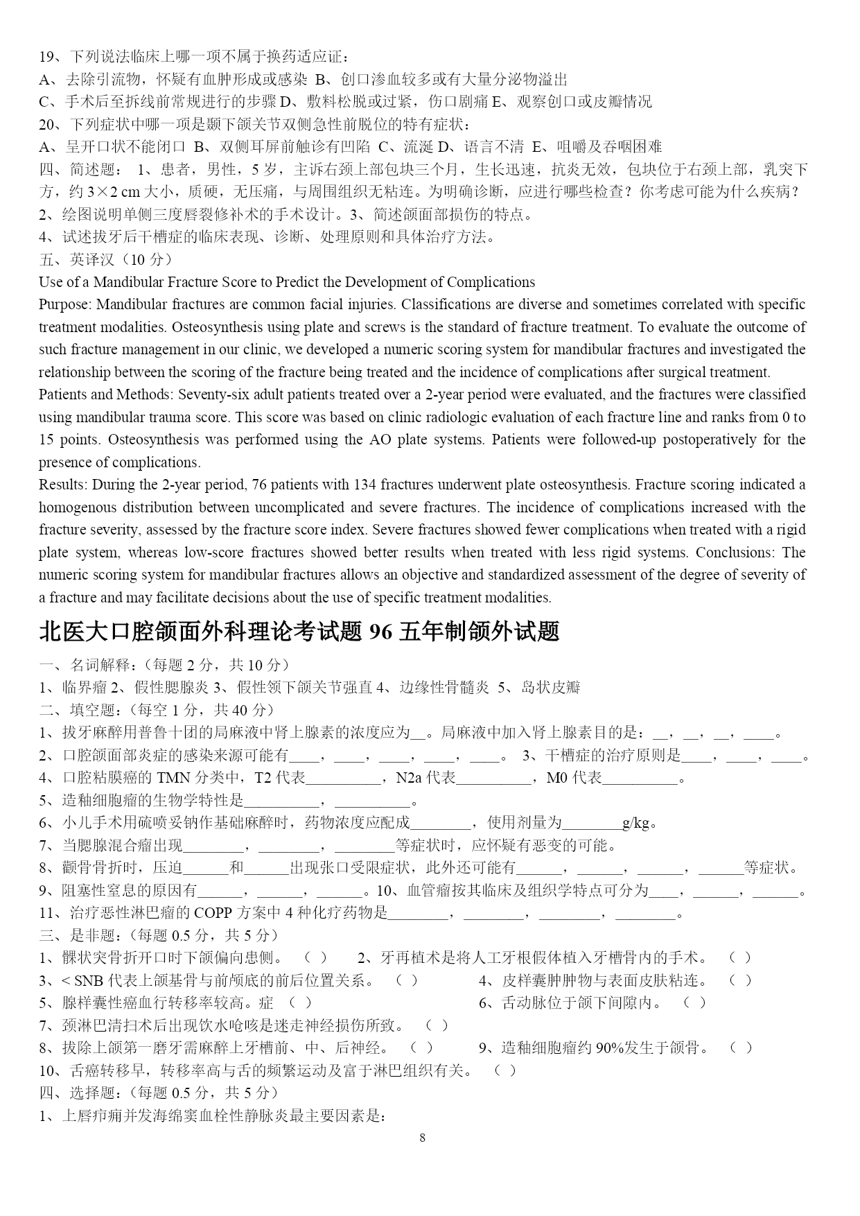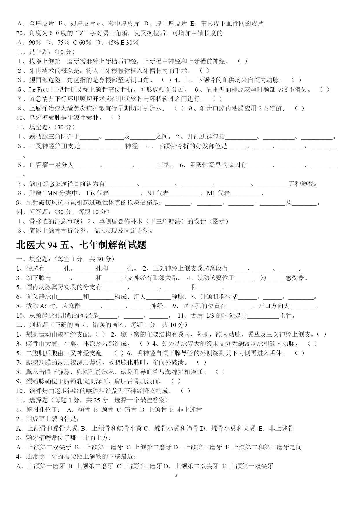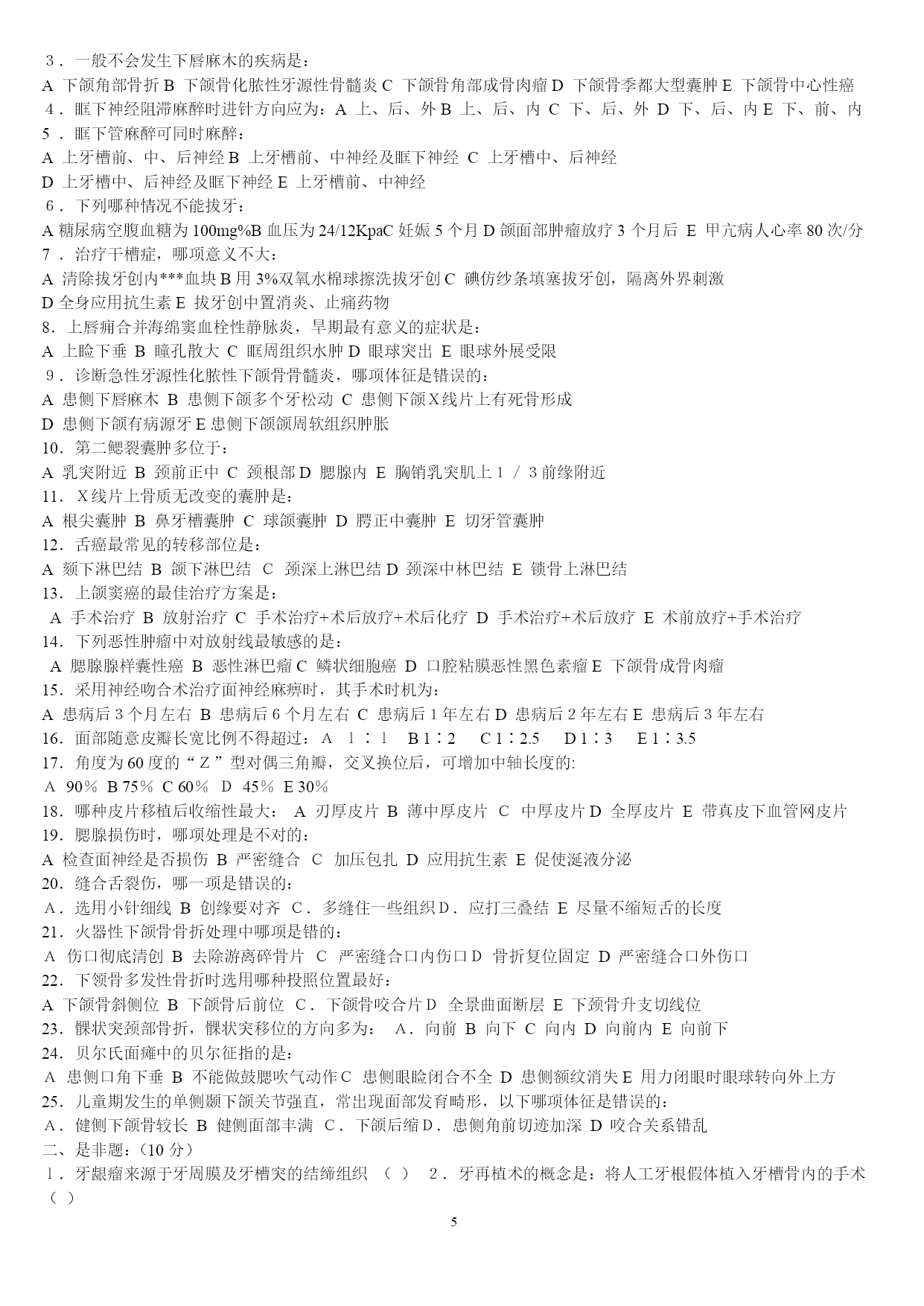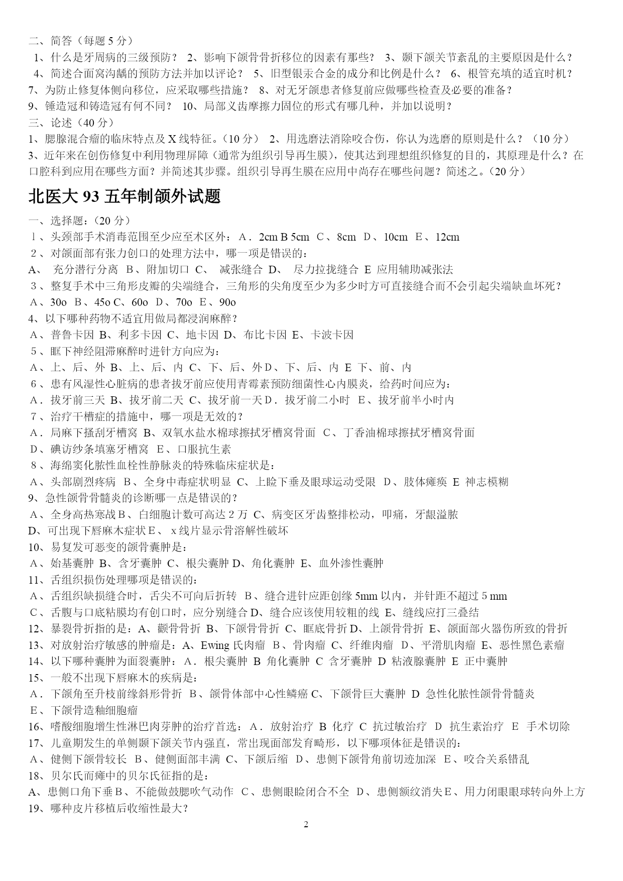 PAGEPAGE25山东大学医学院2005年口腔基础综合(硕士)一、名词解释1牙合2司比曲线3蝶骨翼突钩4颈白线5翼下颌皱襞6腮腺床7轴角8翼丛二、问答题1颈鞘起止位置,内容,及相互位置关系.2试述牙齿的发育过程3牙列的外形及其特点4为什么要对乳牙保健?5述前磨牙的牙体形态的临床意义6牙釉质龋的镜下表现7翼颌间隙界限,内容,交通?8牙周膜的组织结构9颞下颌关节由几条韧带组成,各韧带起止位置10成釉细胞瘤的病理改变11扁平苔藓的病理特点2007年山东大学口腔综合考试题1.longcentric腮腺床balkwill角nasofrontalangle2.硬腭软组织的特点及其临床意义3.谈谈对尖牙保护合和组牙功能合的认识4.气球变性托姆斯突分泌管管周牙本质5.釉质龋中透明层镜下表征及形成原因6.腺泡细胞癌的病理变化7.涎石病阻滞麻醉8.颌骨骨折切开复位固定术常用手术通路有哪些9.牙周手术治疗后的愈合方式10.neutralzoneimplantsupporteddenture11.充填治疗后疼痛原因有哪些12.桩核冠修复时桩的长度要求13.固定桥固位体设计原则14.阻抗中心矫形力15.面部侧面观应观察哪些方面16.早期矫治的临床特点天津医科大学1999年口腔综合(硕士)一、名解解释(30%)1、Residualcyst2、感染3、溃疡4、Chronicdiscoidlupuserythematosus5、牙内吸收6、Inclinationofincisalpath7、Overdenture8、Enamelhypoplasia9、牙周膜10、Behcet'ssyndrome二简答(40%)1、G。V。BLACK洞型分类法2、活髓切断术的适应症和原理3、可摘局部义齿的组成及其作用4、RPI卡环组的优点5、口腔颌面部损伤的特点三、论述(30%)1、下颌骨骨折的诊断与治疗2、多形性腺瘤的病理天津医科大学2000年口腔综合(硕士)一、名解(每题2分)1、idealnormalocclusion2、ClassInectroclusion3、一般矫治4、Moyers预测分析5、间接盖髓术二、简答(每题5分)1、什么是牙周病的三级预防?2、影响下颌骨骨折移位的因素有那些?3、颞下颌关节紊乱的主要原因是什么?4、简述合面窝沟龋的预防方法并加以评论?5、旧型银汞合金的成分和比例是什么?6、根管充填的适宜时机?7、为防止修复体侧向移位,应采取哪些措施?8、对无牙颌患者修复前应做哪些检查及必要的准备?9、锤造冠和铸造冠有何不同?10、局部义齿摩擦力固位的形式有哪几种,并加以说明?三、论述(40分)1、腮腺混合瘤的临床特点及X线特征。(10分)2、用选磨法消除咬合伤,你认为选磨的原则是什么?(10分)3、近年来在创伤修复中利用物理屏障(通常为组织引导再生膜),使其达到理想组织修复的目的,其原理是什么?在口腔科到应用在哪些方面?并简述其步骤。组织引导再生膜在应用中尚存在哪些问题?简述之。(20分)北医大93五年制颌外试题一、选择题:(20分)l、头颈部手术消毒范围至少应至术区外:A.2cmB5cmC、8cmD、10cmE、12cm2、对颌面部有张力创口的处理方法中,哪一项是错误的:A、充分潜行分离B、附加切口C、减张缝合D、尽力拉拢缝合E应用辅助减张法3、整复手术中三角形皮瓣的尖端缝合,三角形的尖角度至少为多少时方可直接缝合而不会引起尖端缺血坏死?A、30oB、45oC、60oD、70oE、90o4、以下哪种药物不适宜用做局都浸润麻醉?A、普鲁卡因B、利多卡因C、地卡因D、布比卡因E、卡波卡因5、眶下神经阻滞麻醉时进针方向应为:A、上、后、外B、上、后、内C、下、后、外D、下、后、内E下、前、内6、患有风湿性心脏病的患者拔牙前应使用青霉素预防细菌性心内膜炎,给药时间应为:A.拔牙前三天B、拔牙前二天C、拔牙前一天D.拔牙前二小时E、拔牙前半小时内7、治疗干槽症的措施中,哪一项是无效的?A.局麻下搔刮牙槽窝B、双氧水盐水棉球擦拭牙槽窝骨面C、丁香油棉球擦拭牙槽窝骨面D、碘访纱条填塞牙槽窝E、口服抗生素8、海绵窦化脓性血栓性静脉炎的特殊临床症状是:A、头部剧烈疼病B、全身中毒症状明显C、上睑下垂及眼球运动受限D、肢体瘫痪E神志模糊9、急性颌骨骨髓炎的诊断哪一点是错误的?A、全身高热寒战B、白细胞计数可高达2万C、病变区牙齿整排松动,叩痛,牙龈溢脓D、可出现下唇麻木症状E、x线片显示骨溶解性破坏10、易复发可恶变的颌骨囊肿是:A、始基囊肿B、含牙囊肿C、根尖囊肿D、角化囊肿E、血外渗性囊肿11、舌组