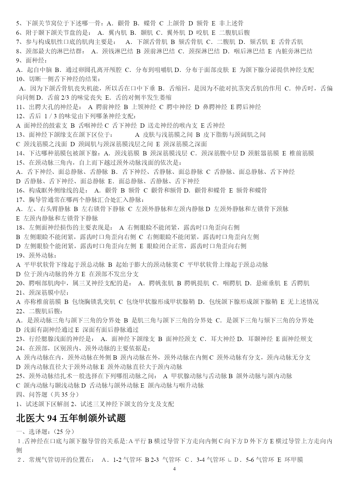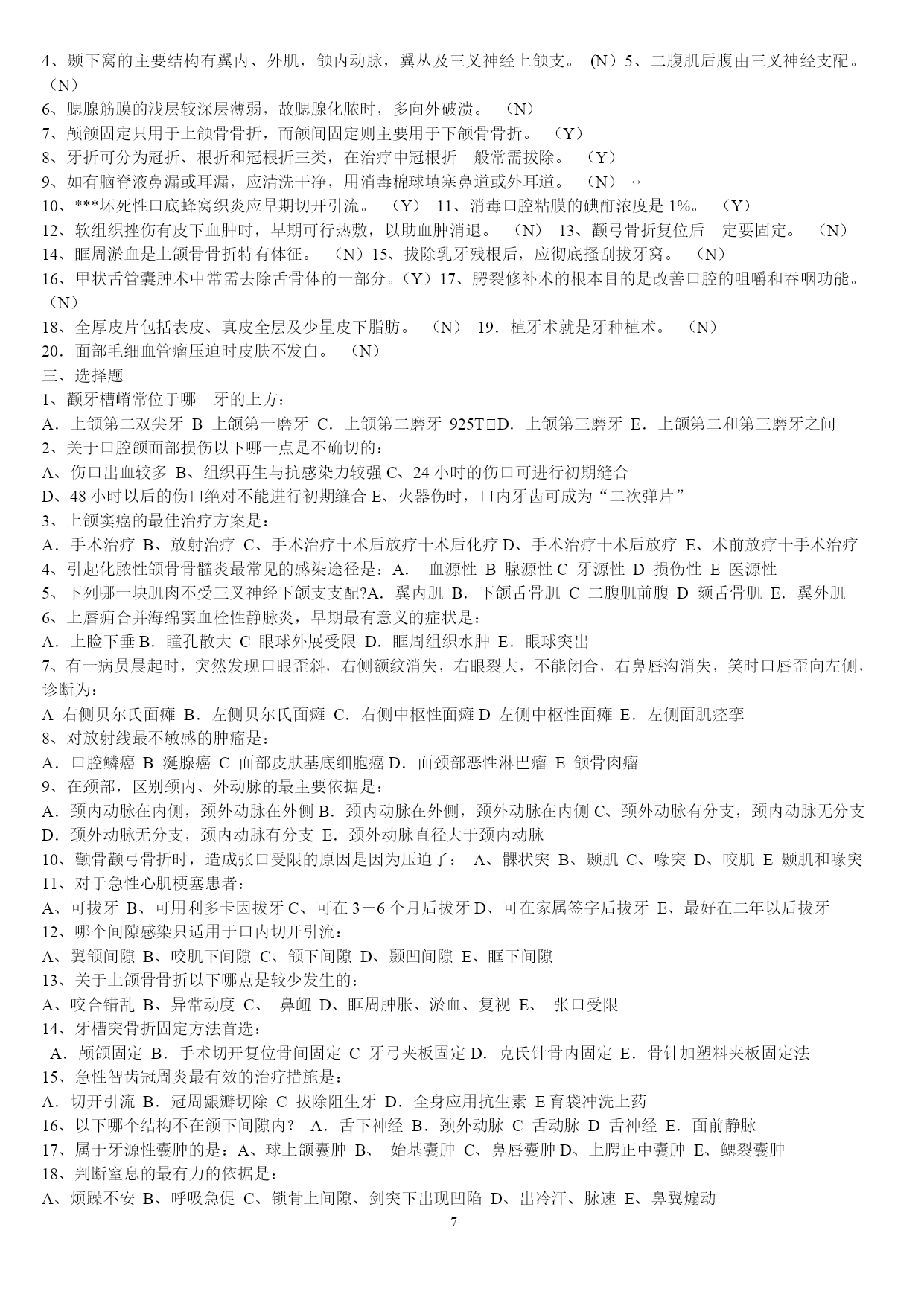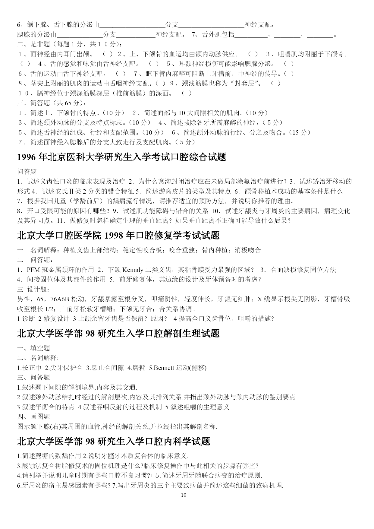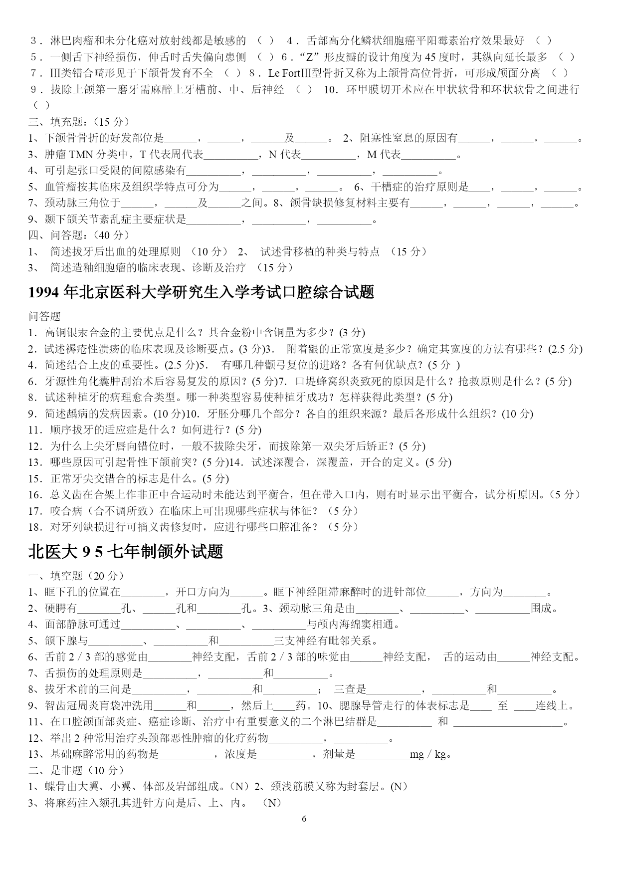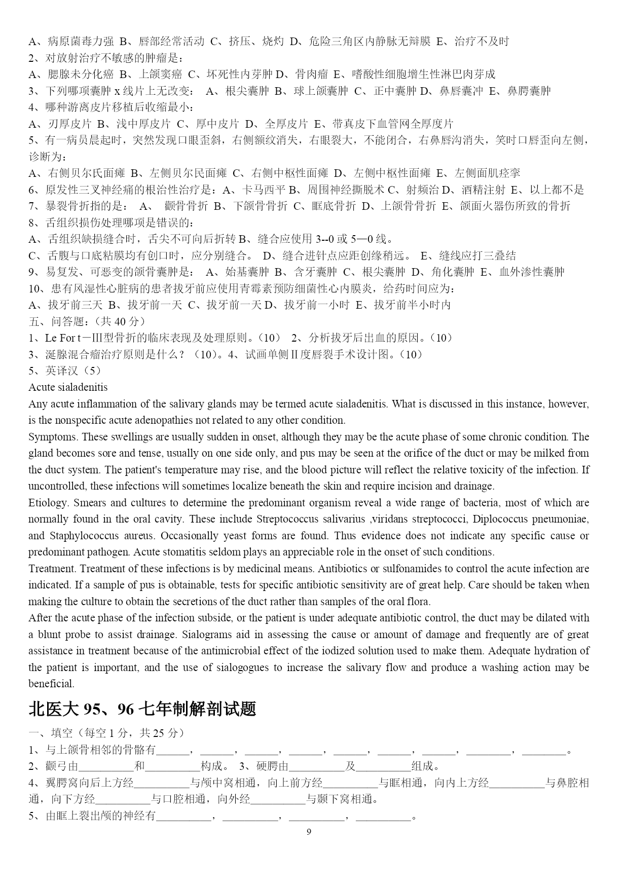 PAGEPAGE25山东大学医学院2005年口腔基础综合(硕士)一、名词解释1牙合2司比曲线3蝶骨翼突钩4颈白线5翼下颌皱襞6腮腺床7轴角8翼丛二、问答题1颈鞘起止位置,内容,及相互位置关系.2试述牙齿的发育过程3牙列的外形及其特点4为什么要对乳牙保健?5述前磨牙的牙体形态的临床意义6牙釉质龋的镜下表现7翼颌间隙界限,内容,交通?8牙周膜的组织结构9颞下颌关节由几条韧带组成,各韧带起止位置10成釉细胞瘤的病理改变11扁平苔藓的病理特点2007年山东大学口腔综合考试题1.longcentric腮腺床balkwill角nasofrontalangle2.硬腭软组织的特点及其临床意义3.谈谈对尖牙保护合和组牙功能合的认识4.气球变性托姆斯突分泌管管周牙本质5.釉质龋中透明层镜下表征及形成原因6.腺泡细胞癌的病理变化7.涎石病阻滞麻醉8.颌骨骨折切开复位固定术常用手术通路有哪些9.牙周手术治疗后的愈合方式10.neutralzoneimplantsupporteddenture11.充填治疗后疼痛原因有哪些12.桩核冠修复时桩的长度要求13.固定桥固位体设计原则14.阻抗中心矫形力15.面部侧面观应观察哪些方面16.早期矫治的临床特点天津医科大学1999年口腔综合(硕士)一、名解解释(30%)1、Residualcyst2、感染3、溃疡4、Chronicdiscoidlupuserythematosus5、牙内吸收6、Inclinationofincisalpath7、Overdenture8、Enamelhypoplasia9、牙周膜10、Behcet'ssyndrome二简答(40%)1、G。V。BLACK洞型分类法2、活髓切断术的适应症和原理3、可摘局部义齿的组成及其作用4、RPI卡环组的优点5、口腔颌面部损伤的特点三、论述(30%)1、下颌骨骨折的诊断与治疗2、多形性腺瘤的病理天津医科大学2000年口腔综合(硕士)一、名解(每题2分)1、idealnormalocclusion2、ClassInectroclusion3、一般矫治4、Moyers预测分析5、间接盖髓术二、简答(每题5分)1、什么是牙周病的三级预防?2、影响下颌骨骨折移位的因素有那些?3、颞下颌关节紊乱的主要原因是什么?4、简述合面窝沟龋的预防方法并加以评论?5、旧型银汞合金的成分和比例是什么?6、根管充填的适宜时机?7、为防止修复体侧向移位,应采取哪些措施?8、对无牙颌患者修复前应做哪些检查及必要的准备?9、锤造冠和铸造冠有何不同?10、局部义齿摩擦力固位的形式有哪几种,并加以说明?三、论述(40分)1、腮腺混合瘤的临床特点及X线特征。(10分)2、用选磨法消除咬合伤,你认为选磨的原则是什么?(10分)3、近年来在创伤修复中利用物理屏障(通常为组织引导再生膜),使其达到理想组织修复的目的,其原理是什么?在口腔科到应用在哪些方面?并简述其步骤。组织引导再生膜在应用中尚存在哪些问题?简述之。(20分)北医大93五年制颌外试题一、选择题:(20分)l、头颈部手术消毒范围至少应至术区外:A.2cmB5cmC、8cmD、10cmE、12cm2、对颌面部有张力创口的处理方法中,哪一项是错误的:A、充分潜行分离B、附加切口C、减张缝合D、尽力拉拢缝合E应用辅助减张法3、整复手术中三角形皮瓣的尖端缝合,三角形的尖角度至少为多少时方可直接缝合而不会引起尖端缺血坏死?A、30oB、45oC、60oD、70oE、90o4、以下哪种药物不适宜用做局都浸润麻醉?A、普鲁卡因B、利多卡因C、地卡因D、布比卡因E、卡波卡因5、眶下神经阻滞麻醉时进针方向应为:A、上、后、外B、上、后、内C、下、后、外D、下、后、内E下、前、内6、患有风湿性心脏病的患者拔牙前应使用青霉素预防细菌性心内膜炎,给药时间应为:A.拔牙前三天B、拔牙前二天C、拔牙前一天D.拔牙前二小时E、拔牙前半小时内7、治疗干槽症的措施中,哪一项是无效的?A.局麻下搔刮牙槽窝B、双氧水盐水棉球擦拭牙槽窝骨面C、丁香油棉球擦拭牙槽窝骨面D、碘访纱条填塞牙槽窝E、口服抗生素8、海绵窦化脓性血栓性静脉炎的特殊临床症状是:A、头部剧烈疼病B、全身中毒症状明显C、上睑下垂及眼球运动受限D、肢体瘫痪E神志模糊9、急性颌骨骨髓炎的诊断哪一点是错误的?A、全身高热寒战B、白细胞计数可高达2万C、病变区牙齿整排松动,叩痛,牙龈溢脓D、可出现下唇麻木症状E、x线片显示骨溶解性破坏10、易复发可恶变的颌骨囊肿是:A、始基囊肿B、含牙囊肿C、根尖囊肿D、角化囊肿E、血外渗性囊肿11、舌组