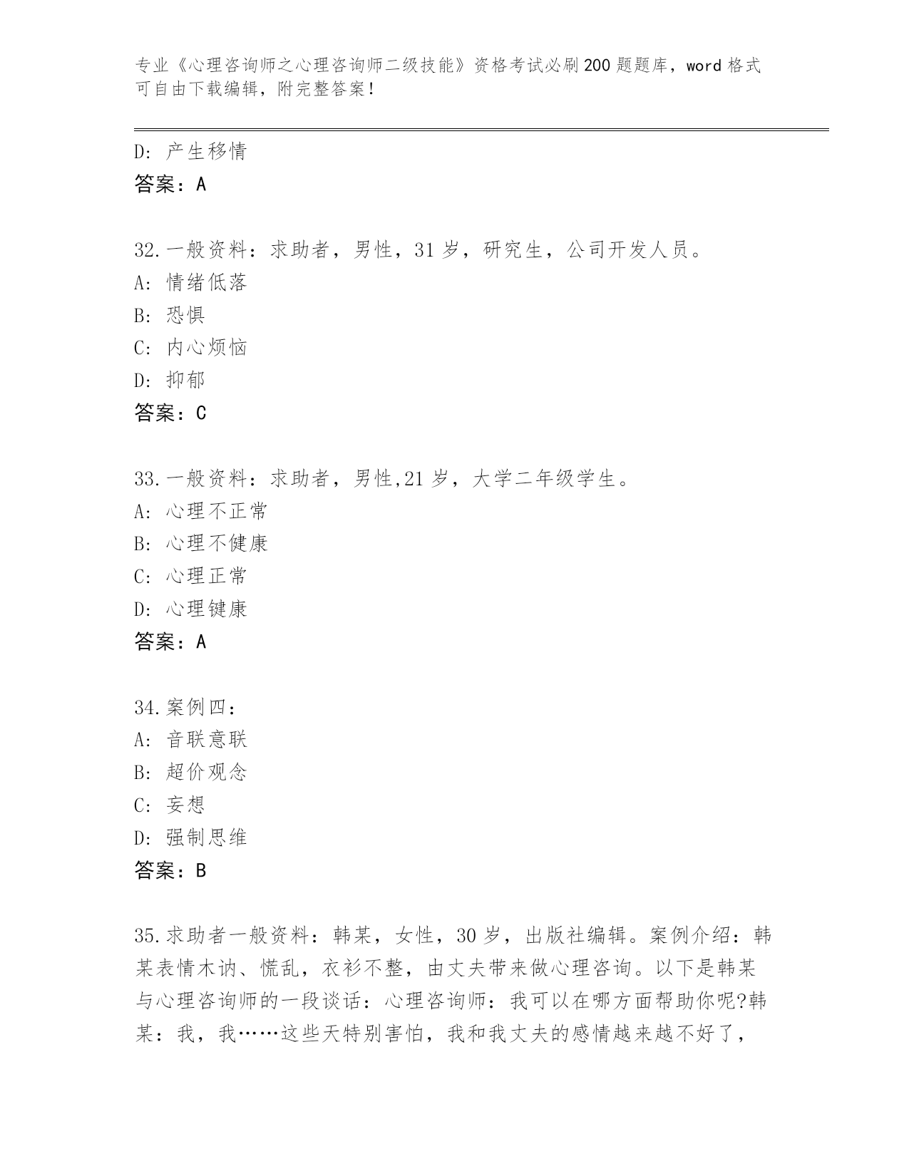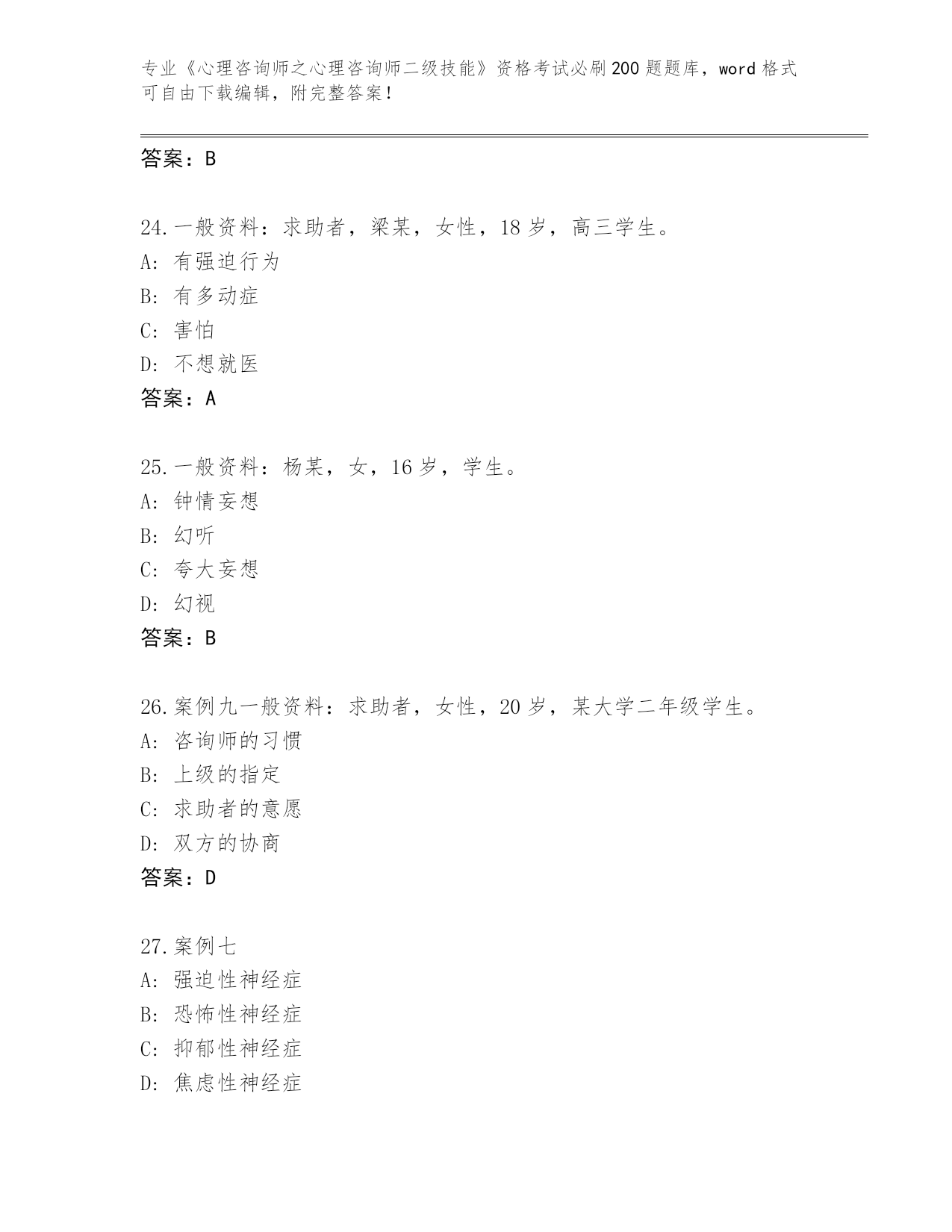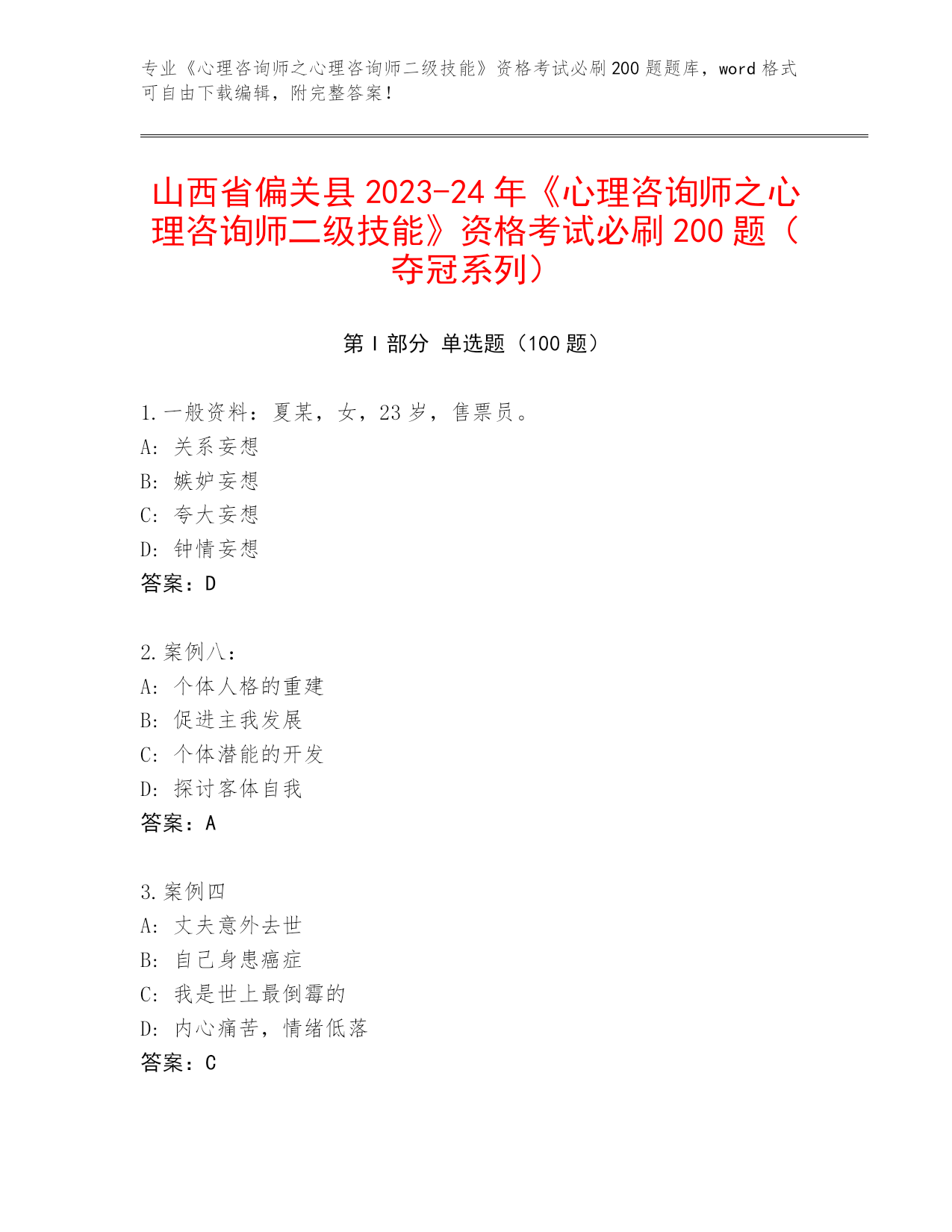 山西省永和县2024《心理咨询师之心理咨询师二级技能》资格考试必刷200题真题题库(夺冠系列)