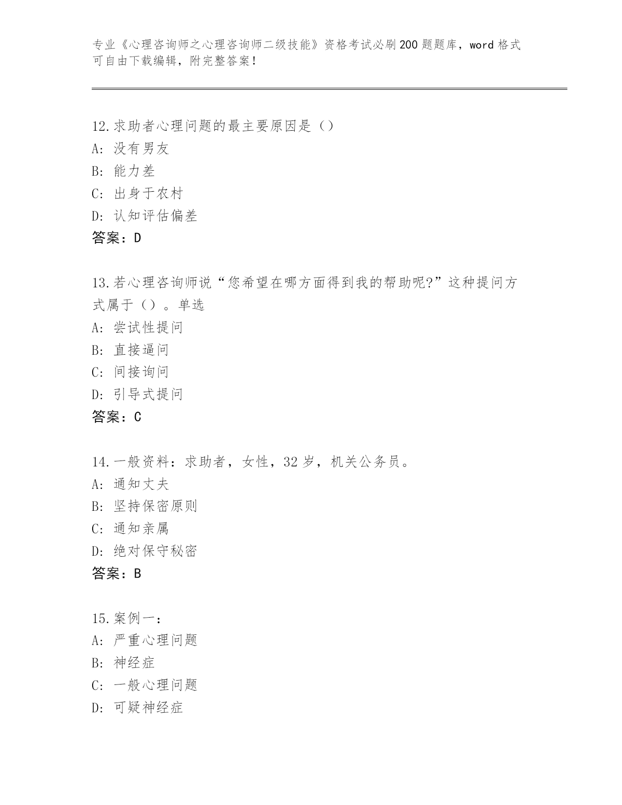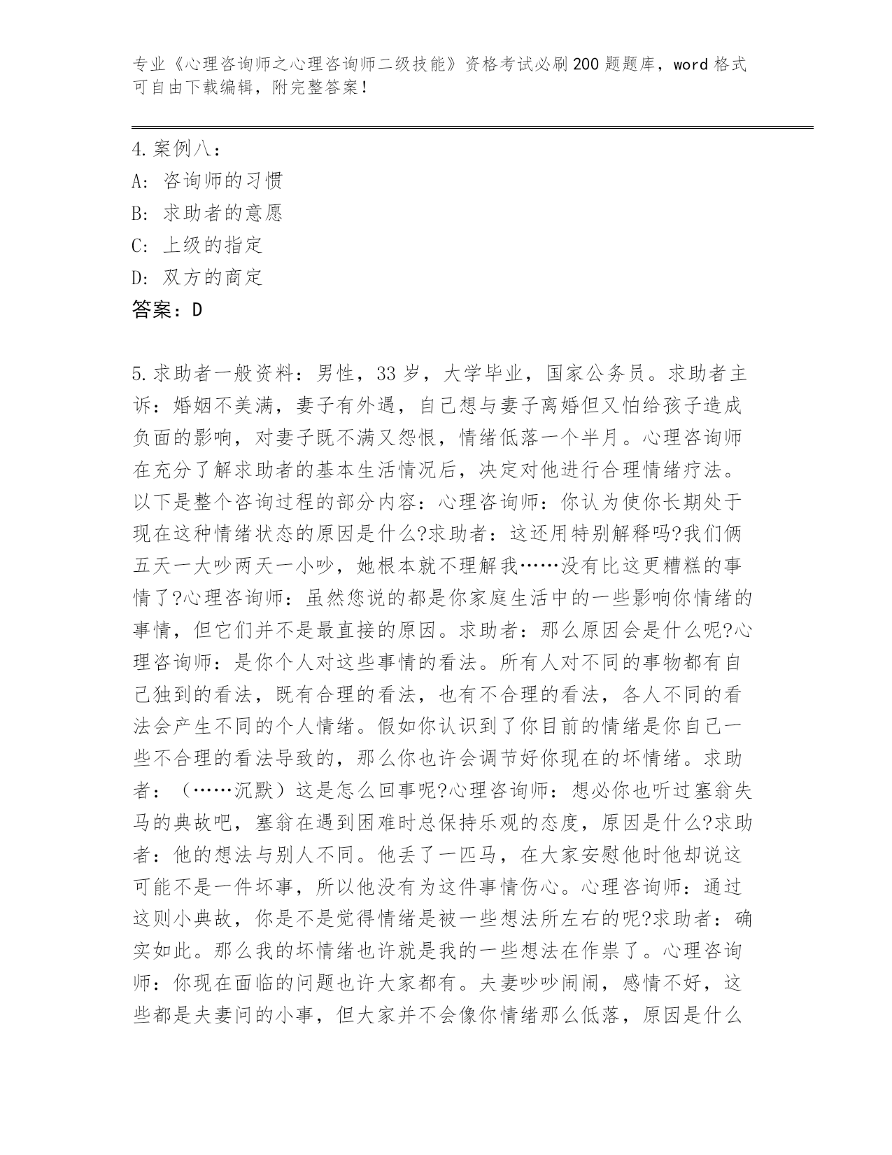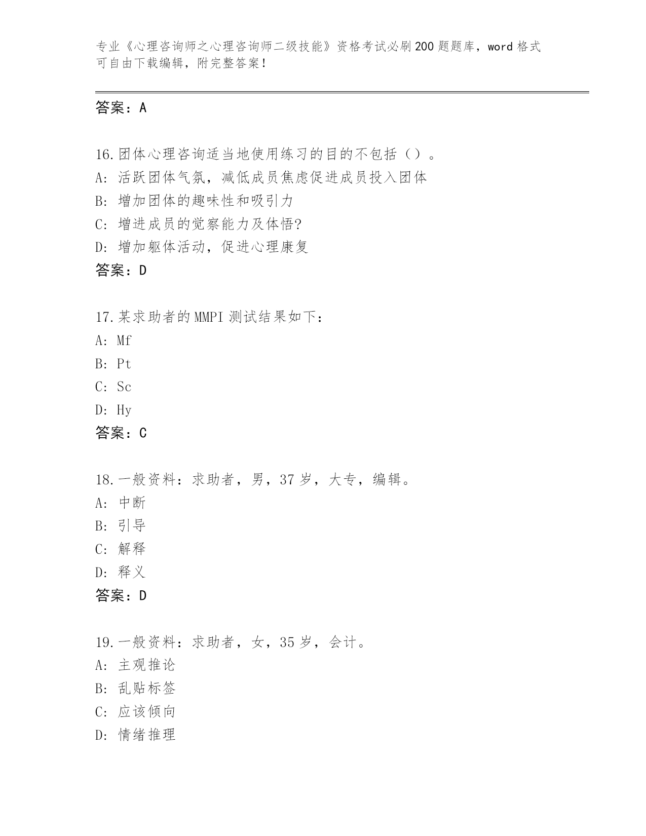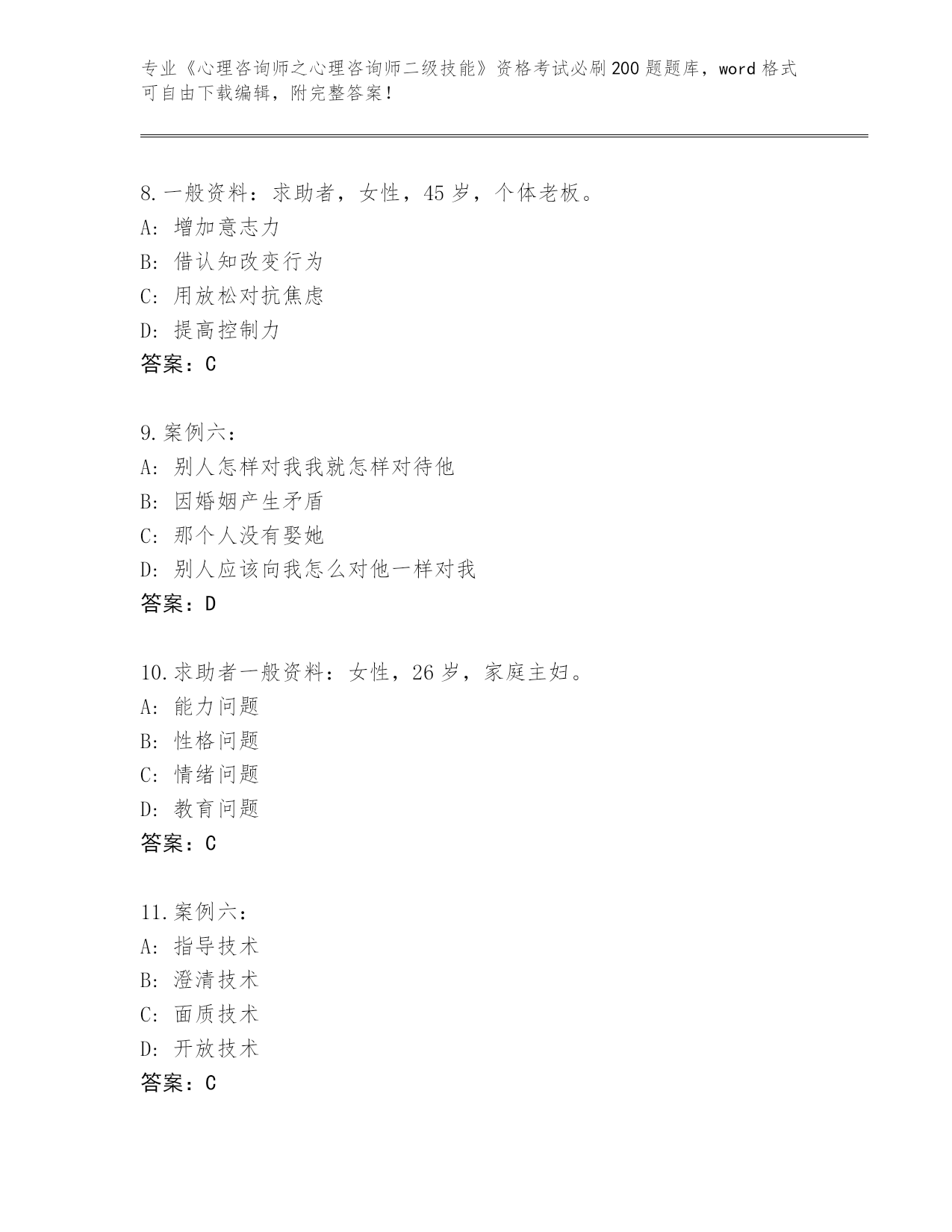 广东省麻章区整理《心理咨询师之心理咨询师二级技能》资格考试必刷200题(夺冠系列)