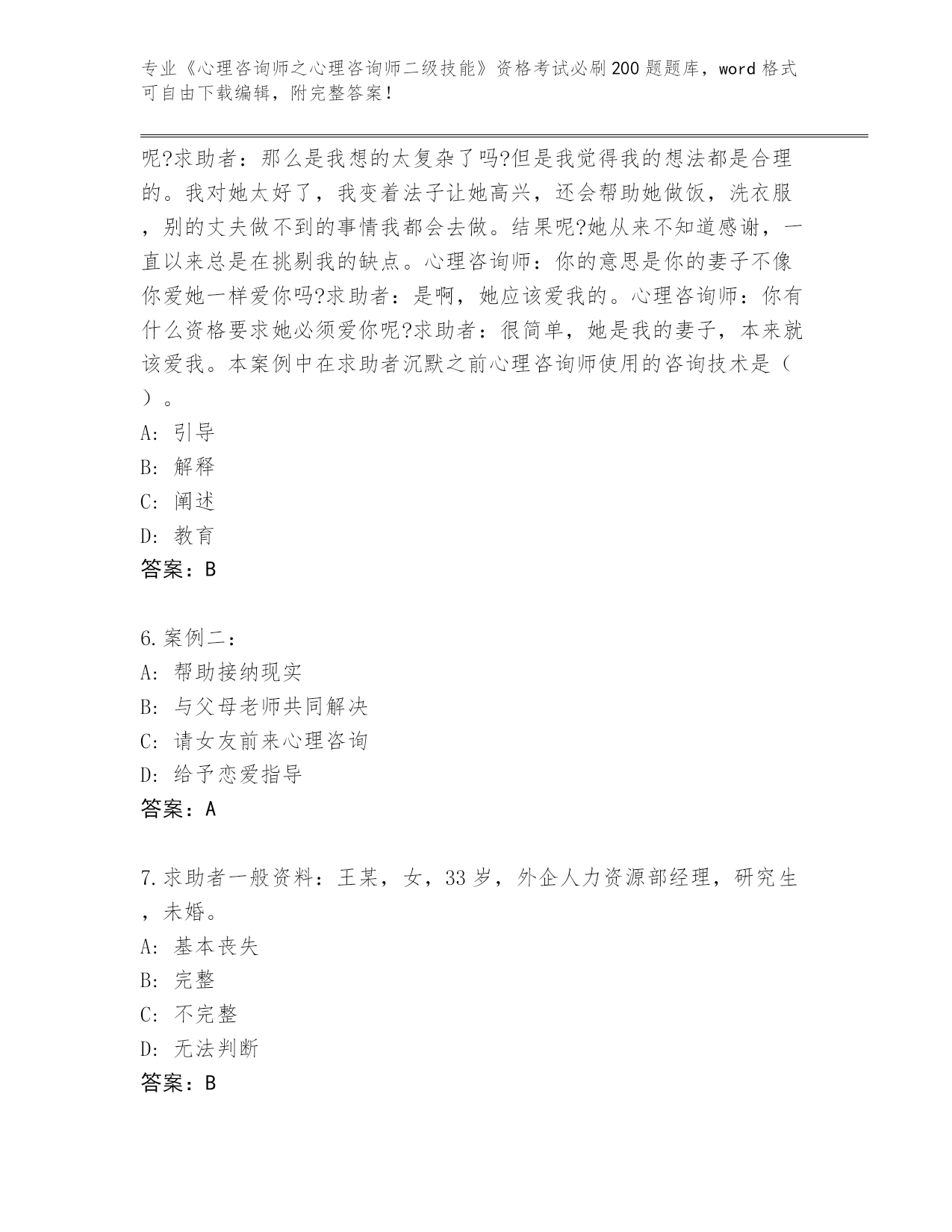 山西省偏关县历年《心理咨询师之心理咨询师二级技能》考试必刷200题内部题库(历年真题)