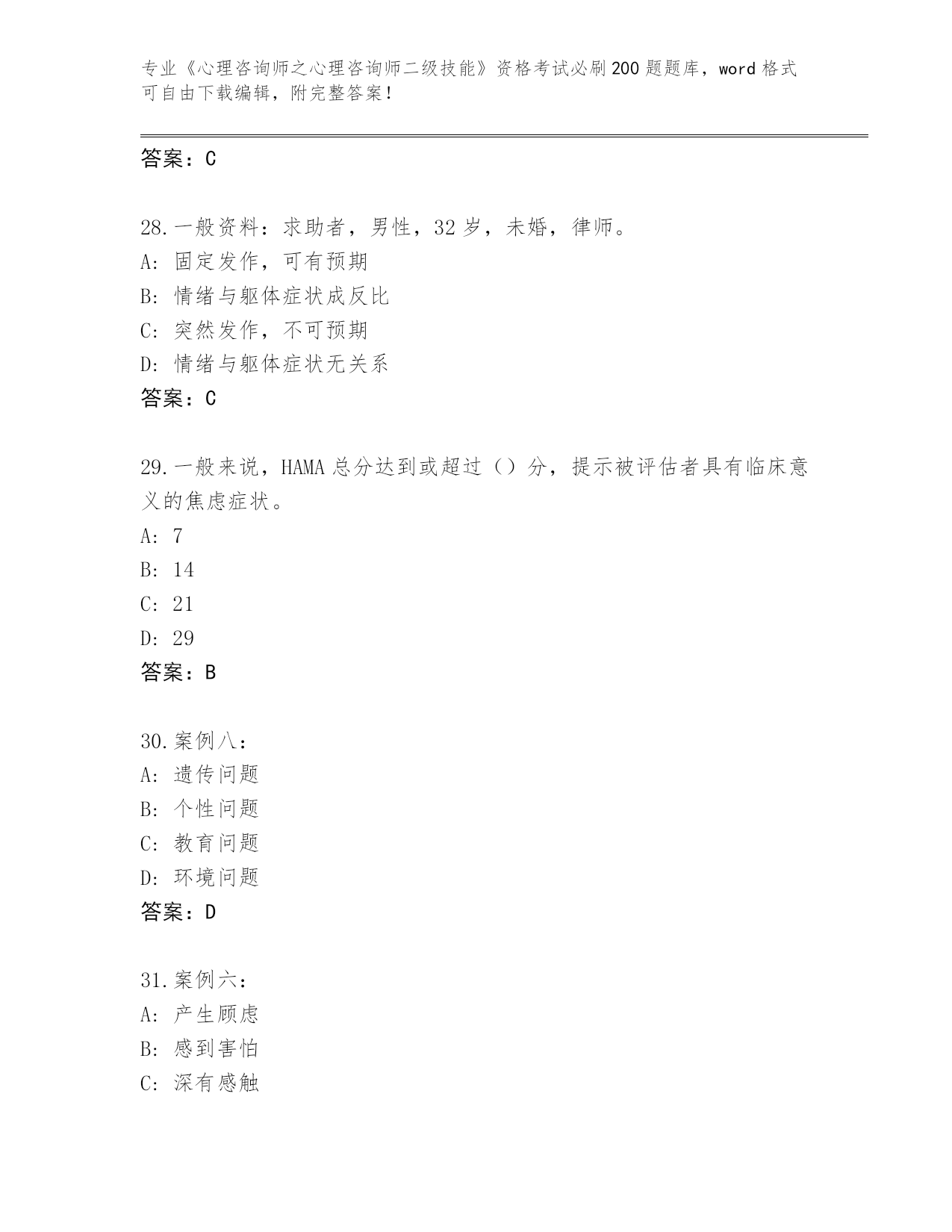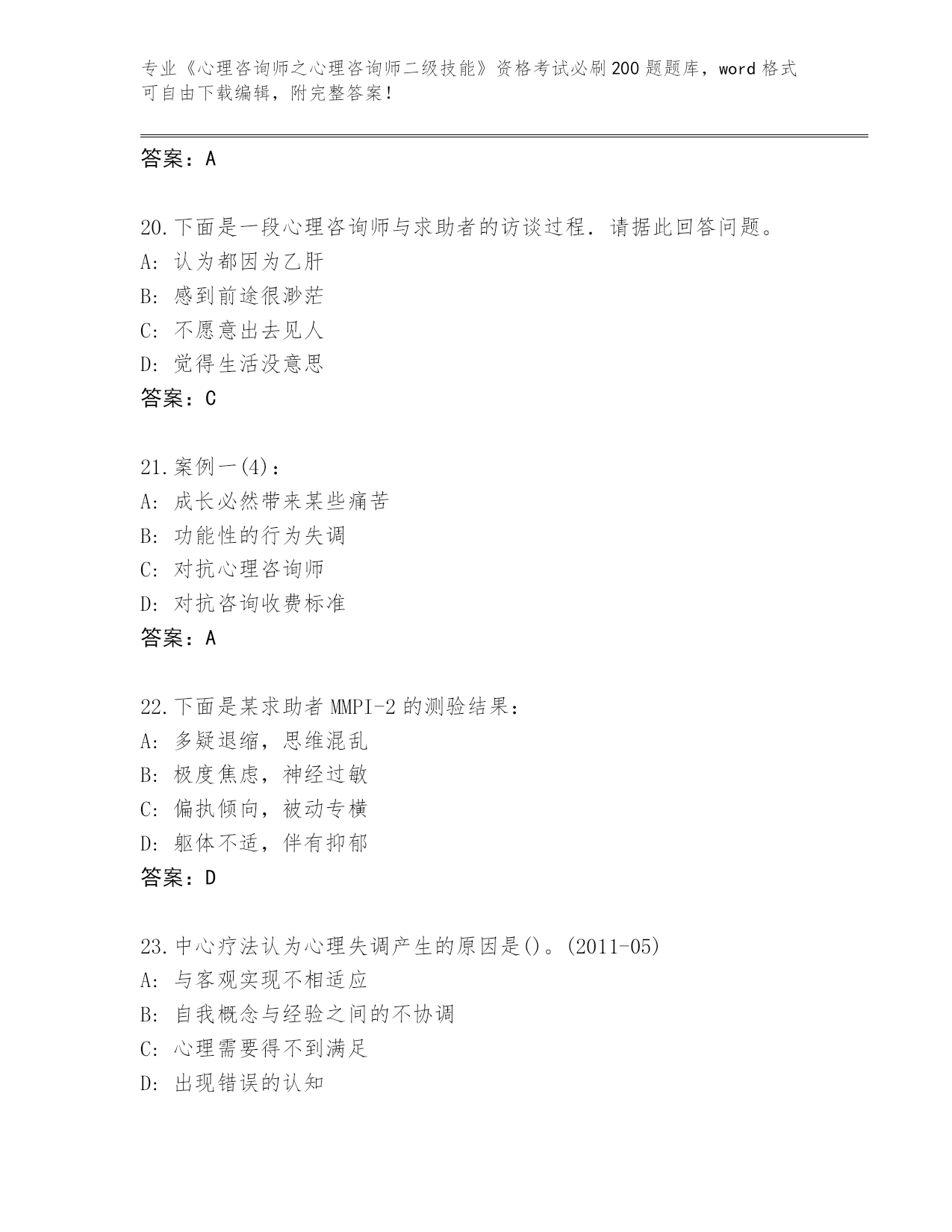 历年山西省应县《心理咨询师之心理咨询师二级技能》资格考试必刷200题真题【夺冠系列】