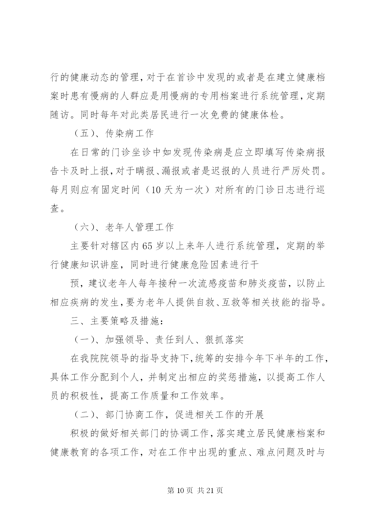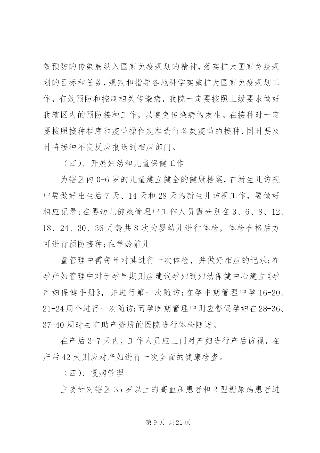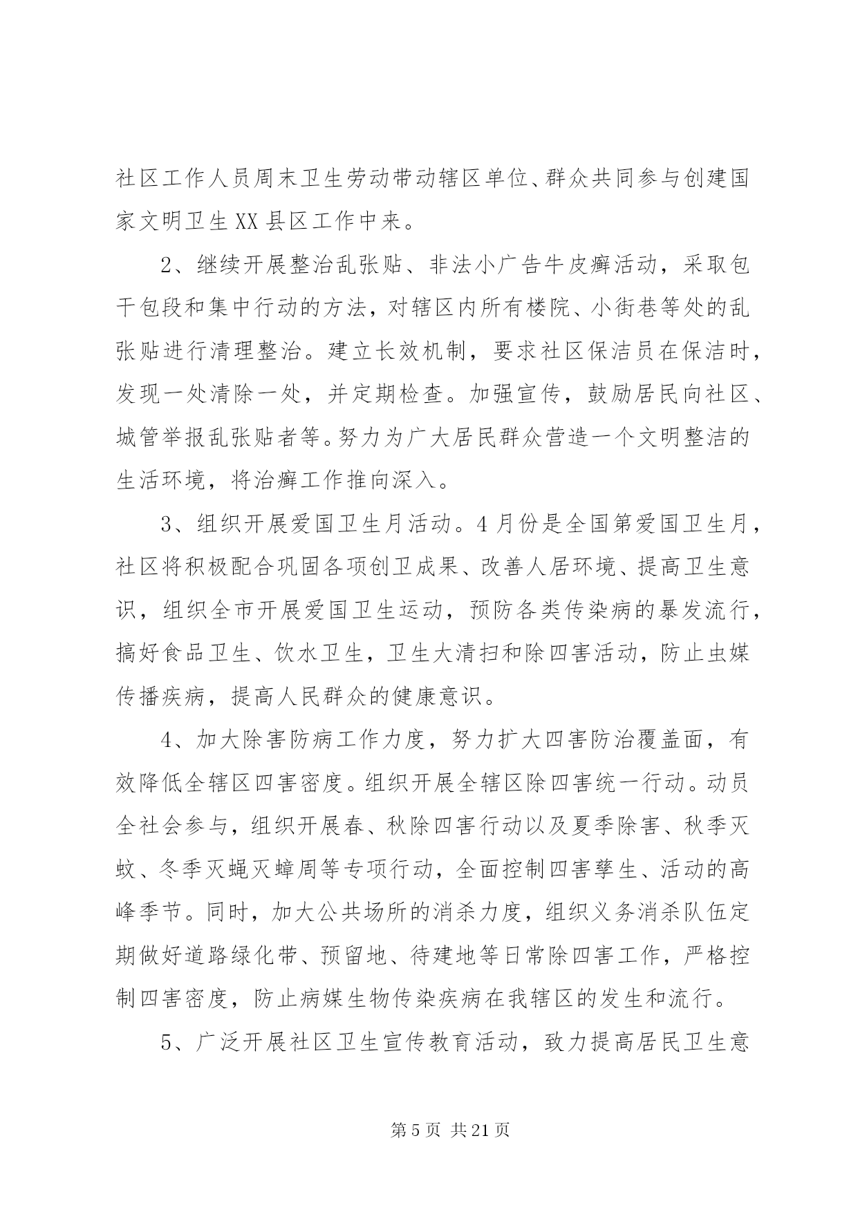第PAGE\*Arabic\*MERGEFORMAT21页共NUMPAGES\*MERGEFORMAT21页社区XX年公共卫生工作计划精选【卫生工作计划篇一】为了进一步加强社区公共卫生服务项目的管理,扎实推进社区公共卫生服务,有效保障农民健康水平,特制定times;times;年公共卫生工作计划:一、指导思想和目标要求全面贯彻党的十八大、times;times;全会精神,高举中国特色社会主义伟大旗帜,以建设社会主义新农村的要求,加强直接面向农民的公共卫生服务,充实服务内涵,提高服务质量,减轻农民负担,全面落实农村公共卫生责任,保证农民享有基本卫生服务,保证农村重点人群享有重点服务,保证农民享有基本卫生安全保障。二、建立健全村级公共卫生工作领导小组和服务管理组织1、社区把公共卫生工作列入议事日程,社区公共卫生工作领导小组在本年度镇公共卫生工作明确后,根据实际需要,调整和充实人员,设立办公室,负责落实上级政府下达的目标任务,制定具体工作方案,并组织实施。2、社区公共卫生工作领导小组和卫生所人员要确保我社区共卫生工作顺利进行。三、落实社区公共卫生工作的目标和任务,保证农民享有基本卫生服务:包括健康教育、健康管理、基本医疗惠民服务、合作医疗便民服务、防疫、保健等。(一)、健康教育健康教育课每季度开课一次,内容要有季节性、针对性,每次参加人员必须达到50人或以上,宣传栏内容要实用,每季要有照片存档。(二)、健康管理1.家庭健康档案建档率要求90%,健康档案册中内容必须完整准确、无缺项。2.按时做好健康体检、儿童预防接种、儿童体检、孕产妇系统管理、常见妇女病检查、重点管理慢病、上门访视内容以及因病住院、门急诊等诊疗情况记入健康档案中,要求完整准确,建立动态、连续的家庭健康档案。3.每季度开展一次免费上门访视服务,访视率必须达到95%或以上,随访和干预情况及时记入健康档案中,重点疾病的访视内容要求详细,完整清楚,真实可信,并及时进行汇总准确上报。(三)、基本医疗惠民服务建立健全各项规章制度,严格按照医疗技术操作规范,合理收费,按规定执行医疗优惠政策。(四)、合作医疗便民服务1.卫生所医生必须熟悉合作医疗政策,并进行大力宣传,使各种人群对合作医疗政策的知晓率达85%。2.每季度公示本村参合人员报销情况,负责并保管好本村参合人员名册,登记项目要齐全、准确。(五)、妇幼保健1、认真做好妇幼保健工作。特别是孕产妇系统管理及6岁以下儿童系统管理。2、每月按时管理上报孕产妇及出生儿童,并及时纳入系统管理。3、每月进行4次下乡入户工作,根据情况按时进行孕产妇、儿童访视。4、做好妇幼保健宣传,每两月一期,全年6期。(六)、防疫工作1、做好各项卫生法律法规的学习宣传,做好疾病预防控制和突发事件的预防工作,提高全民防范意识。2、尽职尽责开展工作,按时完成儿童预防接种、结核病筛查、疫情调查上报、疫苗冷链管理、卫生所消毒管理、安全注射工作。每月29日做好预防接种,平时根据实际情况按时接种。3、开展适宜的疾病防治宣传,特别是艾滋病防治知识宣传。防疫宣传每两月一期,全年共6期。(七)、慢性病管理1、做好高血压、糖尿病、肿瘤、心脑血管病、精神病等慢性病病人建档和管理。做好老年人体检登记工作。2、做好每季度一次慢性病随访工作,做好慢性病防治知识宣传。每月一期,全年共12期。(八)、食品安全工作加强对农村食品、饮用水卫生的监督和指导与管理。提高农村公共卫生信息报告及时率,减少损失。(九)及时上报各种报表、数据。(十)、按时完成上级安排的临时工作。【卫生工作计划篇二】在即将过去的times;times;年里我社区卫生工作,以营造整洁优美的市容环境为目标,发动组织居民群众和社区多方力量,在社区内大力开展爱国卫生运动,全面整治环境,消除四害,清理乱张贴,加强环保工作,创建绿色社区,开展全方位、多形式的宣传活动,不断提高居民的健康意识和文明意识,工作取得了一定的成效,为了巩固所取得的成绩,落实环境卫生长效管理机制,社区制定了times;times;年社区卫生各项工作计划如下:一、全面加强社区卫生长效管理,促进环境卫生整体水平不断提高1、加强对社区居民小区环境卫生的监督检查,组织发动广大群众做好巩固和发展创建成果的工作。持之以恒的开展周末卫生劳动活动,集中清理乱堆放和清除卫生死角,通过街道干部、社区工作人员周末卫生劳动带动辖区单位、群众共同参与创建国家文明卫生XX县区工作中来。2、继续开展整治乱张贴、非法小广告牛皮癣活动,采取包干包段和集中行动的方法,对辖区内所有楼院、小街巷等处的乱张贴进行清理整治。建立长效机制,要求社区保洁员在保洁时,发现一处清除一处,并定期检查。加强宣传,鼓励居民向社区、城管举报乱张贴者等。努力为广大居民群众营造一个文明整洁的生活环境,