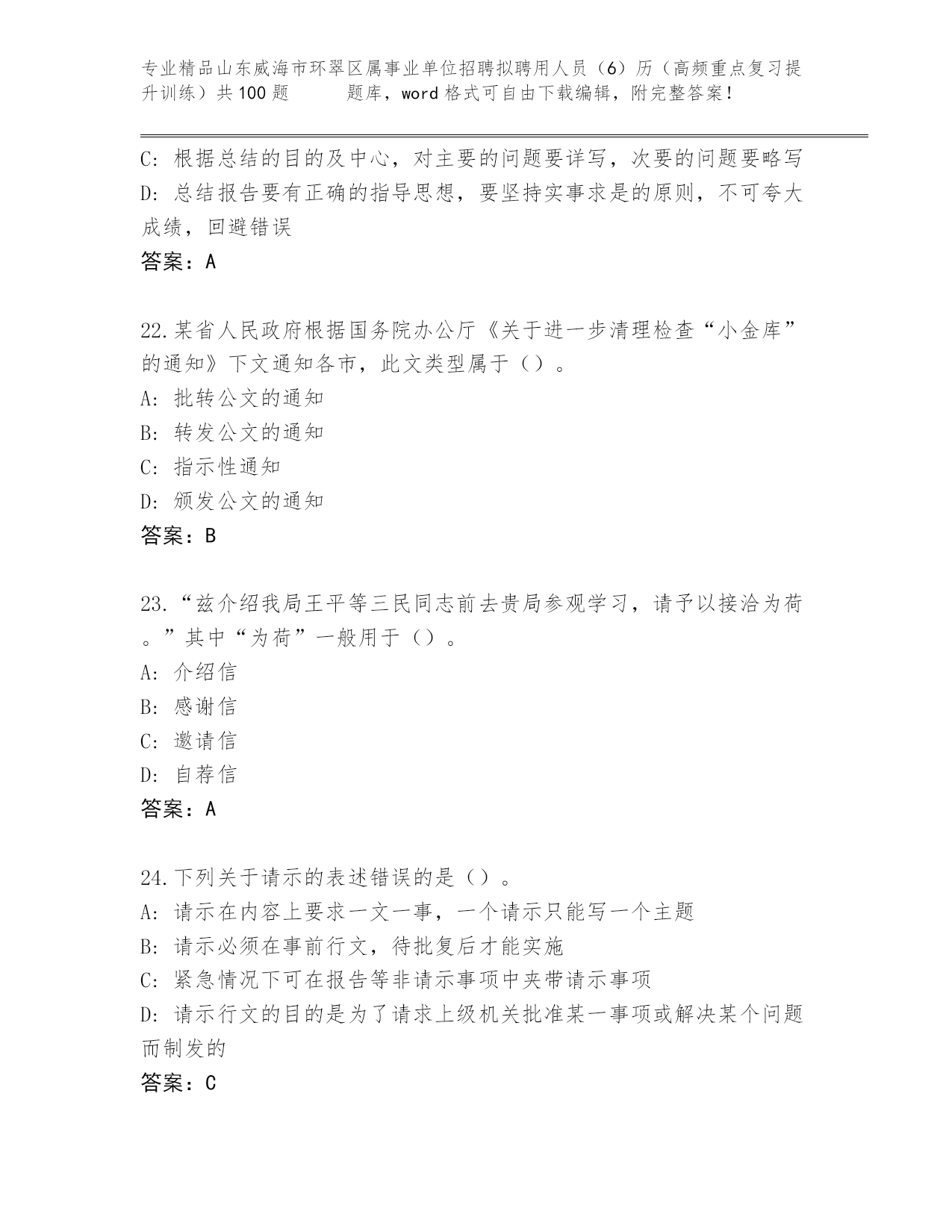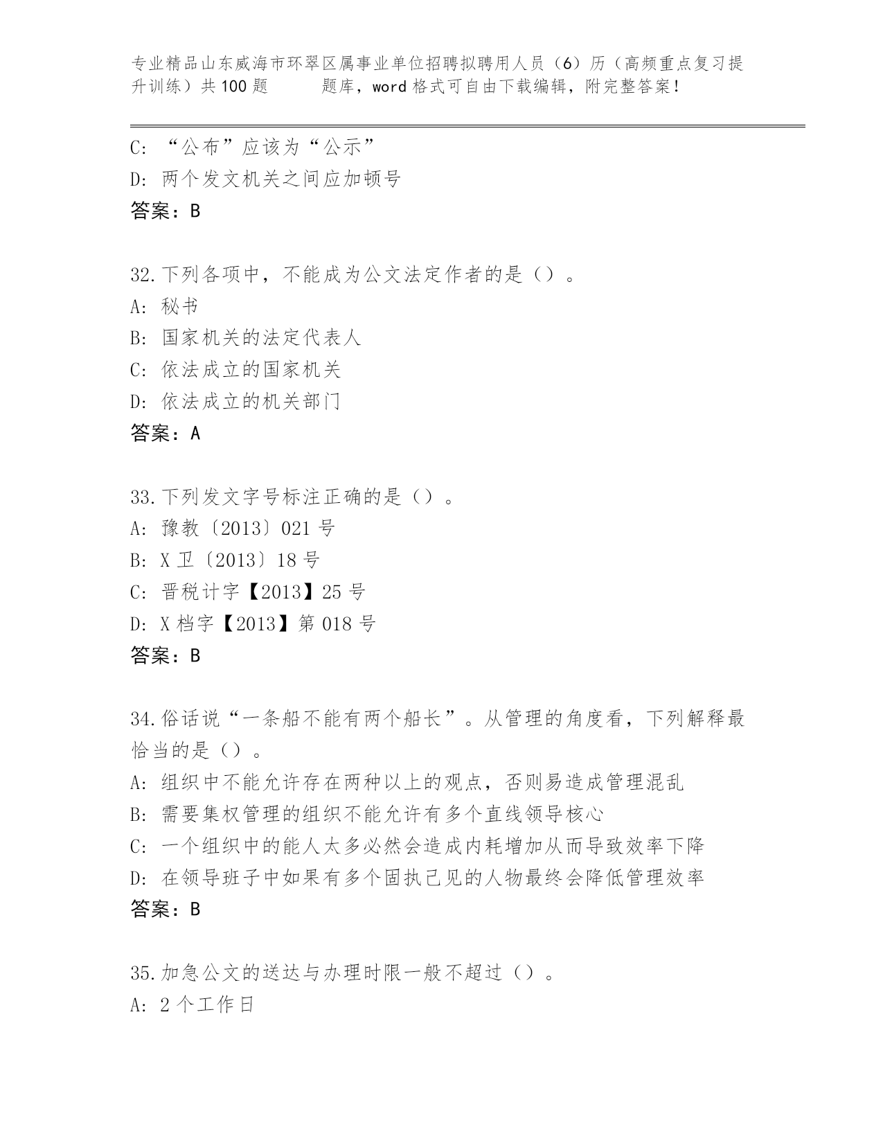 精品山东威海市环翠区属事业单位招聘拟聘用人员(6)历(高频重点复习提升训练)共100题 大全及答案参考