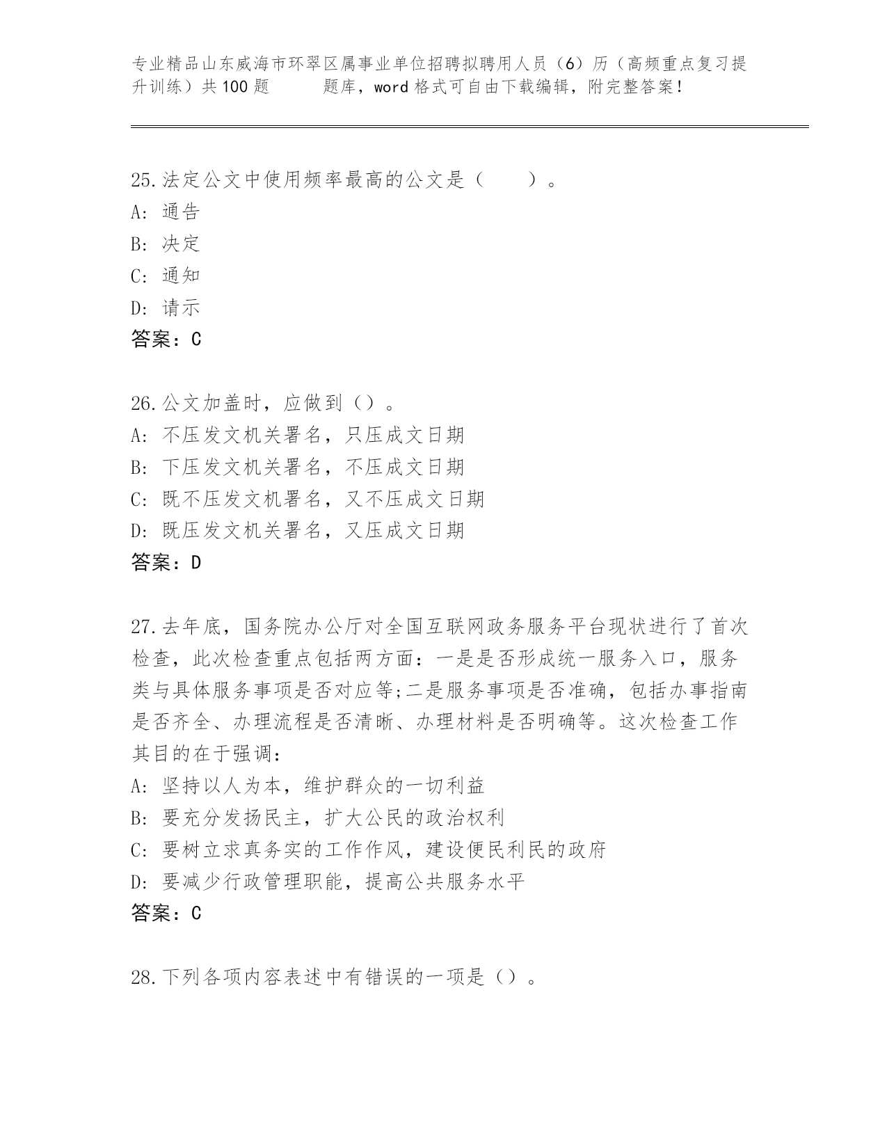 精心整理山东威海市环翠区属事业单位招聘拟聘用人员(6)历(高频重点复习提升训练)共100题 精品(模拟题)