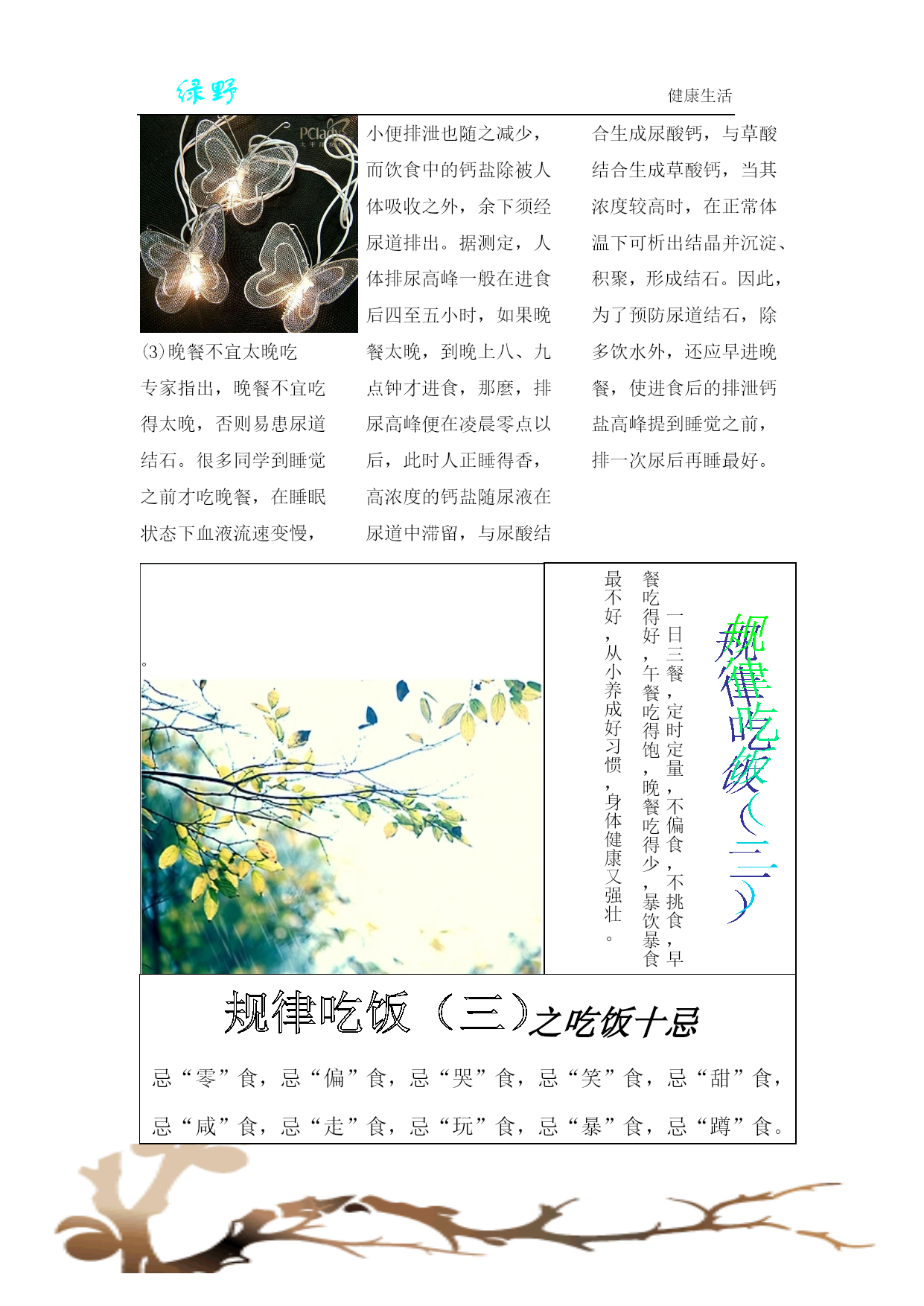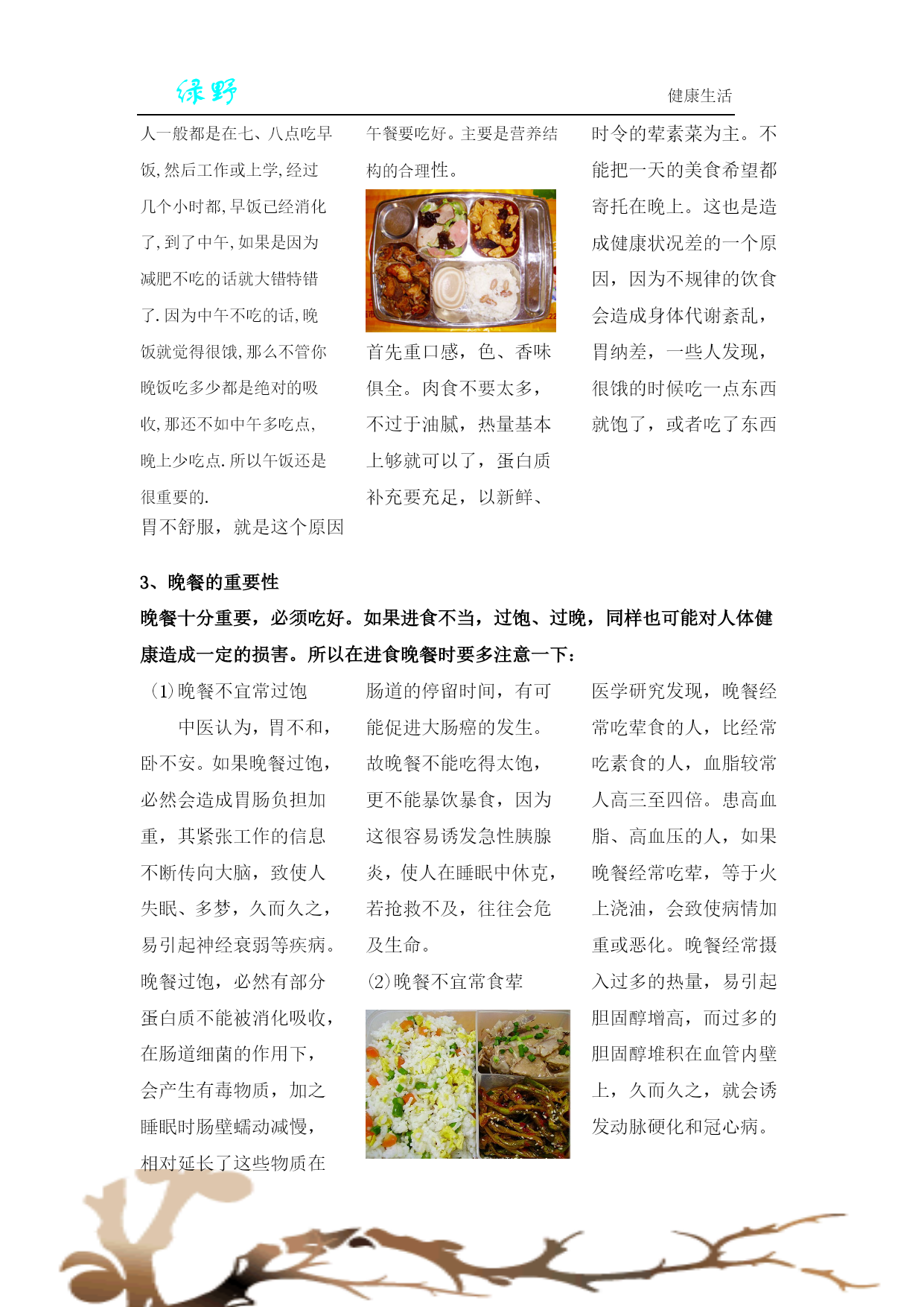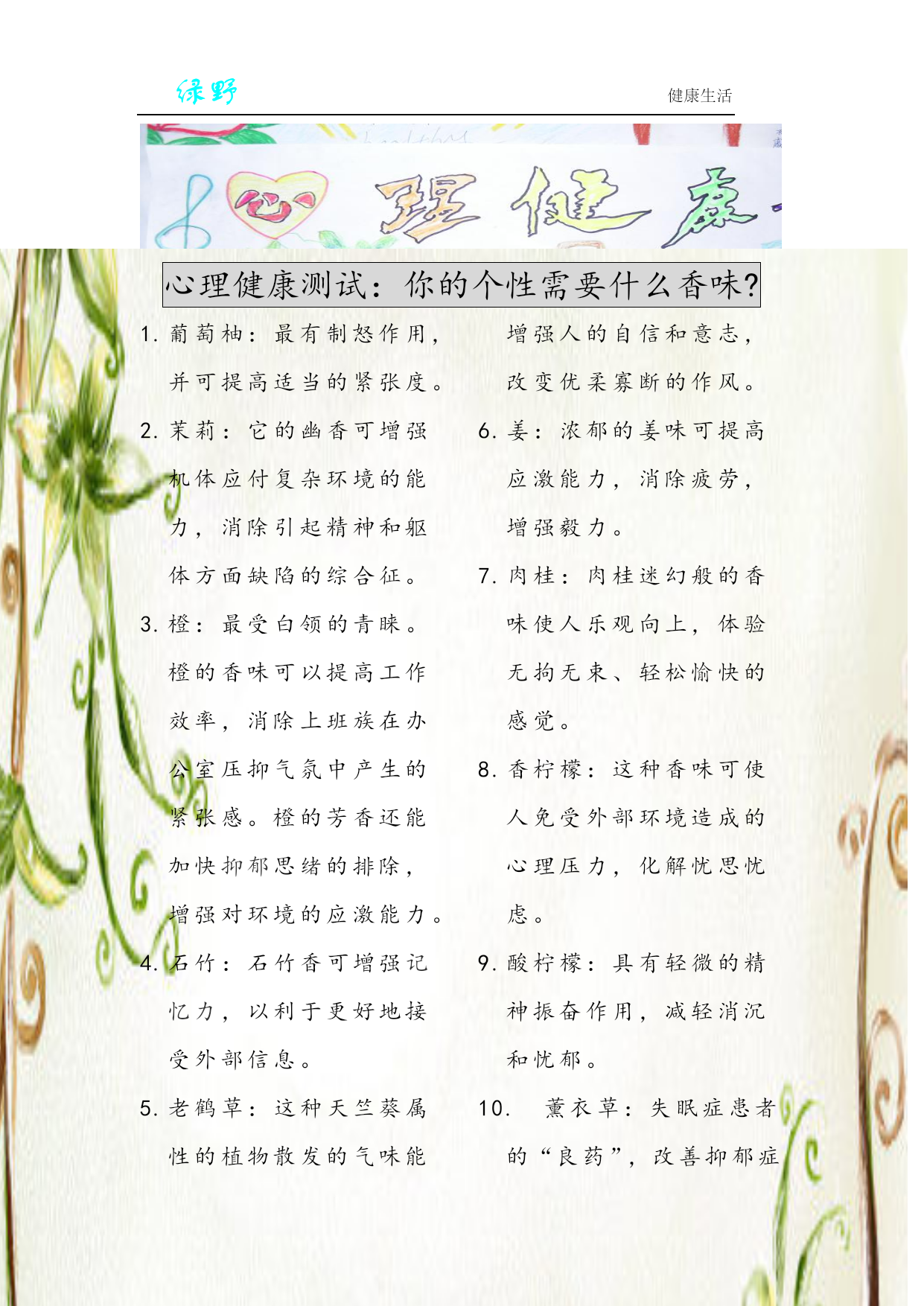 绿野健康生活总会发现很多同学不按时吃饭,或者是吃一些没有营养的零食、方便面、饼干等东西,导致很多同学体弱多病,身体素质不是很好,通过《绿野》了解规范吃饭的重要性,愿同学们规律吃饭,重视吃饭,从而安全、健康的成长。早餐的重要性早餐是一天中最重要的一餐,因为它是全天能量和营养素的重要来源,对人们的健康和营养状况有着重要影响。只有早餐摄取了足够的能量人才能在一整天保持一个较好的状态,尤其是碳水化合物的摄取,他能最快的转化为能量被人体利用,尤其是学生,快速转化成为ATP后能被大脑利用。所以对于学生来说吃早餐非常的重要,下面从两个方面来讲一下不吃早餐的坏处以及吃早餐的好处:(1)不吃早餐的坏处①影响学习和工作能力②易患消化道疾病③抵抗力下将④加速衰老⑤容易发胖⑥易引起便秘⑦加大患慢性病的几率⑧导致儿童营养发育不良(2)吃营养早餐的十大好处:①补充人体所必需的7大营养素。②可修复和再造组织,有利于病人,产妇与手术的康复。③抗疲劳,提高免疫力,有利于预防疾病的产生。④改善消化道功能,有利于人体吸收与利用各种营养。⑤对于现代文明病有预防与补助治疗作用。⑥适用于不同体质的人群。⑦增加大便的蠕动力,预防与改善便秘。⑧有利于老年人的健康与保健,延年益寿。⑨有利于儿童的生长发育,健康成长。2、午餐的重要性人一般都是在七、八点吃早饭,然后工作或上学,经过几个小时都,早饭已经消化了,到了中午,如果是因为减肥不吃的话就大错特错了.因为中午不吃的话,晚饭就觉得很饿,那么不管你晚饭吃多少都是绝对的吸收,那还不如中午多吃点,晚上少吃点.所以午饭还是很重要的.午餐要吃好。主要是营养结构的合理性。首先重口感,色、香味俱全。肉食不要太多,不过于油腻,热量基本上够就可以了,蛋白质补充要充足,以新鲜、时令的荤素菜为主。不能把一天的美食希望都寄托在晚上。这也是造成健康状况差的一个原因,因为不规律的饮食会造成身体代谢紊乱,胃纳差,一些人发现,很饿的时候吃一点东西就饱了,或者吃了东西胃不舒服,就是这个原因3、晚餐的重要性晚餐十分重要,必须吃好。如果进食不当,过饱、过晚,同样也可能对人体健康造成一定的损害。所以在进食晚餐时要多注意一下:(1)晚餐不宜常过饱中医认为,胃不和,卧不安。如果晚餐过饱,必然会造成胃肠负担加重,其紧张工作的信息不断传向大脑,致使人失眠、多梦,久而久之,易引起神经衰弱等疾病。晚餐过饱,必然有部分蛋白质不能被消化吸收,在肠道细菌的作用下,会产生有毒物质,加之睡眠时肠壁蠕动减慢,相对延长了这些物质在肠道的停留时间,有可能促进大肠癌的发生。故晚餐不能吃得太饱,更不能暴饮暴食,因为这很容易诱发急性胰腺炎,使人在睡眠中休克,若抢救不及,往往会危及生命。(2)晚餐不宜常食荤医学研究发现,晚餐经常吃荤食的人,比经常吃素食的人,血脂较常人高三至四倍。患高血脂、高血压的人,如果晚餐经常吃荤,等于火上浇油,会致使病情加重或恶化。晚餐经常摄入过多的热量,易引起胆固醇增高,而过多的胆固醇堆积在血管内壁上,久而久之,就会诱发动脉硬化和冠心病。(3)晚餐不宜太晚吃专家指出,晚餐不宜吃得太晚,否则易患尿道结石。很多同学到睡觉之前才吃晚餐,在睡眠状态下血液流速变慢,小便排泄也随之减少,而饮食中的钙盐除被人体吸收之外,余下须经尿道排出。据测定,人体排尿高峰一般在进食后四至五小时,如果晚餐太晚,到晚上八、九点钟才进食,那麼,排尿高峰便在凌晨零点以后,此时人正睡得香,高浓度的钙盐随尿液在尿道中滞留,与尿酸结合生成尿酸钙,与草酸结合生成草酸钙,当其浓度较高时,在正常体温下可析出结晶并沉淀、积聚,形成结石。因此,为了预防尿道结石,除多饮水外,还应早进晚餐,使进食后的排泄钙盐高峰提到睡觉之前,排一次尿后再睡最好。一日三餐,定时定量,不偏食,不挑食,早餐吃得好,午餐吃得饱,晚餐吃得少,暴饮暴食最不好,从小养成好习惯,身体健康又强壮。。之吃饭十忌忌“零”食,忌“偏”食,忌“哭”食,忌“笑”食,忌“甜”食,忌“咸”食,忌“走”食,忌“玩”食,忌“暴”食,忌“蹲”食。心理健康测试:你的个性需要什么香味?葡萄柚:最有制怒作用,并可提高适当的紧张度。茉莉:它的幽香可增强机体应付复杂环境的能力,消除引起精神和躯体方面缺陷的综合征。橙:最受白领的青睐。橙的香味可以提高工作效率,消除上班族在办公室压抑气氛中产生的紧张感。橙的芳香还能加快HYPERLINK"http://search.39.net/result.aspx?words=抑郁&stype=0"抑郁思绪的排除,增强对环境的应激能力。石竹:石竹香可增强HYPERLINK"http://search.39.n