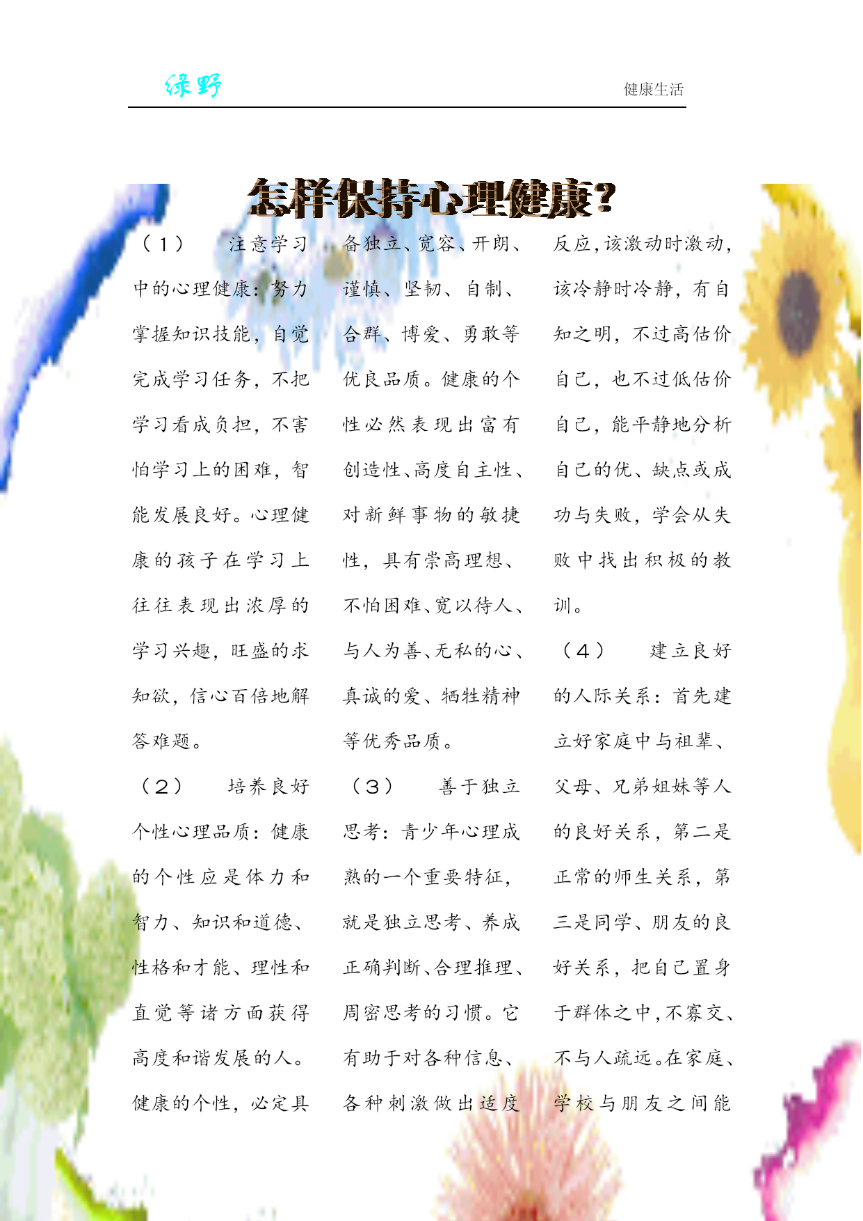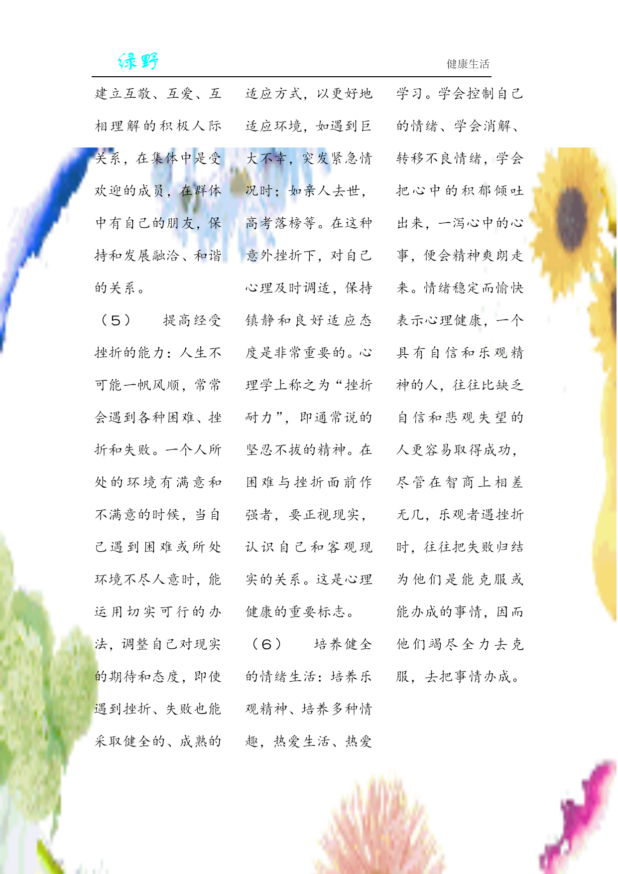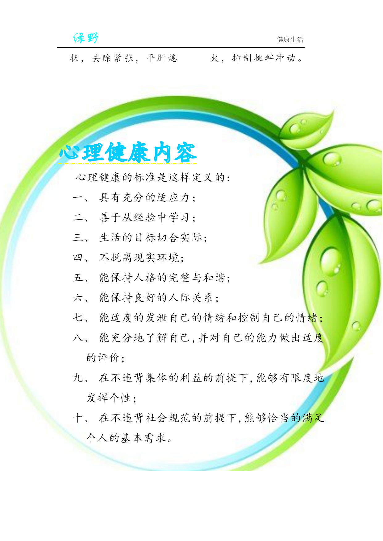 绿野健康生活总会发现很多同学不按时吃饭,或者是吃一些没有营养的零食、方便面、饼干等东西,导致很多同学体弱多病,身体素质不是很好,通过《绿野》了解规范吃饭的重要性,愿同学们规律吃饭,重视吃饭,从而安全、健康的成长。早餐的重要性早餐是一天中最重要的一餐,因为它是全天能量和营养素的重要来源,对人们的健康和营养状况有着重要影响。只有早餐摄取了足够的能量人才能在一整天保持一个较好的状态,尤其是碳水化合物的摄取,他能最快的转化为能量被人体利用,尤其是学生,快速转化成为ATP后能被大脑利用。所以对于学生来说吃早餐非常的重要,下面从两个方面来讲一下不吃早餐的坏处以及吃早餐的好处:(1)不吃早餐的坏处①影响学习和工作能力②易患消化道疾病③抵抗力下将④加速衰老⑤容易发胖⑥易引起便秘⑦加大患慢性病的几率⑧导致儿童营养发育不良(2)吃营养早餐的十大好处:①补充人体所必需的7大营养素。②可修复和再造组织,有利于病人,产妇与手术的康复。③抗疲劳,提高免疫力,有利于预防疾病的产生。④改善消化道功能,有利于人体吸收与利用各种营养。⑤对于现代文明病有预防与补助治疗作用。⑥适用于不同体质的人群。⑦增加大便的蠕动力,预防与改善便秘。⑧有利于老年人的健康与保健,延年益寿。⑨有利于儿童的生长发育,健康成长。2、午餐的重要性人一般都是在七、八点吃早饭,然后工作或上学,经过几个小时都,早饭已经消化了,到了中午,如果是因为减肥不吃的话就大错特错了.因为中午不吃的话,晚饭就觉得很饿,那么不管你晚饭吃多少都是绝对的吸收,那还不如中午多吃点,晚上少吃点.所以午饭还是很重要的.午餐要吃好。主要是营养结构的合理性。首先重口感,色、香味俱全。肉食不要太多,不过于油腻,热量基本上够就可以了,蛋白质补充要充足,以新鲜、时令的荤素菜为主。不能把一天的美食希望都寄托在晚上。这也是造成健康状况差的一个原因,因为不规律的饮食会造成身体代谢紊乱,胃纳差,一些人发现,很饿的时候吃一点东西就饱了,或者吃了东西胃不舒服,就是这个原因3、晚餐的重要性晚餐十分重要,必须吃好。如果进食不当,过饱、过晚,同样也可能对人体健康造成一定的损害。所以在进食晚餐时要多注意一下:(1)晚餐不宜常过饱中医认为,胃不和,卧不安。如果晚餐过饱,必然会造成胃肠负担加重,其紧张工作的信息不断传向大脑,致使人失眠、多梦,久而久之,易引起神经衰弱等疾病。晚餐过饱,必然有部分蛋白质不能被消化吸收,在肠道细菌的作用下,会产生有毒物质,加之睡眠时肠壁蠕动减慢,相对延长了这些物质在肠道的停留时间,有可能促进大肠癌的发生。故晚餐不能吃得太饱,更不能暴饮暴食,因为这很容易诱发急性胰腺炎,使人在睡眠中休克,若抢救不及,往往会危及生命。(2)晚餐不宜常食荤医学研究发现,晚餐经常吃荤食的人,比经常吃素食的人,血脂较常人高三至四倍。患高血脂、高血压的人,如果晚餐经常吃荤,等于火上浇油,会致使病情加重或恶化。晚餐经常摄入过多的热量,易引起胆固醇增高,而过多的胆固醇堆积在血管内壁上,久而久之,就会诱发动脉硬化和冠心病。(3)晚餐不宜太晚吃专家指出,晚餐不宜吃得太晚,否则易患尿道结石。很多同学到睡觉之前才吃晚餐,在睡眠状态下血液流速变慢,小便排泄也随之减少,而饮食中的钙盐除被人体吸收之外,余下须经尿道排出。据测定,人体排尿高峰一般在进食后四至五小时,如果晚餐太晚,到晚上八、九点钟才进食,那麼,排尿高峰便在凌晨零点以后,此时人正睡得香,高浓度的钙盐随尿液在尿道中滞留,与尿酸结合生成尿酸钙,与草酸结合生成草酸钙,当其浓度较高时,在正常体温下可析出结晶并沉淀、积聚,形成结石。因此,为了预防尿道结石,除多饮水外,还应早进晚餐,使进食后的排泄钙盐高峰提到睡觉之前,排一次尿后再睡最好。一日三餐,定时定量,不偏食,不挑食,早餐吃得好,午餐吃得饱,晚餐吃得少,暴饮暴食最不好,从小养成好习惯,身体健康又强壮。。之吃饭十忌忌“零”食,忌“偏”食,忌“哭”食,忌“笑”食,忌“甜”食,忌“咸”食,忌“走”食,忌“玩”食,忌“暴”食,忌“蹲”食。心理健康测试:你的个性需要什么香味?葡萄柚:最有制怒作用,并可提高适当的紧张度。茉莉:它的幽香可增强机体应付复杂环境的能力,消除引起精神和躯体方面缺陷的综合征。橙:最受白领的青睐。橙的香味可以提高工作效率,消除上班族在办公室压抑气氛中产生的紧张感。橙的芳香还能加快HYPERLINK"http://search.39.net/result.aspx?words=抑郁&stype=0"抑郁思绪的排除,增强对环境的应激能力。石竹:石竹香可增强HYPERLINK"http://search.39.n