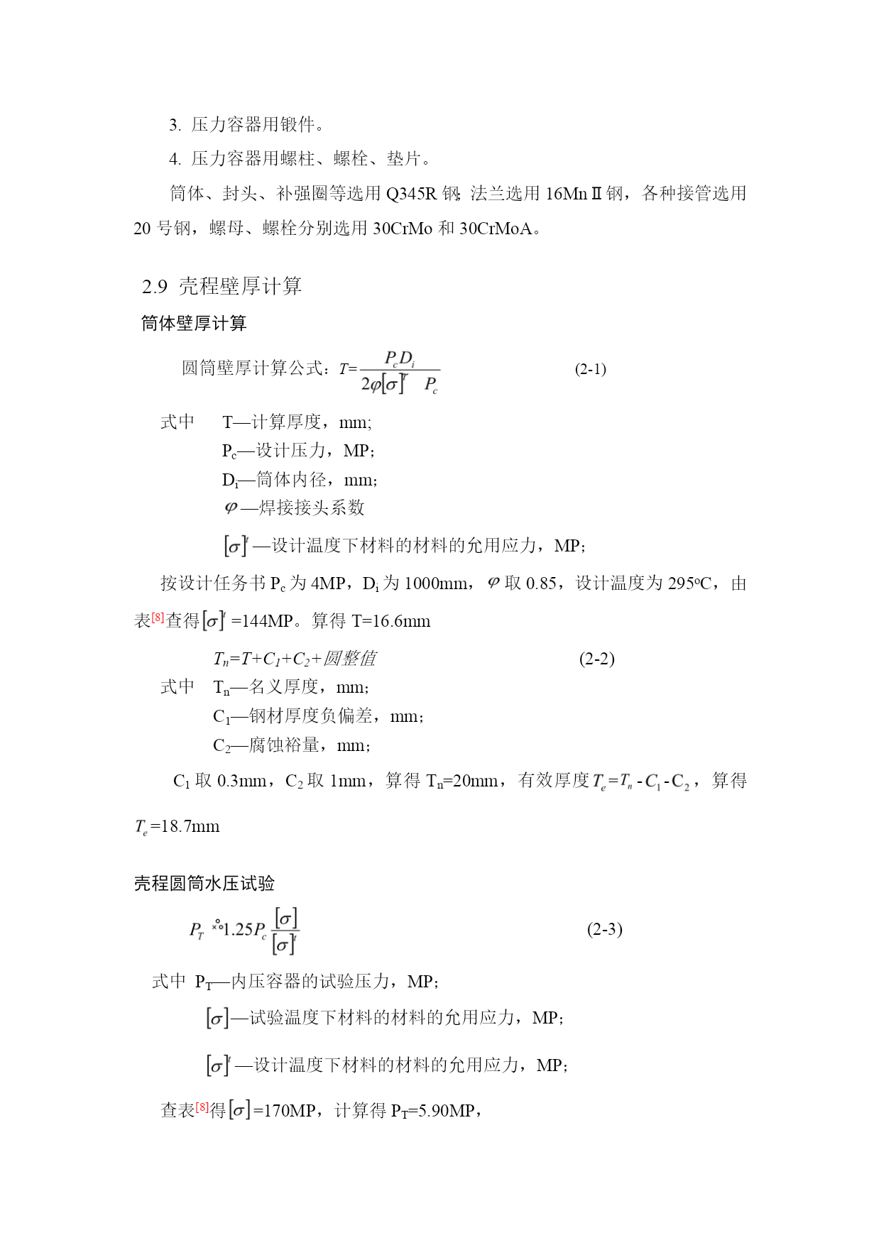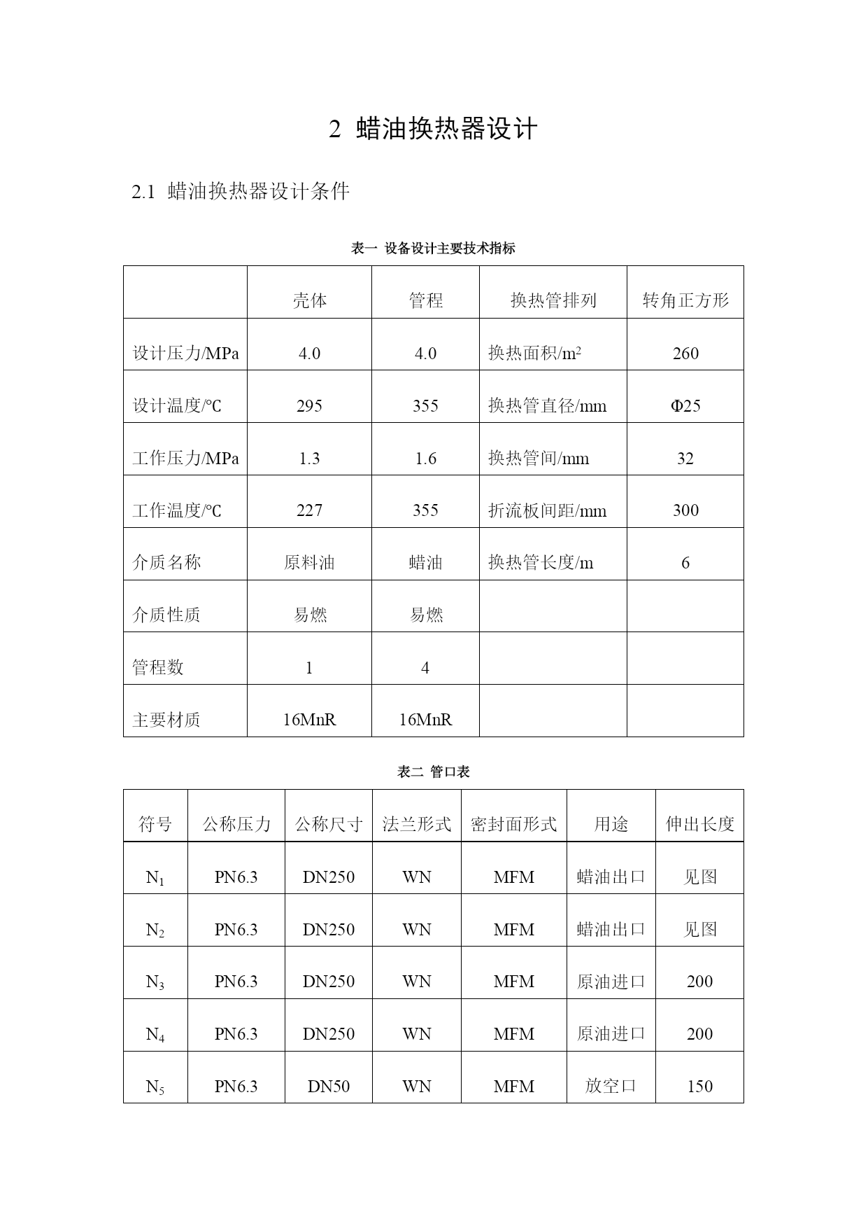 蜡油换热器设计_过程装备与控制工程毕业设计【完整版】(文档可以直接使用,也可根据实际需要修订后使用,可编辑放心下载)1前言1.1课题意义换热器是化工、石油、能源等各工业中应用相当广泛的单元设备之一。据统计,在现代化学工业中换热器的投资大约占设备总投资的30%,在炼油厂中占全部工艺设备的40%左右,海水淡化工艺装置那么几乎全部是由换热器组成的。对国外换热器市场的调查说明,虽然各种板式换热器的竞争力在上升,但管壳式换热器仍占主导地位约64%[1]。1.2管壳式换热器根本类型:固定管板式、浮头式、U形管式和填料函式。U形管式换热器图1-2U形管换热器U形管式换热器的典型结构如图。这种换热器的结构特点是,只有一块管板,管束由多根U形管组成,管的两端固定在同一块管板上,管子可以自由伸缩。当壳体与U形换热管有温差时,不会产生热应力。由于受弯管曲率半径的限制,其换热管排布较少,管束最内层管间距较大,管板的利用率较低,壳程流体易形成短路,对传热不利。当管子泄露损坏时,只有管束外围处的U形管才便于更换,内层换热管坏了不能更换,只能堵死,而坏一根U形管相当于坏两根管,报废率较高。U形管式换热器结构比拟简单、价格廉价,承压能力强,适用于管、壳壁温差较大或壳程介质易结垢需要清洗,又不适宜采用浮头式和固定管板式的场合。特别适用于管内走清洁而不易结垢的高温、高压、腐蚀性大的物料[2]。2蜡油换热器设计2.1蜡油换热器设计条件表一设备设计主要技术指标壳体管程换热管排列转角正方形设计压力/MPa4.04.0换热面积/m2260设计温度/℃295355换热管直径/mmΦ25工作压力/MPa1.31.6换热管间/mm32工作温度/℃227355折流板间距/mm300介质名称原料油蜡油换热管长度/m6介质性质易燃易燃管程数14主要材质16MnR16MnR表二管口表符号公称压力公称尺寸法兰形式密封面形式用途伸出长度N1PN6.3DN250WNMFM蜡油出口见图N2PN6.3DN250WNMFM蜡油出口见图N3PN6.3DN250WNMFM原油进口200N4PN6.3DN250WNMFM原油进口200N5PN6.3DN50WNMFM放空口150N6PN6.3DN65WNMFM排污口1502.2布管按要求换热管的直径为25mm,间距为32mm,管长为6m,换热面积为260m2,换热管排列方式为转角正方形。如图2-1、图2-2。图2-1换热管排列方式图2-2布管图换热管的数目为600根,计算得换热面积为282.6m2,符合要求。同时均匀的布置了8根拉杆。2.3管箱选择由设计任务书选择封头管箱,Ⅳ管程,如图2-3。图2-3封头管箱2.4设备法兰选择换热器设计压力4MP,温度壳程295oC、管程355oC,法兰选择长颈对焊法兰[2]。图2-4设备法兰由筒体公称直径1000mm和PN=4.0MP,选得法兰的参数:D=1215mm,D1=1155mm,D2=1110mm,D3=1100mm,D4=1097mm,δ=100mm,H=175mm,h=42mm,a=26mm,a1=23mm,δ1=24mm,δ2=36mm,R=15mm,d=33mm。螺柱:规格M36数量40法兰垫片:选择非金属软垫片[4]图2-5法兰垫片由DN1000和公称压力4MP,得到垫片参数:D=1099mm,d=1039mm2.5接管及接管法兰选择按任务书要求,选择长颈对焊法兰,如图;图2-6接管法兰N1~N4管:由DN250,法兰形式WN,密封面形式MFM;选择φ273×9的钢管。法兰为带颈对焊法兰,凹凸面密封。法兰外径D:470mm,螺栓孔中心圆直径K:400mm,螺栓孔直径L:36mm,螺栓孔数量n:12,螺纹Th:M33×2,法兰厚度C:46mm,法兰颈A:316mm,B:316mm,S:13.5mm,H1:18mm,R:10mm,法兰高度H:125mm,法兰理论重量:48.9Kg.N5:由DN50,法兰形式WN,密封面形式MFM;选择φ57×3.5的钢管。法兰为带颈对焊法兰,凹凸面密封。法兰外径D:180mm,螺栓孔中心圆直径K:135mm,螺栓孔直径L:22mm,螺栓孔数量n:4,螺纹Th:M20,法兰厚度C:26mm,法兰颈A:82mm,B:82mm,S:5mm,H1:10mm,R:5mm,法兰高度H:62mm,法兰理论重量:4.86KgN6:由DN65,密封面形式MFM;选择φ76×4的钢管。法兰为带颈对焊法兰,凹凸面密封。法兰外径D:205mm,螺栓孔中心圆直径K:160mm,螺栓孔直径L:22mm,螺栓孔数量n:8,螺纹Th:M20,法兰厚度C:26mm,法兰颈A:98mm,B:98mm,S:6mm,H1:1