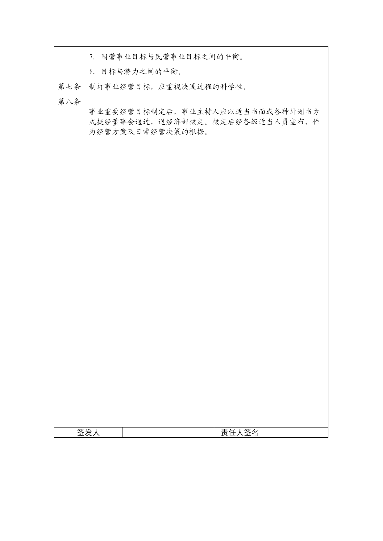 制度名经营目标制定原则电子文件编码GLZD023页码2-1第一条经营目标指在一定时间内,期望各种经营活动所要达到的境界或结果,为总体经营活动的中心工作。第二条经营目标须注意下列作用:1.指导资源分配方向。2.激励员工。3.衡量经营活动成效。4.创造良好声誉及境界。第三条事业主持人对制订事业“目标体系”负全部责任。第四条事业主持人在制订目标体系时,应通知各有关单位主管参与,倾听各单位的意见,并应责成企划单位,提高技术协助及汇总各单位目标。第五条事业目标包括整体及个体目标;个体目标应与整体目标协调。1.整体目标应具有广泛性及启发性内涵,其类别分为:(1)社会经济目标。(2)各业务范围目标。2.个体目标应具有具体性及精确性内涵,其类别分为:(1)企业各功能目标。(2)企业各单位目标。(3)各时期目标。(4)专项工作目标。第六条事业各经营目标,须注意下列各项原则,保持相对平衡。1.社会需求与经营机会之间的平衡。2.社会经济责任与企业生存发展之间的平衡。3.各单位部门目标之间的平衡。4.事业目标与个人目标之间的平衡。5.长期目标与短期目标之间的平衡。6.有形成效与无形成效目标之间的平衡。签发人责任人签名制度名经营目标制定原则电子文件编码GLZD023页码2-27.国营事业目标与民营事业目标之间的平衡。8.目标与潜力之间的平衡。第七条制订事业经营目标,应重视决策过程的科学性。第八条事业重要经营目标制定后,事业主持人应以适当书面或各种计划书方式提经董事会通过,送经济部核定。核定后经各级适当人员宣布,作为经营方案及日常经营决策的根据。签发人责任人签名