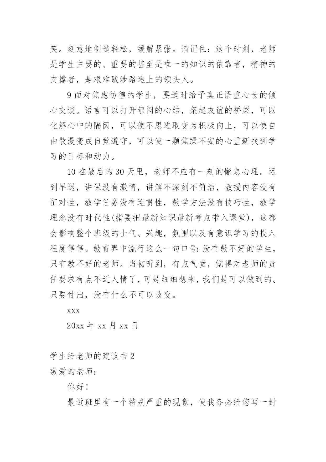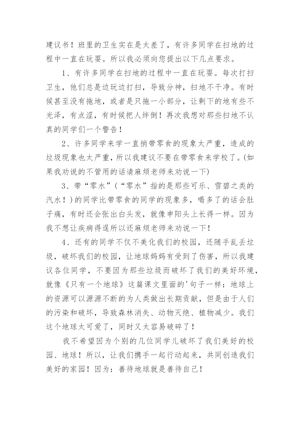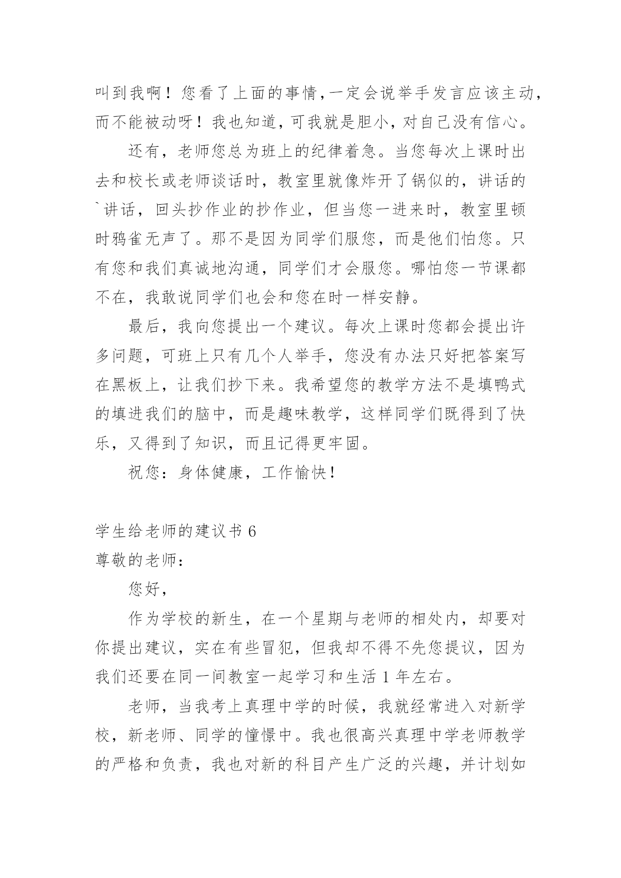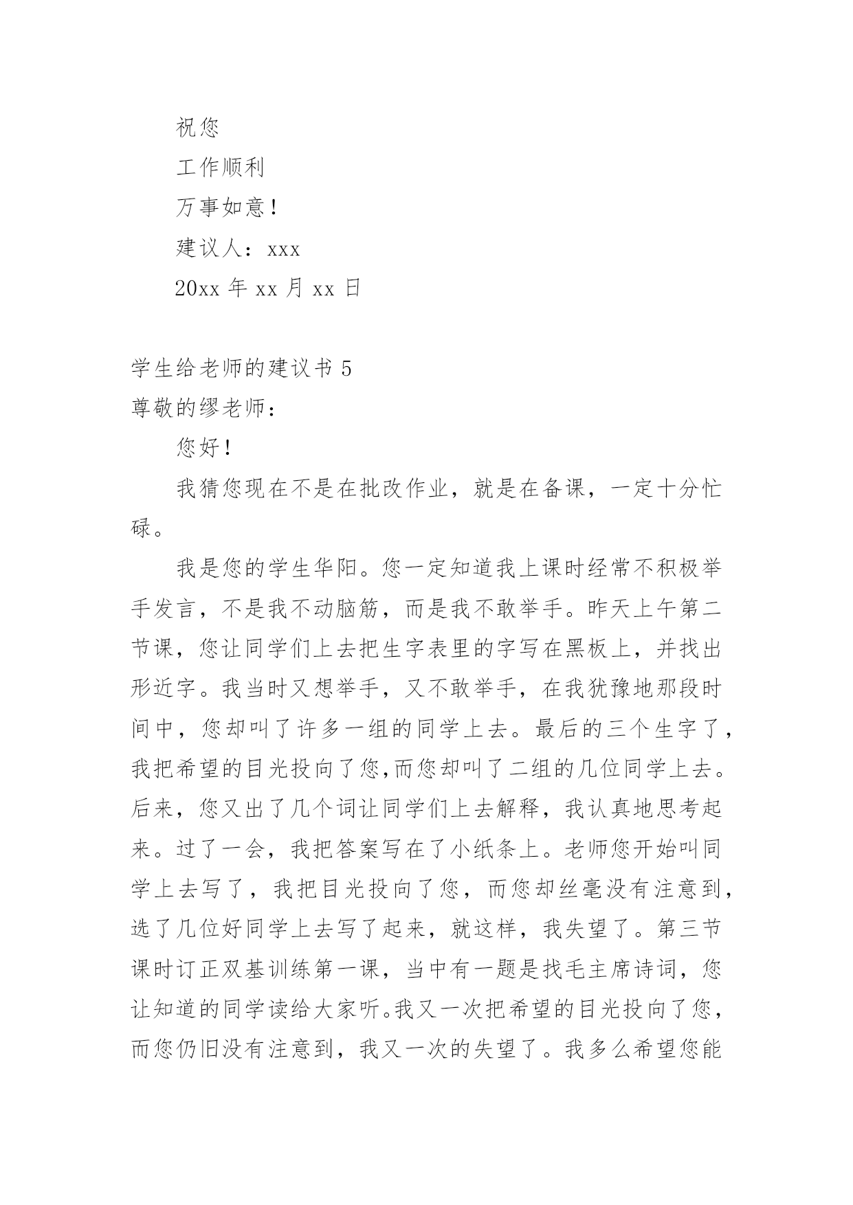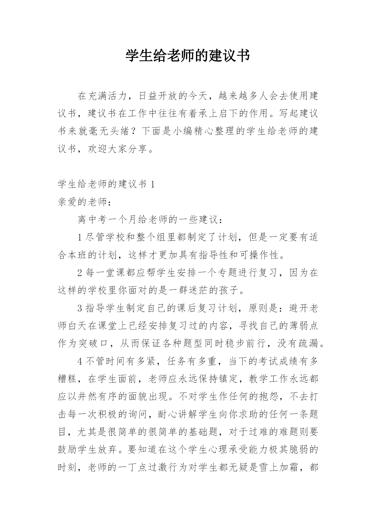 学生给老师的建议书在充满活力,日益开放的今天,越来越多人会去使用建议书,建议书在工作中往往有着承上启下的作用。写起建议书来就毫无头绪?下面是小编精心整理的学生给老师的建议书,欢迎大家分享。学生给老师的建议书1亲爱的老师:离中考一个月给老师的一些建议:1尽管学校和整个组里都制定了计划,但是一定要有适合本班的计划,这样才更加具有指导性和可操作性。2每一堂课都应帮学生安排一个专题进行复习,因为在这样的学校里你面对的是一群迷茫的孩子。3指导学生制定自己的课后复习计划,原则是:避开老师白天在课堂上已经安排复习过的内容,寻找自己的薄弱点作为突破口,从而保证各种题型同时稳步前行,没有疏漏。4不管时间有多紧,任务有多重,当下的考试成绩有多糟糕,在学生面前,老师应永远保持镇定,教学工作永远都应以井然有序的面貌出现。不对学生作任何的抱怨,不去打击每一次积极的询问,耐心讲解学生向你求助的任何一条题目,尤其是很简单的很简单的基础题,对于过难的难题则要鼓励学生放弃。要知道在这个学生心理承受能力极其脆弱的时刻,老师的一丁点过激行为对学生都无疑是雪上加霜,都会把他们推向崩溃的边缘。在这个时刻,重要的是维持学生的自信心。5不断帮学生修正复习方法和技巧。例如,背诵时一定要做记号,挑出难点以供二轮或三轮时再次背诵;书面表达中太难太深的表达建议学生适当去除或简化或替换;单项选择的.复习,则建议学生先背默知识点,然后直接做题,最后再把错题中的知识点提炼出来进行背默,如此这般,多次重复;完行和阅读则鼓励学生天天做,每天两篇阅读和一篇完形;任务型阅读适当训练,多加注意词形的变化,还有就是要收集此种题型中的热门词进行背诵;对于书面表达,更多的则是就着训练材料想想该写哪些内容,因为此时学生头脑中词汇是不欠缺的,缺的可能只是写作角度或内容。好的复习方法和技巧能够使学生在最短的时间里复习到最多的内容。6最后一个月的练习严格执行限时训练。毫不留情地抛下不守时的学生,养成时间一到就公布答案的习惯,强迫他们养成限时训练的意识,这样,在时间上,高考试卷的完成才能做到游刃有余。7作为老师,每天都得根据学生练习的反馈结果总结学生易错的,回忆自己教学中没有涉及的,以免造成知识点上大的疏漏。坚决杜绝因为自己的讲解不到位而使全班在某个考点上全军覆没、均分下降一两分或两三分的严重后果,这就属于是教学中的重大失误,是不可饶恕的。8学会对学生更多地微笑,学会不失时机地跟学生开玩笑。刻意地制造轻松,缓解紧张。请记住:这个时刻,老师是学生主要的、重要的甚至是唯一的知识的依靠者,精神的支撑者,是艰难跋涉路途上的领头人。9面对焦虑彷徨的学生,要适时给予真正语重心长的倾心交谈。语言可以打开郁闷的心结,架起友谊的桥梁,可以化解心中的隔阂,可以使不思进取变为积极向上,可以使自由散漫变成自觉遵守,可以使一颗焦躁不安的心重新找到学习的目标和动力。10在最后的30天里,老师不应有一刻的懈怠心理。迟到早退,讲课没有激情,讲解不深刻不简洁,教授内容没有征对性,教学任务没有连贯性,教学方法没有技巧性,教学理念没有时代性(指要把最新知识最新考点带入课堂),这都会影响整个班级的士气、兴趣,氛围以及有意识学习的投入程度等等。教育界中流行这么一句口号:没有教不好的学生,只有教不好的老师。当初听到,有点气愤,觉得对老师的责任要求有点不近人情了,可是细细想来,我们是可以做到的。只要付出,没有什么不可以改变。xxx20xx年xx月xx日学生给老师的建议书2敬爱的老师:你好!最近班里有一个特别严重的现象,使我务必给您写一封建议书!班里的卫生实在是太差了,有许多同学在扫地的过程中一直在玩耍。所以我必须向您提出以下几点要求。1、有许多同学在扫地的过程中一直在玩耍。每次打扫卫生,他们总是边玩边打扫,导致分神,扫地不干净。有时候甚至没有拖地,或者是只拖一小部分,让剩下的地有些不光泽,有点涩,有时候把人绊倒!再次我想对那些扫地不认真的同学们一个警告!2、许多同学来学一直捎带零食的现象太严重,造成的垃圾现象也太严重,所以我建议不要在带零食来学校了。(如果我劝说的不管用的话请麻烦老师来劝说一下)3、带“零水”(“零水”指的是那些可乐、雪碧之类的汽水!)的同学比带零食的同学的现象多,喝多了的话会肚子痛,有时还会张出白头发,就像申阳头上长得一样。因为我不想让疾病得逞所以还麻烦老师来劝说一下!4、还有的同学不仅不美化我们的校园,还随手乱丢垃圾,破坏我们的校园,让地球妈妈有受到了伤害,所以我建议各位同学,不要因为那些垃圾而破坏了我们的美好环境,就像《只有一个地球》这篇课文里面的'句子一样:地球上的资源可以源源不断的为人类做出长期贡献,但是由于人们的污染和破坏,导致森林消失、动物灭绝、植物减少。我们这个地球太可爱了,同时又太容易破碎了!我不希望因为个别的几位同学