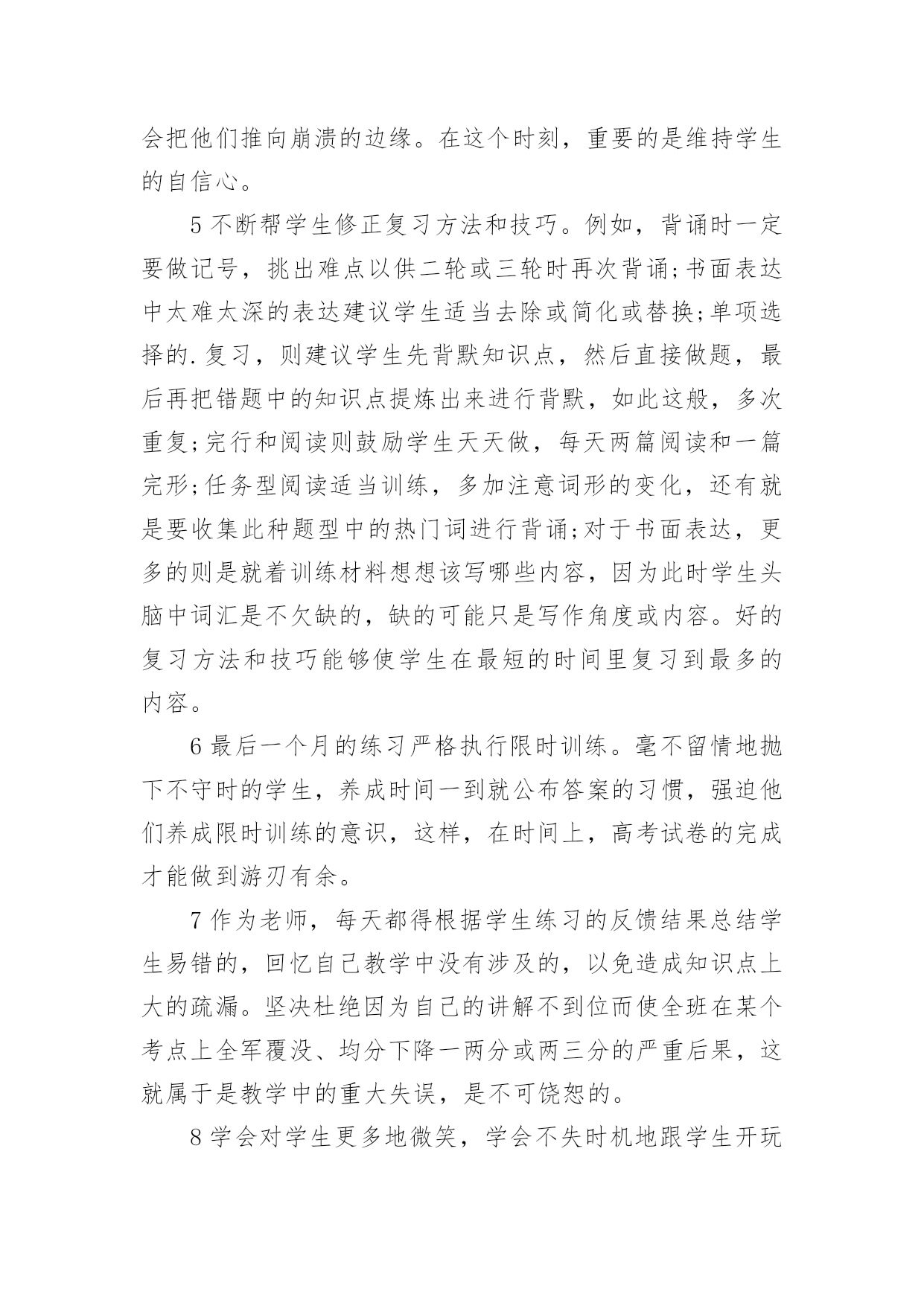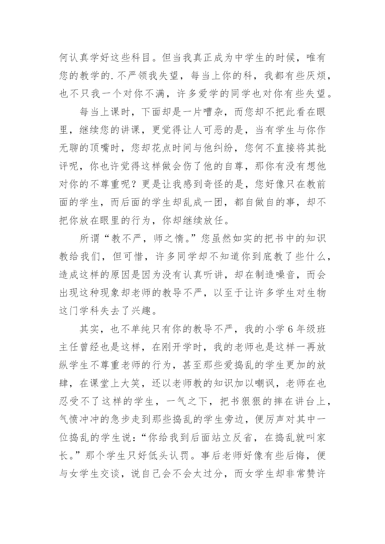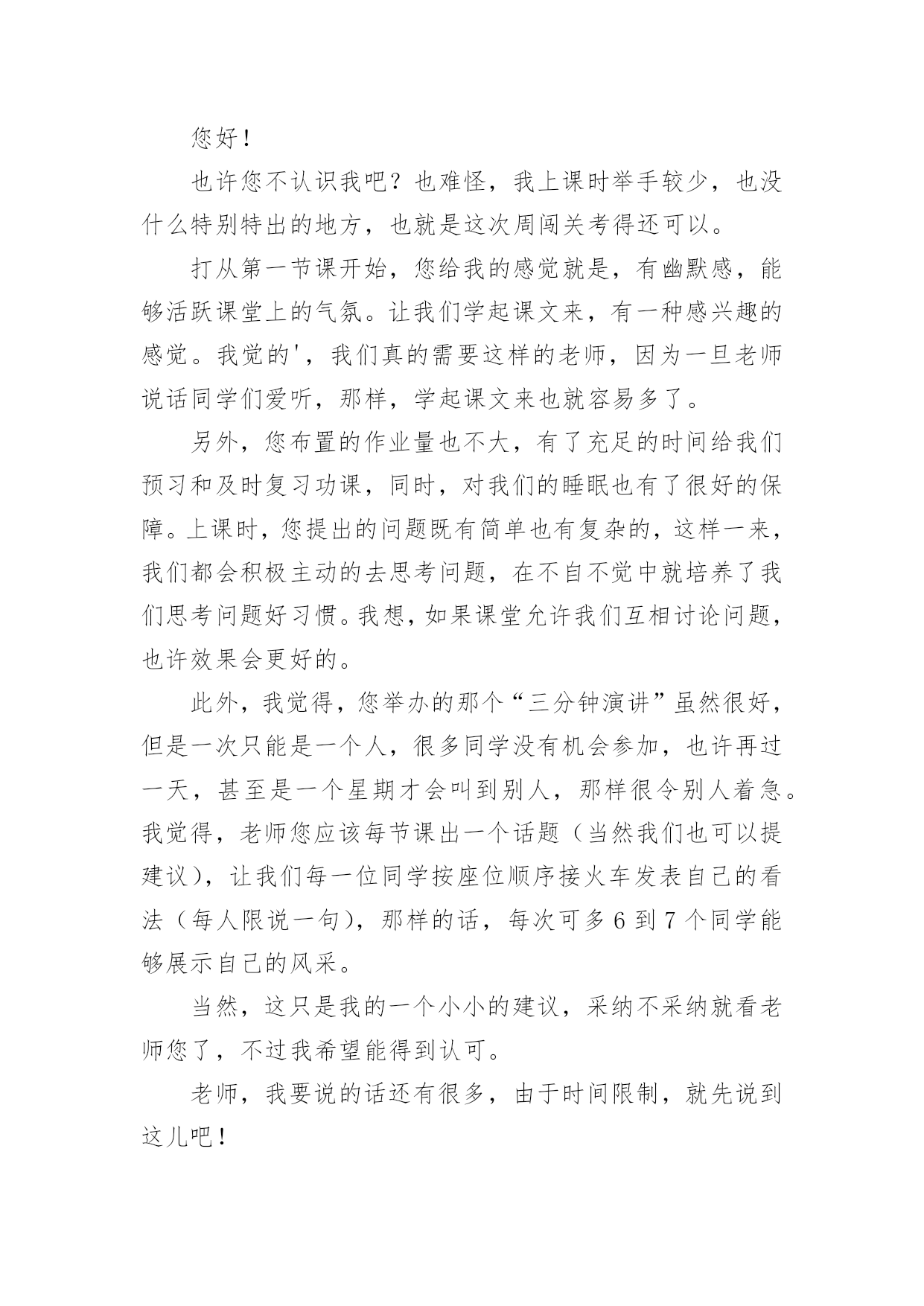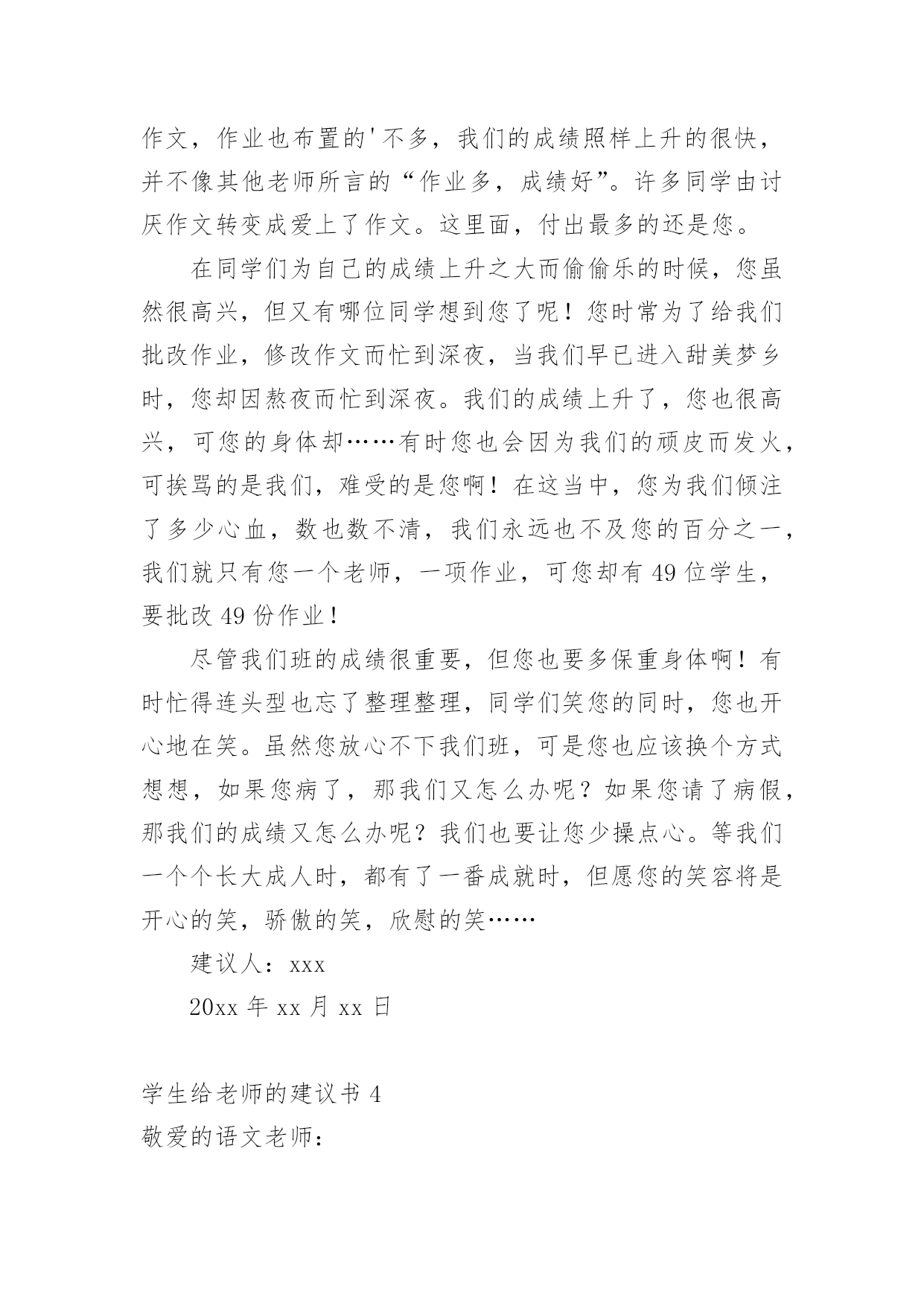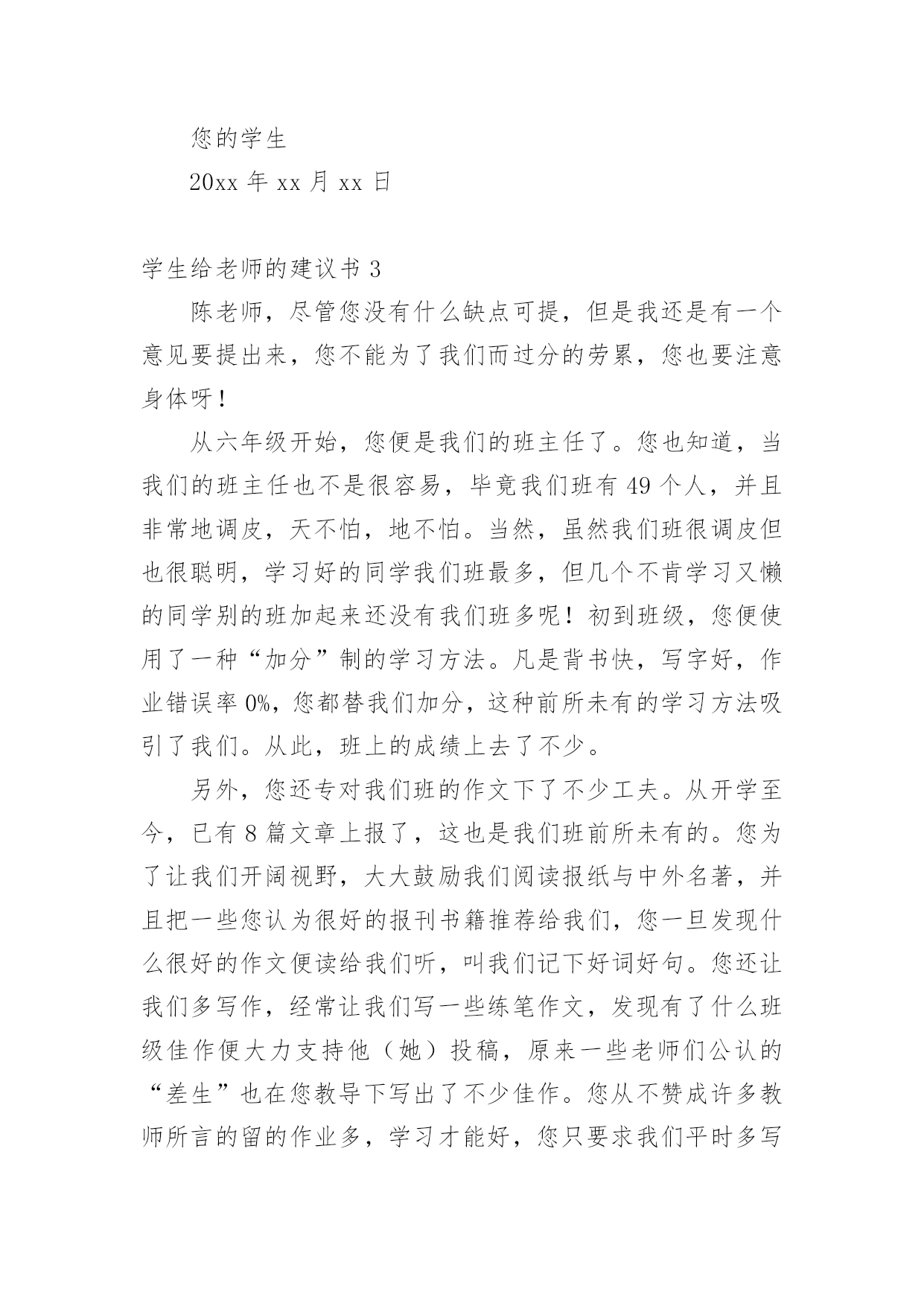 学生给老师的建议书在充满活力,日益开放的今天,越来越多人会去使用建议书,建议书在工作中往往有着承上启下的作用。写起建议书来就毫无头绪?下面是小编精心整理的学生给老师的建议书,欢迎大家分享。学生给老师的建议书1亲爱的老师:离中考一个月给老师的一些建议:1尽管学校和整个组里都制定了计划,但是一定要有适合本班的计划,这样才更加具有指导性和可操作性。2每一堂课都应帮学生安排一个专题进行复习,因为在这样的学校里你面对的是一群迷茫的孩子。3指导学生制定自己的课后复习计划,原则是:避开老师白天在课堂上已经安排复习过的内容,寻找自己的薄弱点作为突破口,从而保证各种题型同时稳步前行,没有疏漏。4不管时间有多紧,任务有多重,当下的考试成绩有多糟糕,在学生面前,老师应永远保持镇定,教学工作永远都应以井然有序的面貌出现。不对学生作任何的抱怨,不去打击每一次积极的询问,耐心讲解学生向你求助的任何一条题目,尤其是很简单的很简单的基础题,对于过难的难题则要鼓励学生放弃。要知道在这个学生心理承受能力极其脆弱的时刻,老师的一丁点过激行为对学生都无疑是雪上加霜,都会把他们推向崩溃的边缘。在这个时刻,重要的是维持学生的自信心。5不断帮学生修正复习方法和技巧。例如,背诵时一定要做记号,挑出难点以供二轮或三轮时再次背诵;书面表达中太难太深的表达建议学生适当去除或简化或替换;单项选择的.复习,则建议学生先背默知识点,然后直接做题,最后再把错题中的知识点提炼出来进行背默,如此这般,多次重复;完行和阅读则鼓励学生天天做,每天两篇阅读和一篇完形;任务型阅读适当训练,多加注意词形的变化,还有就是要收集此种题型中的热门词进行背诵;对于书面表达,更多的则是就着训练材料想想该写哪些内容,因为此时学生头脑中词汇是不欠缺的,缺的可能只是写作角度或内容。好的复习方法和技巧能够使学生在最短的时间里复习到最多的内容。6最后一个月的练习严格执行限时训练。毫不留情地抛下不守时的学生,养成时间一到就公布答案的习惯,强迫他们养成限时训练的意识,这样,在时间上,高考试卷的完成才能做到游刃有余。7作为老师,每天都得根据学生练习的反馈结果总结学生易错的,回忆自己教学中没有涉及的,以免造成知识点上大的疏漏。坚决杜绝因为自己的讲解不到位而使全班在某个考点上全军覆没、均分下降一两分或两三分的严重后果,这就属于是教学中的重大失误,是不可饶恕的。8学会对学生更多地微笑,学会不失时机地跟学生开玩笑。刻意地制造轻松,缓解紧张。请记住:这个时刻,老师是学生主要的、重要的甚至是唯一的知识的依靠者,精神的支撑者,是艰难跋涉路途上的领头人。9面对焦虑彷徨的学生,要适时给予真正语重心长的倾心交谈。语言可以打开郁闷的心结,架起友谊的桥梁,可以化解心中的隔阂,可以使不思进取变为积极向上,可以使自由散漫变成自觉遵守,可以使一颗焦躁不安的心重新找到学习的目标和动力。10在最后的30天里,老师不应有一刻的懈怠心理。迟到早退,讲课没有激情,讲解不深刻不简洁,教授内容没有征对性,教学任务没有连贯性,教学方法没有技巧性,教学理念没有时代性(指要把最新知识最新考点带入课堂),这都会影响整个班级的士气、兴趣,氛围以及有意识学习的投入程度等等。教育界中流行这么一句口号:没有教不好的学生,只有教不好的老师。当初听到,有点气愤,觉得对老师的责任要求有点不近人情了,可是细细想来,我们是可以做到的。只要付出,没有什么不可以改变。xxx20xx年xx月xx日学生给老师的建议书2敬爱的老师:你好!最近班里有一个特别严重的现象,使我务必给您写一封建议书!班里的卫生实在是太差了,有许多同学在扫地的过程中一直在玩耍。所以我必须向您提出以下几点要求。1、有许多同学在扫地的过程中一直在玩耍。每次打扫卫生,他们总是边玩边打扫,导致分神,扫地不干净。有时候甚至没有拖地,或者是只拖一小部分,让剩下的地有些不光泽,有点涩,有时候把人绊倒!再次我想对那些扫地不认真的同学们一个警告!2、许多同学来学一直捎带零食的现象太严重,造成的垃圾现象也太严重,所以我建议不要在带零食来学校了。(如果我劝说的不管用的话请麻烦老师来劝说一下)3、带“零水”(“零水”指的是那些可乐、雪碧之类的汽水!)的同学比带零食的同学的现象多,喝多了的话会肚子痛,有时还会张出白头发,就像申阳头上长得一样。因为我不想让疾病得逞所以还麻烦老师来劝说一下!4、还有的同学不仅不美化我们的校园,还随手乱丢垃圾,破坏我们的校园,让地球妈妈有受到了伤害,所以我建议各位同学,不要因为那些垃圾而破坏了我们的美好环境,就像《只有一个地球》这篇课文里面的'句子一样:地球上的资源可以源源不断的为人类做出长期贡献,但是由于人们的污染和破坏,导致森林消失、动物灭绝、植物减少。我们这个地球太可爱了,同时又太容易破碎了!我不希望因为个别的几位同学