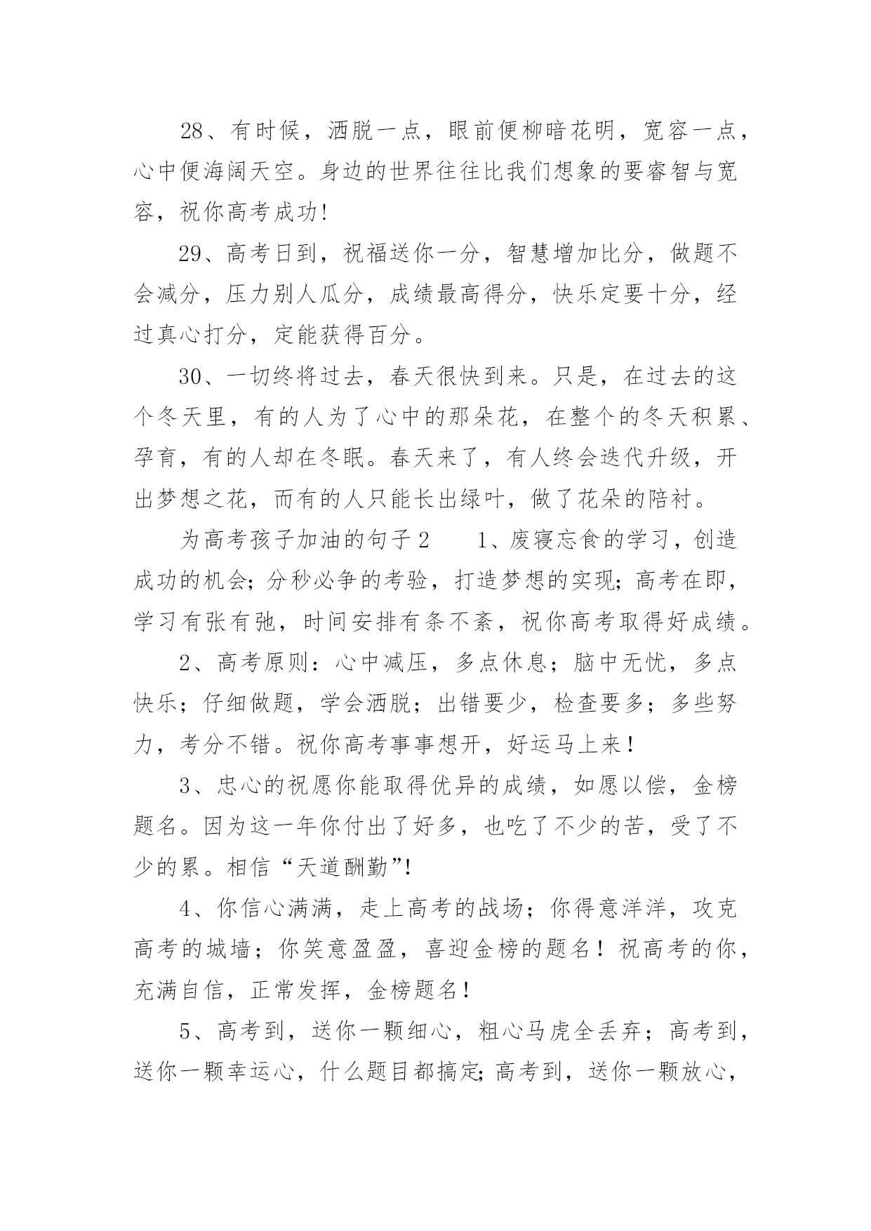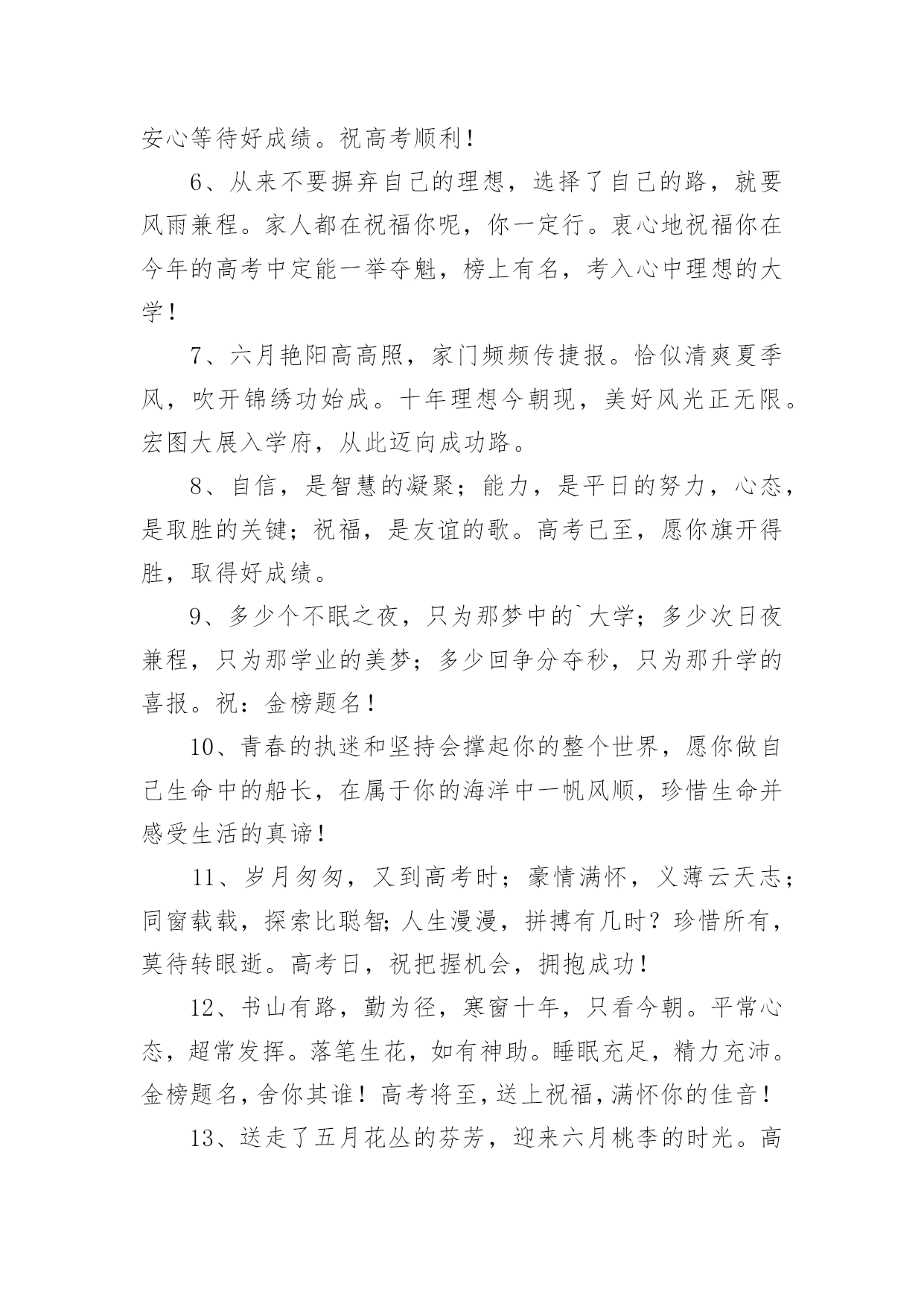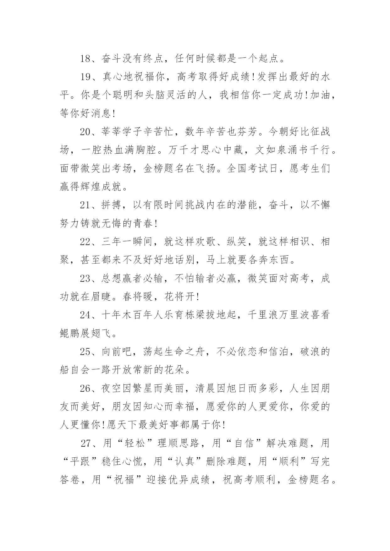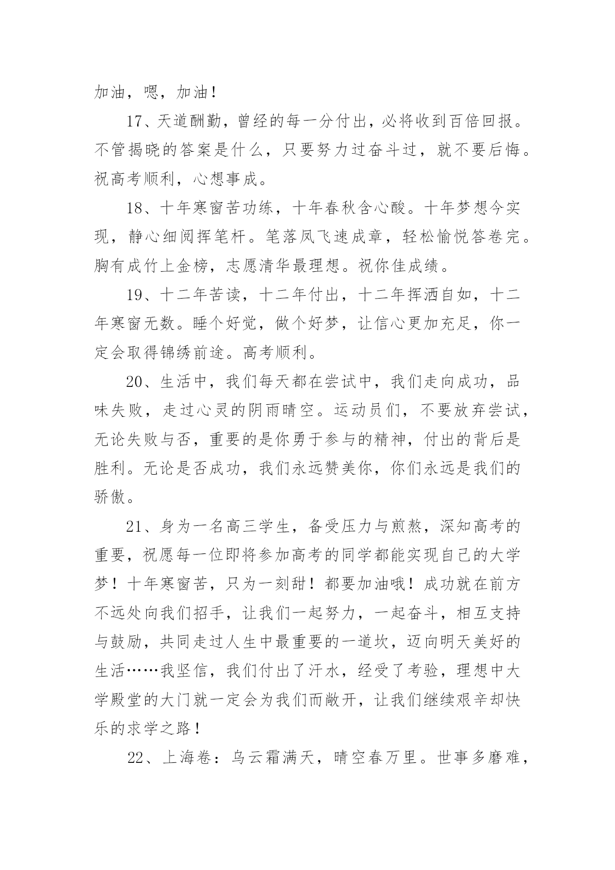 为高考孩子加油的句子为高考孩子加油的句子在日常学习、工作和生活中,大家总少不了接触一些耳熟能详的句子吧,句子是由词或词组构成的语言基本运用单位。究竟什么样的句子才是好的句子呢?下面是小编收集整理的为高考孩子加油的句子,欢迎大家借鉴与参考,希望对大家有所帮助。为高考孩子加油的句子11、松树在悬崖峭壁上巍然挺立,雄风不衰,是因为它具有勇于傲霜斗雪的内在气质。2、明天就要高考,出门还得趁早。付出就有回报,赶紧睡个好觉。别想分数高低,放松最为重要。老妈最近很累,别忘对她笑笑,老爸场场接送,给他一个拥抱。穿得漂漂亮亮,誓把监考迷倒。最后提醒一遍,检查铅笔小刀!3、此百日埋头,金榜题名会有时,待他日昂首,直挂云帆济沧海。4、努力的苦读,就为这一刻啰!把你的实力全部发挥,所有关爱着你的人,都会为你祝福、祈祷,相信你会考出满意的成绩,榜上有名喔。5、十年寒窗苦,只为一朝忙,光芒前途路,高考来测量,轻松进考场,奋笔疾书忙,梦想成真在眼前。祝金榜题名。6、练习就是高考,高考就是练习。7、高考的意义在于,无论你多么平凡渺小,只要你竭尽所能,就能迎来人生的蜕变。8、奋战百日,三载拼搏终有回报!决胜高考,父母期待定成现实!9、当你在面对同样的压力,同样的困境,心依然在痛的时候,却忘了眼泪是什么滋味。10、时光带走了青涩的容颜,是否也教会了你生活的道理?听过的道理再多,也不如自己真正的运用到实践当中,做生活的智者,活着才更有意义!11、为了未来美一点,现在必须苦一点。低头不算认输,放弃才是懦夫。12、财富无处不在,行动成就梦想。13、势不可使尽,福不可享尽,便宜不可占尽,聪明不可用尽。14、晚上笑笑睡个美满觉,早晨笑笑全天生活有情调,工作之余笑笑满堂欢喜又热闹,烦恼之时笑笑一切忧愁全抛掉,收到短信笑笑感受生活真美妙。15、让我们奋斗一百天,未来与希望就能在六月美丽夺目。16、鲤鱼不跃,岂可成龙?大鹏驻足,焉能腾空?十年磨刀霍霍,只为今朝一搏。人生能有几回搏,又是一年高考时,此时不搏何时搏?17、三年时光匆匆过,风雨兼程苦苦付,金榜题名辉辉到,辛劳即成空空梦,今日高考大大胜,来年腾飞啸啸龙。正常心态考场战,求学一定获成功!18、奋斗没有终点,任何时候都是一个起点。19、真心地祝福你,高考取得好成绩!发挥出最好的水平。你是个聪明和头脑灵活的人,我相信你一定成功!加油,等你好消息!20、莘莘学子辛苦忙,数年辛苦也芬芳。今朝好比征战场,一腔热血满胸腔。万千才思心中藏,文如泉涌书千行。面带微笑出考场,金榜题名在飞扬。全国考试日,愿考生们赢得辉煌成就。21、拼搏,以有限时间挑战内在的潜能,奋斗,以不懈努力铸就无悔的青春!22、三年一瞬间,就这样欢歌、纵笑,就这样相识、相聚,甚至都来不及好好地话别,马上就要各奔东西。23、总想赢者必输,不怕输者必赢,微笑面对高考,成功就在眉睫。春将暖,花将开!24、十年木百年人乐育栋梁拔地起,千里浪万里波喜看鲲鹏展翅飞。25、向前吧,荡起生命之舟,不必依恋和信泊,破浪的船自会一路开放常新的花朵。26、夜空因繁星而美丽,清晨因旭日而多彩,人生因朋友而美好,朋友因知心而幸福,愿爱你的人更爱你,你爱的人更懂你!愿天下最美好事都属于你!27、用“轻松”理顺思路,用“自信”解决难题,用“平跟”稳住心慌,用“认真”删除难题,用“顺利”写完答卷,用“祝福”迎接优异成绩,祝高考顺利,金榜题名。28、有时候,洒脱一点,眼前便柳暗花明,宽容一点,心中便海阔天空。身边的世界往往比我们想象的要睿智与宽容,祝你高考成功!29、高考日到,祝福送你一分,智慧增加比分,做题不会减分,压力别人瓜分,成绩最高得分,快乐定要十分,经过真心打分,定能获得百分。30、一切终将过去,春天很快到来。只是,在过去的这个冬天里,有的人为了心中的那朵花,在整个的冬天积累、孕育,有的人却在冬眠。春天来了,有人终会迭代升级,开出梦想之花,而有的人只能长出绿叶,做了花朵的陪衬。为高考孩子加油的句子21、废寝忘食的学习,创造成功的机会;分秒必争的考验,打造梦想的实现;高考在即,学习有张有弛,时间安排有条不紊,祝你高考取得好成绩。2、高考原则:心中减压,多点休息;脑中无忧,多点快乐;仔细做题,学会洒脱;出错要少,检查要多;多些努力,考分不错。祝你高考事事想开,好运马上来!3、忠心的祝愿你能取得优异的成绩,如愿以偿,金榜题名。因为这一年你付出了好多,也吃了不少的苦,受了不少的累。相信“天道酬勤”!4、你信心满满,走上高考的战场;你得意洋洋,攻克高考的城墙;你笑意盈盈,喜迎金榜的题名!祝高考的你,充满自信,正常发挥,金榜题名!5、高考到,送你一颗细心,粗心马虎全丢弃;高考到,送你一颗幸运心,什么题目都搞定;高考到,送你一颗放心,安心等待好成绩。祝高考顺利!6、从来不要摒弃自己的理想,选择了自己的