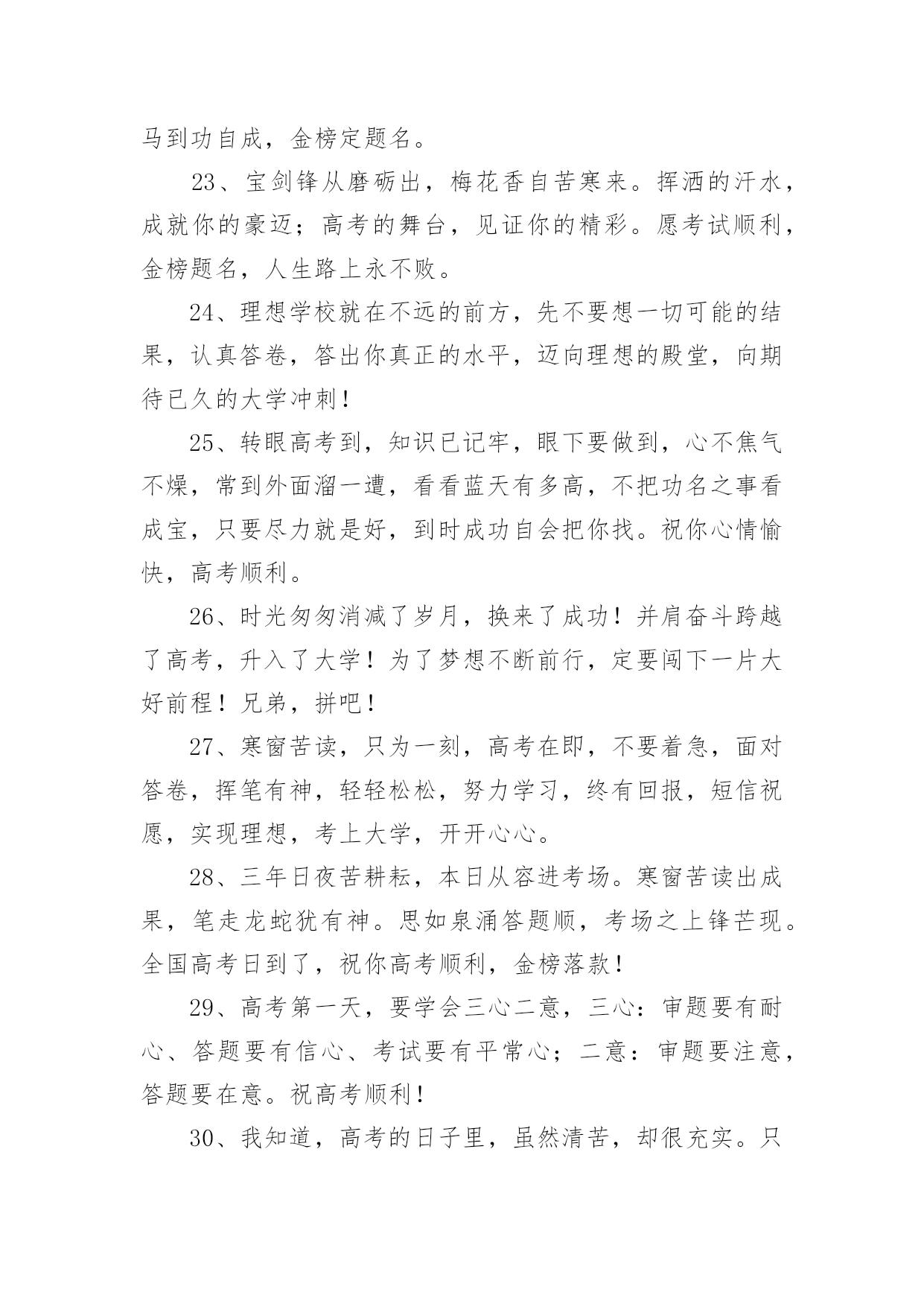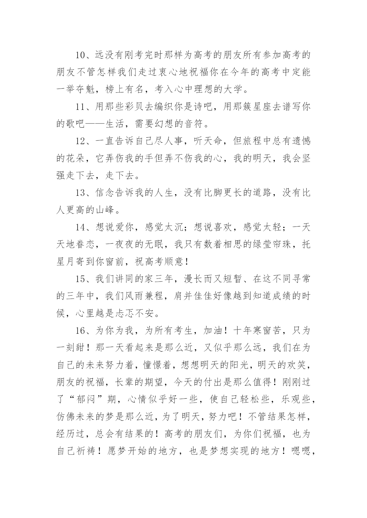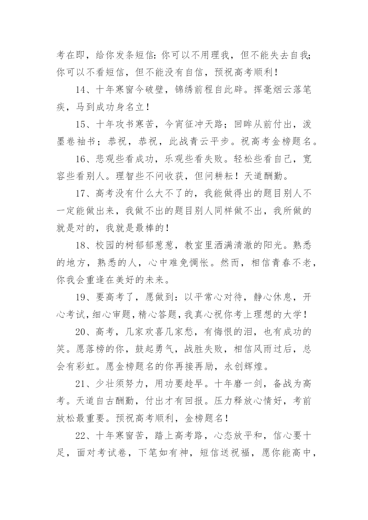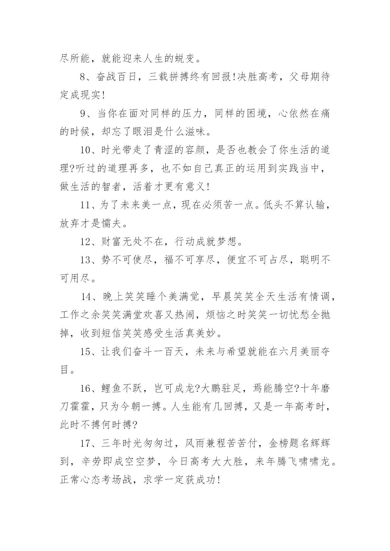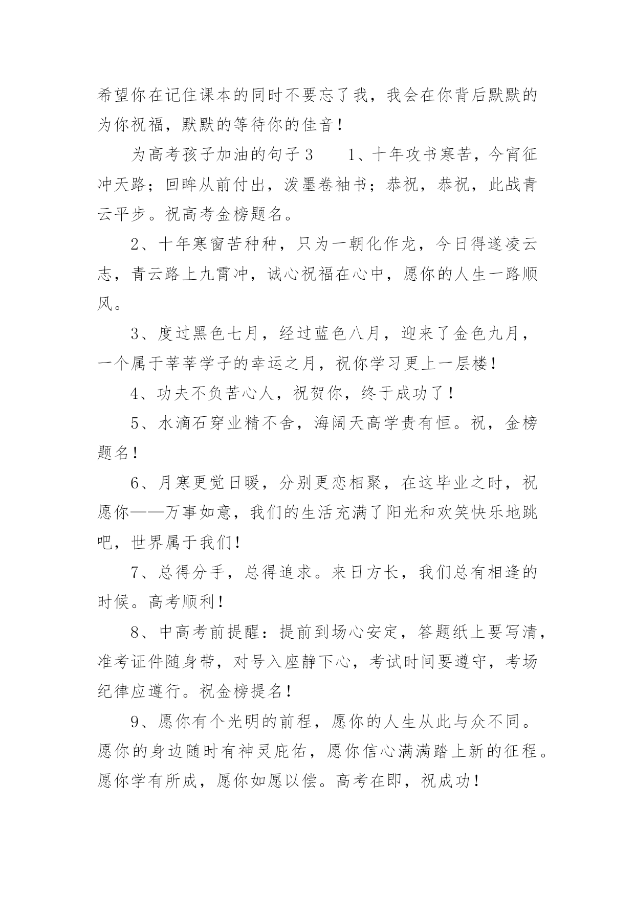 为高考孩子加油的句子为高考孩子加油的句子在日常学习、工作和生活中,大家总少不了接触一些耳熟能详的句子吧,句子是由词或词组构成的语言基本运用单位。究竟什么样的句子才是好的句子呢?下面是小编收集整理的为高考孩子加油的句子,欢迎大家借鉴与参考,希望对大家有所帮助。为高考孩子加油的句子11、松树在悬崖峭壁上巍然挺立,雄风不衰,是因为它具有勇于傲霜斗雪的内在气质。2、明天就要高考,出门还得趁早。付出就有回报,赶紧睡个好觉。别想分数高低,放松最为重要。老妈最近很累,别忘对她笑笑,老爸场场接送,给他一个拥抱。穿得漂漂亮亮,誓把监考迷倒。最后提醒一遍,检查铅笔小刀!3、此百日埋头,金榜题名会有时,待他日昂首,直挂云帆济沧海。4、努力的苦读,就为这一刻啰!把你的实力全部发挥,所有关爱着你的人,都会为你祝福、祈祷,相信你会考出满意的成绩,榜上有名喔。5、十年寒窗苦,只为一朝忙,光芒前途路,高考来测量,轻松进考场,奋笔疾书忙,梦想成真在眼前。祝金榜题名。6、练习就是高考,高考就是练习。7、高考的意义在于,无论你多么平凡渺小,只要你竭尽所能,就能迎来人生的蜕变。8、奋战百日,三载拼搏终有回报!决胜高考,父母期待定成现实!9、当你在面对同样的压力,同样的困境,心依然在痛的时候,却忘了眼泪是什么滋味。10、时光带走了青涩的容颜,是否也教会了你生活的道理?听过的道理再多,也不如自己真正的运用到实践当中,做生活的智者,活着才更有意义!11、为了未来美一点,现在必须苦一点。低头不算认输,放弃才是懦夫。12、财富无处不在,行动成就梦想。13、势不可使尽,福不可享尽,便宜不可占尽,聪明不可用尽。14、晚上笑笑睡个美满觉,早晨笑笑全天生活有情调,工作之余笑笑满堂欢喜又热闹,烦恼之时笑笑一切忧愁全抛掉,收到短信笑笑感受生活真美妙。15、让我们奋斗一百天,未来与希望就能在六月美丽夺目。16、鲤鱼不跃,岂可成龙?大鹏驻足,焉能腾空?十年磨刀霍霍,只为今朝一搏。人生能有几回搏,又是一年高考时,此时不搏何时搏?17、三年时光匆匆过,风雨兼程苦苦付,金榜题名辉辉到,辛劳即成空空梦,今日高考大大胜,来年腾飞啸啸龙。正常心态考场战,求学一定获成功!18、奋斗没有终点,任何时候都是一个起点。19、真心地祝福你,高考取得好成绩!发挥出最好的水平。你是个聪明和头脑灵活的人,我相信你一定成功!加油,等你好消息!20、莘莘学子辛苦忙,数年辛苦也芬芳。今朝好比征战场,一腔热血满胸腔。万千才思心中藏,文如泉涌书千行。面带微笑出考场,金榜题名在飞扬。全国考试日,愿考生们赢得辉煌成就。21、拼搏,以有限时间挑战内在的潜能,奋斗,以不懈努力铸就无悔的青春!22、三年一瞬间,就这样欢歌、纵笑,就这样相识、相聚,甚至都来不及好好地话别,马上就要各奔东西。23、总想赢者必输,不怕输者必赢,微笑面对高考,成功就在眉睫。春将暖,花将开!24、十年木百年人乐育栋梁拔地起,千里浪万里波喜看鲲鹏展翅飞。25、向前吧,荡起生命之舟,不必依恋和信泊,破浪的船自会一路开放常新的花朵。26、夜空因繁星而美丽,清晨因旭日而多彩,人生因朋友而美好,朋友因知心而幸福,愿爱你的人更爱你,你爱的人更懂你!愿天下最美好事都属于你!27、用“轻松”理顺思路,用“自信”解决难题,用“平跟”稳住心慌,用“认真”删除难题,用“顺利”写完答卷,用“祝福”迎接优异成绩,祝高考顺利,金榜题名。28、有时候,洒脱一点,眼前便柳暗花明,宽容一点,心中便海阔天空。身边的世界往往比我们想象的要睿智与宽容,祝你高考成功!29、高考日到,祝福送你一分,智慧增加比分,做题不会减分,压力别人瓜分,成绩最高得分,快乐定要十分,经过真心打分,定能获得百分。30、一切终将过去,春天很快到来。只是,在过去的这个冬天里,有的人为了心中的那朵花,在整个的冬天积累、孕育,有的人却在冬眠。春天来了,有人终会迭代升级,开出梦想之花,而有的人只能长出绿叶,做了花朵的陪衬。为高考孩子加油的句子21、废寝忘食的学习,创造成功的机会;分秒必争的考验,打造梦想的实现;高考在即,学习有张有弛,时间安排有条不紊,祝你高考取得好成绩。2、高考原则:心中减压,多点休息;脑中无忧,多点快乐;仔细做题,学会洒脱;出错要少,检查要多;多些努力,考分不错。祝你高考事事想开,好运马上来!3、忠心的祝愿你能取得优异的成绩,如愿以偿,金榜题名。因为这一年你付出了好多,也吃了不少的苦,受了不少的累。相信“天道酬勤”!4、你信心满满,走上高考的战场;你得意洋洋,攻克高考的城墙;你笑意盈盈,喜迎金榜的题名!祝高考的你,充满自信,正常发挥,金榜题名!5、高考到,送你一颗细心,粗心马虎全丢弃;高考到,送你一颗幸运心,什么题目都搞定;高考到,送你一颗放心,安心等待好成绩。祝高考顺利!6、从来不要摒弃自己的理想,选择了自己的
