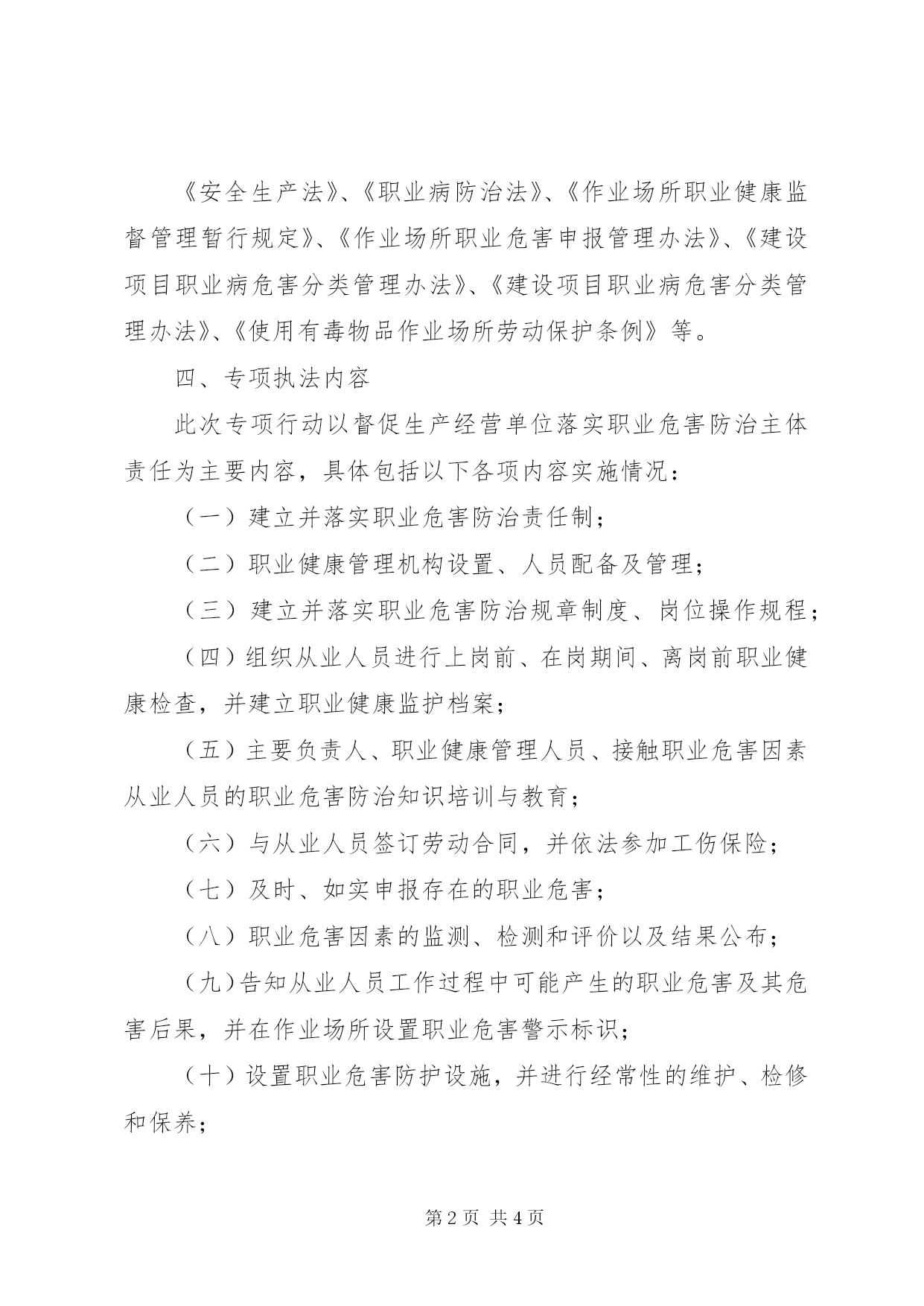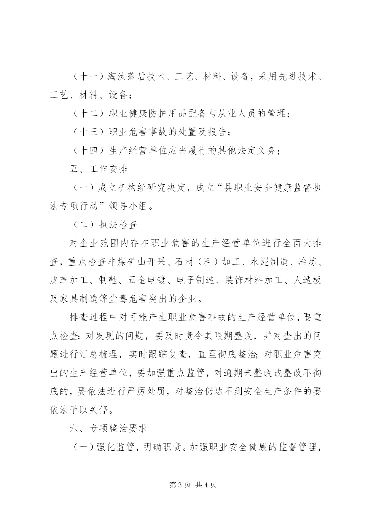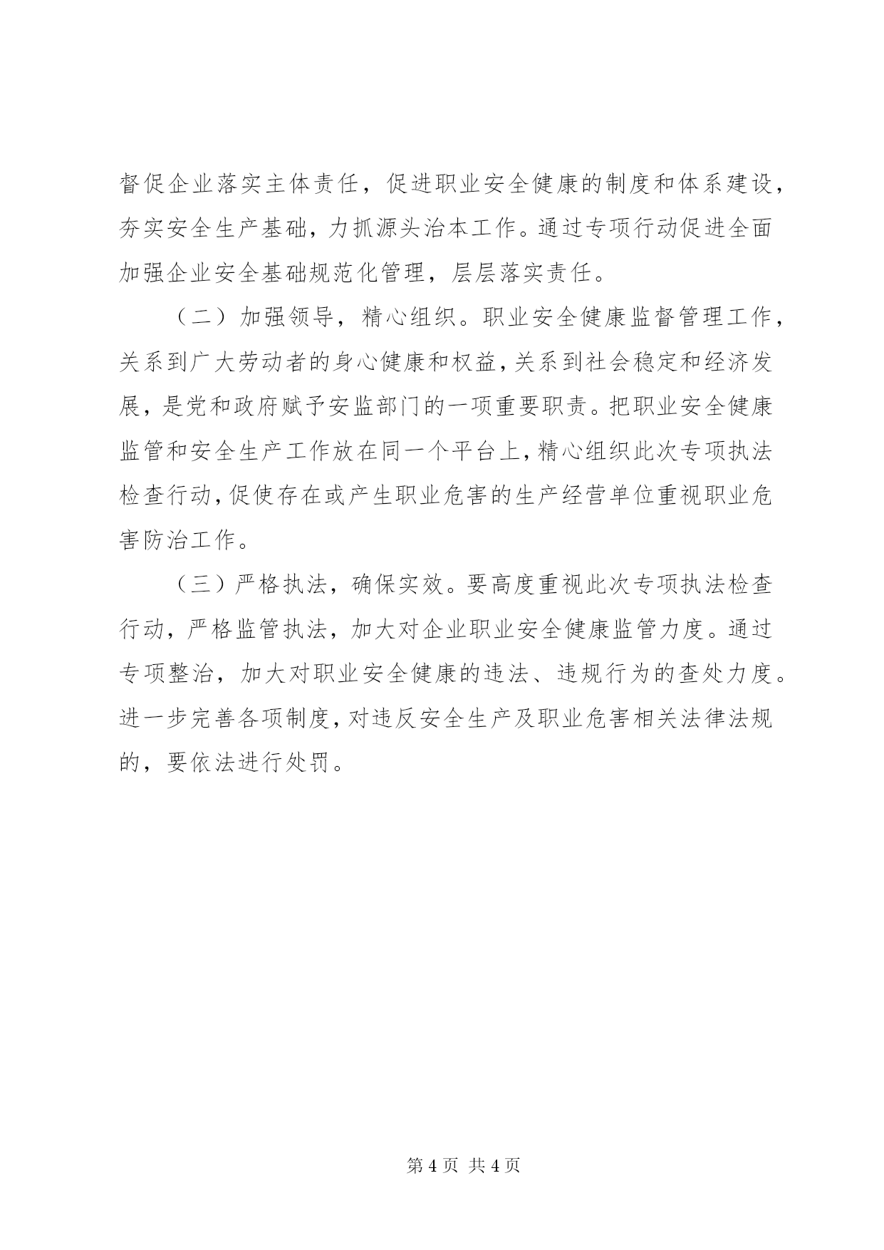 第PAGE\*Arabic\*MERGEFORMAT4页共NUMPAGES\*MERGEFORMAT4页安监局职业健康方案为加强职业安全健康监管,有效防范和控制职业病危害事故的发生,切实保护广大劳动者身体健康和生命安全,全面推动职业安全健康监督管理工作稳步发展,根据市安监局关于《市职业健康专项执法检查方案》(饶安监管字[2011]122号)文件的要求,并结合我县粉尘和高毒物品危害治理及木制家具制造企业高毒物质危害治理的实际情况,决定2011年6月5日—6月30日,在全县开展职业安全健康监管专项执法检查行动,制定如下实施方案。一、指导思想坚持“安全第一,预防为主,综合治理”的方针,全面贯彻科学发展观,落实全国职业安全健康监管工作会议精神。以法律为支撑,以保护劳动者健康为目的,扎实开展专项执法行动,有效防止和减少各类职业病危害事故。二、总体目标以“关爱生命、安全发展”为主题,加强监管,建立企业职业安全健康长效机制,促进生产经营单位落实职业危害防治主体责任,全面治理职业危害防治的薄弱环节,认真解决存在的突出问题,改善工作场所作业环境,提高综合防治能力,实现职业危害防治形势持续稳定好转。三、法律依据《安全生产法》、《职业病防治法》、《作业场所职业健康监督管理暂行规定》、《作业场所职业危害申报管理办法》、《建设项目职业病危害分类管理办法》、《建设项目职业病危害分类管理办法》、《使用有毒物品作业场所劳动保护条例》等。四、专项执法内容此次专项行动以督促生产经营单位落实职业危害防治主体责任为主要内容,具体包括以下各项内容实施情况:(一)建立并落实职业危害防治责任制;(二)职业健康管理机构设置、人员配备及管理;(三)建立并落实职业危害防治规章制度、岗位操作规程;(四)组织从业人员进行上岗前、在岗期间、离岗前职业健康检查,并建立职业健康监护档案;(五)主要负责人、职业健康管理人员、接触职业危害因素从业人员的职业危害防治知识培训与教育;(六)与从业人员签订劳动合同,并依法参加工伤保险;(七)及时、如实申报存在的职业危害;(八)职业危害因素的监测、检测和评价以及结果公布;(九)告知从业人员工作过程中可能产生的职业危害及其危害后果,并在作业场所设置职业危害警示标识;(十)设置职业危害防护设施,并进行经常性的维护、检修和保养;(十一)淘汰落后技术、工艺、材料、设备,采用先进技术、工艺、材料、设备;(十二)职业健康防护用品配备与从业人员的管理;(十三)职业危害事故的处置及报告;(十四)生产经营单位应当履行的其他法定义务;五、工作安排(一)成立机构经研究决定,成立“县职业安全健康监督执法专项行动”领导小组。(二)执法检查对企业范围内存在职业危害的生产经营单位进行全面大排查,重点检查非煤矿山开采、石材(料)加工、水泥制造、冶炼、皮革加工、制鞋、五金电镀、电子制造、装饰材料加工、人造板及家具制造等尘毒危害突出的企业。排查过程中对可能产生职业危害事故的生产经营单位,要重点检查;对发现的问题,要及时责令其限期整改,并对查出的问题进行汇总梳理,实时跟踪复查,直至彻底整治;对职业危害突出的生产经营单位,要加强重点监管,对逾期未整改或整改不彻底的,要依法进行严厉处罚,对整治仍达不到安全生产条件的要依法予以关停。六、专项整治要求(一)强化监管,明确职责。加强职业安全健康的监督管理,督促企业落实主体责任,促进职业安全健康的制度和体系建设,夯实安全生产基础,力抓源头治本工作。通过专项行动促进全面加强企业安全基础规范化管理,层层落实责任。(二)加强领导,精心组织。职业安全健康监督管理工作,关系到广大劳动者的身心健康和权益,关系到社会稳定和经济发展,是党和政府赋予安监部门的一项重要职责。把职业安全健康监管和安全生产工作放在同一个平台上,精心组织此次专项执法检查行动,促使存在或产生职业危害的生产经营单位重视职业危害防治工作。(三)严格执法,确保实效。要高度重视此次专项执法检查行动,严格监管执法,加大对企业职业安全健康监管力度。通过专项整治,加大对职业安全健康的违法、违规行为的查处力度。进一步完善各项制度,对违反安全生产及职业危害相关法律法规的,要依法进行处罚。
