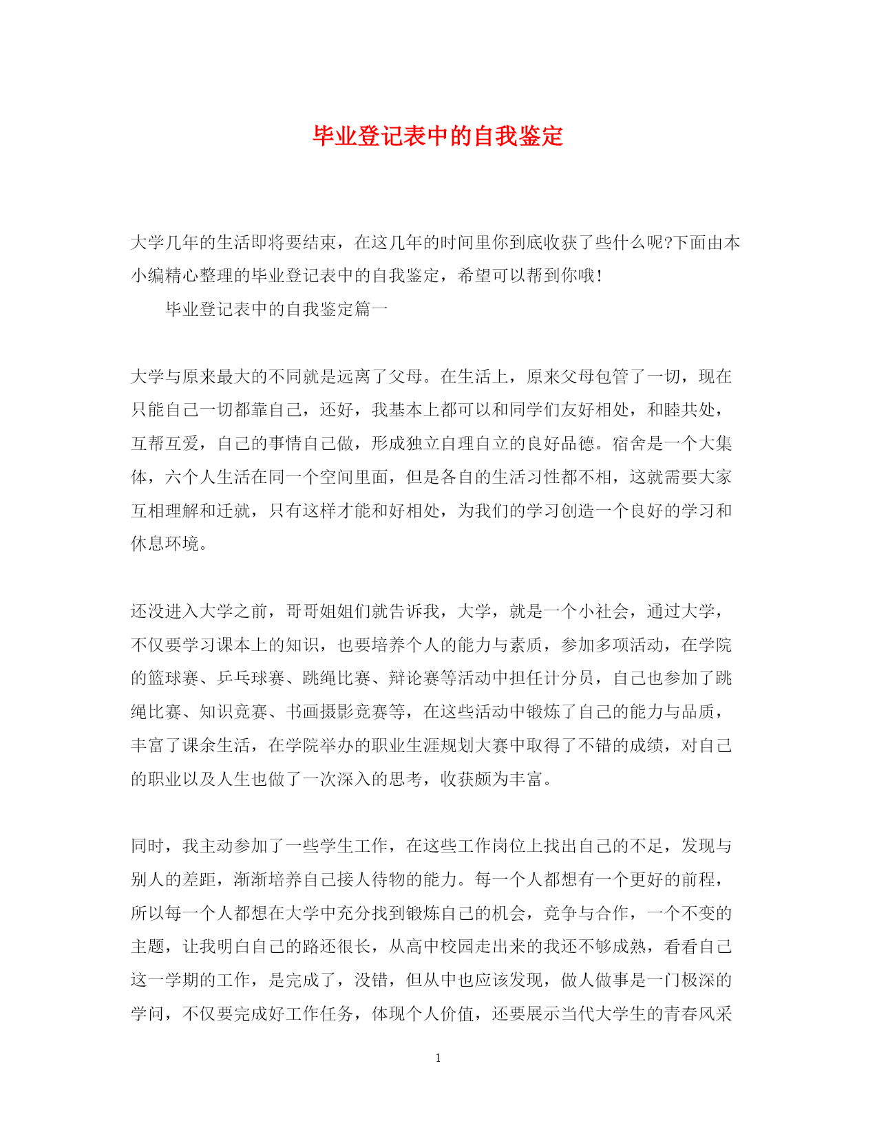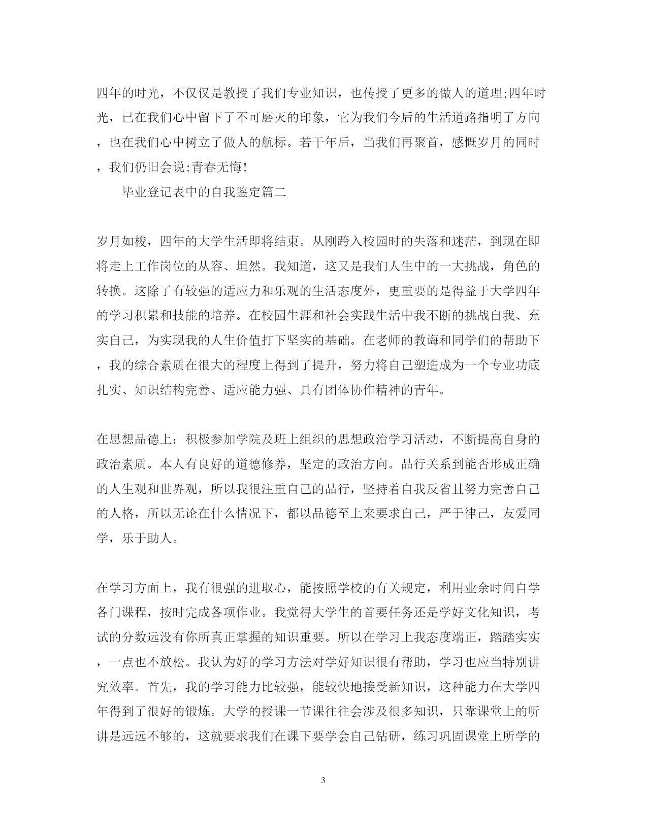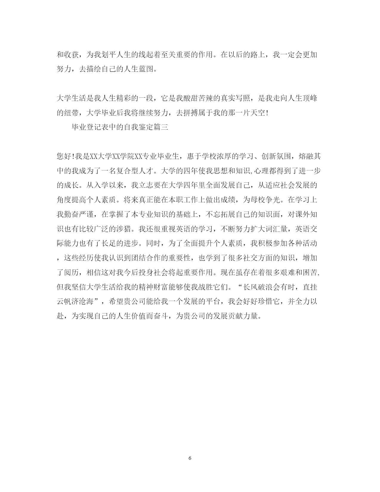 此资料由网络收集而来,如有侵权请告知上传者立即删除。资料共分享,我们负责传递知识。PAGEPAGE6毕业登记表中的自我鉴定大学几年的生活即将要结束,在这几年的时间里你到底收获了些什么呢?下面由本小编精心整理的毕业登记表中的自我鉴定,希望可以帮到你哦!毕业登记表中的自我鉴定篇一大学与原来最大的不同就是远离了父母。在生活上,原来父母包管了一切,现在只能自己一切都靠自己,还好,我基本上都可以和同学们友好相处,和睦共处,互帮互爱,自己的事情自己做,形成独立自理自立的良好品德。宿舍是一个大集体,六个人生活在同一个空间里面,但是各自的生活习性都不相,这就需要大家互相理解和迁就,只有这样才能和好相处,为我们的学习创造一个良好的学习和休息环境。还没进入大学之前,哥哥姐姐们就告诉我,大学,就是一个小社会,通过大学,不仅要学习课本上的知识,也要培养个人的能力与素质,参加多项活动,在学院的篮球赛、乒乓球赛、跳绳比赛、辩论赛等活动中担任计分员,自己也参加了跳绳比赛、知识竞赛、书画摄影竞赛等,在这些活动中锻炼了自己的能力与品质,丰富了课余生活,在学院举办的职业生涯规划大赛中取得了不错的成绩,对自己的职业以及人生也做了一次深入的思考,收获颇为丰富。同时,我主动参加了一些学生工作,在这些工作岗位上找出自己的不足,发现与别人的差距,渐渐培养自己接人待物的能力。每一个人都想有一个更好的前程,所以每一个人都想在大学中充分找到锻炼自己的机会,竞争与合作,一个不变的主题,让我明白自己的路还很长,从高中校园走出来的我还不够成熟,看看自己这一学期的工作,是完成了,没错,但从中也应该发现,做人做事是一门极深的学问,不仅要完成好工作任务,体现个人价值,还要展示当代大学生的青春风采,并逐渐成为能够担当重任的青年。我记得参加过的社团活动,用自身的体验告诉我团结合作的重要性,当把十几二十几个人聚在一起的时候,如果只是各自为阵,谁都不知道还能完成什么任务。一个人的力量毕竟是有限的,无论是现实还是虚幻中,那种能够力挽狂澜的英雄,除了自身英勇的气魄之外,一定少不了他人的鼎力相助。现在社会提倡的是团队精神,只有在自己的工作中恰如其分的与他人合作,才会有有事半功倍的效果。学生会打开的是另外一扇门,一扇真实世界的门,与人交流,不能等着别人来找你,而是要找到恰当渠道,先将自己介绍出去。那些为学生服务的工作,其实也是在为自己服务,为自己积累宝贵的经验,寻找这个世界的钥匙。大学里将会有越来越多的青年一代,这些迈入大学校园,将会接受大学的洗礼,接受文化的熏陶,接受人生价值的又一次升华,与此同时,也能为大学带来新的、勃勃的生气。作为一个幸运的80后,我也庆幸自己能够参与其中,大学生活不能说漫长,但至少还有时间,还有能让我们再细细体验的余地。在以后的学习生活中,我将努力保持并发扬自己的优点,改正不足,勤奋刻苦的完成自己的课程,积极帮助周围的同学,与他们一起进步;在工作中认真踏实,事先做好计划,周全的考虑问题,争取使自己更加完善,更能展现新时代大学生的精神面貌与英姿。如今,眼看着毕业的日期日日临近,不管是继续深造还是步入社会,我们将迎来新的起点,回望过去的岁月,有着不尽的感慨。大学四年,带着我们一步一步地从校园走向社会,它让我们不管是在身体还是心理上都更加成熟,也让我们懂得了珍惜,珍惜过去的岁月,珍惜青春,珍惜我们共同拥有的日子。四年的时光,不仅仅是教授了我们专业知识,也传授了更多的做人的道理;四年时光,已在我们心中留下了不可磨灭的印象,它为我们今后的生活道路指明了方向,也在我们心中树立了做人的航标。若干年后,当我们再聚首,感慨岁月的同时,我们仍旧会说:青春无悔!毕业登记表中的自我鉴定篇二岁月如梭,四年的大学生活即将结束。从刚跨入校园时的失落和迷茫,到现在即将走上工作岗位的从容、坦然。我知道,这又是我们人生中的一大挑战,角色的转换。这除了有较强的适应力和乐观的生活态度外,更重要的是得益于大学四年的学习积累和技能的培养。在校园生涯和社会实践生活中我不断的挑战自我、充实自己,为实现我的人生价值打下坚实的基础。在老师的教诲和同学们的帮助下,我的综合素质在很大的程度上得到了提升,努力将自己塑造成为一个专业功底扎实、知识结构完善、适应能力强、具有团体协作精神的青年。在思想品德上:积极参加学院及班上组织的思想政治学习活动,不断提高自身的政治素质。本人有良好的道德修养,坚定的政治方向。品行关系到能否形成正确的人生观和世界观,所以我很注重自己的品行,坚持着自我反省且努力完善自己的人格,所以无论在什么情况下,都以品德至上来要求自己,严于律己,友爱同学,乐于助人。在学习方面上,我有很强的进取心,能按照学校的有关规定,利用业余时间自学各门课程,按时完成各项作业。我觉得大学生的首