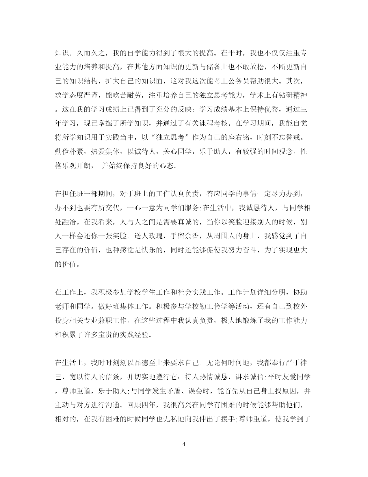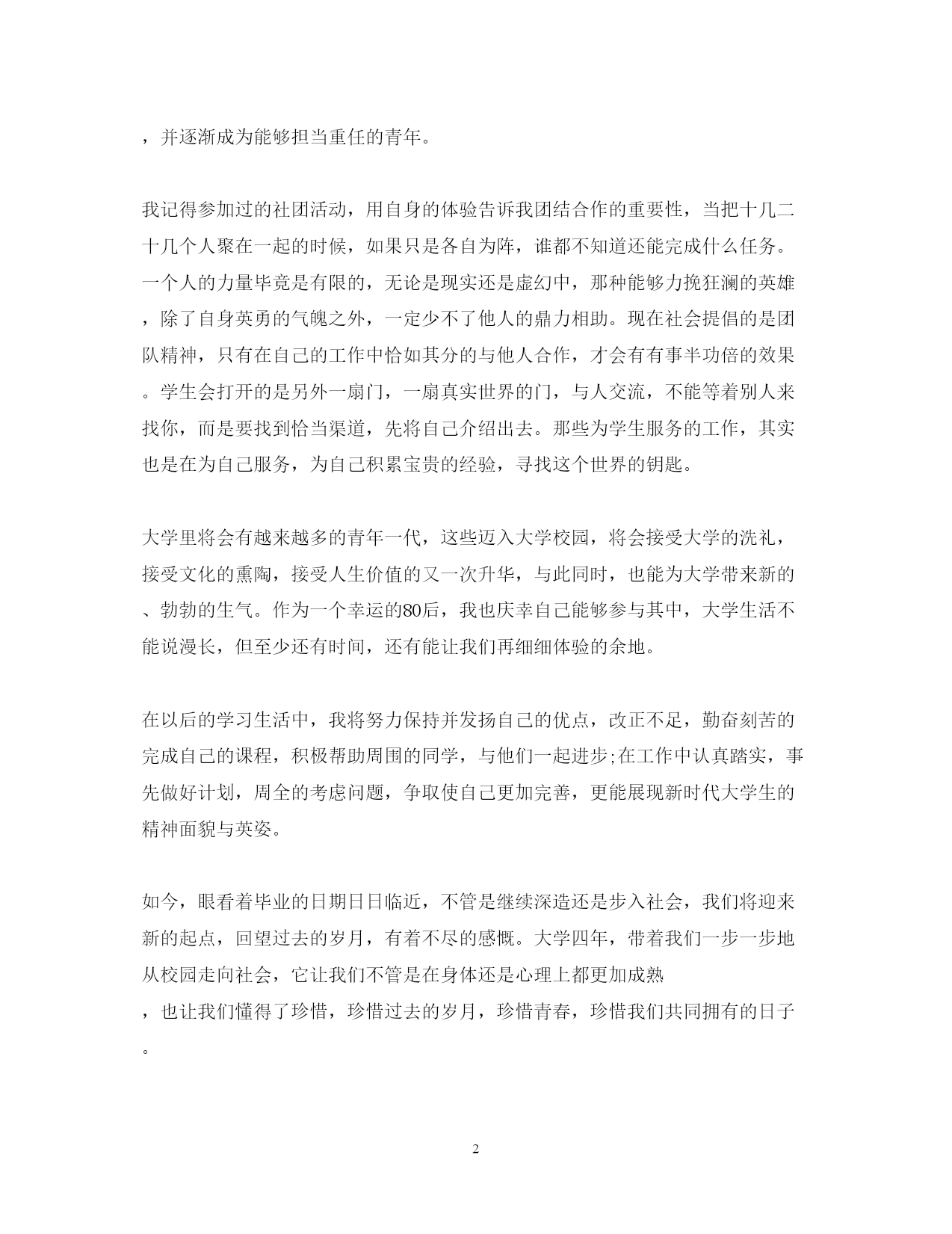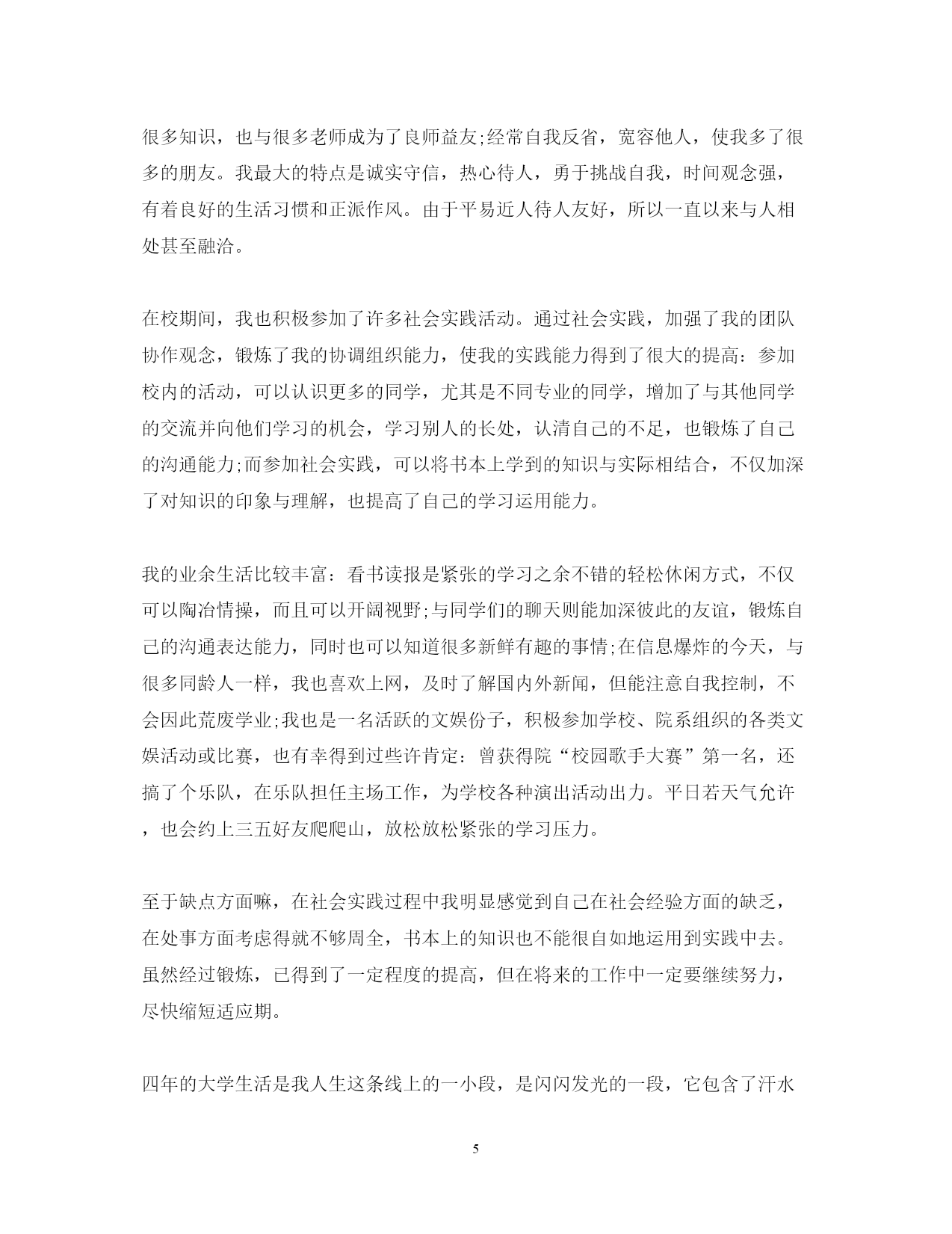此资料由网络收集而来,如有侵权请告知上传者立即删除。资料共分享,我们负责传递知识。PAGEPAGE6毕业登记表中的自我鉴定大学几年的生活即将要结束,在这几年的时间里你到底收获了些什么呢?下面由本小编精心整理的毕业登记表中的自我鉴定,希望可以帮到你哦!毕业登记表中的自我鉴定篇一大学与原来最大的不同就是远离了父母。在生活上,原来父母包管了一切,现在只能自己一切都靠自己,还好,我基本上都可以和同学们友好相处,和睦共处,互帮互爱,自己的事情自己做,形成独立自理自立的良好品德。宿舍是一个大集体,六个人生活在同一个空间里面,但是各自的生活习性都不相,这就需要大家互相理解和迁就,只有这样才能和好相处,为我们的学习创造一个良好的学习和休息环境。还没进入大学之前,哥哥姐姐们就告诉我,大学,就是一个小社会,通过大学,不仅要学习课本上的知识,也要培养个人的能力与素质,参加多项活动,在学院的篮球赛、乒乓球赛、跳绳比赛、辩论赛等活动中担任计分员,自己也参加了跳绳比赛、知识竞赛、书画摄影竞赛等,在这些活动中锻炼了自己的能力与品质,丰富了课余生活,在学院举办的职业生涯规划大赛中取得了不错的成绩,对自己的职业以及人生也做了一次深入的思考,收获颇为丰富。同时,我主动参加了一些学生工作,在这些工作岗位上找出自己的不足,发现与别人的差距,渐渐培养自己接人待物的能力。每一个人都想有一个更好的前程,所以每一个人都想在大学中充分找到锻炼自己的机会,竞争与合作,一个不变的主题,让我明白自己的路还很长,从高中校园走出来的我还不够成熟,看看自己这一学期的工作,是完成了,没错,但从中也应该发现,做人做事是一门极深的学问,不仅要完成好工作任务,体现个人价值,还要展示当代大学生的青春风采,并逐渐成为能够担当重任的青年。我记得参加过的社团活动,用自身的体验告诉我团结合作的重要性,当把十几二十几个人聚在一起的时候,如果只是各自为阵,谁都不知道还能完成什么任务。一个人的力量毕竟是有限的,无论是现实还是虚幻中,那种能够力挽狂澜的英雄,除了自身英勇的气魄之外,一定少不了他人的鼎力相助。现在社会提倡的是团队精神,只有在自己的工作中恰如其分的与他人合作,才会有有事半功倍的效果。学生会打开的是另外一扇门,一扇真实世界的门,与人交流,不能等着别人来找你,而是要找到恰当渠道,先将自己介绍出去。那些为学生服务的工作,其实也是在为自己服务,为自己积累宝贵的经验,寻找这个世界的钥匙。大学里将会有越来越多的青年一代,这些迈入大学校园,将会接受大学的洗礼,接受文化的熏陶,接受人生价值的又一次升华,与此同时,也能为大学带来新的、勃勃的生气。作为一个幸运的80后,我也庆幸自己能够参与其中,大学生活不能说漫长,但至少还有时间,还有能让我们再细细体验的余地。在以后的学习生活中,我将努力保持并发扬自己的优点,改正不足,勤奋刻苦的完成自己的课程,积极帮助周围的同学,与他们一起进步;在工作中认真踏实,事先做好计划,周全的考虑问题,争取使自己更加完善,更能展现新时代大学生的精神面貌与英姿。如今,眼看着毕业的日期日日临近,不管是继续深造还是步入社会,我们将迎来新的起点,回望过去的岁月,有着不尽的感慨。大学四年,带着我们一步一步地从校园走向社会,它让我们不管是在身体还是心理上都更加成熟,也让我们懂得了珍惜,珍惜过去的岁月,珍惜青春,珍惜我们共同拥有的日子。四年的时光,不仅仅是教授了我们专业知识,也传授了更多的做人的道理;四年时光,已在我们心中留下了不可磨灭的印象,它为我们今后的生活道路指明了方向,也在我们心中树立了做人的航标。若干年后,当我们再聚首,感慨岁月的同时,我们仍旧会说:青春无悔!毕业登记表中的自我鉴定篇二岁月如梭,四年的大学生活即将结束。从刚跨入校园时的失落和迷茫,到现在即将走上工作岗位的从容、坦然。我知道,这又是我们人生中的一大挑战,角色的转换。这除了有较强的适应力和乐观的生活态度外,更重要的是得益于大学四年的学习积累和技能的培养。在校园生涯和社会实践生活中我不断的挑战自我、充实自己,为实现我的人生价值打下坚实的基础。在老师的教诲和同学们的帮助下,我的综合素质在很大的程度上得到了提升,努力将自己塑造成为一个专业功底扎实、知识结构完善、适应能力强、具有团体协作精神的青年。在思想品德上:积极参加学院及班上组织的思想政治学习活动,不断提高自身的政治素质。本人有良好的道德修养,坚定的政治方向。品行关系到能否形成正确的人生观和世界观,所以我很注重自己的品行,坚持着自我反省且努力完善自己的人格,所以无论在什么情况下,都以品德至上来要求自己,严于律己,友爱同学,乐于助人。在学习方面上,我有很强的进取心,能按照学校的有关规定,利用业余时间自学各门课程,按时完成各项作业。我觉得大学生的首