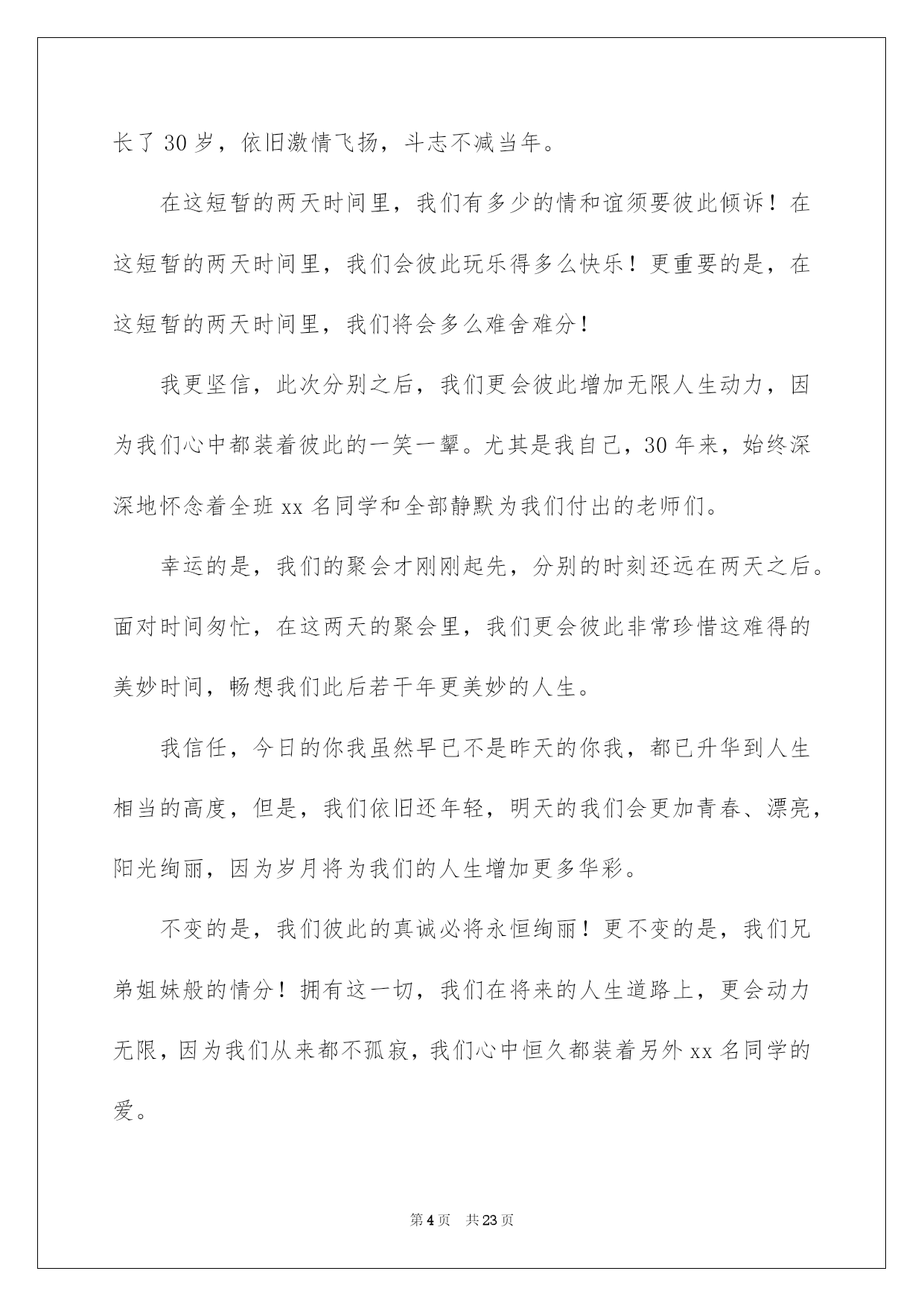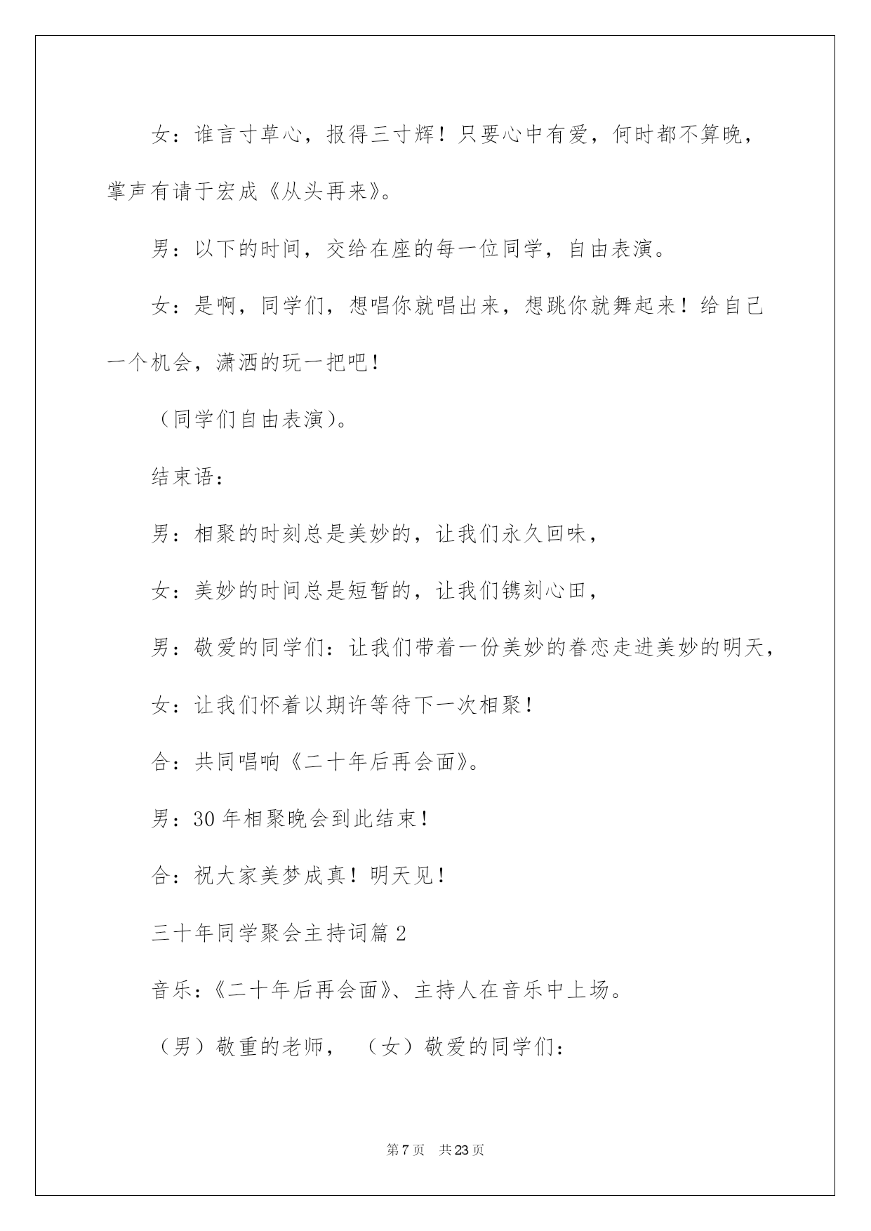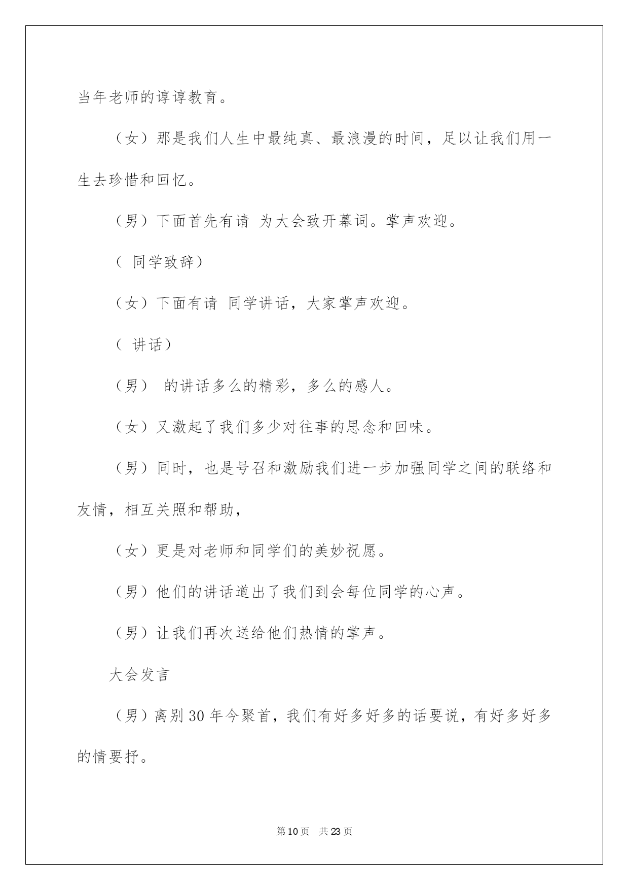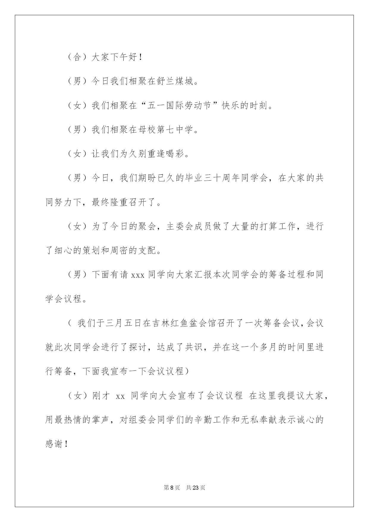 第PAGE\*Arabic\*MERGEFORMAT23页共NUMPAGES\*Arabic\*MERGEFORMAT23页第PAGE\*MERGEFORMAT23页共NUMPAGES\*MERGEFORMAT23页第PAGE\*MERGEFORMAT23页共NUMPAGES\*MERGEFORMAT23页第PAGE\*MERGEFORMAT23页共NUMPAGES\*MERGEFORMAT23页第PAGE\*MERGEFORMAT23页共NUMPAGES\*MERGEFORMAT23页第PAGE\*MERGEFORMAT23页共NUMPAGES\*MERGEFORMAT23页第PAGE\*MERGEFORMAT23页共NUMPAGES\*MERGEFORMAT23页第PAGE\*MERGEFORMAT23页共NUMPAGES\*MERGEFORMAT23页第PAGE\*MERGEFORMAT23页共NUMPAGES\*MERGEFORMAT23页第PAGE\*MERGEFORMAT23页共NUMPAGES\*MERGEFORMAT23页第PAGE\*MERGEFORMAT23页共NUMPAGES\*MERGEFORMAT23页2022十年聚会主持词十年聚会主持词范文集锦6篇活动对象的不同,主持词的写作风格也会大不一样。在一步步向前发展的社会中,越来越多的活动集会都要用到主持人,一般我们都会做好相关打算的,以下是我整理的十年聚会主持词6篇,仅供参考,大家一起来看看吧。十年聚会主持词篇1敬重的老师,敬爱的同学们:大家晚上好!我是xx。十年前,我们怀揣着同一个幻想,齐聚高校,从今情结同窗;十年后的今日,我们会面在xx,又是为了追忆这份同学情。此时此刻,我特别的激烈。几年的同窗生活,度过了人生那段最纯净、最浪漫的时间。当时我们所做的一切,无论是对还是错,现在想起来都是那么的美妙、亲切,这是一种记忆,也是一种财宝,足以让我们一生去倍加珍惜。在老师的细心培育下,我们不仅收获了学业,更收获了真挚、纯净的友情。今日我们很荣幸的请来了老师参与我们的聚会。在此,我仅代表全体同学向细心培育我们的老师真诚地道一声:老师,您辛苦了,感谢你们!祝你们工作顺当,身体健康,家庭华蜜,万事如意!为了表达我们全体同学对老师的思念和感谢,让我们用最热情的掌声有请老师们上台。敬重的老师,请接受我们最真诚的祝愿和感谢!在今日这个难忘的日子里,请我们的每位恩师再给我们上一节人生之课,有请老师!老师的希望更加坚决了我们的奋斗目标,让我们牢记老师的嘱托,在今后的工作上接着努力,取得更为优异的成果。酒会起先下面,我们的酒会正式起先,有请班长同学致祝酒词。(致祝酒词)多么美妙的祝福啊,他仿佛又把我们拉回到了10年前的高校时代,又激起了我们多少对往事的思念和回味。现在请大家举起酒杯吧!让我们为敬重的各位老师,为我们可爱的各位同学,也为今日难得的聚会,一起干杯!(同学谈话,同学嬉戏)通过今日的聚会,我们更加坚信:无论岁月如何变更,不变的是我们彼此之间恒久纯真的同学情意,希望大家今后彼此之间常联系多沟通,我想这才是我们组织这次同学会的真正意义!有起先就有结束,总要有说再见的时候,我希望在大家的共同努力下,使同学会拥有真诚和和善,拥有激情和奉献,拥有宽容和接纳,拥有我们共同憧憬的一片安静的天空!由于时间和阅历不足等种种缘由,我们的这次同学会还有很多不尽人意的地方,希望大家能赐予程度的理解和支持,最终,为了大家的再次重逢,请大家共同举杯,共唱同一首歌!干杯!十年聚会主持词篇2敬重的老师,敬爱的同学们:大家好!不知不觉中,我们离别母校已经整整30年了。30年中虽然我们各奔东西,依旧经常思念着高校四年朝夕相处的老师和同学。30年后的今日,我们在母校团聚一堂,共同迎接重逢的喜悦,这是我们期盼已久的。曾经的我们青春年少,意气奋勉,志向远大,今日的我们虽然年长了30岁,依旧激情飞扬,斗志不减当年。在这短暂的两天时间里,我们有多少的情和谊须要彼此倾诉!在这短暂的两天时间里,我们会彼此玩乐得多么快乐!更重要的是,在这短暂的两天时间里,我们将会多么难舍难分!我更坚信,此次分别之后,我们更会彼此增加无限人生动力,因为我们心中都装着彼此的一笑一颦。尤其是我自己,30年来,始终深深地怀念着全班xx名同学和全部静默为我们付出的老师们。幸运的是,我们的聚会才刚刚起先,分别的时刻还远在两天之后。面对时间匆忙,在这两天的聚会里,我们更会彼此非常珍惜这难得的美妙时间,畅想我们此后若干年更美妙的人生。我信任,今日的你我虽然早已不是昨天的你我,都已升华到人生相当的高