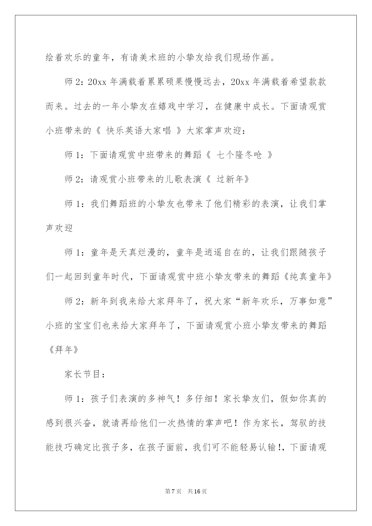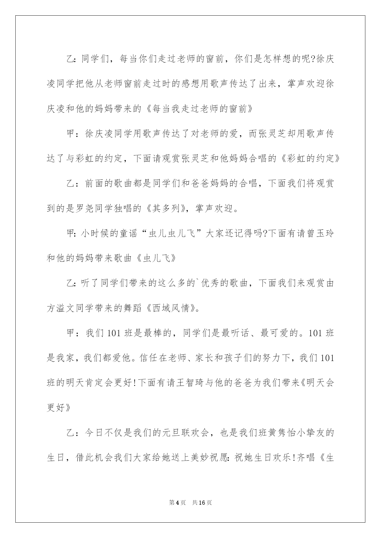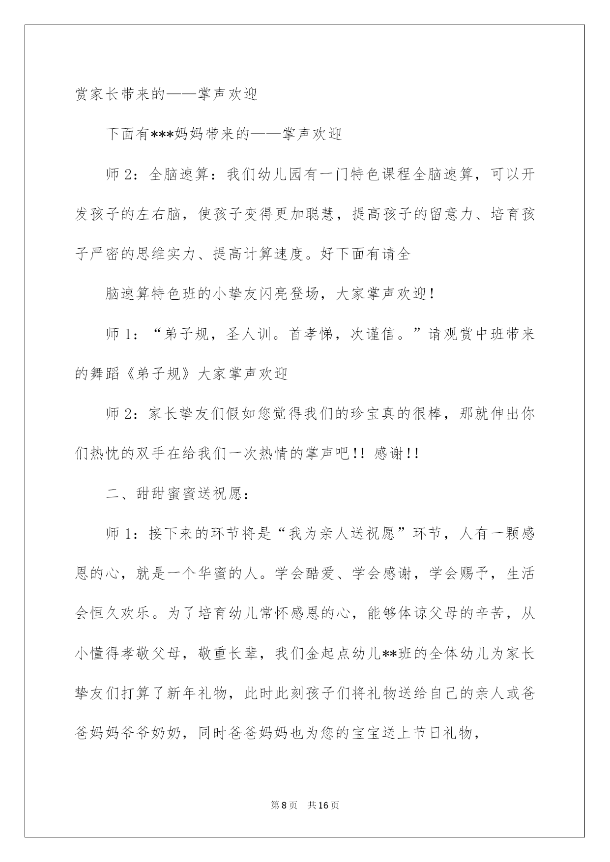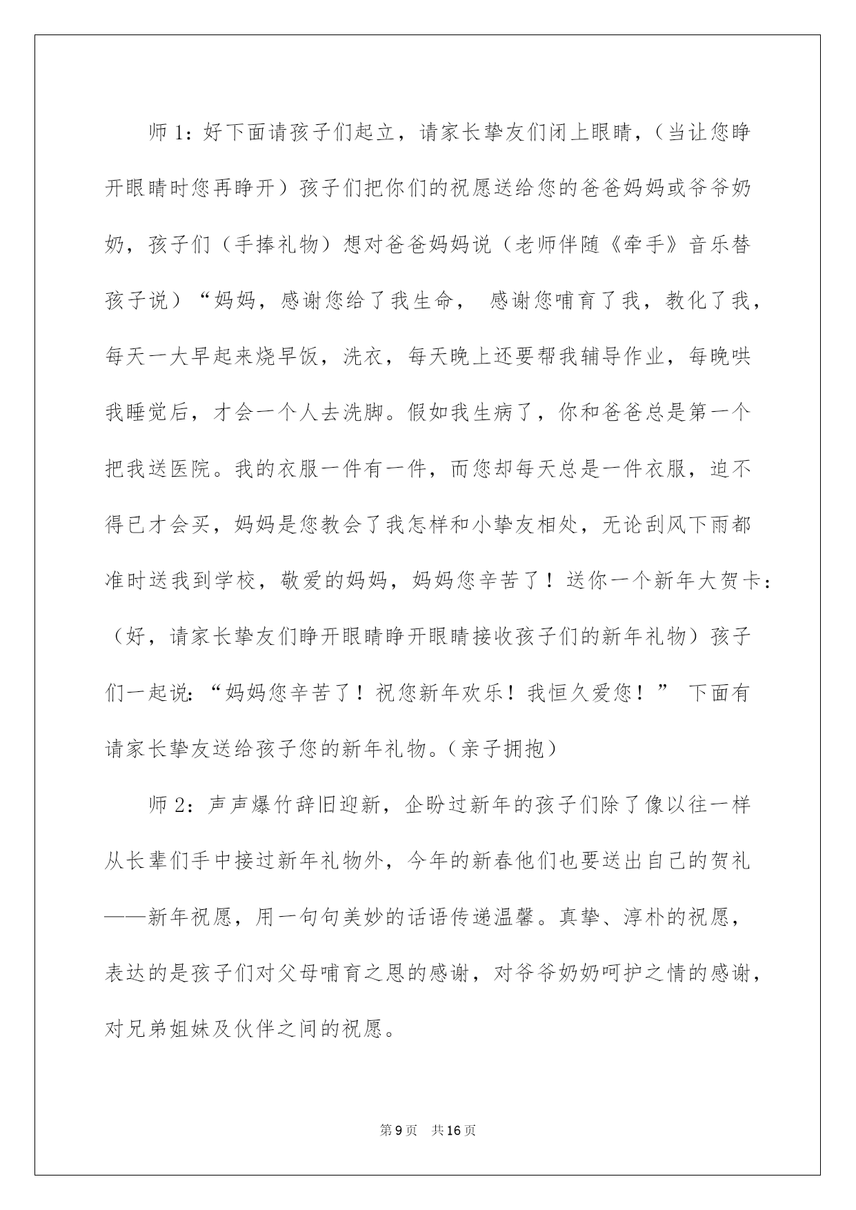 第PAGE\*Arabic\*MERGEFORMAT16页共NUMPAGES\*Arabic\*MERGEFORMAT16页第PAGE\*MERGEFORMAT16页共NUMPAGES\*MERGEFORMAT16页第PAGE\*MERGEFORMAT16页共NUMPAGES\*MERGEFORMAT16页第PAGE\*MERGEFORMAT16页共NUMPAGES\*MERGEFORMAT16页第PAGE\*MERGEFORMAT16页共NUMPAGES\*MERGEFORMAT16页第PAGE\*MERGEFORMAT16页共NUMPAGES\*MERGEFORMAT16页第PAGE\*MERGEFORMAT16页共NUMPAGES\*MERGEFORMAT16页第PAGE\*MERGEFORMAT16页共NUMPAGES\*MERGEFORMAT16页第PAGE\*MERGEFORMAT16页共NUMPAGES\*MERGEFORMAT16页第PAGE\*MERGEFORMAT16页共NUMPAGES\*MERGEFORMAT16页第PAGE\*MERGEFORMAT16页共NUMPAGES\*MERGEFORMAT16页2022元旦主持词关于元旦主持词3篇主持词要留意活动对象,针对活动对象写相应的主持词。随着中国在不断地进步,主持词与我们不再生疏,一起来参考主持词是怎么写的吧,以下是我为大家收集的元旦主持词3篇,仅供参考,希望能够帮助到大家。元旦主持词篇1甲:新年的钟声即将敲响,伴随着冬日里暖和的阳光,满怀着喜悦的心情,20xx年元旦正向我们走近。乙:新年表示我们又长大了一岁甲:新年给了我们欢乐的生活乙:新年让我们留下美妙的回忆甲:新年给了我们新的目标乙:在这一刻,我们已经感受到了春的气息甲:今日,我们相聚在这里,享受这美妙时间乙:今日,我们相聚在这里,一起专心暖和你我甲:我们载歌载舞乙:我们激情满怀甲:今日,我们送去我们的祝愿合让我们一起来庆贺欢乐的节日,我们20xx年元旦联欢会现在起先节目串词乙:首先有请的刘可清小挚友为大家带来歌曲《一闪一闪亮晶晶》甲:刘可清的歌声真是奇妙啊,下面有请曾宇辰同学与他的妈妈为我们带来歌曲《荷塘月色》乙:我们都是爸爸妈妈,爷爷奶奶的天使,而吴思懿同学是我们大家的天使,下面就有请吴思懿同学为我们带来舞蹈《Angle》甲:观赏了漂亮的天使舞蹈,我们来让高舒翔同学给我们讲个故事吧!有请他们为我们带来《小青蛙打狼》的故事。乙:大家喜爱看魔术吗?下面有请曹中烨和他的妈妈给我们带来精彩的魔术表演。甲:看完了精彩的魔术表演,我们来观赏彭曦瑞同学的拉丁舞表演,掌声欢迎。乙:每个人都幻想着有一双可以自由翱翔的翅膀,下面请观赏由缪子玉同学和他妈妈带来的歌曲《隐形的翅膀》甲:同学们喜爱小乌龟吗?那下面就有请吴佳蕊和他的爸爸给我们讲一个聪慧的小乌龟的故事。乙:前面我们的吴思懿同学给我们带来了较为温柔的舞蹈,现在有请我们的向星霖同学为我们带来街舞。甲:我们不能只载歌载舞,现在我们来猜猜谜语,有请我们的王奕铭同学和他的妈妈来给我们大家出个谜语。乙:大家都知道我们的龚成熙同学在跆拳道方面是很优秀的,下面就有请他来给我们表演一段跆拳道,大家掌声欢迎。甲:下面有请黄隽怡同学给大家带来一首英文歌曲。大家掌声欢迎。乙:就接下来要上场的是我们的李科颖同学和他的妈妈合唱一首《花仙子之歌》甲:我发觉同学们都喜爱讲故事,前面讲了关于青蛙、狼、乌龟的故事。下面我们的梅鲁卓同学给大家讲一个关于小猪的故事,大家掌声有请。乙:同学们,每当你们走过老师的窗前,你们是怎样想的呢?徐庆凌同学把他从老师窗前走过时的感想用歌声传达了出来,掌声欢迎徐庆凌和他的妈妈带来的《每当我走过老师的窗前》甲:徐庆凌同学用歌声传达了对老师的爱,而张灵芝却用歌声传达了与彩虹的约定,下面请观赏张灵芝和他妈妈合唱的《彩虹的约定》乙:前面的歌曲都是同学们和爸爸妈妈的合唱,下面我们将观赏到的是罗尧同学独唱的《其多列》,掌声欢迎。甲:小时候的童谣“虫儿虫儿飞”大家还记得吗?下面有请曾玉玲和他的妈妈带来歌曲《虫儿飞》乙:听了同学们带来的这么多的`优秀的歌曲,下面我们来观赏由方溢文同学带来的舞蹈《西域风情》。甲:我们101班是最棒的,同学们是最听话、最可爱的。101班是我家,我们都爱他。信任在老师、家长和孩子们的努力下,我们101班的明天肯定会更好!下面有请王智琦与他的爸爸为我们带来《明天会更好》乙:今日不仅是我们的元旦联欢会,也是我们班黄隽怡小挚友的生日,借此机会我们大家给她送上美妙祝愿:祝她生日欢乐!齐唱《生日歌》甲乙: