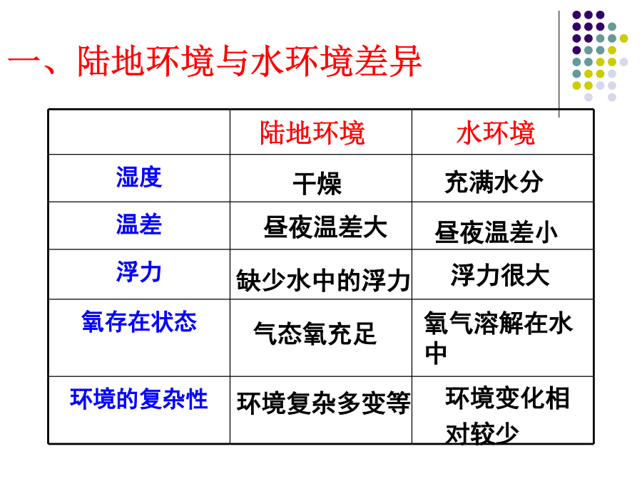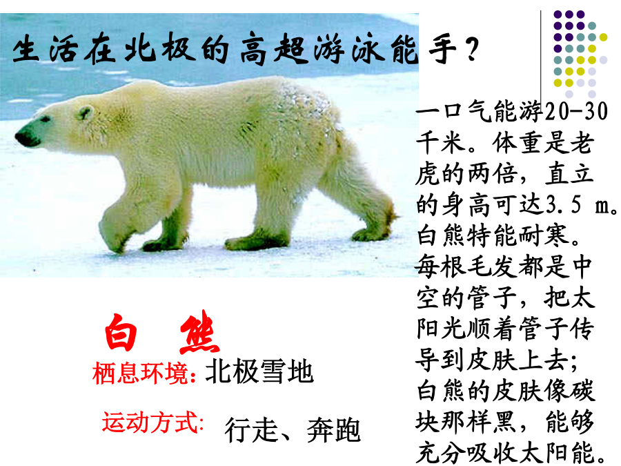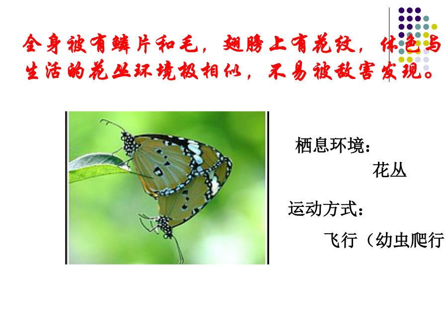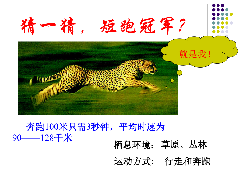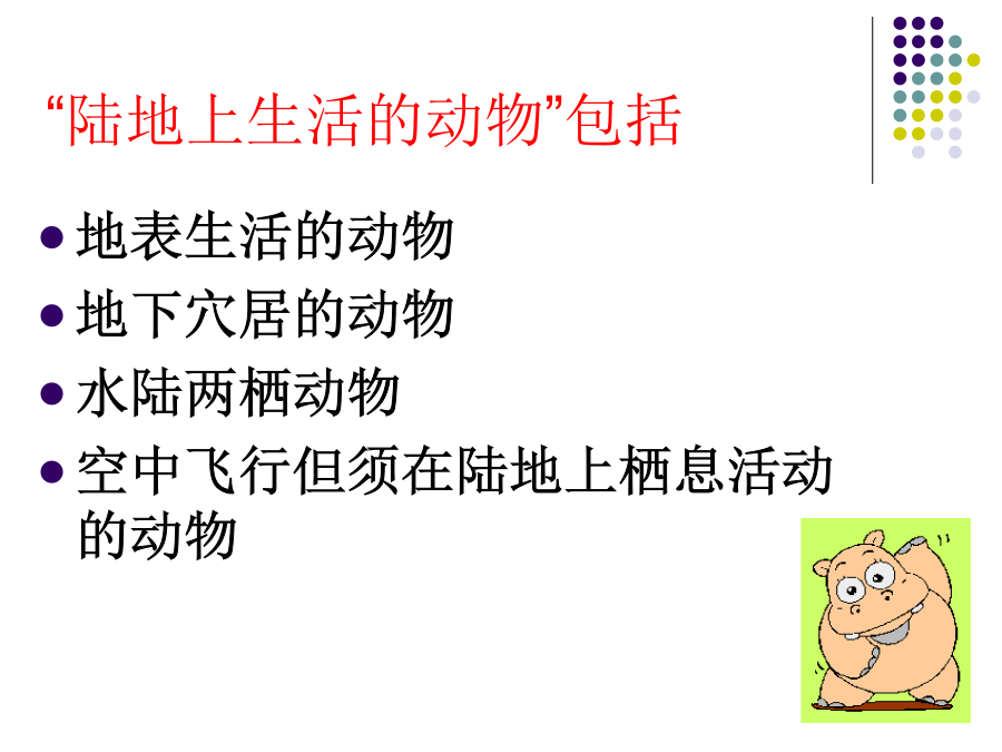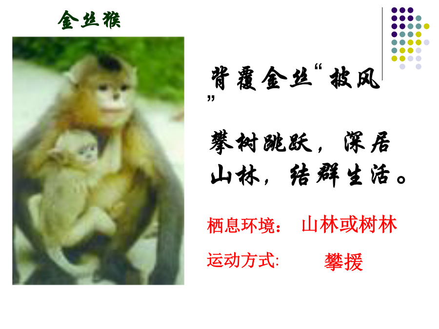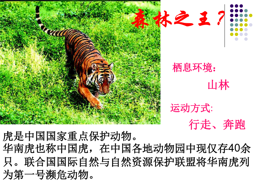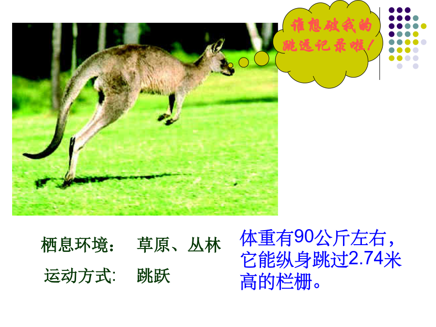 第二节陆地生活的动物金丝猴猜一猜,短跑冠军?白熊一种被引为“高雅,长寿”的象征的珍贵涉禽?全身被有鳞片和毛,翅膀上有花纹,体色与生活的花丛环境极相似,不易被敌害发现。栖息环境:地表生活的动物地下穴居的动物水陆两栖动物空中飞行但须在陆地上栖息活动的动物陆地环境动物对环境的适应具有角质的鳞或甲具有外骨骼支持躯体和运动的器官具有能在空气中呼吸的器官体形:身体:体表:腹面:1、蚯蚓生活在富含腐殖质的湿润的土壤中。通过肌肉各刚毛的配合使身体蠕动,昼伏夜出,以植物的枯叶朽根和其他有机物为食。蚯蚓大家知道蚯蚓有什么益处?1、蚯蚓的呼吸靠湿润的来完成。空气中的氧气渗进体壁里的,由它带给身体各细胞。为了保证蚯蚓的呼吸作用,课堂实验中,要经常用轻擦蚯蚓体表,使体表保持湿润。2做实验时,区别蚯蚓前端和后端的主要依据是蚯蚓的。3蚯蚓在干燥的灰尘里和沙里,很快会死去,是因为。4夏天的雨后,常有一些蚯蚓爬出地面,这是因为。5蚯蚓刚毛的作用是。6蚯蚓的运动方式是。7、蚯蚓体表的黏液与哪种生理活动有关?()。8、蚯蚓在土壤中穴居生活,使土壤变得疏松,这有利于农作物()。9、蚯蚓属于哪一个动物门类?()10、蚯蚓与人类关系非常密切:四、兔家兔的身体结构特点二、体腔内有膈1、观察家兔内脏图2、看图练习(1)该图表示家兔()的运动与()的关系。(2)A兔的膈向()运动。使得胸腔容积(),迫使肺()完成()动作。(3)B兔的膈向()运动,使得胸腔容积(),迫使肺(),完成()动作2、总结:家兔消化系统与食草生活相适应的结构特点:五、神经系统包括脑、脊髓、神经,大脑发达。兔子的形态结构和生理功能七、哺乳纲的特征:体表(),牙齿有()、()和()的分化;体腔内有();用()呼吸;心脏();体温();大脑();()、()。恒温动物:可以通过自身的调节而维持体温恒定的动物。变温动物:体温会随周围环境的变化而变化的动物。六、动物栖息地的保护1、兔是恒温动物,下列各项描述中与此无直接关系的是A兔的体毛光滑柔软,具有保温作用B兔的心脏有四腔,血液循环分为体循环和肺循环,血液输送氧气的能力强C兔完全靠肺完成呼吸,气体交换能力强D兔具有发达的盲肠,消化植物纤维能力强2、与家兔食草的特性无关的是A体表被毛B盲肠发达C门齿发达D胃肠内有能分解纤维素的细菌3、下表是某同学对9种动物做出的简单分类,你认为他的分类依据是A水生还是陆生B成体内有无脊柱C体温是否恒定D胎生还是卵生4、小明在做“探究蚯蚓生活习性”的实验时,把刚从土里挖出的蚯蚓洗干净后放在干燥的纸盒里,结果第二天做实验时发现蚯蚓全死了,请你分析蚯蚓死亡的原因A体表干燥,无法呼吸B纸盒里缺少空气C纸盒里缺少食物D纸盒里缺少空气、食物