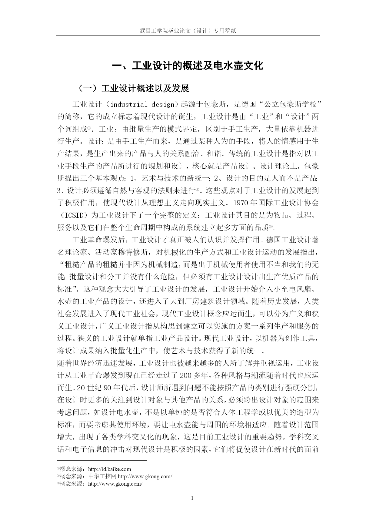 PAGE本科毕业论文(设计)论文题目:浅析工业设计理念在电水壶设计中的应用姓名:马晓军学号:083007010816班级:8班年级:2008级专业:艺术设计系部:艺术与设计系指导教师:丁翔完成时间:2012年4月27号武昌工学院毕业论文(设计)专用稿纸作者声明本毕业论文(设计)是在导师的指导下由本人独立撰写完成的,没有剽窃、抄袭、造假等违反道德、学术规范和其他侵权行为。对本论文(设计)的研究做出重要贡献的个人和集体,均已在文中以明确方式标明。因本毕业论文(设计)引起的法律结果完全由本人承担。毕业论文(设计)成果归武昌工学院所有。特此声明作者专业:艺术设计作者学号:083007010816作者签名:2012年4月27日浅析工业设计理念在电水壶设计中的体现马晓军AnalysisofIndustrialDesignEmbodimentofTheKettleDesignMaxiao,Jun2012年4月27日武昌工学院毕业论文(设计)专用稿纸-1-摘要21世纪以来,社会处在高速发展的阶段,物质世界日新月异,人们对于生活品质的要求也越来越高,伴随着人们需求的不断提高,起源于19世纪的工业设计也迎来了一个新的发展阶段,传统的工业设计理念已经被极大的扩展了。本文集中阐述了工业设计的产生以及发展历程、工业设计的发展现状,探讨了现代工业设计的理念及其在产品中的体现。主要围绕厨房小家电中的典型设计产品----电水壶为例进行了探讨,对现代工业设计理念在电水壶中的体现进行了实例研究,以期能让人们更清晰地、更直观的理解现代工业设计理念。本文运用了观察法、文献研究的研究方法进行了专题研究。全文分为三个部分:首先,研究了工业设计的产生以及发展历程、工业设计的现状、电水壶的文化。其次,是对现代工业设计理念所包含的要素,包括绿色设计、人性化设计、个性化设计、仿生设计的概念,进行了逐一阐述以及其在设计中的实例体现。再次,以电水壶的设计为主体,进一步体现现代工业设计理念在其设计上的应用。最后,是对未来电水壶设计进行了展望与分析。本文的主要创新体现在:一般的设计者在一味的盲目跟风设计中禁锢了设计思想,而笔者则通过展示现代设计理念来给电水壶设计提供新的设计方向。关键词:工业设计理念;电水壶设计;人性化设计;武昌工学院毕业论文(设计)专用稿纸-2-AbstractThe21stcentury,inastageofrapiddevelopment,thematerialworldwitheachpassingday,peopleareincreasinglyhighrequirementsforqualityoflife,alongwiththecontinuousimprovementofpeople'sneeds,theoriginofindustrialdesigninthe19thcenturyalsousheredinanewstageofdevelopment,thetraditionalconceptofindustrialdesignhasbeengreatlyexpanded.Thisarticlefocusesonthegenerationanddevelopmentprocessofindustrialdesign,industrialdesignofthedevelopmentstatusoftheconceptofmodernindustrialdesignproductsembody.Aroundthesmallkitchenappliancesinthetypicaldesignproducts----kettleexampleembodimentoftheconceptofmodernindustrialdesigninthekettle,thecasestudy,inordertoletpeoplemoreclearly,moreintuitiveunderstandingoftheconceptofmodernindustrialdesign.Inthispaper,observationmethod,theexamplesshowconductedaspecialstudy.Thepaperisdividedintothreeparts:First,studythegenerationanddevelopmentprocessofindustrialdesign,industrialdesignstatus,kettleculture.Secondly,thefactors