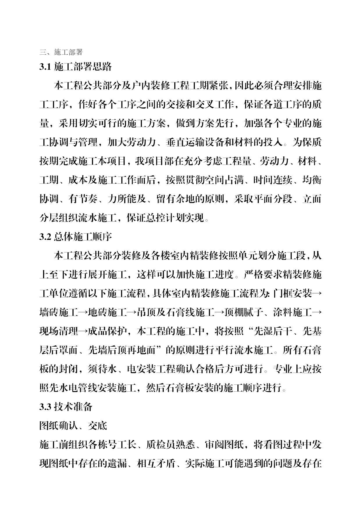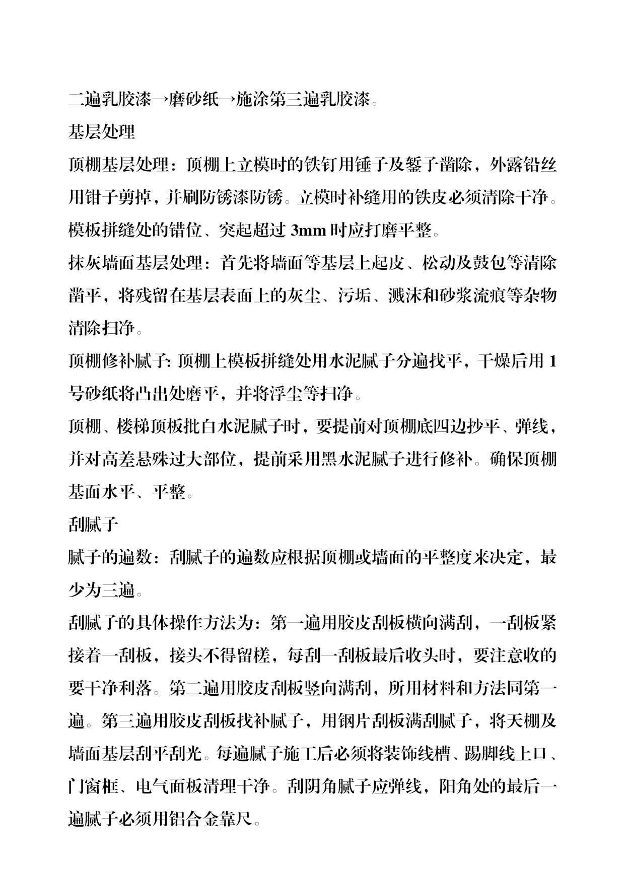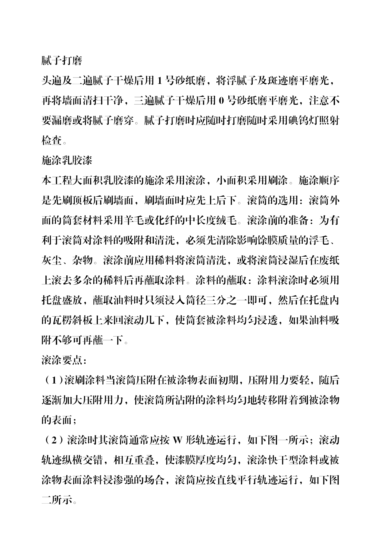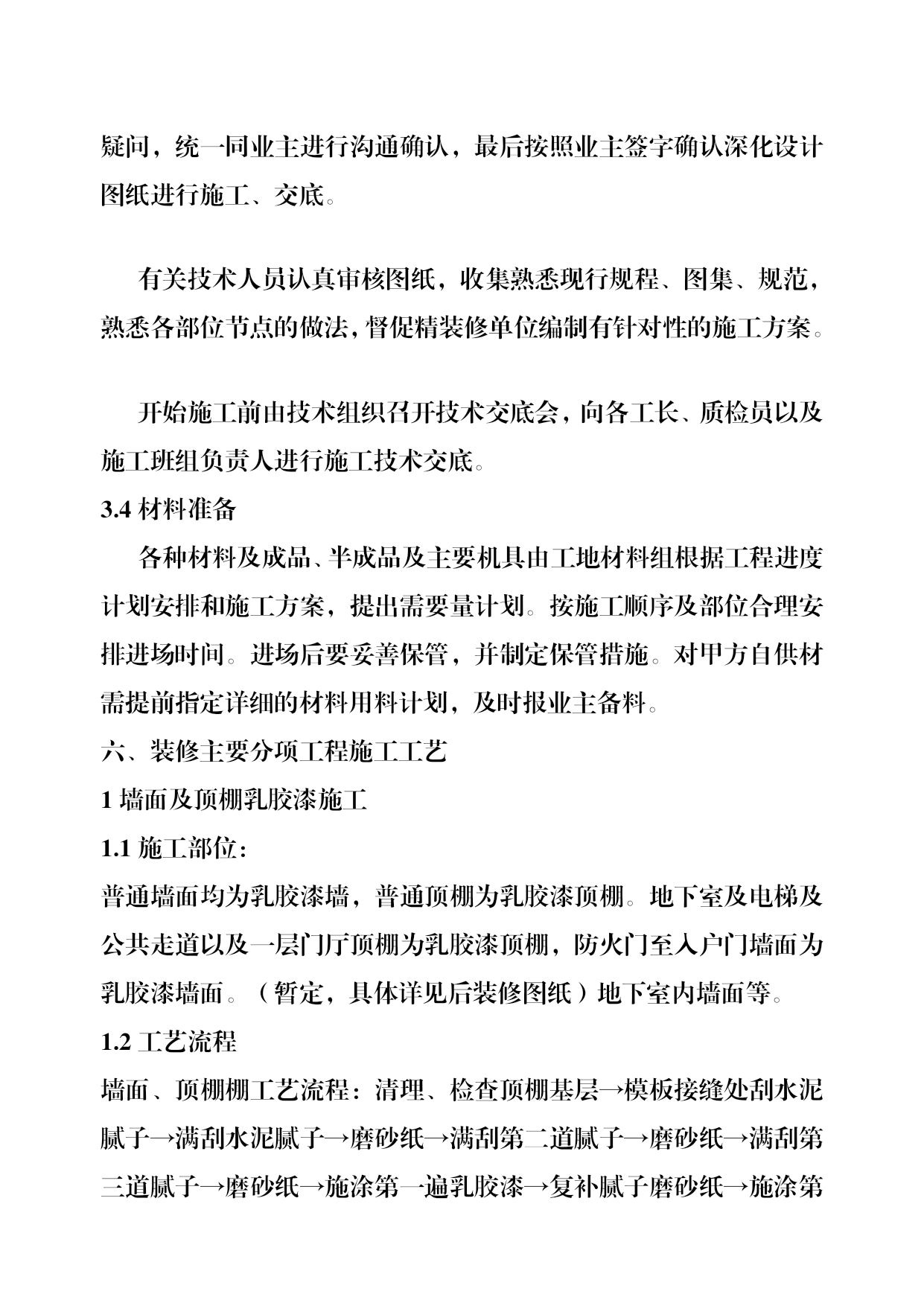 公共区域及户内精装修施工专项方案(完整版)资料(可以直接使用,可编辑优秀版资料,欢迎下载)三、施工部署3.1施工部署思路本工程公共部分及户内装修工程工期紧张,因此必须合理安排施工工序,作好各个工序之间的交接和交叉工作,保证各道工序的质量,采用切实可行的施工方案,做到方案先行,加强各个专业的施工协调与管理,加大劳动力、垂直运输设备和材料的投入。为保质按期完成施工本项目,我项目部在充分考虑工程量、劳动力、材料、工期、成本及施工工作面后,按照贯彻空间占满、时间连续、均衡协调、有节奏、力所能及、留有余地的原则,采取平面分段、立面分层组织流水施工,保证总控计划实现。3.2总体施工顺序本工程公共部分装修及各楼室内精装修按照单元划分施工段,从上至下进行展开施工,这样可以加快施工进度。严格要求精装修施工单位遵循以下施工流程,具体室内精装修施工流程为:门框安装→墙砖施工→地砖施工→吊顶及石膏线施工→顶棚腻子、涂料施工→现场清理→成品保护,本工程的施工中,将按照“先湿后干、先基层后罩面、先墙后顶再地面”的原则进行平行流水施工。所有石膏板的封闭,须待水、电安装工程确认合格后方可进行。专业上应按照先水电管线安装施工,然后石膏板安装的施工顺序进行。3.3技术准备图纸确认、交底施工前组织各栋号工长、质检员熟悉、审阅图纸,将看图过程中发现图纸中存在的遗漏、相互矛盾、实际施工可能遇到的问题及存在疑问,统一同业主进行沟通确认,最后按照业主签字确认深化设计图纸进行施工、交底。有关技术人员认真审核图纸,收集熟悉现行规程、图集、规范,熟悉各部位节点的做法,督促精装修单位编制有针对性的施工方案。开始施工前由技术组织召开技术交底会,向各工长、质检员以及施工班组负责人进行施工技术交底。3.4材料准备各种材料及成品、半成品及主要机具由工地材料组根据工程进度计划安排和施工方案,提出需要量计划。按施工顺序及部位合理安排进场时间。进场后要妥善保管,并制定保管措施。对甲方自供材需提前指定详细的材料用料计划,及时报业主备料。六、装修主要分项工程施工工艺1墙面及顶棚乳胶漆施工1.1施工部位:普通墙面均为乳胶漆墙,普通顶棚为乳胶漆顶棚。地下室及电梯及公共走道以及一层门厅顶棚为乳胶漆顶棚,防火门至入户门墙面为乳胶漆墙面。(暂定,具体详见后装修图纸)地下室内墙面等。1.2工艺流程墙面、顶棚棚工艺流程:清理、检查顶棚基层→模板接缝处刮水泥腻子→满刮水泥腻子→磨砂纸→满刮第二道腻子→磨砂纸→满刮第三道腻子→磨砂纸→施涂第一遍乳胶漆→复补腻子磨砂纸→施涂第二遍乳胶漆→磨砂纸→施涂第三遍乳胶漆。基层处理顶棚基层处理:顶棚上立模时的铁钉用锤子及錾子凿除,外露铅丝用钳子剪掉,并刷防锈漆防锈。立模时补缝用的铁皮必须清除干净。模板拼缝处的错位、突起超过3mm时应打磨平整。抹灰墙面基层处理:首先将墙面等基层上起皮、松动及鼓包等清除凿平,将残留在基层表面上的灰尘、污垢、溅沫和砂浆流痕等杂物清除扫净。顶棚修补腻子:顶棚上模板拼缝处用水泥腻子分遍找平,干燥后用1号砂纸将凸出处磨平,并将浮尘等扫净。顶棚、楼梯顶板批白水泥腻子时,要提前对顶棚底四边抄平、弹线,并对高差悬殊过大部位,提前采用黑水泥腻子进行修补。确保顶棚基面水平、平整。刮腻子腻子的遍数:刮腻子的遍数应根据顶棚或墙面的平整度来决定,最少为三遍。刮腻子的具体操作方法为:第一遍用胶皮刮板横向满刮,一刮板紧接着一刮板,接头不得留槎,每刮一刮板最后收头时,要注意收的要干净利落。第二遍用胶皮刮板竖向满刮,所用材料和方法同第一遍。第三遍用胶皮刮板找补腻子,用钢片刮板满刮腻子,将天棚及墙面基层刮平刮光。每遍腻子施工后必须将装饰线槽、踢脚线上口、门窗框、电气面板清理干净。刮阴角腻子应弹线,阳角处的最后一遍腻子必须用铝合金靠尺。腻子打磨头遍及二遍腻子干燥后用1号砂纸磨,将浮腻子及斑迹磨平磨光,再将墙面清扫干净,三遍腻子干燥后用0号砂纸磨平磨光,注意不要漏磨或将腻子磨穿。腻子打磨时应随时打磨随时采用碘钨灯照射检查。施涂乳胶漆本工程大面积乳胶漆的施涂采用滚涂,小面积采用刷涂。施涂顺序是先刷顶板后刷墙面,刷墙面时应先上后下。滚筒的选用:滚筒外面的筒套材料采用羊毛或化纤的中长度绒毛。滚涂前的准备:为有利于滚筒对涂料的吸附和清洗,必须先清除影响馀膜质量的浮毛、灰尘、杂物。滚涂前应用稀料将滚筒清洗,或将滚筒浸湿后在废纸上滚去多余的稀料后再蘸取涂料。涂料的蘸取:涂料滚涂时必须用托盘盛放,蘸取油料时只须浸入筒径三分之一即可,然后在托盘内的瓦楞斜板上来回滚动几下,使筒套被涂料均匀浸透,如果油料吸附不够可再蘸一下。滚涂要点:(1)滚刷涂料当滚筒压附在被涂物表面初期,压附用力要轻,随后逐渐加大压附用力,使滚