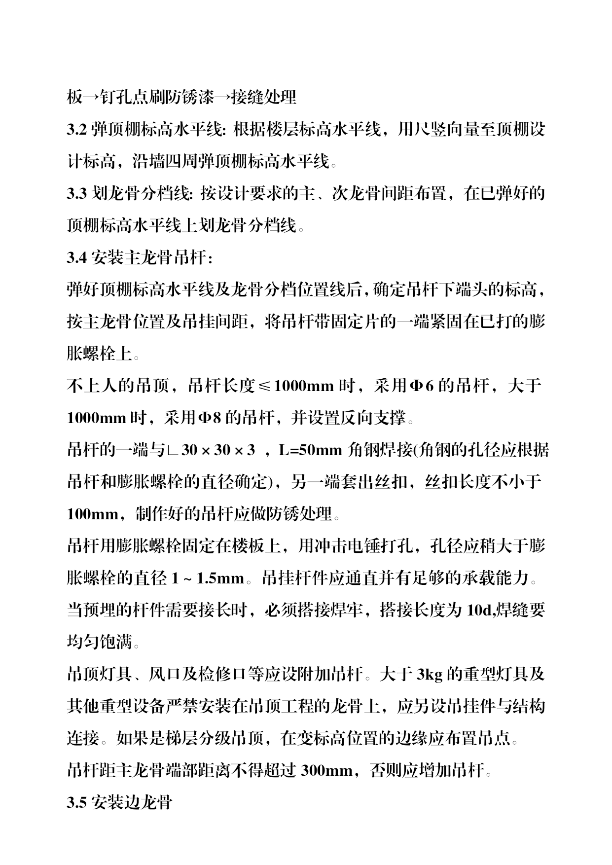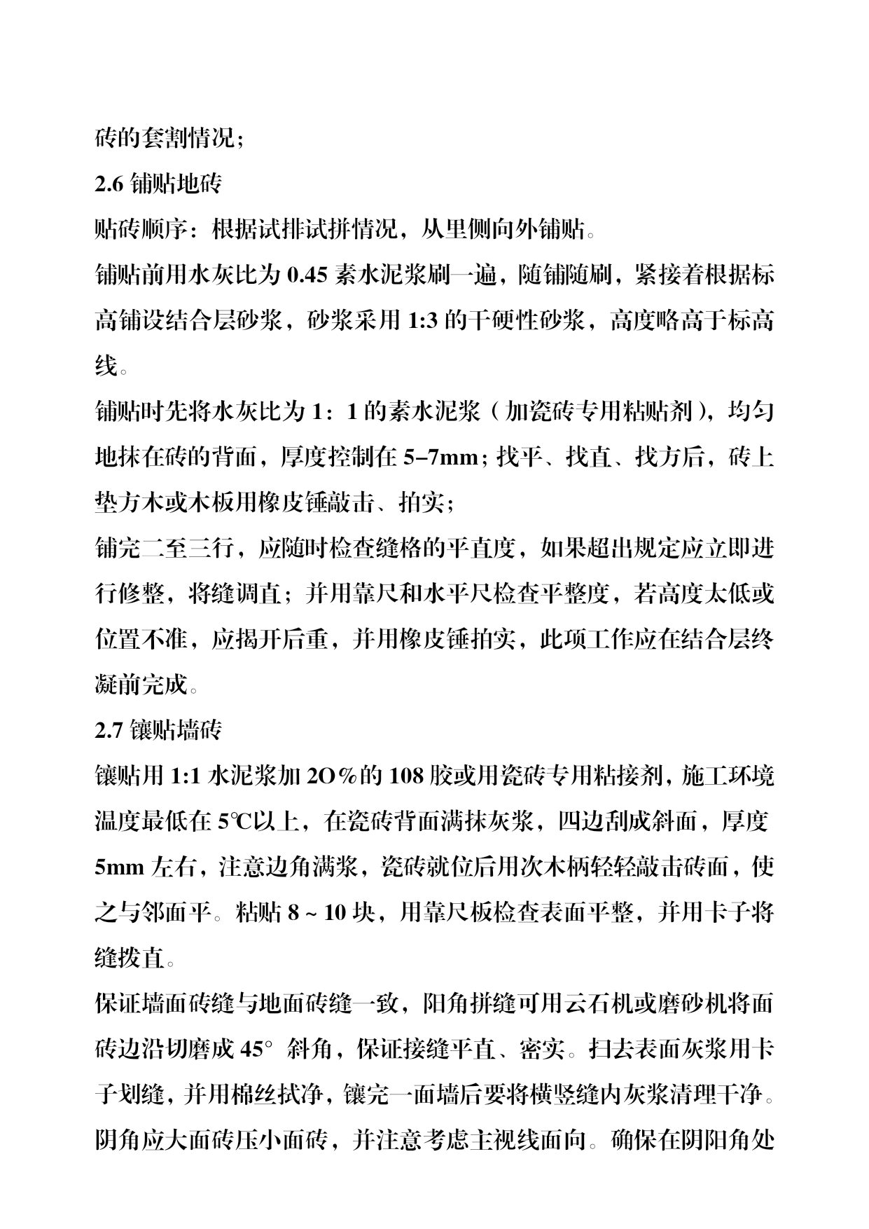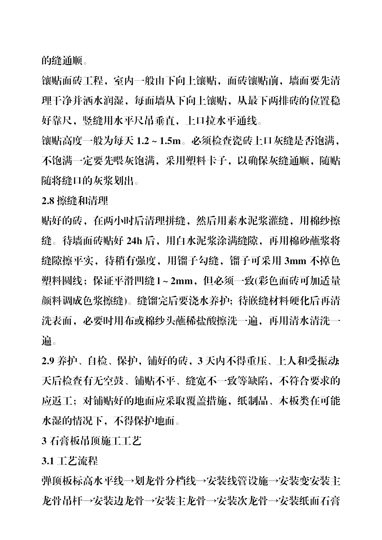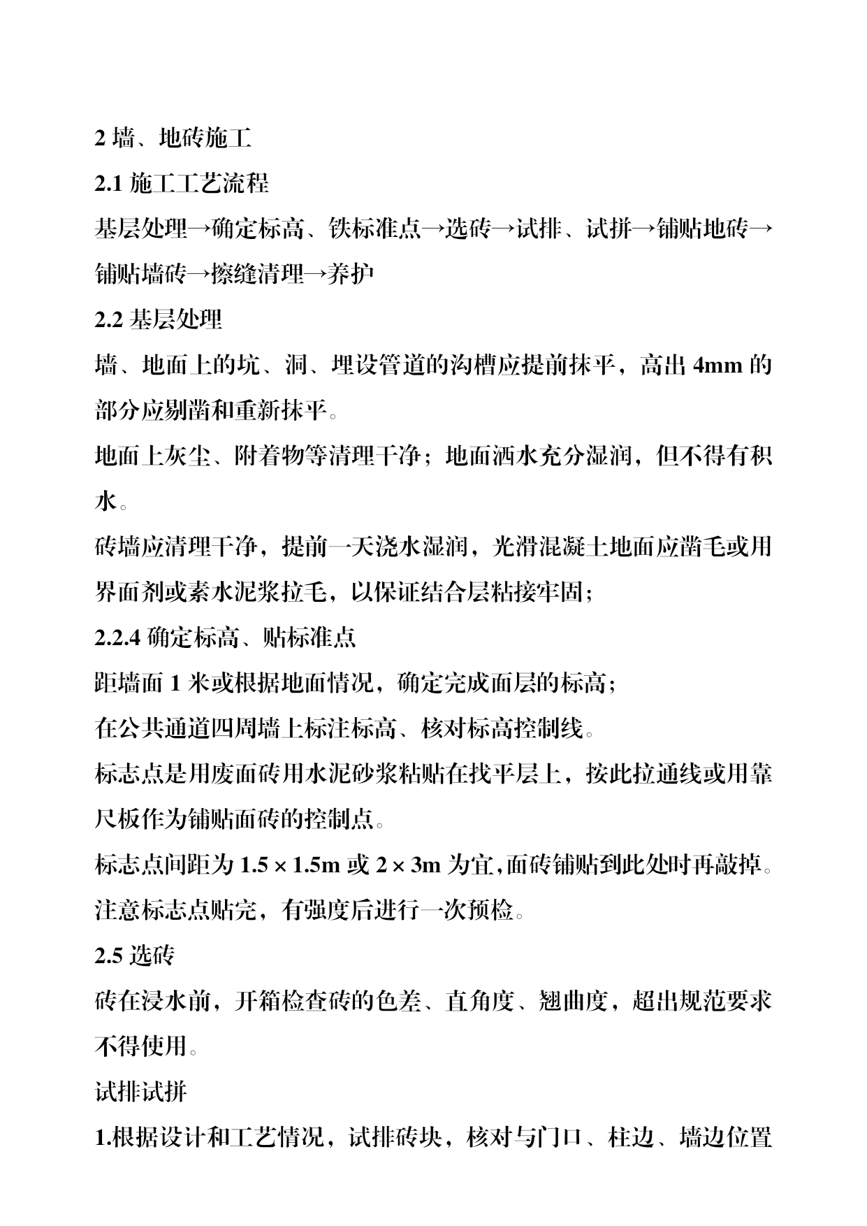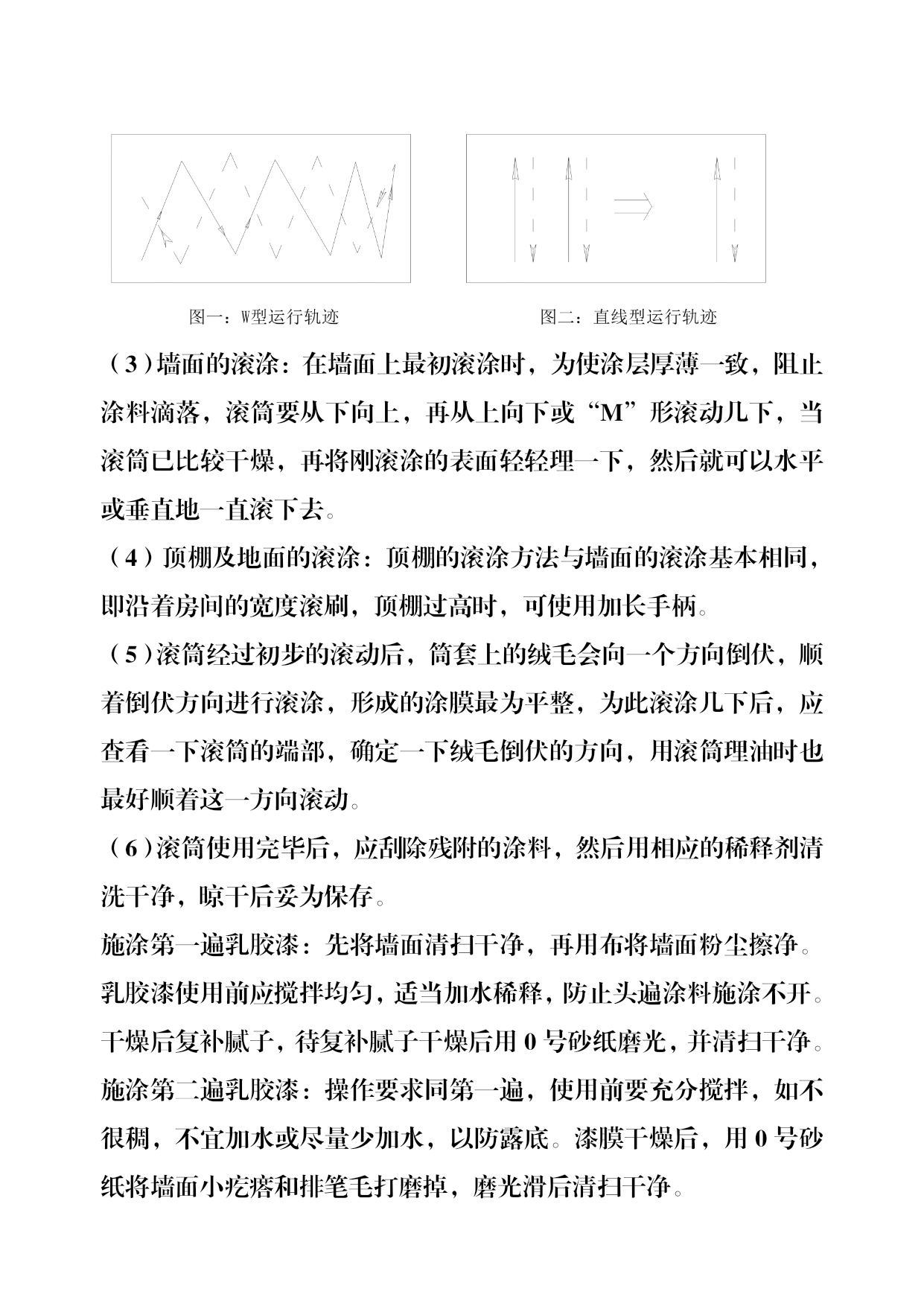 公共区域及户内精装修施工专项方案(完整版)资料(可以直接使用,可编辑优秀版资料,欢迎下载)三、施工部署3.1施工部署思路本工程公共部分及户内装修工程工期紧张,因此必须合理安排施工工序,作好各个工序之间的交接和交叉工作,保证各道工序的质量,采用切实可行的施工方案,做到方案先行,加强各个专业的施工协调与管理,加大劳动力、垂直运输设备和材料的投入。为保质按期完成施工本项目,我项目部在充分考虑工程量、劳动力、材料、工期、成本及施工工作面后,按照贯彻空间占满、时间连续、均衡协调、有节奏、力所能及、留有余地的原则,采取平面分段、立面分层组织流水施工,保证总控计划实现。3.2总体施工顺序本工程公共部分装修及各楼室内精装修按照单元划分施工段,从上至下进行展开施工,这样可以加快施工进度。严格要求精装修施工单位遵循以下施工流程,具体室内精装修施工流程为:门框安装→墙砖施工→地砖施工→吊顶及石膏线施工→顶棚腻子、涂料施工→现场清理→成品保护,本工程的施工中,将按照“先湿后干、先基层后罩面、先墙后顶再地面”的原则进行平行流水施工。所有石膏板的封闭,须待水、电安装工程确认合格后方可进行。专业上应按照先水电管线安装施工,然后石膏板安装的施工顺序进行。3.3技术准备图纸确认、交底施工前组织各栋号工长、质检员熟悉、审阅图纸,将看图过程中发现图纸中存在的遗漏、相互矛盾、实际施工可能遇到的问题及存在疑问,统一同业主进行沟通确认,最后按照业主签字确认深化设计图纸进行施工、交底。有关技术人员认真审核图纸,收集熟悉现行规程、图集、规范,熟悉各部位节点的做法,督促精装修单位编制有针对性的施工方案。开始施工前由技术组织召开技术交底会,向各工长、质检员以及施工班组负责人进行施工技术交底。3.4材料准备各种材料及成品、半成品及主要机具由工地材料组根据工程进度计划安排和施工方案,提出需要量计划。按施工顺序及部位合理安排进场时间。进场后要妥善保管,并制定保管措施。对甲方自供材需提前指定详细的材料用料计划,及时报业主备料。六、装修主要分项工程施工工艺1墙面及顶棚乳胶漆施工1.1施工部位:普通墙面均为乳胶漆墙,普通顶棚为乳胶漆顶棚。地下室及电梯及公共走道以及一层门厅顶棚为乳胶漆顶棚,防火门至入户门墙面为乳胶漆墙面。(暂定,具体详见后装修图纸)地下室内墙面等。1.2工艺流程墙面、顶棚棚工艺流程:清理、检查顶棚基层→模板接缝处刮水泥腻子→满刮水泥腻子→磨砂纸→满刮第二道腻子→磨砂纸→满刮第三道腻子→磨砂纸→施涂第一遍乳胶漆→复补腻子磨砂纸→施涂第二遍乳胶漆→磨砂纸→施涂第三遍乳胶漆。基层处理顶棚基层处理:顶棚上立模时的铁钉用锤子及錾子凿除,外露铅丝用钳子剪掉,并刷防锈漆防锈。立模时补缝用的铁皮必须清除干净。模板拼缝处的错位、突起超过3mm时应打磨平整。抹灰墙面基层处理:首先将墙面等基层上起皮、松动及鼓包等清除凿平,将残留在基层表面上的灰尘、污垢、溅沫和砂浆流痕等杂物清除扫净。顶棚修补腻子:顶棚上模板拼缝处用水泥腻子分遍找平,干燥后用1号砂纸将凸出处磨平,并将浮尘等扫净。顶棚、楼梯顶板批白水泥腻子时,要提前对顶棚底四边抄平、弹线,并对高差悬殊过大部位,提前采用黑水泥腻子进行修补。确保顶棚基面水平、平整。刮腻子腻子的遍数:刮腻子的遍数应根据顶棚或墙面的平整度来决定,最少为三遍。刮腻子的具体操作方法为:第一遍用胶皮刮板横向满刮,一刮板紧接着一刮板,接头不得留槎,每刮一刮板最后收头时,要注意收的要干净利落。第二遍用胶皮刮板竖向满刮,所用材料和方法同第一遍。第三遍用胶皮刮板找补腻子,用钢片刮板满刮腻子,将天棚及墙面基层刮平刮光。每遍腻子施工后必须将装饰线槽、踢脚线上口、门窗框、电气面板清理干净。刮阴角腻子应弹线,阳角处的最后一遍腻子必须用铝合金靠尺。腻子打磨头遍及二遍腻子干燥后用1号砂纸磨,将浮腻子及斑迹磨平磨光,再将墙面清扫干净,三遍腻子干燥后用0号砂纸磨平磨光,注意不要漏磨或将腻子磨穿。腻子打磨时应随时打磨随时采用碘钨灯照射检查。施涂乳胶漆本工程大面积乳胶漆的施涂采用滚涂,小面积采用刷涂。施涂顺序是先刷顶板后刷墙面,刷墙面时应先上后下。滚筒的选用:滚筒外面的筒套材料采用羊毛或化纤的中长度绒毛。滚涂前的准备:为有利于滚筒对涂料的吸附和清洗,必须先清除影响馀膜质量的浮毛、灰尘、杂物。滚涂前应用稀料将滚筒清洗,或将滚筒浸湿后在废纸上滚去多余的稀料后再蘸取涂料。涂料的蘸取:涂料滚涂时必须用托盘盛放,蘸取油料时只须浸入筒径三分之一即可,然后在托盘内的瓦楞斜板上来回滚动几下,使筒套被涂料均匀浸透,如果油料吸附不够可再蘸一下。滚涂要点:(1)滚刷涂料当滚筒压附在被涂物表面初期,压附用力要轻,随后逐渐加大压附用力,使滚