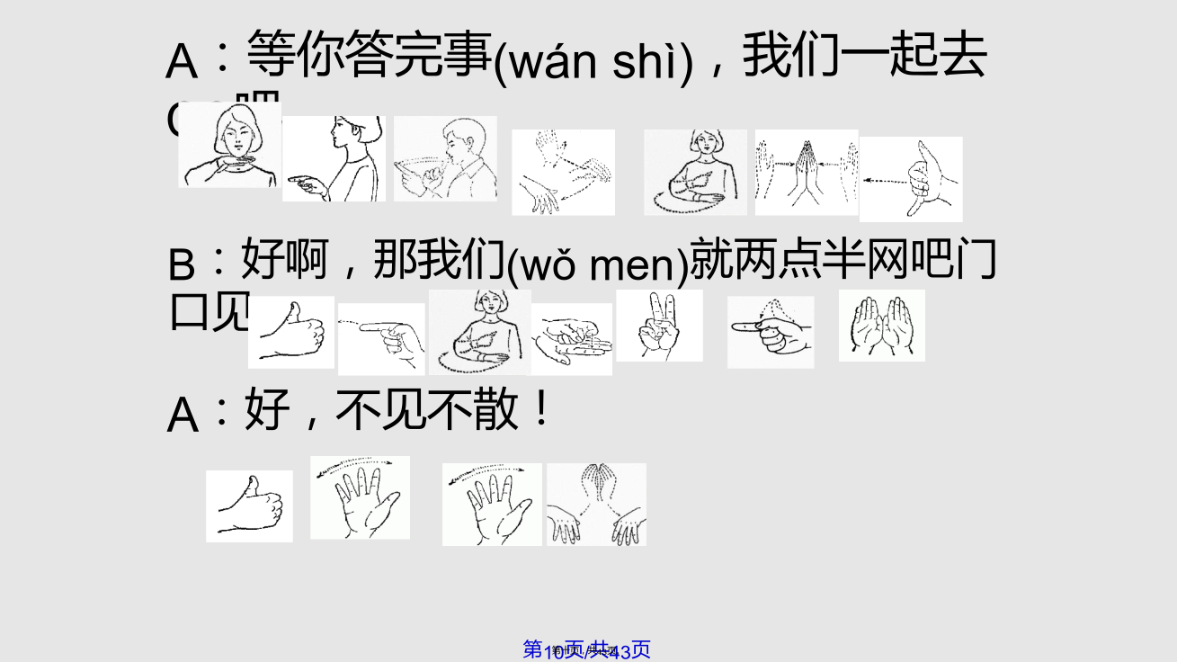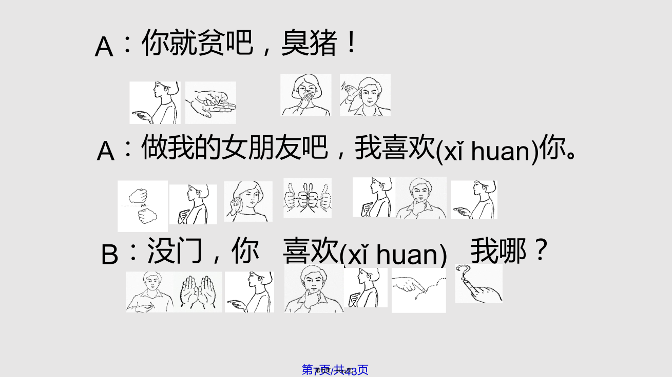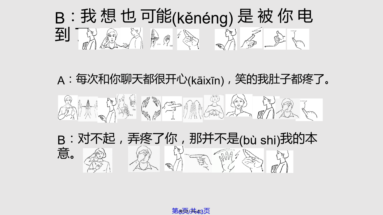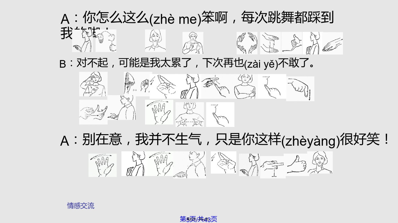 B:好主意(zhǔyi),正好我没带饭卡!A:校长(xiàozhǎng),早上好。A:我把作业忘在宿舍(sùshè)了,回去取。O:逃课A:你怎么这么(zhème)笨啊,每次跳舞都踩到我的脚!B:我想也可能(kěnéng)是被你电到了……A:你就贫吧,臭猪!A:你漂亮(piàoliàng)(丑)A:下午(xiàwǔ)有时间么?A:等你答完事(wánshì),我们一起去CS吧。B:你还是给我发信息(xìnxī)吧,万一我没来的话……A:真努力今天在自习(zìxí)到这么晚。B:你够懒!A:老大,把电视声音(shēngyīn)调小点,把灯关了,我先睡了。努力(nǔlì)A:今天的米饭(mǐfàn)可真难吃,好像煮糊了B:恩,学校(xuéxiào)里的起码干净。A:高数太难了,听说(tīnɡshuō)上届全年级,有一半都不及格。A:你今天上课怎么不是看窗外就是打瞌睡,注意力这么(zhème)不集中?B:对,嫉妒吧,今晚我们还去看夜场(yèchǎng)电影呢。A:你太厉害(lìhɑi)了!A:能不紧张(jǐnzhāng)吗?这是我第一次考四级,再不及格就拿不到毕业证了。A:吃了吗?A:你看这人,真勒特A:哟诶,你瞧他这一跤摔的,谁让他不系鞋带的。A:带伞了吗?今天(jīntiān)可能会下雨。A:慢点骑车路上小心,注意安全晚上早点回来,有什么事给家里(jiālǐ)来电话。A:怎么(zěnme)这么着急B:不行(bùxíng)啊,我把密码写卡上了!A:今天来参加(cānjiā)你姐姐婚礼的人可真多啊。A:就是我姐夫年龄大了点,都快四十了,不过还算般配,他们(tāmen)之前已经交往了快五年了。A:一双拖鞋(tuōxié)A:不是(bùshi),我新买了一辆新车,还没骑一个星期呢B:嘿,这下可让小偷(xiǎotōu)捡了个大便宜,你有没有问问保安?A:你有没有读过今天(jīntiān)的报纸?昨晚篮球、排球、射击、羽毛球、乒乓球、游泳、足球,咱们都赢了!B:我最关注(guānzhù)保龄球。A:这瓶点滴打得时间可真长,而且这药水(yàoshuǐ)还是浅色的,怪吓人的A:当然会!缺氧的话,一开始先是头疼、头晕、吐,然后身体是颤抖、流眼泪,再后来四肢(sìzhī)麻木、失去意识,直至医治无效,宣告死亡……哥哥(gēge)弟弟妹妹丈夫(zhàngfū)足够臭以前坏贫困哭活暂停(zàntínɡ)门卫水深红怕发炎(fāyán)思想感谢您的观看(guānkàn)。