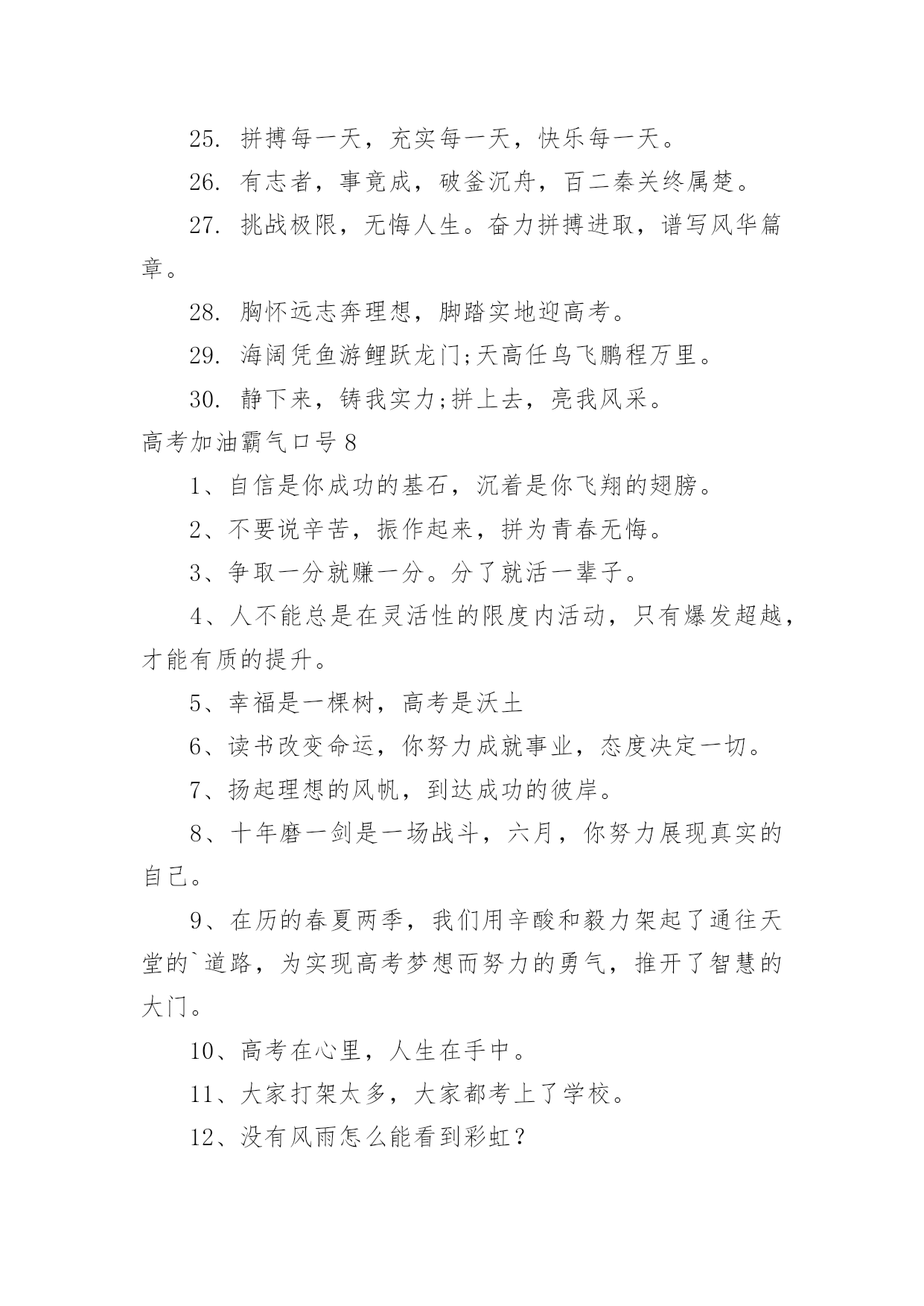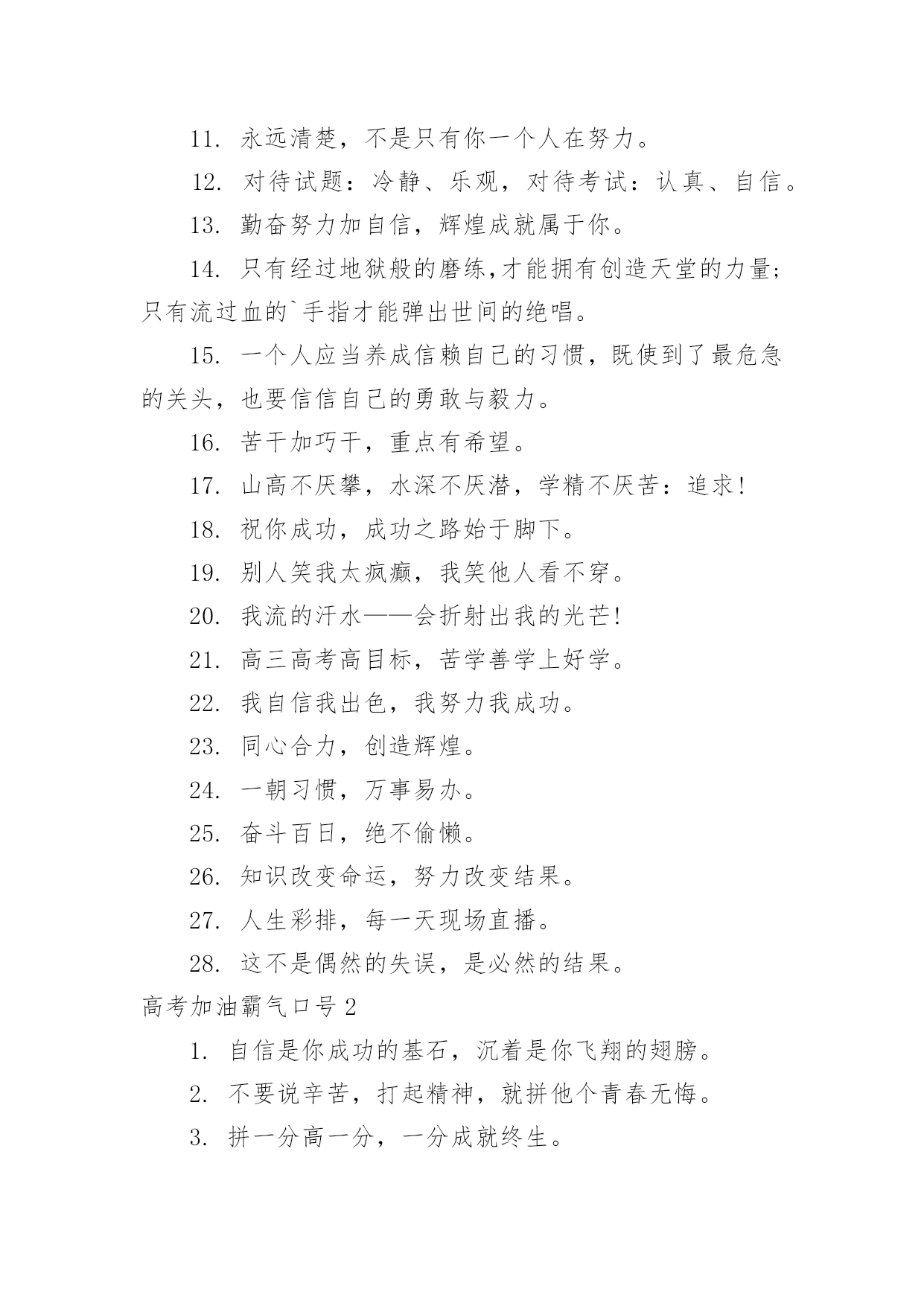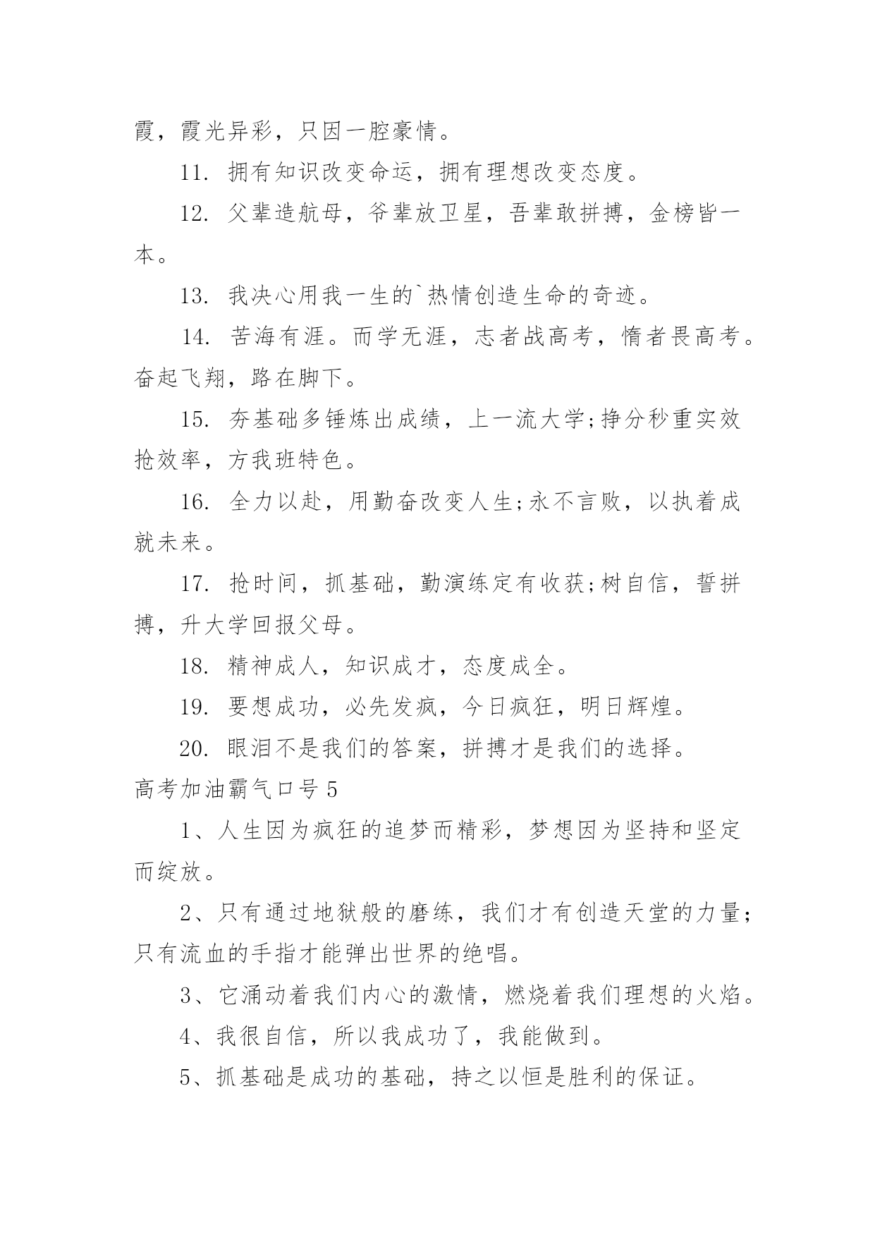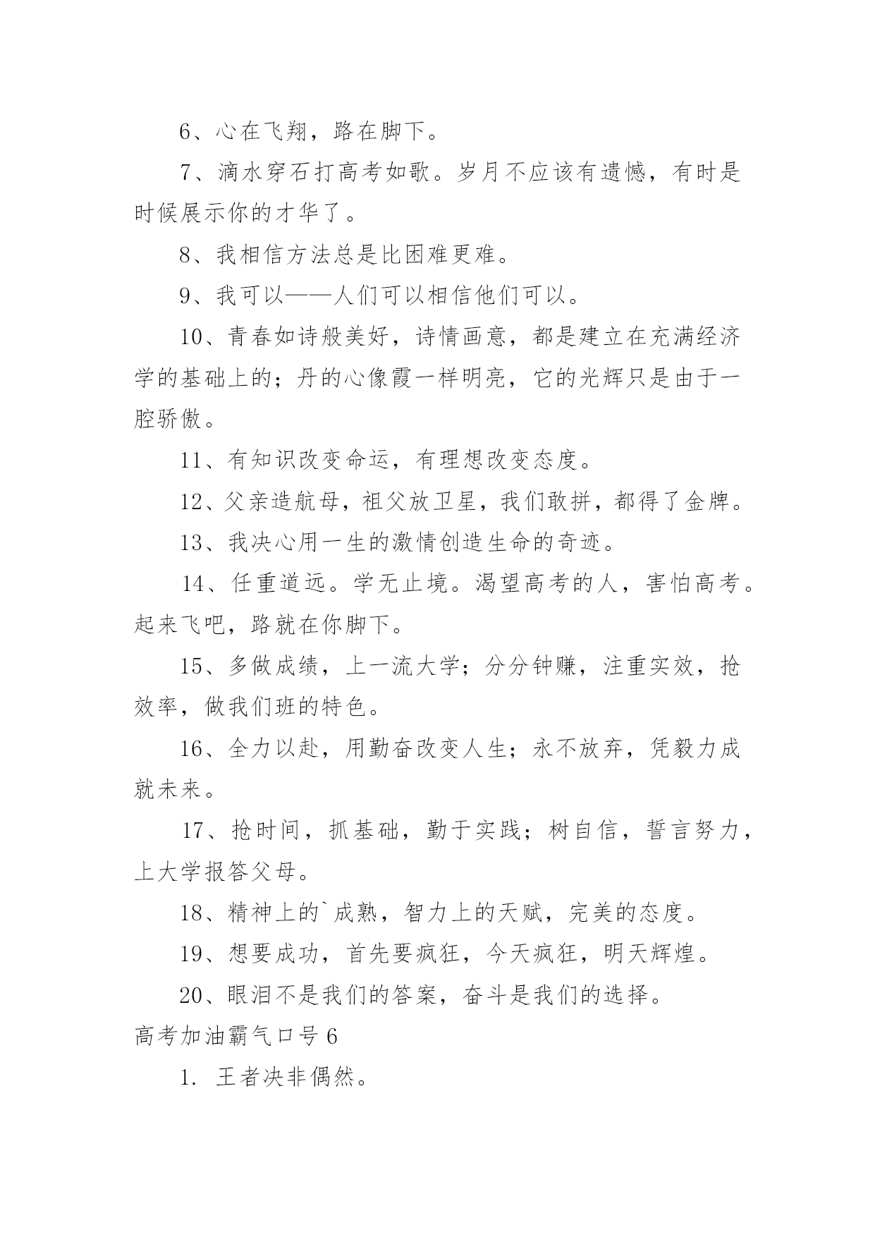 高考加油霸气口号高考加油霸气口号在平时的学习、工作或生活中,大家都接触过很多优秀的口号吧,口号对人们的思维是有一定的感性作用的。你知道什么样的口号才能算得上是好的口号吗?下面是小编帮大家整理的高考加油霸气口号,供大家参考借鉴,希望可以帮助到有需要的朋友。高考加油霸气口号11.付出不一定成功,放弃就一定失败。2.从风雨中寻找快乐,在挫折中保持坚韧。3.现实虽残酷,但命运掌握在自己手中。4.每天告诉自己一次:我真的很不错。5.抢时间,抓基础,勤演练定有收获;树自信,誓拼搏,升大学回报父母。6.每个人都可以给自己快乐,纵然他是乞丐;每个人都能使自己痛苦,即便他是国王。7.在考场上没有弱者的眼泪只有强者的天下。8.鹰击天风壮,鹏飞海浪春。9.高考试卷是一把刻度不均匀的尺子:对于你自己来说,难题的分值不一定高。10.苦海有涯,而学无涯,志者战高考,惰者畏高考。11.永远清楚,不是只有你一个人在努力。12.对待试题:冷静、乐观,对待考试:认真、自信。13.勤奋努力加自信,辉煌成就属于你。14.只有经过地狱般的磨练,才能拥有创造天堂的力量;只有流过血的`手指才能弹出世间的绝唱。15.一个人应当养成信赖自己的习惯,既使到了最危急的关头,也要信信自己的勇敢与毅力。16.苦干加巧干,重点有希望。17.山高不厌攀,水深不厌潜,学精不厌苦:追求!18.祝你成功,成功之路始于脚下。19.别人笑我太疯癫,我笑他人看不穿。20.我流的汗水——会折射出我的光芒!21.高三高考高目标,苦学善学上好学。22.我自信我出色,我努力我成功。23.同心合力,创造辉煌。24.一朝习惯,万事易办。25.奋斗百日,绝不偷懒。26.知识改变命运,努力改变结果。27.人生彩排,每一天现场直播。28.这不是偶然的失误,是必然的结果。高考加油霸气口号21.自信是你成功的基石,沉着是你飞翔的翅膀。2.不要说辛苦,打起精神,就拼他个青春无悔。3.拼一分高一分,一分成就终生。4.人,不能总在弹性限度内活动,要爆发,要超越,才会有质的`提高。5.幸福是棵树,高考是沃土6.读书改变命运,刻苦成就事业,态度决定一切。7.扬理想之风帆,抵成功之彼岸。8.十年磨剑为一搏,六月试锋现真我。9.历春夏以苦为乐恒心架起通天路,搏高考梦想成真勇气推开智慧门。10.高考在我心中,生命在我手中。11.人人争过分,个个考入校。12.不经风雨,怎见彩虹?13.拼两个春夏秋冬,博高考无怨无悔。14.立振兴中华之志,树报效祖国之心。15.微笑迎考,成功在望。高考加油霸气口号31.把汗水变成珍珠,把梦想变成现实。2.雄关漫道,谁与争勇;烈火熊炉,我自称雄。3.破釜沉舟,拼他个日出日落;背水一战,搏他个无怨无悔。4.让我们高举理想的火炬。梦有多远,路就有多远;心有多大,舞台就有多大。5.不为失败找理由,要为成功找方法。6.我要握住一个最美的`梦给未来的自己。7.为理想今日埋头遨游书海甘寂寞,酬壮志明朝昂首驰骋碧宵展宏图。8.走过高考,前面是一片新天地。9.落实高考制度,演绎七彩人生10.拼搏创造价值,努力成就未来。11.静下来,铸我实力;拼上去,亮我风采。12.站在新起点,迎接新挑战,创造新成绩。13.我流的汗水——会折射出我的光芒。14.苦与乐笑与泪,拼搏一生终不悔。15.成功者之所以成功,第一个是因为他做别人不愿意做的事情。第二个他做别人不敢做的事情。高考加油霸气口号41.生命因疯狂追梦而精彩,梦想因执着坚定而绽放。2.只有经过地狱般的磨练,才能拥有创造天堂的力量;只有流过血的手指才能弹出世间的绝唱。3.它澎湃着我们内心的激情,它燃烧着我们理想的火焰。4.我自信,故我成功我行,我一定能行。5.狠抓基础是成功的基础,持之以恒是胜利的保证。6.我心飞翔,路在脚下。7.滴水穿石战高考如歌岁月应无悔,乘风破浪展雄才折桂蟾宫当有时。8.我相信方法总比困难多。9.我能——人之所以能,是相信能10.青春美如诗,诗情画意,全凭满腹经纶;丹心灿如霞,霞光异彩,只因一腔豪情。11.拥有知识改变命运,拥有理想改变态度。12.父辈造航母,爷辈放卫星,吾辈敢拼搏,金榜皆一本。13.我决心用我一生的`热情创造生命的奇迹。14.苦海有涯。而学无涯,志者战高考,惰者畏高考。奋起飞翔,路在脚下。15.夯基础多锤炼出成绩,上一流大学;挣分秒重实效抢效率,方我班特色。16.全力以赴,用勤奋改变人生;永不言败,以执着成就未来。17.抢时间,抓基础,勤演练定有收获;树自信,誓拼搏,升大学回报父母。18.精神成人,知识成才,态度成全。19.要想成功,必先发疯,今日疯狂,明日辉煌。20.眼泪不是我们的答案,拼搏才是我们的选择。高考加油霸气口号51、人生因为疯狂的追梦而精彩,梦想因为坚持和坚定而绽放。2、只有通过地狱般的磨练,我们才有创造天堂的力量;只有流血的