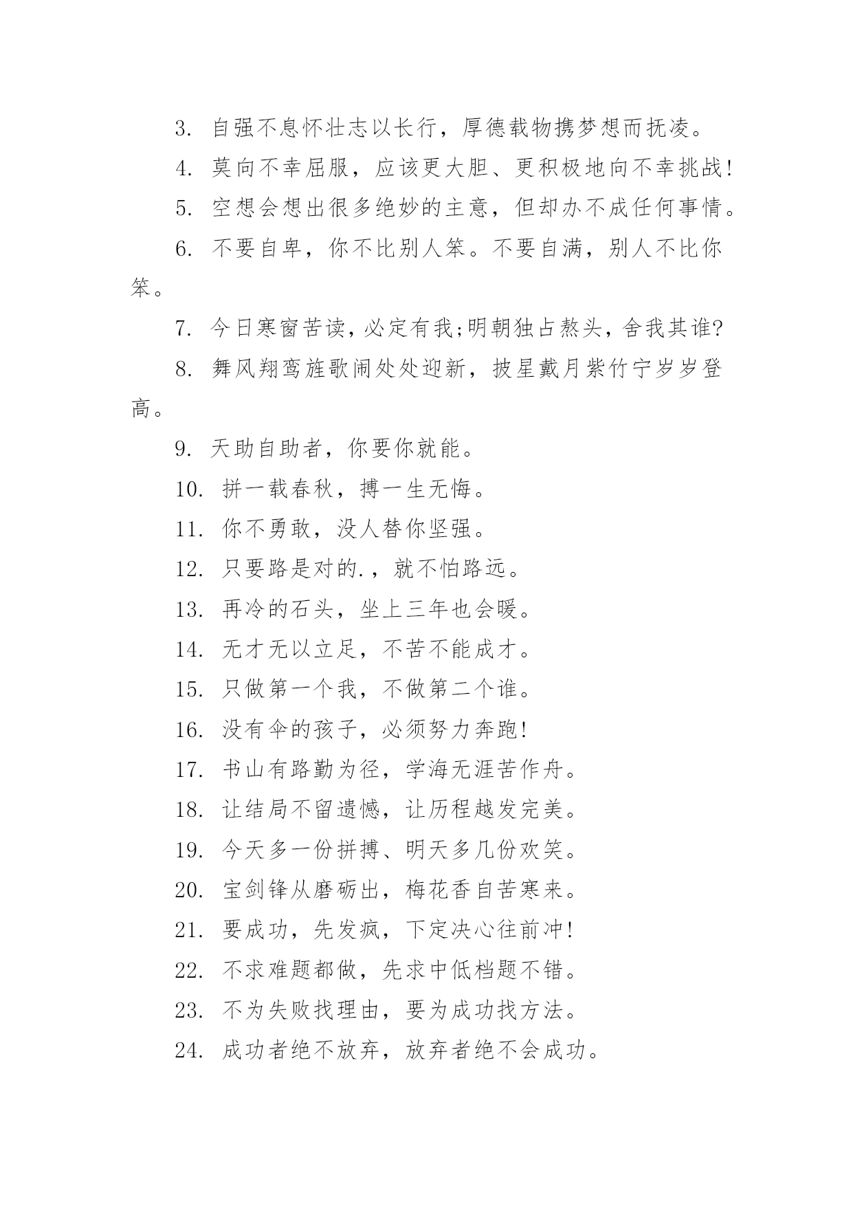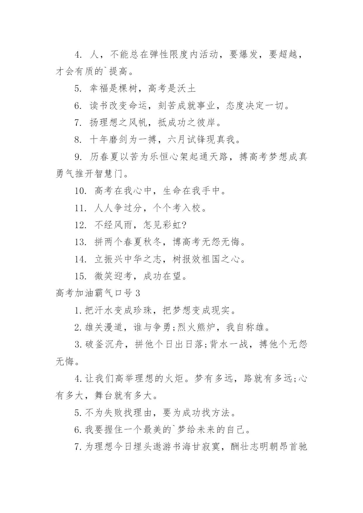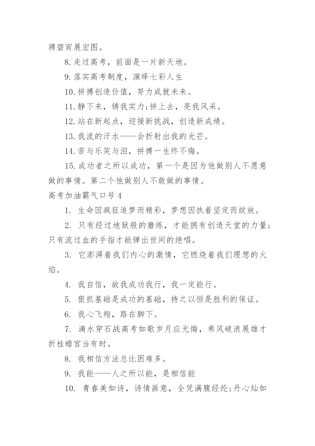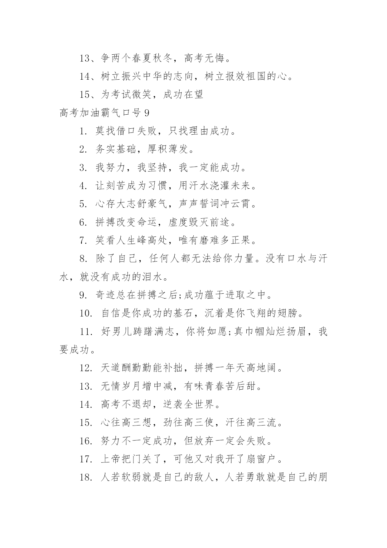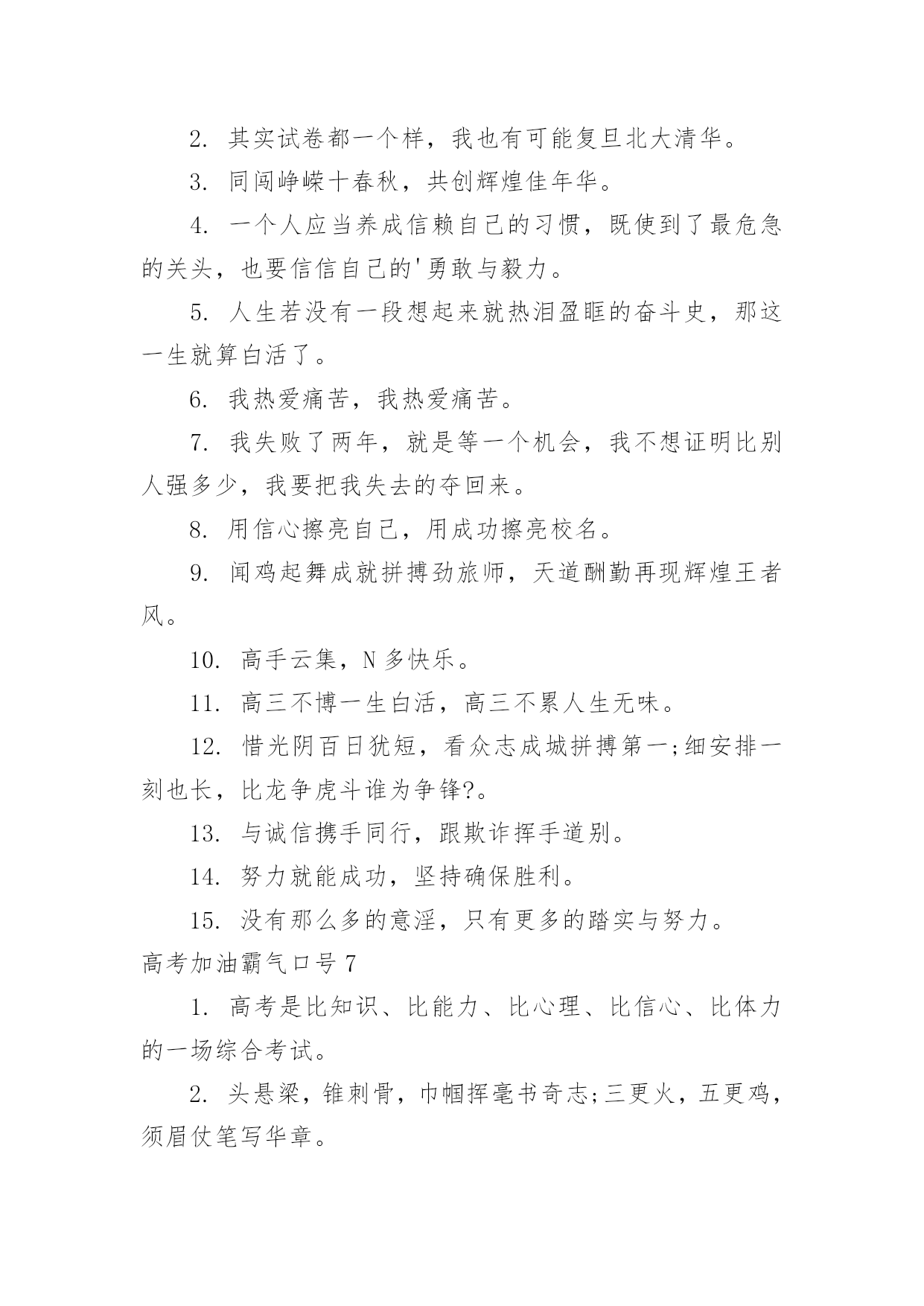 高考加油霸气口号高考加油霸气口号在平时的学习、工作或生活中,大家都接触过很多优秀的口号吧,口号对人们的思维是有一定的感性作用的。你知道什么样的口号才能算得上是好的口号吗?下面是小编帮大家整理的高考加油霸气口号,供大家参考借鉴,希望可以帮助到有需要的朋友。高考加油霸气口号11.付出不一定成功,放弃就一定失败。2.从风雨中寻找快乐,在挫折中保持坚韧。3.现实虽残酷,但命运掌握在自己手中。4.每天告诉自己一次:我真的很不错。5.抢时间,抓基础,勤演练定有收获;树自信,誓拼搏,升大学回报父母。6.每个人都可以给自己快乐,纵然他是乞丐;每个人都能使自己痛苦,即便他是国王。7.在考场上没有弱者的眼泪只有强者的天下。8.鹰击天风壮,鹏飞海浪春。9.高考试卷是一把刻度不均匀的尺子:对于你自己来说,难题的分值不一定高。10.苦海有涯,而学无涯,志者战高考,惰者畏高考。11.永远清楚,不是只有你一个人在努力。12.对待试题:冷静、乐观,对待考试:认真、自信。13.勤奋努力加自信,辉煌成就属于你。14.只有经过地狱般的磨练,才能拥有创造天堂的力量;只有流过血的`手指才能弹出世间的绝唱。15.一个人应当养成信赖自己的习惯,既使到了最危急的关头,也要信信自己的勇敢与毅力。16.苦干加巧干,重点有希望。17.山高不厌攀,水深不厌潜,学精不厌苦:追求!18.祝你成功,成功之路始于脚下。19.别人笑我太疯癫,我笑他人看不穿。20.我流的汗水——会折射出我的光芒!21.高三高考高目标,苦学善学上好学。22.我自信我出色,我努力我成功。23.同心合力,创造辉煌。24.一朝习惯,万事易办。25.奋斗百日,绝不偷懒。26.知识改变命运,努力改变结果。27.人生彩排,每一天现场直播。28.这不是偶然的失误,是必然的结果。高考加油霸气口号21.自信是你成功的基石,沉着是你飞翔的翅膀。2.不要说辛苦,打起精神,就拼他个青春无悔。3.拼一分高一分,一分成就终生。4.人,不能总在弹性限度内活动,要爆发,要超越,才会有质的`提高。5.幸福是棵树,高考是沃土6.读书改变命运,刻苦成就事业,态度决定一切。7.扬理想之风帆,抵成功之彼岸。8.十年磨剑为一搏,六月试锋现真我。9.历春夏以苦为乐恒心架起通天路,搏高考梦想成真勇气推开智慧门。10.高考在我心中,生命在我手中。11.人人争过分,个个考入校。12.不经风雨,怎见彩虹?13.拼两个春夏秋冬,博高考无怨无悔。14.立振兴中华之志,树报效祖国之心。15.微笑迎考,成功在望。高考加油霸气口号31.把汗水变成珍珠,把梦想变成现实。2.雄关漫道,谁与争勇;烈火熊炉,我自称雄。3.破釜沉舟,拼他个日出日落;背水一战,搏他个无怨无悔。4.让我们高举理想的火炬。梦有多远,路就有多远;心有多大,舞台就有多大。5.不为失败找理由,要为成功找方法。6.我要握住一个最美的`梦给未来的自己。7.为理想今日埋头遨游书海甘寂寞,酬壮志明朝昂首驰骋碧宵展宏图。8.走过高考,前面是一片新天地。9.落实高考制度,演绎七彩人生10.拼搏创造价值,努力成就未来。11.静下来,铸我实力;拼上去,亮我风采。12.站在新起点,迎接新挑战,创造新成绩。13.我流的汗水——会折射出我的光芒。14.苦与乐笑与泪,拼搏一生终不悔。15.成功者之所以成功,第一个是因为他做别人不愿意做的事情。第二个他做别人不敢做的事情。高考加油霸气口号41.生命因疯狂追梦而精彩,梦想因执着坚定而绽放。2.只有经过地狱般的磨练,才能拥有创造天堂的力量;只有流过血的手指才能弹出世间的绝唱。3.它澎湃着我们内心的激情,它燃烧着我们理想的火焰。4.我自信,故我成功我行,我一定能行。5.狠抓基础是成功的基础,持之以恒是胜利的保证。6.我心飞翔,路在脚下。7.滴水穿石战高考如歌岁月应无悔,乘风破浪展雄才折桂蟾宫当有时。8.我相信方法总比困难多。9.我能——人之所以能,是相信能10.青春美如诗,诗情画意,全凭满腹经纶;丹心灿如霞,霞光异彩,只因一腔豪情。11.拥有知识改变命运,拥有理想改变态度。12.父辈造航母,爷辈放卫星,吾辈敢拼搏,金榜皆一本。13.我决心用我一生的`热情创造生命的奇迹。14.苦海有涯。而学无涯,志者战高考,惰者畏高考。奋起飞翔,路在脚下。15.夯基础多锤炼出成绩,上一流大学;挣分秒重实效抢效率,方我班特色。16.全力以赴,用勤奋改变人生;永不言败,以执着成就未来。17.抢时间,抓基础,勤演练定有收获;树自信,誓拼搏,升大学回报父母。18.精神成人,知识成才,态度成全。19.要想成功,必先发疯,今日疯狂,明日辉煌。20.眼泪不是我们的答案,拼搏才是我们的选择。高考加油霸气口号51、人生因为疯狂的追梦而精彩,梦想因为坚持和坚定而绽放。2、只有通过地狱般的磨练,我们才有创造天堂的力量;只有流血的
