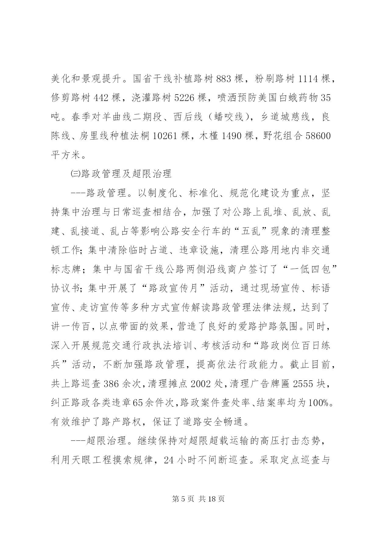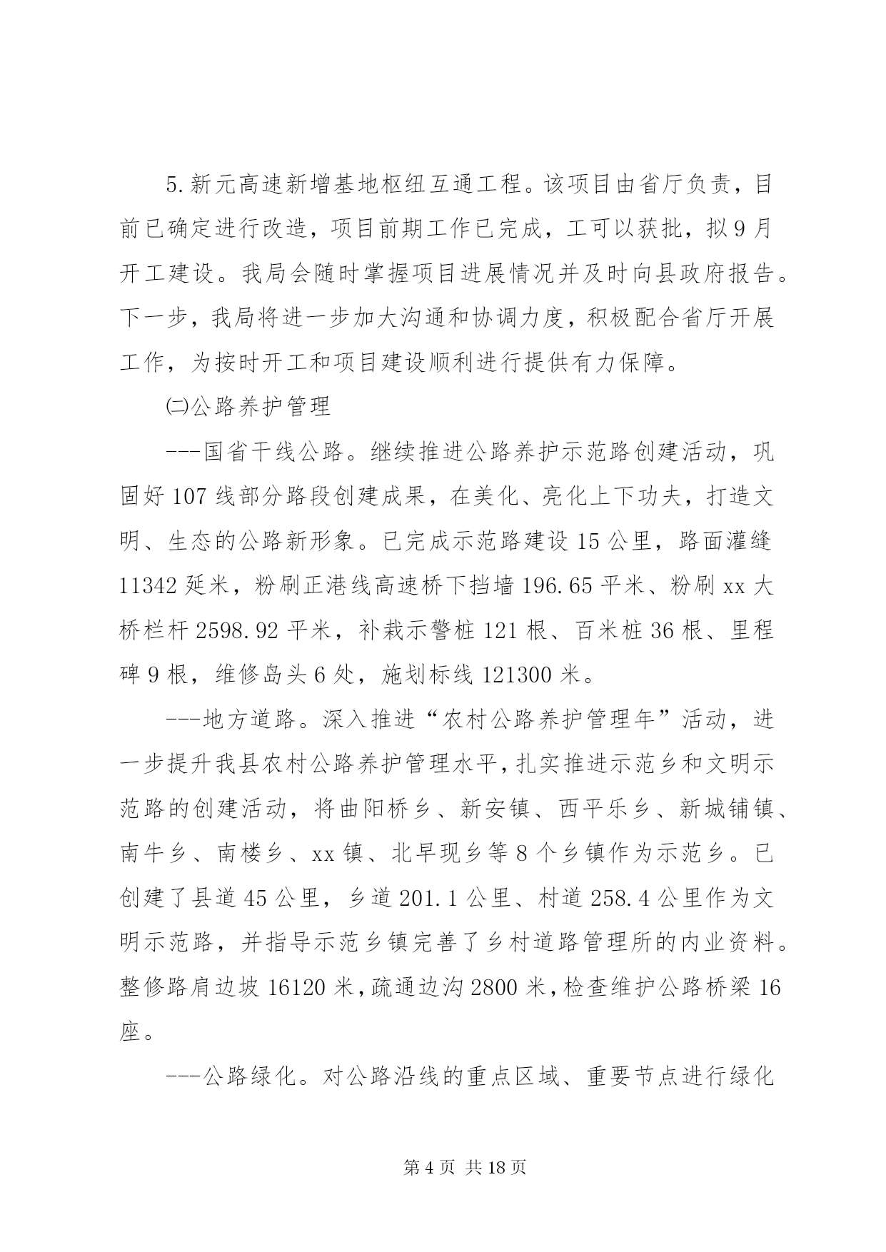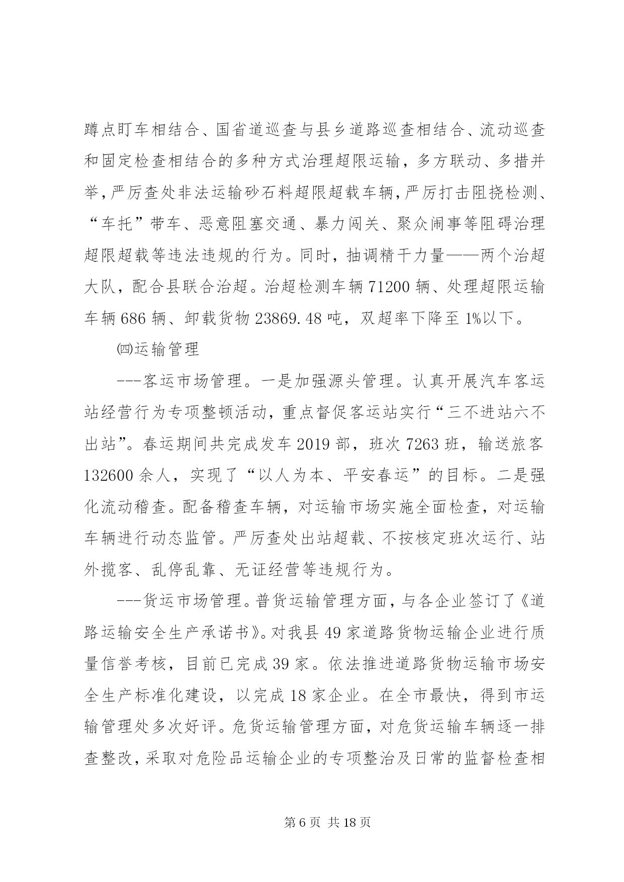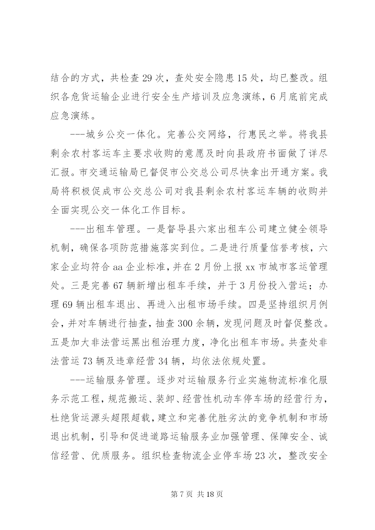 第PAGE\*Arabic\*MERGEFORMAT18页共NUMPAGES\*MERGEFORMAT18页交通局上阶段工作总结下面是我们文秘114的小编为大家整理的交通局上阶段工作总结,请大家参阅。上阶段,我局紧扣县委、县政府的决策部署和上级交通运输部门的总体要求,以“大干一百天、工作大攻坚”及“两学一做”教育活动为契机,强化责任担当,砥砺实干精神,全力把“两学一做”活动转化成一种工作状态,扎实推进交通建设、行业管理和队伍建设等各项工作,争创交通工作新成绩,为全面完成年度工作目标打下了坚实的基础。一、上阶段工作完成情况㈠公路工程一是全力推进工程建设。倒排工作计划,合理安排工序,保证工程质量,加快工程进度。1.国道107拓宽改建工程。建设里程10.89公里,工程预计投资10699万元。该项目涉及南牛、新安、新城铺、西平乐4个乡(镇)8个行政村。截至目前,工程占地工作已经完成,附着物、建筑物拆迁已完成总量的95%,公共设施改迁已完成20处,剩余2处正在迁移。路基开挖3.8公里,现已完成2公里,预计今年10月底竣工通车。2.曙光路拓宽改建工程。该项目起于正南公路,止于中华大街,路线全长4.3公里,按二级公路标准设计,路面宽12米。地上附着物拆迁工作已基本完成,公共设施拆迁正在抓紧推进,旧路面挖除已全部完成,排水管道已铺设2.7公里。计划7月底前竣工通车。3.xx大道西延工程。该项目起于xx大道与城东街交叉处,止于107国道,涉及xx镇太平庄、木厂、城杨庄、南关、城李庄、西关等六个村,全长3.73公里,其中1.045公里为新建,2.685公里利用旧路改建。全线采用一级公路标准设计,路面宽28米。该工程分两期实施,一期建设1.69公里(太平庄至新建南城门路段),二期建设2.04公里(新建南城门路至107国道)。首先实施一期工程建设,计划投资1.6亿元。目前县发改局已批复工程可行性研究报告,财政评审完成,招标已开标,正在公示,县规划局正在办理建设用地规划许可。预计7月份进场施工。4.利民实事工程。xx年利民实事共10项,建设总里程10.4公里。目前正港线-五里铺道路改建工程已完成,其他九个项目正在办理前期手续。计划10月底前全部竣工。5.农村公路建设工程。xx年拟实施农村公路改造项目50个,总里程74.5公里,预计投资7178万元。目前,项目图纸设计已完成,其中30个项目已完成财务评审工作,20个项目正在进行财务评审工作,计划年底前完成全部建设工程。二是主动作为,多措并举,扎实推进重大项目建设。1.国道338连接线。该项目起于正港线与华安东路交叉处,向北经县物流园区、五里铺、牛家庄,止于338国道(现状羊曲线),长4.991公里,按一级公路标准设计,路基宽24.5米。目前,项目建议书已经获批,其它前期工作正在进行中,力争2017年开工建设。2.京港澳高速机场连接线。此项工程xx段长0.8公里,附着物调查评估、拆迁评审工作已完成。由于该项目涉及的坟墓迁移工作难度较大,我县向市政府申请建设纪念堂未获批,因此,我局已协调新城铺镇政府,落实了被迁移坟墓选址问题(现将8亩耕地转变为公共墓地),目前正在加紧协调征占迁各项工作。3.中华大街北延项目。该项目起点接京昆(张石)高速xx北出口支线收费广场北侧预留道路,向北经下水屯西、戎家庄西、东叩村东,至终点与正南公路相交,长2.85公里,按一级公路标准设计,路基宽24.5米,双向四车道。此项工程建设单位是xx市公路工程管理处,我局配合该处办理相关前期手续。现在大部分项目前期工作已经完成,工程设计正在进行中,争取xx年启动征地拆迁工作。4.新城大道北延工程。该项目起于xxXX县区(已建成路段终点),止于机场路。业主为xx市地方道路管理处,我县负责配合业主协调有关部门开展前期工作。由于初设方案与我县总规不符,需重新确定路线走向。5.新元高速新增基地枢纽互通工程。该项目由省厅负责,目前已确定进行改造,项目前期工作已完成,工可以获批,拟9月开工建设。我局会随时掌握项目进展情况并及时向县政府报告。下一步,我局将进一步加大沟通和协调力度,积极配合省厅开展工作,为按时开工和项目建设顺利进行提供有力保障。㈡公路养护管理---国省干线公路。继续推进公路养护示范路创建活动,巩固好107线部分路段创建成果,在美化、亮化上下功夫,打造文明、生态的公路新形象。已完成示范路建设15公里,路面灌缝11342延米,粉刷正港线高速桥下挡墙196.65平米、粉刷xx大桥栏杆2598.92平米,补栽示警桩121根、百米桩36根、里程碑9根,维修岛头6处,施划标线121300米。---地方道路。深入推进“农村公路养护管理年”活动,进一步提升我县农村公路养护管理水平,扎实推进示范乡和文明示范路的创建活动,将曲阳桥乡、新