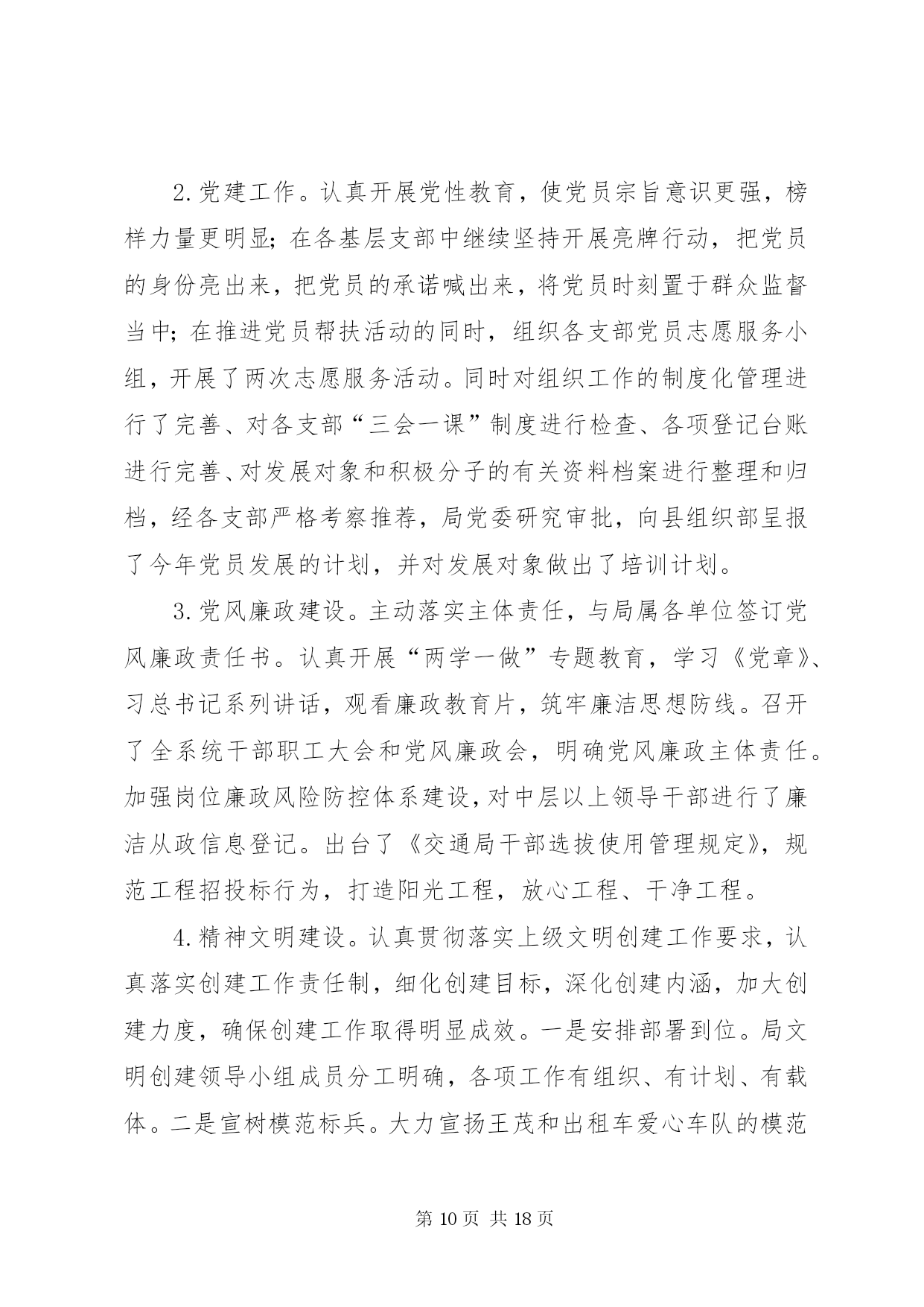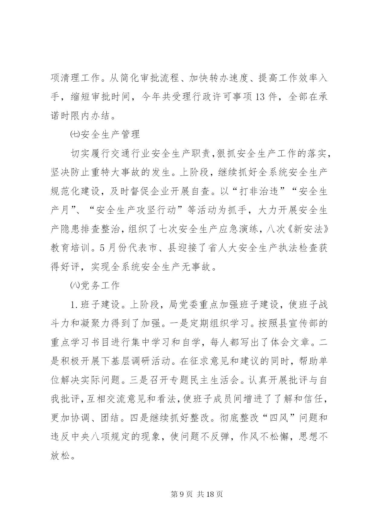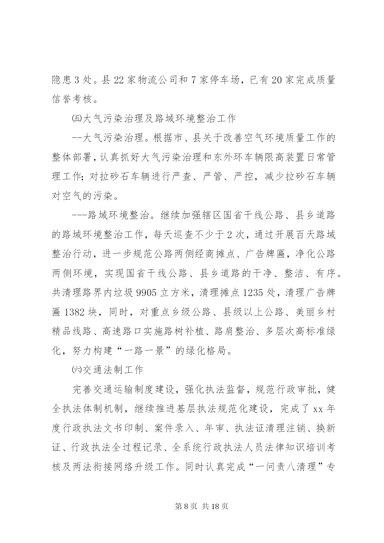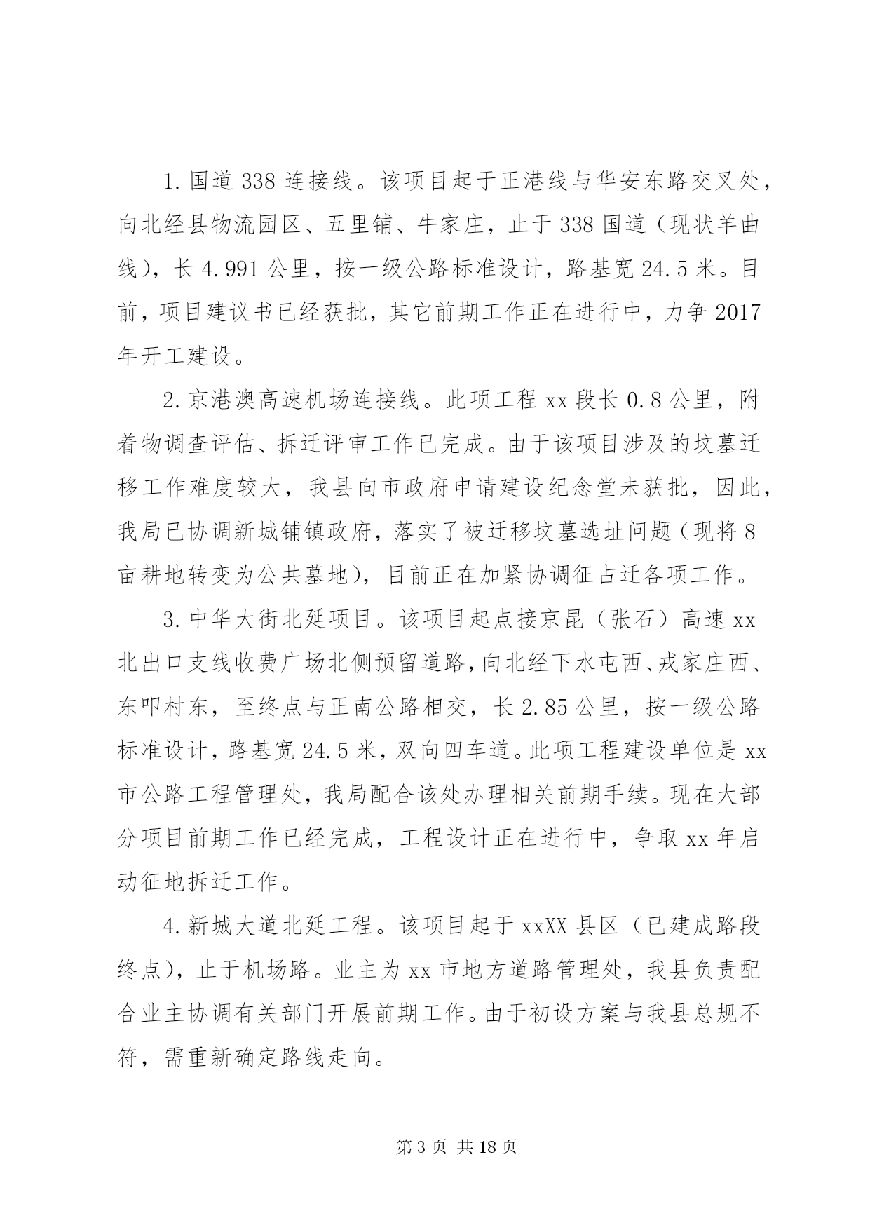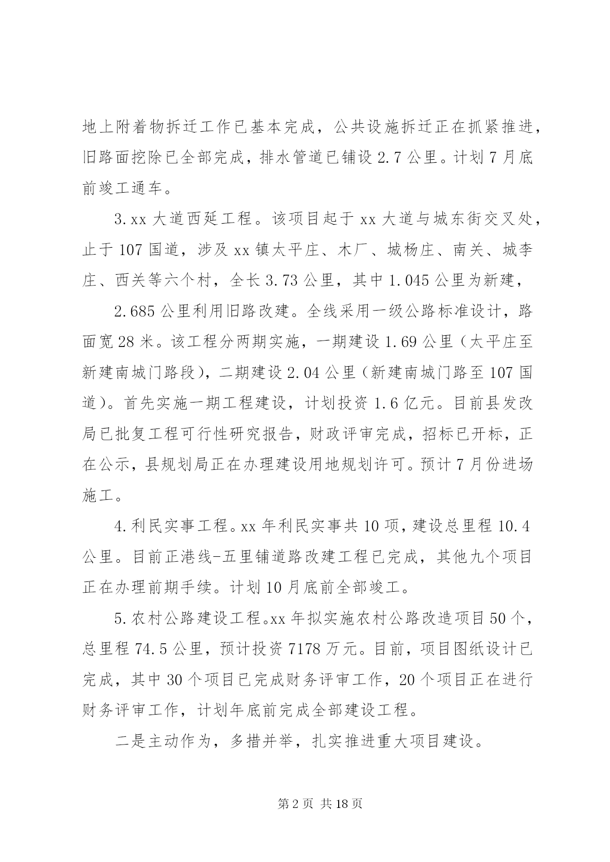 第PAGE\*Arabic\*MERGEFORMAT18页共NUMPAGES\*MERGEFORMAT18页交通局上阶段工作总结下面是我们文秘114的小编为大家整理的交通局上阶段工作总结,请大家参阅。上阶段,我局紧扣县委、县政府的决策部署和上级交通运输部门的总体要求,以“大干一百天、工作大攻坚”及“两学一做”教育活动为契机,强化责任担当,砥砺实干精神,全力把“两学一做”活动转化成一种工作状态,扎实推进交通建设、行业管理和队伍建设等各项工作,争创交通工作新成绩,为全面完成年度工作目标打下了坚实的基础。一、上阶段工作完成情况㈠公路工程一是全力推进工程建设。倒排工作计划,合理安排工序,保证工程质量,加快工程进度。1.国道107拓宽改建工程。建设里程10.89公里,工程预计投资10699万元。该项目涉及南牛、新安、新城铺、西平乐4个乡(镇)8个行政村。截至目前,工程占地工作已经完成,附着物、建筑物拆迁已完成总量的95%,公共设施改迁已完成20处,剩余2处正在迁移。路基开挖3.8公里,现已完成2公里,预计今年10月底竣工通车。2.曙光路拓宽改建工程。该项目起于正南公路,止于中华大街,路线全长4.3公里,按二级公路标准设计,路面宽12米。地上附着物拆迁工作已基本完成,公共设施拆迁正在抓紧推进,旧路面挖除已全部完成,排水管道已铺设2.7公里。计划7月底前竣工通车。3.xx大道西延工程。该项目起于xx大道与城东街交叉处,止于107国道,涉及xx镇太平庄、木厂、城杨庄、南关、城李庄、西关等六个村,全长3.73公里,其中1.045公里为新建,2.685公里利用旧路改建。全线采用一级公路标准设计,路面宽28米。该工程分两期实施,一期建设1.69公里(太平庄至新建南城门路段),二期建设2.04公里(新建南城门路至107国道)。首先实施一期工程建设,计划投资1.6亿元。目前县发改局已批复工程可行性研究报告,财政评审完成,招标已开标,正在公示,县规划局正在办理建设用地规划许可。预计7月份进场施工。4.利民实事工程。xx年利民实事共10项,建设总里程10.4公里。目前正港线-五里铺道路改建工程已完成,其他九个项目正在办理前期手续。计划10月底前全部竣工。5.农村公路建设工程。xx年拟实施农村公路改造项目50个,总里程74.5公里,预计投资7178万元。目前,项目图纸设计已完成,其中30个项目已完成财务评审工作,20个项目正在进行财务评审工作,计划年底前完成全部建设工程。二是主动作为,多措并举,扎实推进重大项目建设。1.国道338连接线。该项目起于正港线与华安东路交叉处,向北经县物流园区、五里铺、牛家庄,止于338国道(现状羊曲线),长4.991公里,按一级公路标准设计,路基宽24.5米。目前,项目建议书已经获批,其它前期工作正在进行中,力争2017年开工建设。2.京港澳高速机场连接线。此项工程xx段长0.8公里,附着物调查评估、拆迁评审工作已完成。由于该项目涉及的坟墓迁移工作难度较大,我县向市政府申请建设纪念堂未获批,因此,我局已协调新城铺镇政府,落实了被迁移坟墓选址问题(现将8亩耕地转变为公共墓地),目前正在加紧协调征占迁各项工作。3.中华大街北延项目。该项目起点接京昆(张石)高速xx北出口支线收费广场北侧预留道路,向北经下水屯西、戎家庄西、东叩村东,至终点与正南公路相交,长2.85公里,按一级公路标准设计,路基宽24.5米,双向四车道。此项工程建设单位是xx市公路工程管理处,我局配合该处办理相关前期手续。现在大部分项目前期工作已经完成,工程设计正在进行中,争取xx年启动征地拆迁工作。4.新城大道北延工程。该项目起于xxXX县区(已建成路段终点),止于机场路。业主为xx市地方道路管理处,我县负责配合业主协调有关部门开展前期工作。由于初设方案与我县总规不符,需重新确定路线走向。5.新元高速新增基地枢纽互通工程。该项目由省厅负责,目前已确定进行改造,项目前期工作已完成,工可以获批,拟9月开工建设。我局会随时掌握项目进展情况并及时向县政府报告。下一步,我局将进一步加大沟通和协调力度,积极配合省厅开展工作,为按时开工和项目建设顺利进行提供有力保障。㈡公路养护管理---国省干线公路。继续推进公路养护示范路创建活动,巩固好107线部分路段创建成果,在美化、亮化上下功夫,打造文明、生态的公路新形象。已完成示范路建设15公里,路面灌缝11342延米,粉刷正港线高速桥下挡墙196.65平米、粉刷xx大桥栏杆2598.92平米,补栽示警桩121根、百米桩36根、里程碑9根,维修岛头6处,施划标线121300米。---地方道路。深入推进“农村公路养护管理年”活动,进一步提升我县农村公路养护管理水平,扎实推进示范乡和文明示范路的创建活动,将曲阳桥乡、新