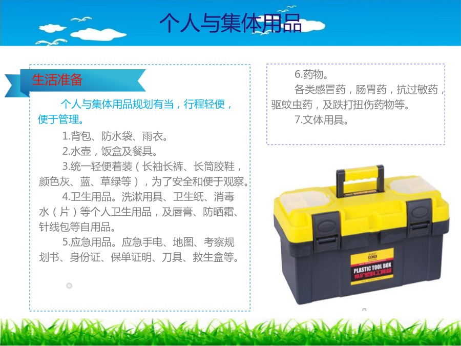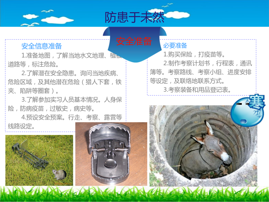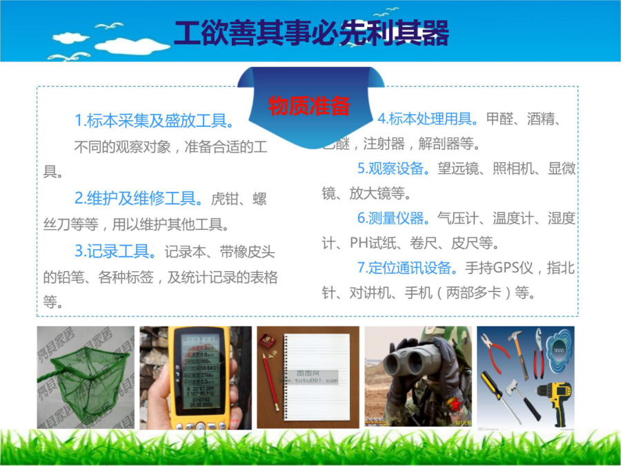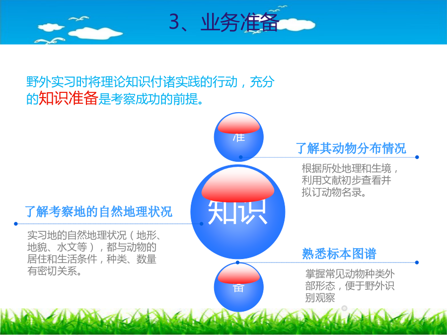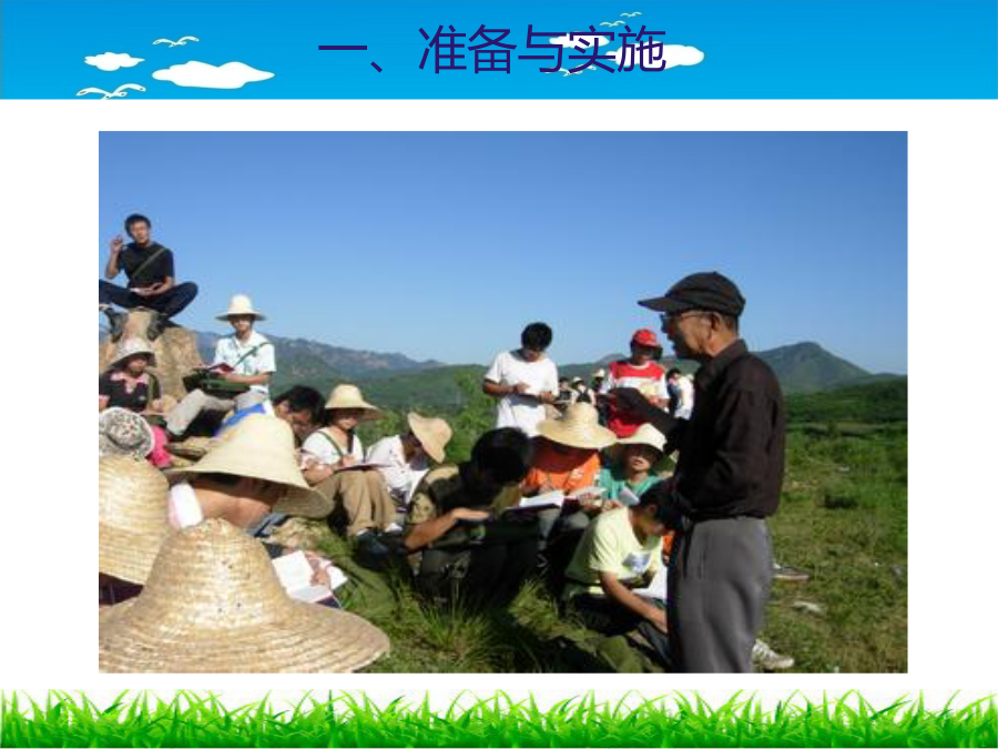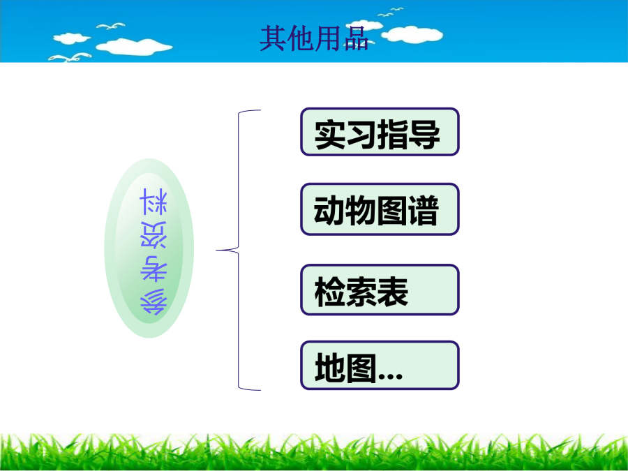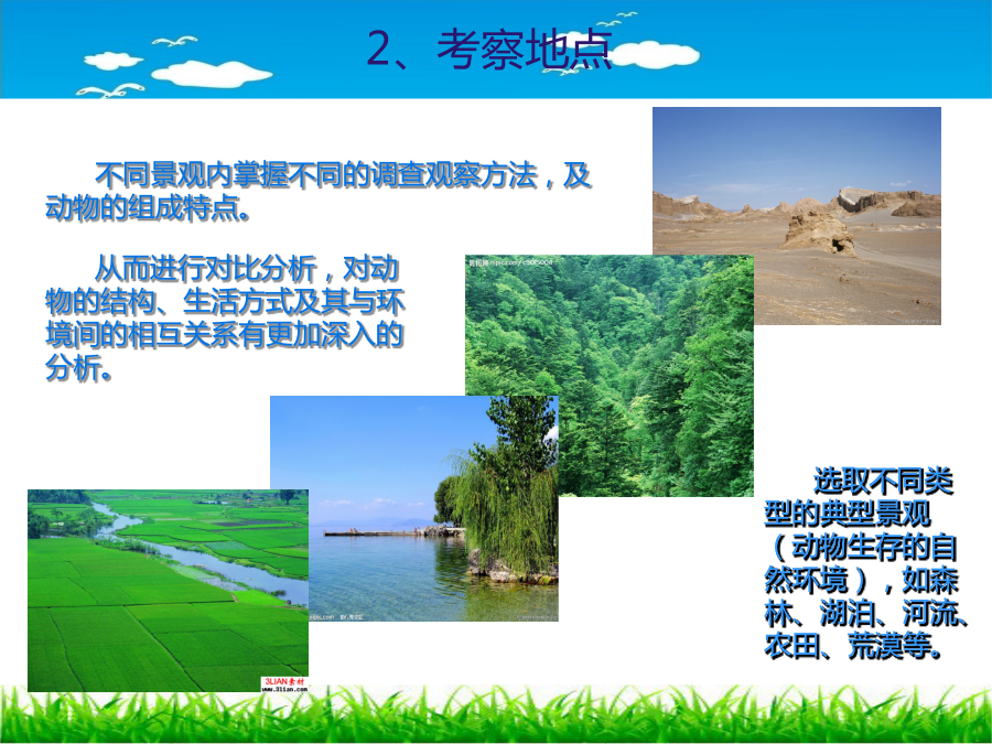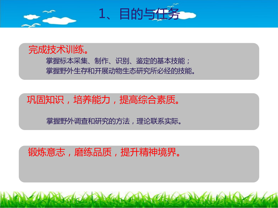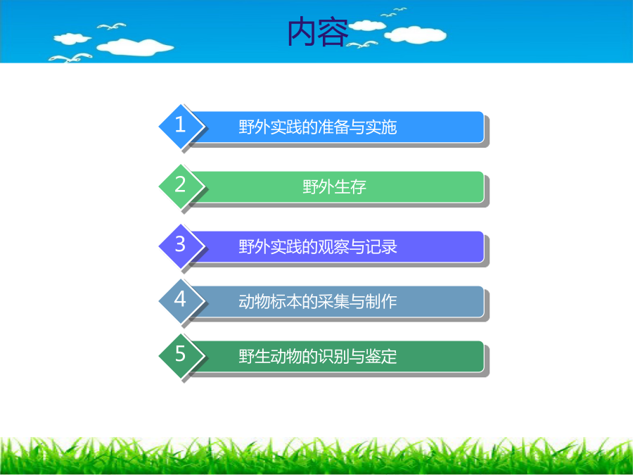 内容一、准备与实施2、考察地点3、业务准备其他用品个人与集体用品防患于未然4、注意事项二、野外生存三、野外实践的观察与记录1、个体生态学研究个体生态观察个体生态观察2、种群生态观察种群数量统计群落生态分析四.动物标本的采集与制作2.标本的制作2.标本的制作2.标本的制作五:野生动物的识别与鉴定识别依据识别依据识别依据识别依据2.动物的鉴定ThankYou!