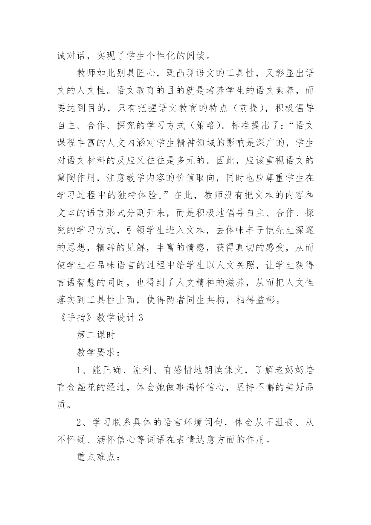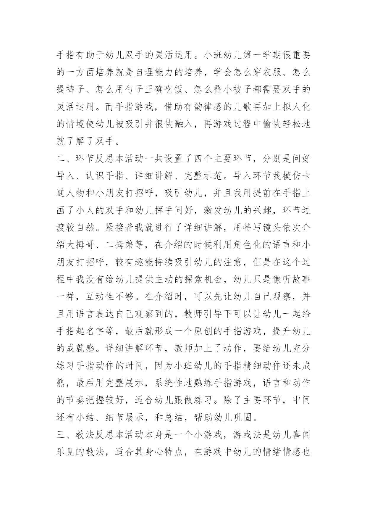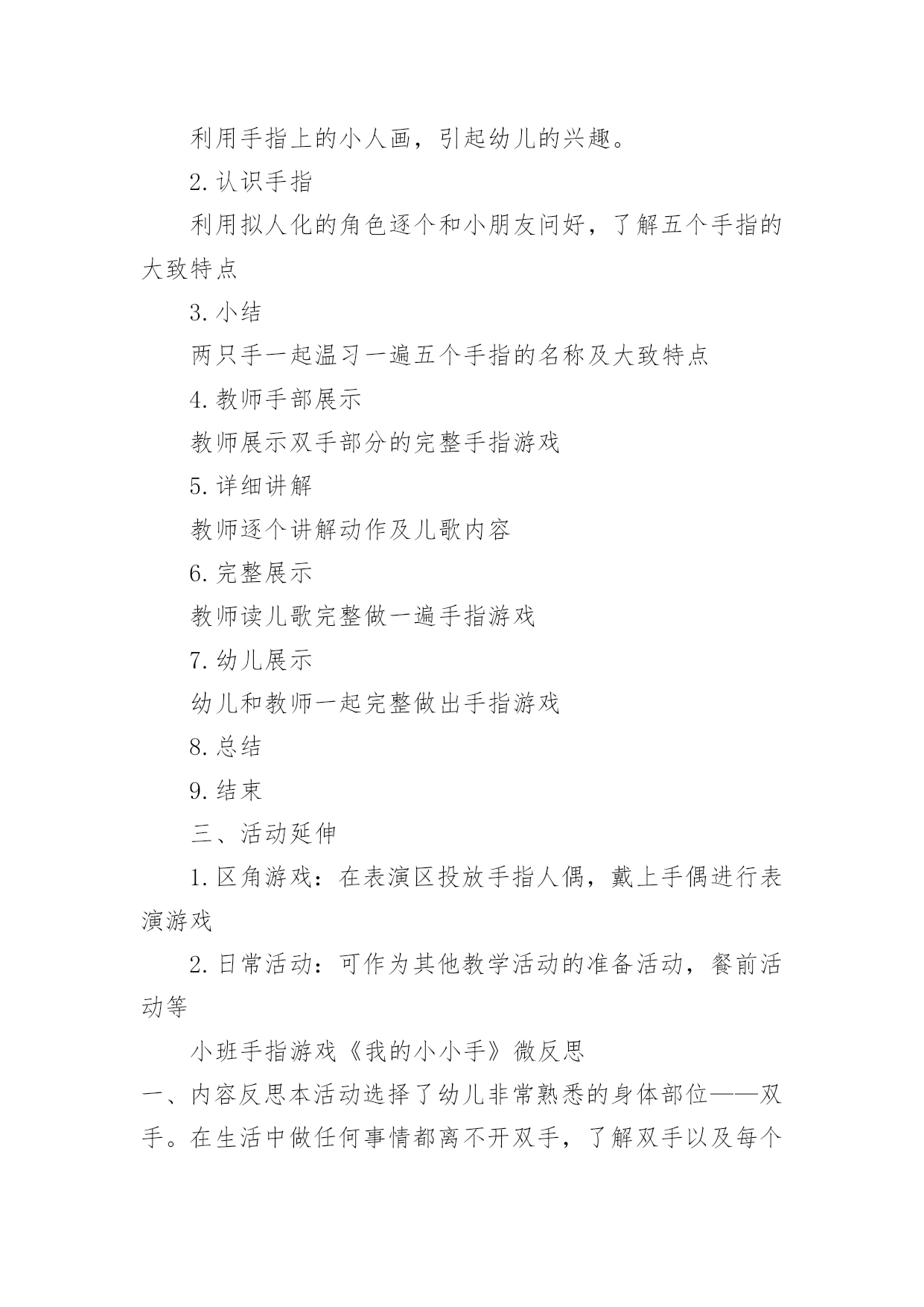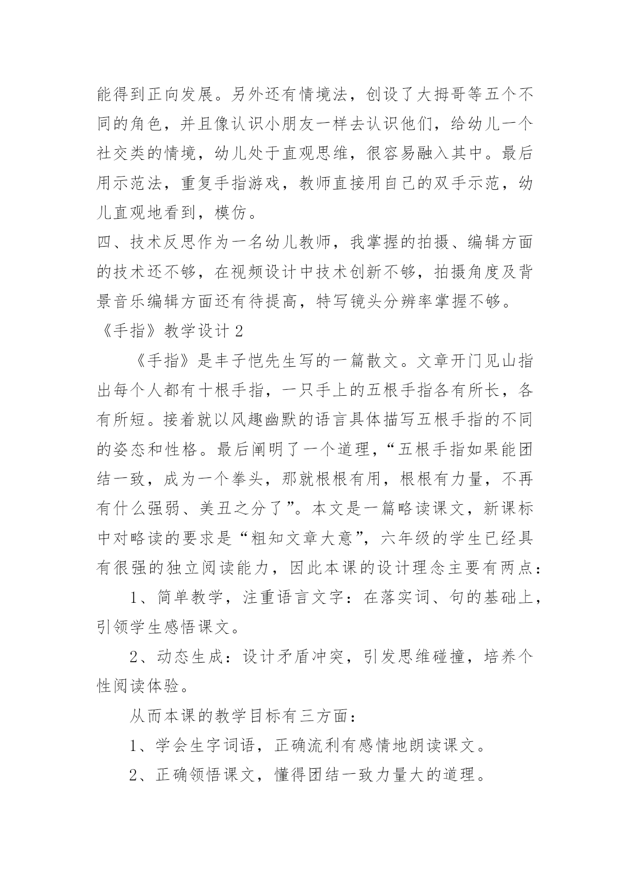 《手指》教学设计《手指》教学设计作为一名辛苦耕耘的教育工作者,时常需要编写教学设计,教学设计是把教学原理转化为教学材料和教学活动的计划。我们应该怎么写教学设计呢?以下是小编整理的《手指》教学设计,欢迎阅读,希望大家能够喜欢。《手指》教学设计1设计意图双手是幼儿非常熟悉的身体部位,不管在生活中还是教学活动中都离不开双手的应用,另外在《指南》的健康领域特别强调幼儿手的动作灵活协调。游戏是幼儿的天性,《规程》明确提出幼儿园教育要以游戏为基本活动。本活动借助一个有趣的手指游戏,拟人化地认识手指及其基本特点,并且配上韵律感强的儿歌,促进幼儿手口协调、手眼协调等多方面的发展。一、活动目标1.通过拟人化角色了解五个手指的大致特点2.能根据儿歌做出对应的`手指动作3.体验用手指表演儿歌的快乐二、活动过程1.问好导入利用手指上的小人画,引起幼儿的兴趣。2.认识手指利用拟人化的角色逐个和小朋友问好,了解五个手指的大致特点3.小结两只手一起温习一遍五个手指的名称及大致特点4.教师手部展示教师展示双手部分的完整手指游戏5.详细讲解教师逐个讲解动作及儿歌内容6.完整展示教师读儿歌完整做一遍手指游戏7.幼儿展示幼儿和教师一起完整做出手指游戏8.总结9.结束三、活动延伸1.区角游戏:在表演区投放手指人偶,戴上手偶进行表演游戏2.日常活动:可作为其他教学活动的准备活动,餐前活动等小班手指游戏《我的小小手》微反思一、内容反思本活动选择了幼儿非常熟悉的身体部位——双手。在生活中做任何事情都离不开双手,了解双手以及每个手指有助于幼儿双手的灵活运用。小班幼儿第一学期很重要的一方面培养就是自理能力的培养,学会怎么穿衣服、怎么提裤子、怎么用勺子正确吃饭、怎么叠小被子都需要双手的灵活运用。而手指游戏,借助有韵律感的儿歌再加上拟人化的情境使幼儿被吸引并很快融入,再游戏过程中愉快轻松地就了解了双手。二、环节反思本活动一共设置了四个主要环节,分别是问好导入、认识手指、详细讲解、完整示范。导入环节我模仿卡通人物和小朋友打招呼,吸引幼儿,并且我用提前在手指上画了小人的双手和幼儿挥手问好,激发幼儿的兴趣,环节过渡较自然。紧接着我就进行了详细讲解,用特写镜头依次介绍大拇哥、二拇弟等,在介绍的时候利用角色化的语言和小朋友打招呼,较有趣能持续吸引幼儿的注意,但是在这个过程中我没有给幼儿提供主动的探索机会,幼儿只是像听故事一样,互动性不够。在介绍时,可以先让幼儿自己观察,并且用语言表达自己观察到的,教师引导下可以让幼儿一起给手指起名字等,最后就形成一个原创的手指游戏,提升幼儿的成就感。详细讲解环节,教师加上了动作,要给幼儿充分练习手指动作的时间,因为小班幼儿的手指精细动作还未成熟,最后用完整展示,系统性地熟练手指游戏,语言和动作的节奏把握较好,适合幼儿跟做练习。除了主要环节,中间还有小结、细节展示,和总结,帮助幼儿巩固。三、教法反思本活动本身是一个小游戏,游戏法是幼儿喜闻乐见的教法,适合其身心特点,在游戏中幼儿的情绪情感也能得到正向发展。另外还有情境法,创设了大拇哥等五个不同的角色,并且像认识小朋友一样去认识他们,给幼儿一个社交类的情境,幼儿处于直观思维,很容易融入其中。最后用示范法,重复手指游戏,教师直接用自己的双手示范,幼儿直观地看到,模仿。四、技术反思作为一名幼儿教师,我掌握的拍摄、编辑方面的技术还不够,在视频设计中技术创新不够,拍摄角度及背景音乐编辑方面还有待提高,特写镜头分辨率掌握不够。《手指》教学设计2《手指》是丰子恺先生写的一篇散文。文章开门见山指出每个人都有十根手指,一只手上的五根手指各有所长,各有所短。接着就以风趣幽默的语言具体描写五根手指的不同的姿态和性格。最后阐明了一个道理,“五根手指如果能团结一致,成为一个拳头,那就根根有用,根根有力量,不再有什么强弱、美丑之分了”。本文是一篇略读课文,新课标中对略读的要求是“粗知文章大意”,六年级的学生已经具有很强的独立阅读能力,因此本课的设计理念主要有两点:1、简单教学,注重语言文字:在落实词、句的基础上,引领学生感悟课文。2、动态生成:设计矛盾冲突,引发思维碰撞,培养个性阅读体验。从而本课的教学目标有三方面:1、学会生字词语,正确流利有感情地朗读课文。2、正确领悟课文,懂得团结一致力量大的道理。3、学习丰子恺先生质朴的语言、幽默的风格,十分传神地表情达意的写作手法。这充分地体现了新课标中的“正确地理解和运用祖国的语言文字”“语文学科工具性与人文性统一”的观点。语文应该明确自己的责任:新课标中指出语文课程应指导学生正确地理解和运用祖国语言文字,丰富语言的积累,培养语感,发展思维,应致力于学生语文素养的形成和发展。在这一部分的教学中,老师立足文本,关注语言,强化体验,调动学生的生活经验,引导学生全方位地感悟语言。如此教学,就是学
