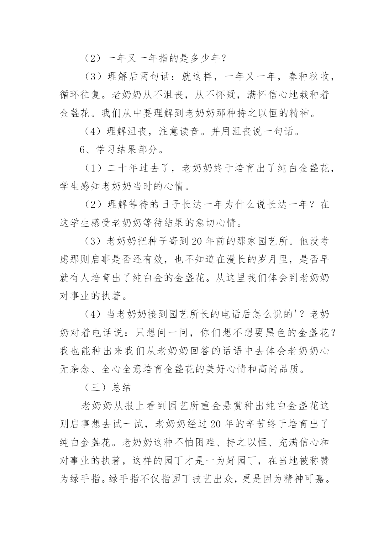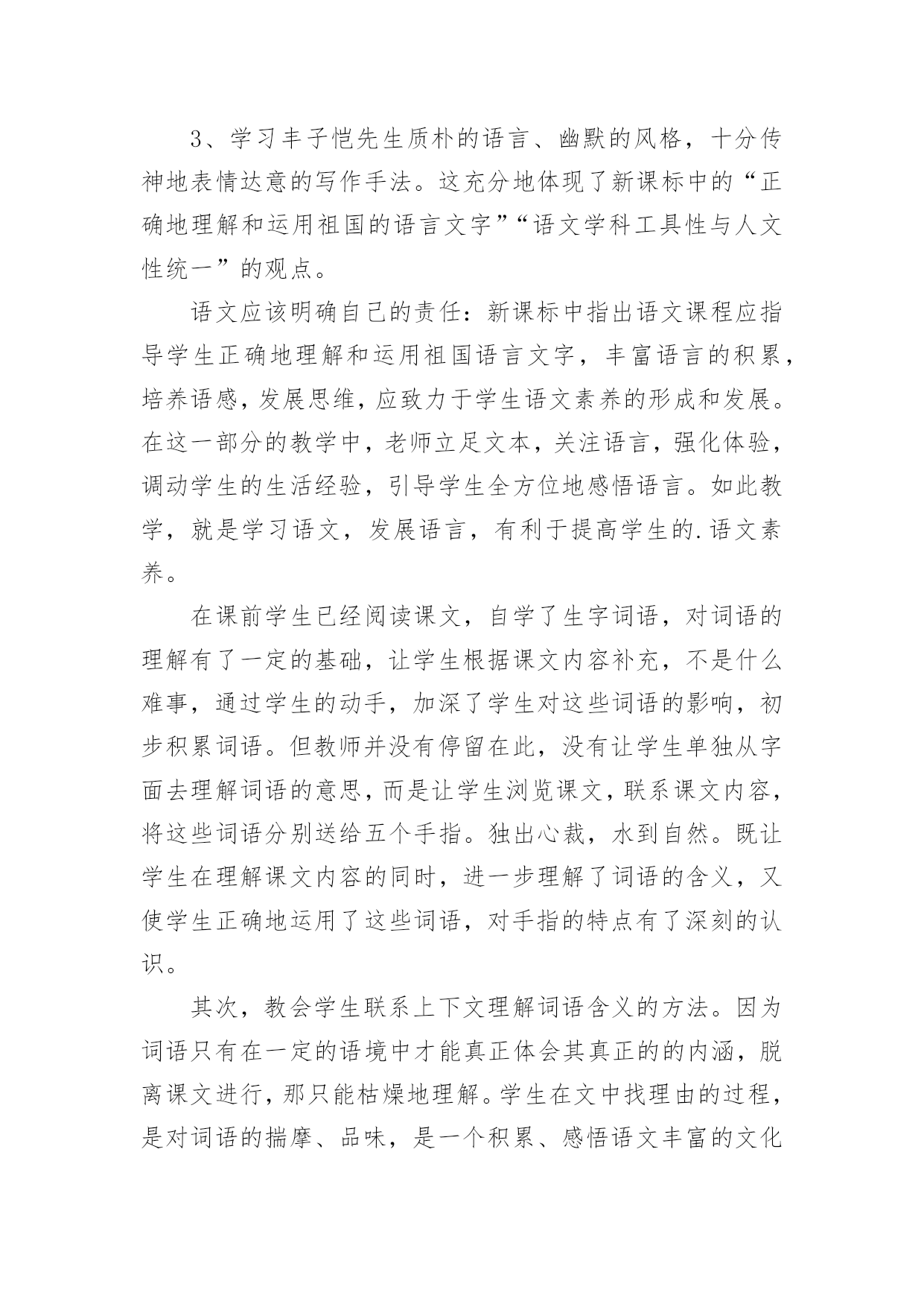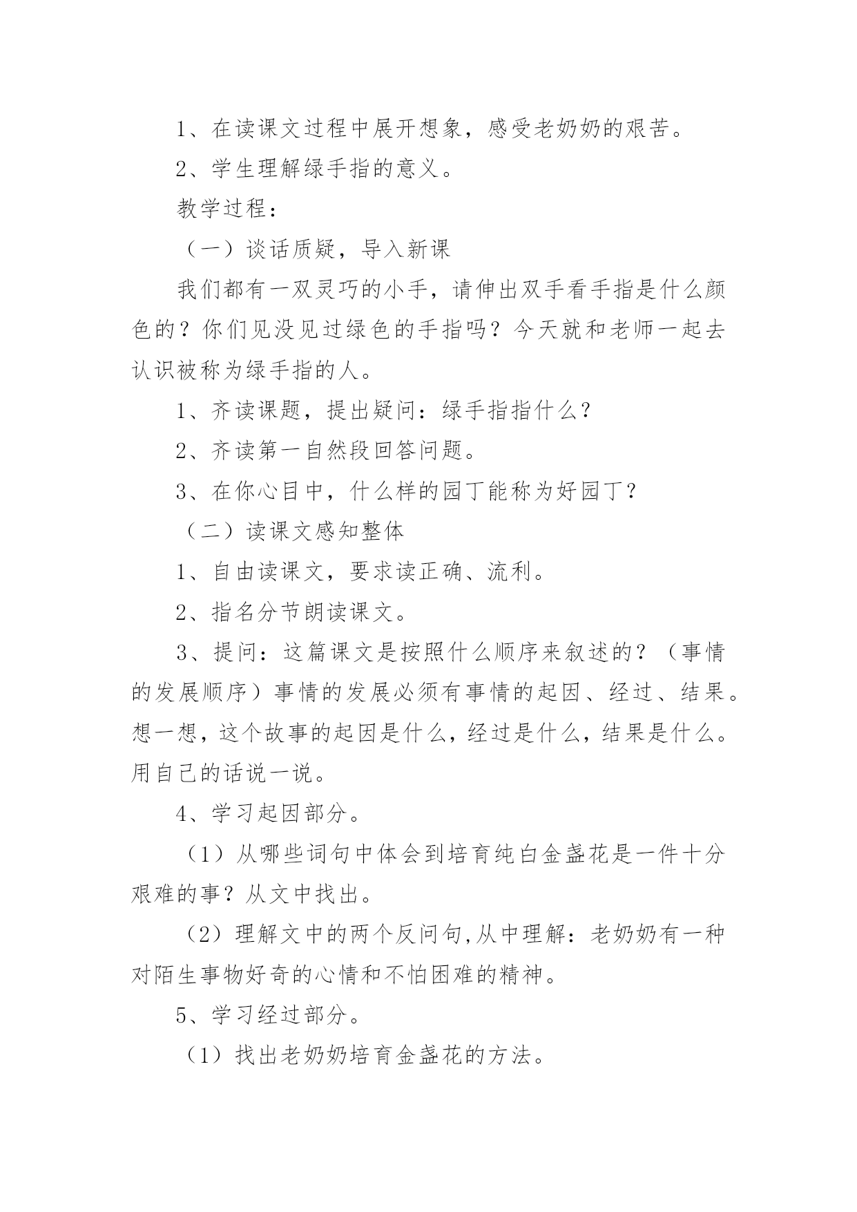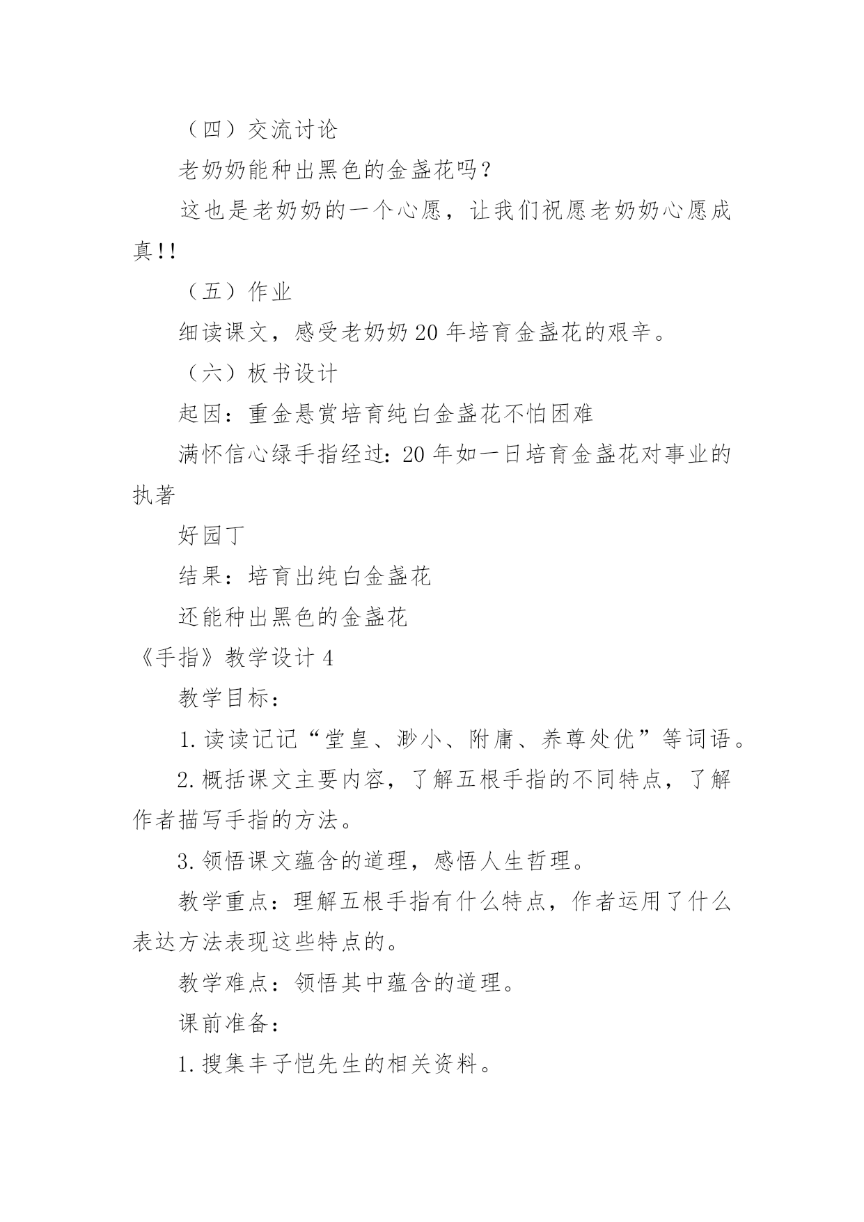 《手指》教学设计《手指》教学设计作为一名辛苦耕耘的教育工作者,时常需要编写教学设计,教学设计是把教学原理转化为教学材料和教学活动的计划。我们应该怎么写教学设计呢?以下是小编整理的《手指》教学设计,欢迎阅读,希望大家能够喜欢。《手指》教学设计1设计意图双手是幼儿非常熟悉的身体部位,不管在生活中还是教学活动中都离不开双手的应用,另外在《指南》的健康领域特别强调幼儿手的动作灵活协调。游戏是幼儿的天性,《规程》明确提出幼儿园教育要以游戏为基本活动。本活动借助一个有趣的手指游戏,拟人化地认识手指及其基本特点,并且配上韵律感强的儿歌,促进幼儿手口协调、手眼协调等多方面的发展。一、活动目标1.通过拟人化角色了解五个手指的大致特点2.能根据儿歌做出对应的`手指动作3.体验用手指表演儿歌的快乐二、活动过程1.问好导入利用手指上的小人画,引起幼儿的兴趣。2.认识手指利用拟人化的角色逐个和小朋友问好,了解五个手指的大致特点3.小结两只手一起温习一遍五个手指的名称及大致特点4.教师手部展示教师展示双手部分的完整手指游戏5.详细讲解教师逐个讲解动作及儿歌内容6.完整展示教师读儿歌完整做一遍手指游戏7.幼儿展示幼儿和教师一起完整做出手指游戏8.总结9.结束三、活动延伸1.区角游戏:在表演区投放手指人偶,戴上手偶进行表演游戏2.日常活动:可作为其他教学活动的准备活动,餐前活动等小班手指游戏《我的小小手》微反思一、内容反思本活动选择了幼儿非常熟悉的身体部位——双手。在生活中做任何事情都离不开双手,了解双手以及每个手指有助于幼儿双手的灵活运用。小班幼儿第一学期很重要的一方面培养就是自理能力的培养,学会怎么穿衣服、怎么提裤子、怎么用勺子正确吃饭、怎么叠小被子都需要双手的灵活运用。而手指游戏,借助有韵律感的儿歌再加上拟人化的情境使幼儿被吸引并很快融入,再游戏过程中愉快轻松地就了解了双手。二、环节反思本活动一共设置了四个主要环节,分别是问好导入、认识手指、详细讲解、完整示范。导入环节我模仿卡通人物和小朋友打招呼,吸引幼儿,并且我用提前在手指上画了小人的双手和幼儿挥手问好,激发幼儿的兴趣,环节过渡较自然。紧接着我就进行了详细讲解,用特写镜头依次介绍大拇哥、二拇弟等,在介绍的时候利用角色化的语言和小朋友打招呼,较有趣能持续吸引幼儿的注意,但是在这个过程中我没有给幼儿提供主动的探索机会,幼儿只是像听故事一样,互动性不够。在介绍时,可以先让幼儿自己观察,并且用语言表达自己观察到的,教师引导下可以让幼儿一起给手指起名字等,最后就形成一个原创的手指游戏,提升幼儿的成就感。详细讲解环节,教师加上了动作,要给幼儿充分练习手指动作的时间,因为小班幼儿的手指精细动作还未成熟,最后用完整展示,系统性地熟练手指游戏,语言和动作的节奏把握较好,适合幼儿跟做练习。除了主要环节,中间还有小结、细节展示,和总结,帮助幼儿巩固。三、教法反思本活动本身是一个小游戏,游戏法是幼儿喜闻乐见的教法,适合其身心特点,在游戏中幼儿的情绪情感也能得到正向发展。另外还有情境法,创设了大拇哥等五个不同的角色,并且像认识小朋友一样去认识他们,给幼儿一个社交类的情境,幼儿处于直观思维,很容易融入其中。最后用示范法,重复手指游戏,教师直接用自己的双手示范,幼儿直观地看到,模仿。四、技术反思作为一名幼儿教师,我掌握的拍摄、编辑方面的技术还不够,在视频设计中技术创新不够,拍摄角度及背景音乐编辑方面还有待提高,特写镜头分辨率掌握不够。《手指》教学设计2《手指》是丰子恺先生写的一篇散文。文章开门见山指出每个人都有十根手指,一只手上的五根手指各有所长,各有所短。接着就以风趣幽默的语言具体描写五根手指的不同的姿态和性格。最后阐明了一个道理,“五根手指如果能团结一致,成为一个拳头,那就根根有用,根根有力量,不再有什么强弱、美丑之分了”。本文是一篇略读课文,新课标中对略读的要求是“粗知文章大意”,六年级的学生已经具有很强的独立阅读能力,因此本课的设计理念主要有两点:1、简单教学,注重语言文字:在落实词、句的基础上,引领学生感悟课文。2、动态生成:设计矛盾冲突,引发思维碰撞,培养个性阅读体验。从而本课的教学目标有三方面:1、学会生字词语,正确流利有感情地朗读课文。2、正确领悟课文,懂得团结一致力量大的道理。3、学习丰子恺先生质朴的语言、幽默的风格,十分传神地表情达意的写作手法。这充分地体现了新课标中的“正确地理解和运用祖国的语言文字”“语文学科工具性与人文性统一”的观点。语文应该明确自己的责任:新课标中指出语文课程应指导学生正确地理解和运用祖国语言文字,丰富语言的积累,培养语感,发展思维,应致力于学生语文素养的形成和发展。在这一部分的教学中,老师立足文本,关注语言,强化体验,调动学生的生活经验,引导学生全方位地感悟语言。如此教学,就是学