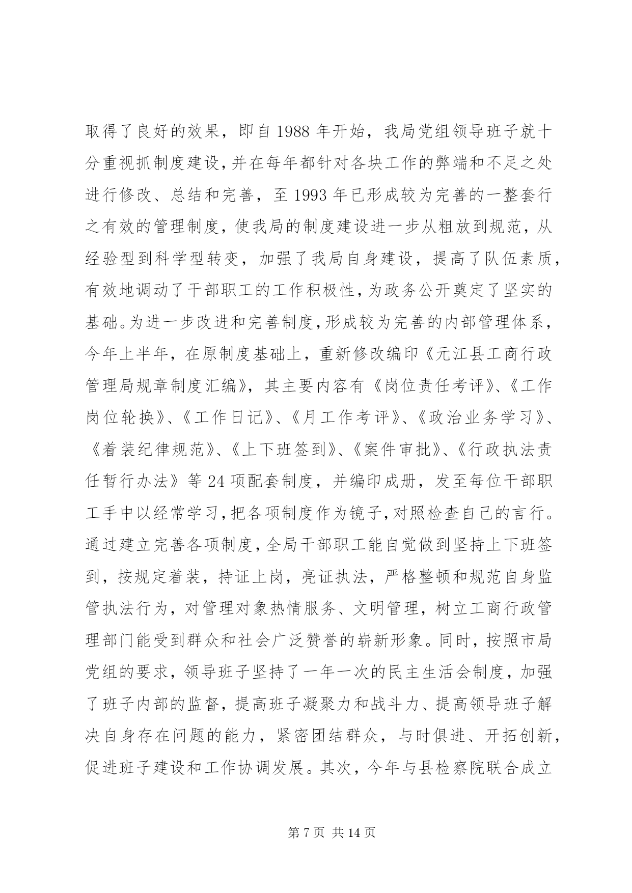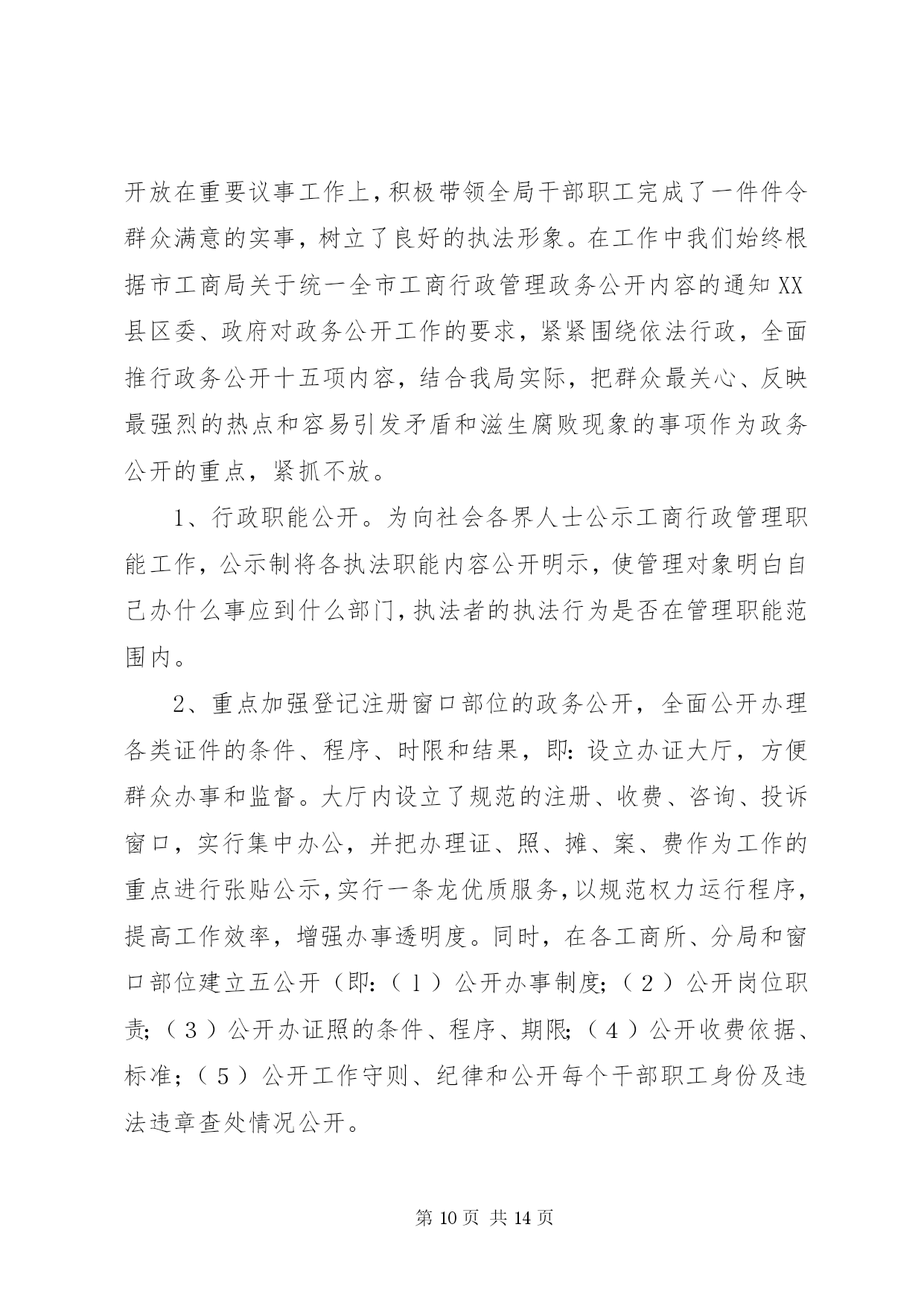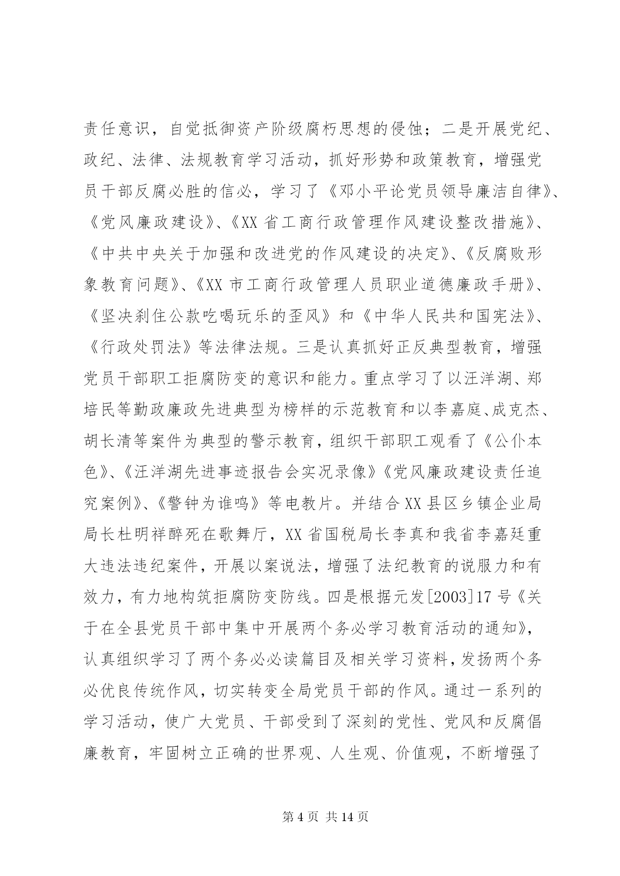 第PAGE\*Arabic\*MERGEFORMAT14页共NUMPAGES\*MERGEFORMAT14页工商系统党风廉正建设工作总结加强党风廉政建设,是从严治政的重要内容和迫切需要,是国家长治久安的需要,也是党和政府始终保持与人民群众血肉联系的重要保证,对于凝聚党心、民心有着极其重要的意义。作为行政执法队伍之一的工商行政管理机关,国家赋予我们工商部门主管市场经济监督管理和行政执法职能,在行使其职权的每个工商干部手中都有一定的权力。为此,我局党组高度重视党风廉政建设工作,为进一步加大从源头上预防和治理腐败力度,加强党风廉政建设和反腐败工作,促进工商行政管理各项事业的发展。近年来,紧紧围绕党风廉政建设和反腐败工作总体要求,认真贯彻学习十六大精神,努力实践三个代表重要思想,落实国务院廉政工作会议、XX省政府廉政工作会议、全国工商系统党风廉政工作会议以及党中央、国务院《关于实行党风廉政建设责任制的规定》,推动我局党风廉政建设和反腐败斗争深入开展,有力地促进了全局工商行政管理各项事业的发展,为地方经济的发展起到了保驾护航作用。一、党组重视,建立组织机构,层层签订党风廉政建设责任书,严格执行责任追究制(一)党组高度重视,建立健全机构为提高全局工商干部职工的政治思想觉悟和党风廉政建设责任目标意识,确保党风廉政建设工作取得成效,根据中共中央、国务院《关于实行党风廉政建设责任制的规定》,我局明确抓好党风廉政建设工作是党组的首要责任,将党风廉政建设列入党组重要议事日程工作,成立了由党组书记、局长任组长,纪检组长、副局长任副组长,各职能科室、分局、所负责人任成员的元江县工商行政管理局党风廉政建设领导小组,把党风廉政建设工作纳入工商工作重点,坚持把党风廉政建设和其他业务工作紧密结合,做到一起布置、一起落实、一起检查、一起考核。同时,又设置纪检监察室机构,配备专职纪检监察干部,成立卫士行动督察小组,加强督察工作力度,从组织上保证党风廉政建设工作落到实处,促进工商行政管理工作协调发展。(二)明确责任,完善和签订目标责任书党风廉政建设责任制是一项具有全局性、关键性和根本性的党风廉政制度,不仅把党风廉政建设和反腐斗争纳入了法制轨道,而且对各级领导班子和领导干部在党风廉政建设和反腐工作中应负的责任追究等问题作了制度性规定。对此,我局党组要求各领导干部按照党风廉政建设责任制的规定,自觉履行好各自在党风廉政建设中的职责。并根据中共中央、国务院《关于实行党风廉政建设责任制的规定》,为提高全局干部的政治思想觉悟和党风廉政建设责任目标意识,贯彻落实中纪委提出的党风廉政建设工作实行党委统一领导,党政齐抓共管,纪检机关组织协调,部门各负其责,依靠群众支持和参与的反腐领导体制和工作机制的要求,营造齐抓共管的格局,每年年初党组书记、局长与各职能科(室)、分局、工商所负责人签订了《党风廉政建设目标责任书》,同时,各科(室)、分局、所负责人又细化到与科员、所员层层签订责任书,形成了主要领导负总责,分工明确,一级抓一级,责任到人,上下协调,齐抓共管,全员参加的党风建设工作格局。以此同时,我局还印发《XX市工商行政管理系统党风廉政建设责任制实施办法》,对责任考核和责任追究作了明确的规定,使党风廉政建设的任务和责任落实到了每个部门和各个环节,年底进行考核表彰奖励,使我局的党风廉政建设工作切切实实做到了有部署、有落实、有检查、有考核、有奖励。二、加强学习,统一思想,提高认识,增强反腐倡廉意识我局党组历来注重加强干部职工政治思想、业务知识和职业道德及勤政廉政教育培训工作,不断提高干部职工的综合素质和增强反腐倡廉意识,坚持利用每周五为学习日。一是组织学习政治思想、理论政策,认真开展理想、信念、宗旨和社会主义道德教育,学习了江总书记三个代表重要思想、七一重要讲话、党的十六报告精神,学习毛泽东《为人民服务》、《关于讲政治》、《努力建设高素质的干部队伍》、和《中国共产党章程》及党的十五届六中全会、省第七次党代会精神和省纪委有关党风廉政建设的重要讲话,引导党员、干部职工进一步坚定共产主义和建设有中国特色社会主义的理想信念,增强全心全意为人民服务的宗旨和责任意识,自觉抵御资产阶级腐朽思想的侵蚀;二是开展党纪、政纪、法律、法规教育学习活动,抓好形势和政策教育,增强党员干部反腐必胜的信必,学习了《邓小平论党员领导廉洁自律》、《党风廉政建设》、《XX省工商行政管理作风建设整改措施》、《中共中央关于加强和改进党的作风建设的决定》、《反腐败形象教育问题》、《XX市工商行政管理人员职业道德廉政手册》、《坚决刹住公款吃喝玩乐的歪风》和《中华人民共和国宪法》、《行政处罚法》等法律法规。三是认真抓好正反典型教育,增强党员干部职工拒腐防变的意识和能力。重点学习了以汪洋湖、郑培民等勤政廉政先进典