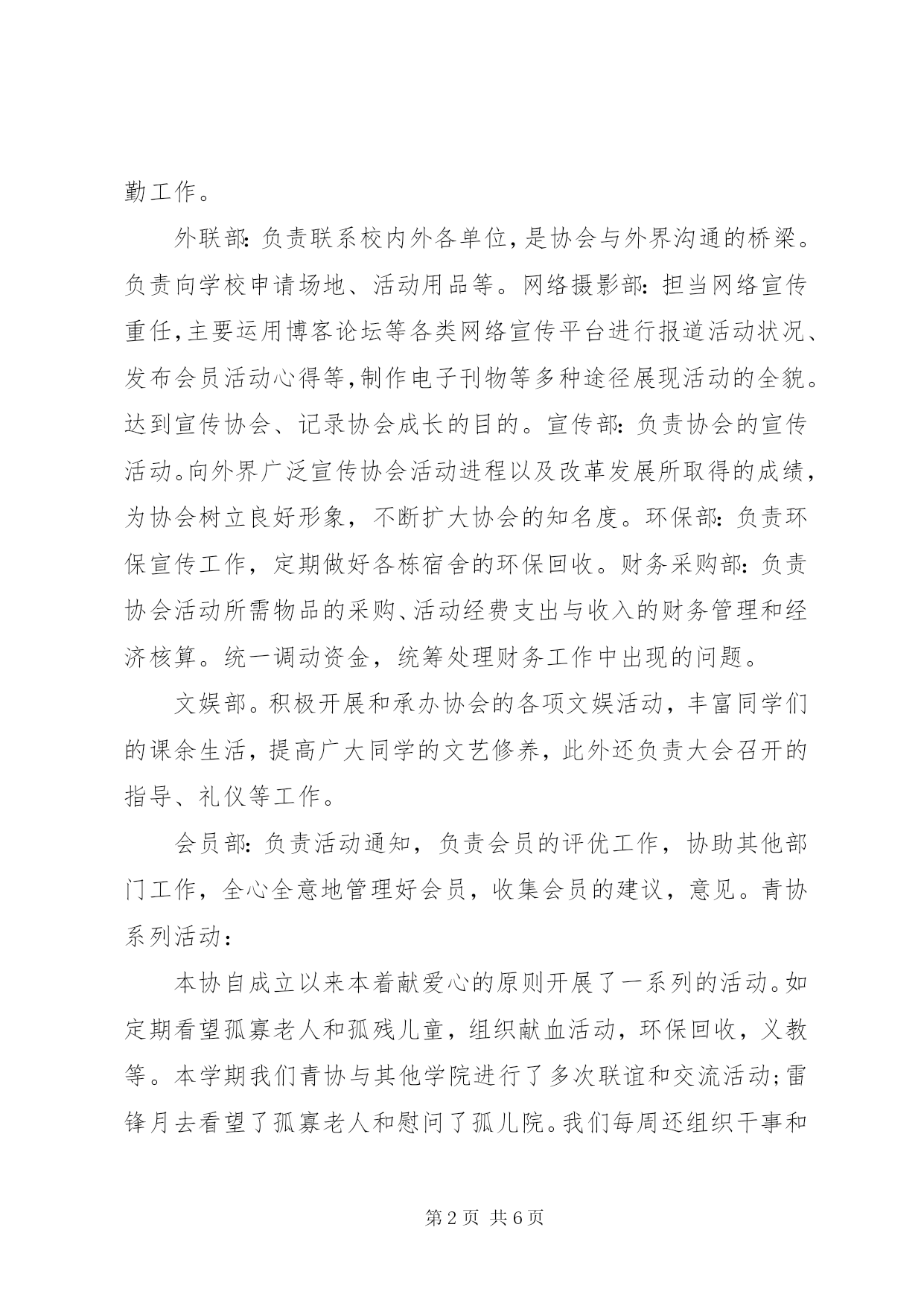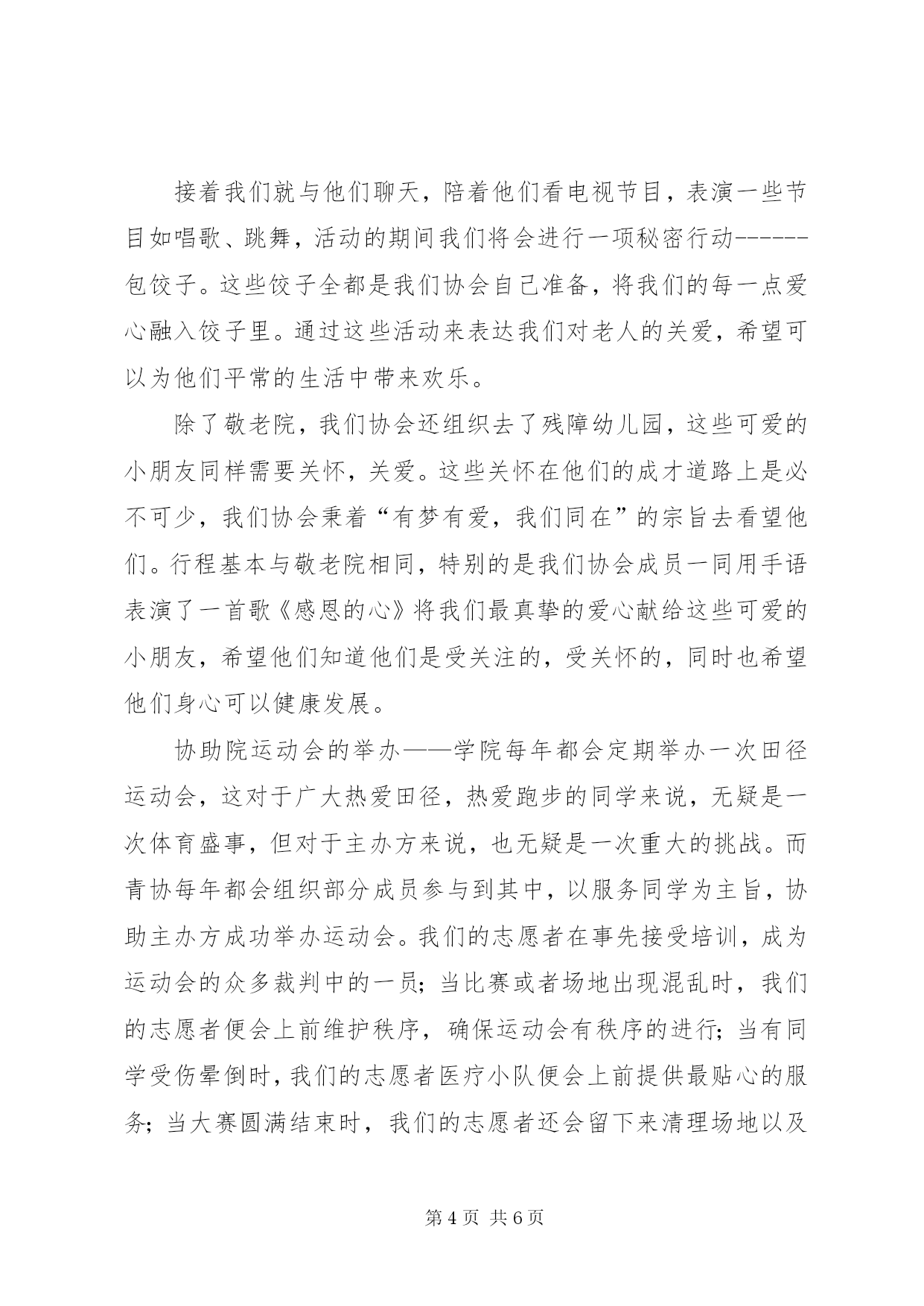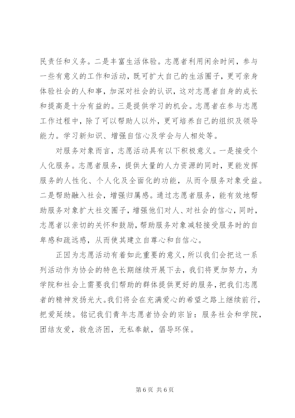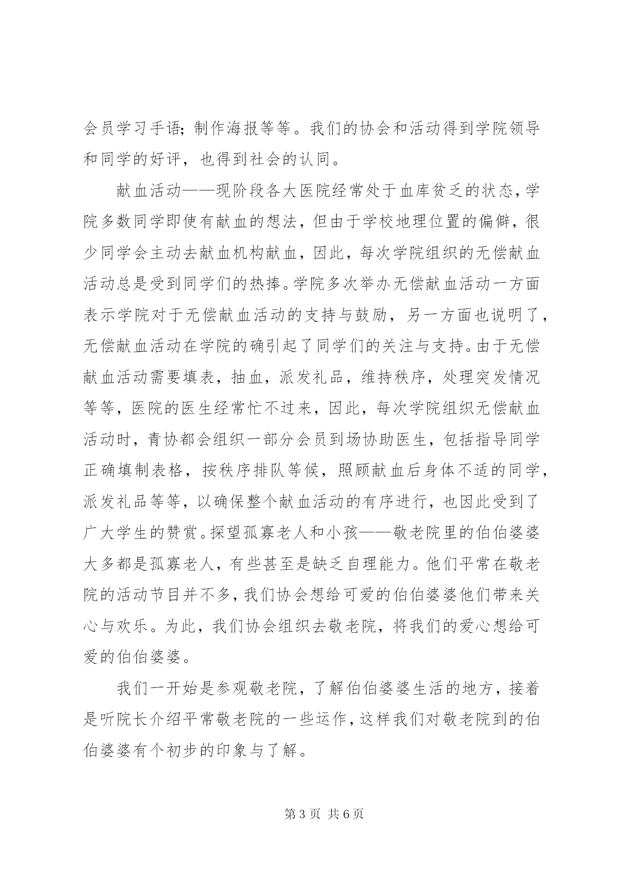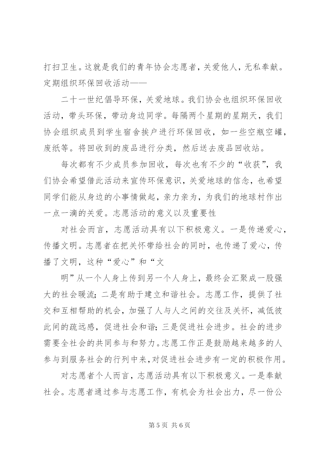第PAGE\*Arabic\*MERGEFORMAT6页共NUMPAGES\*MERGEFORMAT6页青年协会志愿者公共形象宣传书青协简介中山大学南方学院青年志愿者协会是院党委和团委领导下的有志愿从事校园及社会公益的在校学生组成的,立足校园,面向社会,组织领导全员志愿者,培养大学生社会责任感,增强大学生社会服务意识的学生团体。中山大学南方学院青年志愿者协会由爱心协会和青年志愿者服务站于2008年10月21日正式合并形成。他自成立以来,在志愿者的努力下,现已经成长为一个蓬勃向上的拥有三百多名成员的社团。性质:中山大学南方学院青协是由青年志愿者服务站和爱心协会合并而成。宗旨:服务社会和学院,团结友爱,救危济困,无私奉献,倡导环保。口号:有梦有爱,我们同在。部门。青协现设有秘书处,组织部,外联部,网络摄影部,宣传部,环保部,财务采购部,文娱部和会员部九个部门。青年志愿者协会各部门简介秘书部:负责撰写各项活动总结和记录各项会议。必要时向宣传部和网络摄影部提供文字资料。组织部。负责社团活动的策划、组织及后勤保障工作,抓好协会干部队伍的作风建设和管理工作,健全和完善对干事的监督制约机制,对协会的人事调动及时做好记录,以及每次活动的考勤工作。外联部:负责联系校内外各单位,是协会与外界沟通的桥梁。负责向学校申请场地、活动用品等。网络摄影部:担当网络宣传重任,主要运用博客论坛等各类网络宣传平台进行报道活动状况、发布会员活动心得等,制作电子刊物等多种途径展现活动的全貌。达到宣传协会、记录协会成长的目的。宣传部:负责协会的宣传活动。向外界广泛宣传协会活动进程以及改革发展所取得的成绩,为协会树立良好形象,不断扩大协会的知名度。环保部:负责环保宣传工作,定期做好各栋宿舍的环保回收。财务采购部:负责协会活动所需物品的采购、活动经费支出与收入的财务管理和经济核算。统一调动资金,统筹处理财务工作中出现的问题。文娱部。积极开展和承办协会的各项文娱活动,丰富同学们的课余生活,提高广大同学的文艺修养,此外还负责大会召开的指导、礼仪等工作。会员部:负责活动通知,负责会员的评优工作,协助其他部门工作,全心全意地管理好会员,收集会员的建议,意见。青协系列活动:本协自成立以来本着献爱心的原则开展了一系列的活动。如定期看望孤寡老人和孤残儿童,组织献血活动,环保回收,义教等。本学期我们青协与其他学院进行了多次联谊和交流活动;雷锋月去看望了孤寡老人和慰问了孤儿院。我们每周还组织干事和会员学习手语;制作海报等等。我们的协会和活动得到学院领导和同学的好评,也得到社会的认同。献血活动——现阶段各大医院经常处于血库贫乏的状态,学院多数同学即使有献血的想法,但由于学校地理位置的偏僻,很少同学会主动去献血机构献血,因此,每次学院组织的无偿献血活动总是受到同学们的热捧。学院多次举办无偿献血活动一方面表示学院对于无偿献血活动的支持与鼓励,另一方面也说明了,无偿献血活动在学院的确引起了同学们的关注与支持。由于无偿献血活动需要填表,抽血,派发礼品,维持秩序,处理突发情况等等,医院的医生经常忙不过来,因此,每次学院组织无偿献血活动时,青协都会组织一部分会员到场协助医生,包括指导同学正确填制表格,按秩序排队等候,照顾献血后身体不适的同学,派发礼品等等,以确保整个献血活动的有序进行,也因此受到了广大学生的赞赏。探望孤寡老人和小孩——敬老院里的伯伯婆婆大多都是孤寡老人,有些甚至是缺乏自理能力。他们平常在敬老院的活动节目并不多,我们协会想给可爱的伯伯婆婆他们带来关心与欢乐。为此,我们协会组织去敬老院,将我们的爱心想给可爱的伯伯婆婆。我们一开始是参观敬老院,了解伯伯婆婆生活的地方,接着是听院长介绍平常敬老院的一些运作,这样我们对敬老院到的伯伯婆婆有个初步的印象与了解。接着我们就与他们聊天,陪着他们看电视节目,表演一些节目如唱歌、跳舞,活动的期间我们将会进行一项秘密行动------包饺子。这些饺子全都是我们协会自己准备,将我们的每一点爱心融入饺子里。通过这些活动来表达我们对老人的关爱,希望可以为他们平常的生活中带来欢乐。除了敬老院,我们协会还组织去了残障幼儿园,这些可爱的小朋友同样需要关怀,关爱。这些关怀在他们的成才道路上是必不可少,我们协会秉着“有梦有爱,我们同在”的宗旨去看望他们。行程基本与敬老院相同,特别的是我们协会成员一同用手语表演了一首歌《感恩的心》将我们最真挚的爱心献给这些可爱的小朋友,希望他们知道他们是受关注的,受关怀的,同时也希望他们身心可以健康发展。协助院运动会的举办——学院每年都会定期举办一次田径运动会,这对于广大热爱田径,热爱跑步的同学来说,无疑是一次体育盛事,但对于主办方来说,也无疑是一次重大的挑战。而青协每年都会组织部分成员参与到其中,以服务同学为主旨,协助