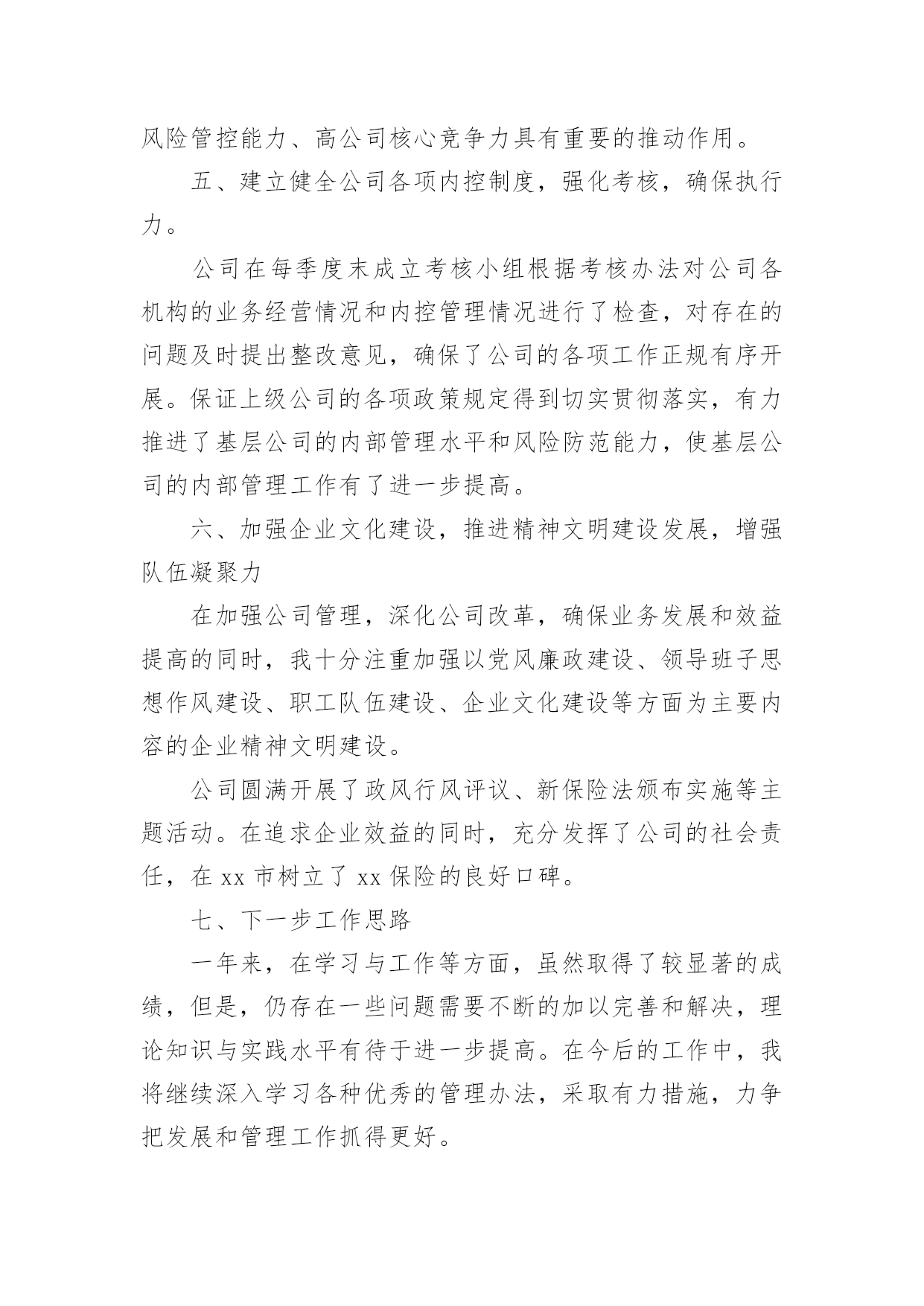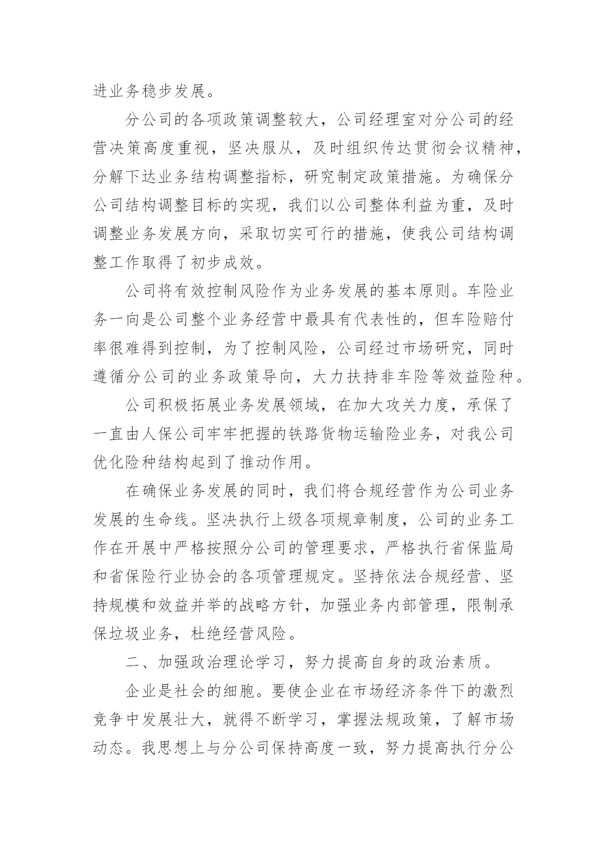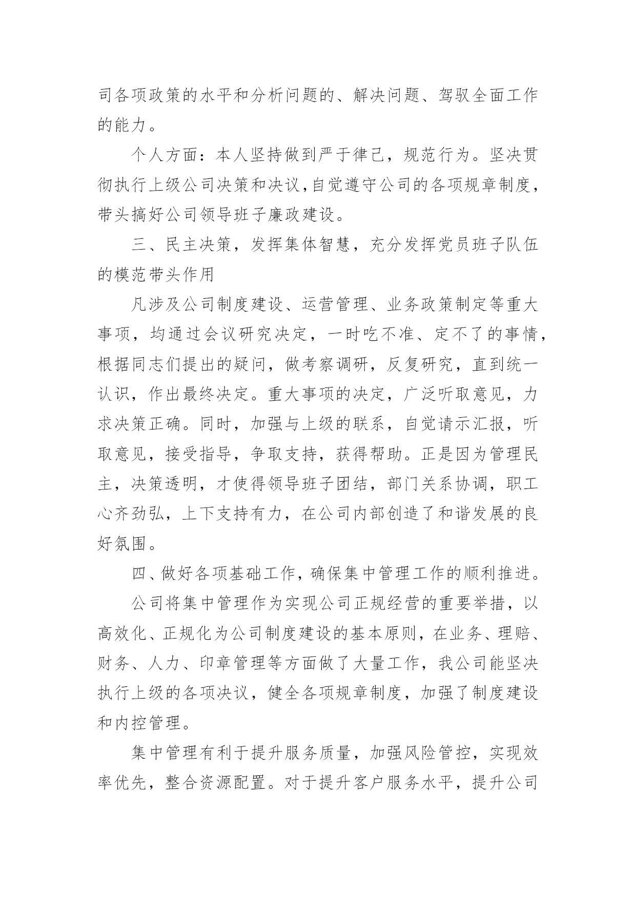 保险公司述职报告保险公司述职报告随着个人的素质不断提高,报告不再是罕见的东西,写报告的时候要注意内容的完整。那么一般报告是怎么写的呢?以下是小编帮大家整理的保险公司述职报告,仅供参考,希望能够帮助到大家。各位领导:大家好!自xx保险在xx这片土地上扎根,我们已经携手走过了五年的时间,今天,我首先要向在座的各位致以由衷的谢意。感谢大家一年来辛勤的付出。谢谢大家!五年来,在分公司总经理室的正确领导下,在公司各位同仁的积极配合和协助下,我们克服各种困难,开拓创新、努力拼搏。经过全体员工的不懈努力,公司经营管理工作取得了明显成效,各项管理显著提高,职工精神面貌焕然一新。下面,我将一年来的工作情况向全体同仁报告如下,请大家评议。一、主要经营数据及业务开展情况在,公司业务发展面临着很大的压力和困难。为了确保各项经营目标的实现,公司班子成员团结协作,公司全体员工集思广益,开拓业务新领域,采取积极有效措施,努力推进业务稳步发展。分公司的各项政策调整较大,公司经理室对分公司的经营决策高度重视,坚决服从,及时组织传达贯彻会议精神,分解下达业务结构调整指标,研究制定政策措施。为确保分公司结构调整目标的实现,我们以公司整体利益为重,及时调整业务发展方向,采取切实可行的措施,使我公司结构调整工作取得了初步成效。公司将有效控制风险作为业务发展的基本原则。车险业务一向是公司整个业务经营中最具有代表性的,但车险赔付率很难得到控制,为了控制风险,公司经过市场研究,同时遵循分公司的业务政策导向,大力扶持非车险等效益险种。公司积极拓展业务发展领域,在加大攻关力度,承保了一直由人保公司牢牢把握的铁路货物运输险业务,对我公司优化险种结构起到了推动作用。在确保业务发展的同时,我们将合规经营作为公司业务发展的生命线。坚决执行上级各项规章制度,公司的业务工作在开展中严格按照分公司的管理要求,严格执行省保监局和省保险行业协会的各项管理规定。坚持依法合规经营、坚持规模和效益并举的战略方针,加强业务内部管理,限制承保垃圾业务,杜绝经营风险。二、加强政治理论学习,努力提高自身的政治素质。企业是社会的细胞。要使企业在市场经济条件下的激烈竞争中发展壮大,就得不断学习,掌握法规政策,了解市场动态。我思想上与分公司保持高度一致,努力提高执行分公司各项政策的水平和分析问题的、解决问题、驾驭全面工作的能力。个人方面:本人坚持做到严于律己,规范行为。坚决贯彻执行上级公司决策和决议,自觉遵守公司的各项规章制度,带头搞好公司领导班子廉政建设。三、民主决策,发挥集体智慧,充分发挥党员班子队伍的模范带头作用凡涉及公司制度建设、运营管理、业务政策制定等重大事项,均通过会议研究决定,一时吃不准、定不了的事情,根据同志们提出的疑问,做考察调研,反复研究,直到统一认识,作出最终决定。重大事项的决定,广泛听取意见,力求决策正确。同时,加强与上级的联系,自觉请示汇报,听取意见,接受指导,争取支持,获得帮助。正是因为管理民主,决策透明,才使得领导班子团结,部门关系协调,职工心齐劲弘,上下支持有力,在公司内部创造了和谐发展的良好氛围。四、做好各项基础工作,确保集中管理工作的顺利推进。公司将集中管理作为实现公司正规经营的重要举措,以高效化、正规化为公司制度建设的基本原则,在业务、理赔、财务、人力、印章管理等方面做了大量工作,我公司能坚决执行上级的各项决议,健全各项规章制度,加强了制度建设和内控管理。集中管理有利于提升服务质量,加强风险管控,实现效率优先,整合资源配置。对于提升客户服务水平,提升公司风险管控能力、高公司核心竞争力具有重要的推动作用。五、建立健全公司各项内控制度,强化考核,确保执行力。公司在每季度末成立考核小组根据考核办法对公司各机构的业务经营情况和内控管理情况进行了检查,对存在的问题及时提出整改意见,确保了公司的各项工作正规有序开展。保证上级公司的各项政策规定得到切实贯彻落实,有力推进了基层公司的内部管理水平和风险防范能力,使基层公司的内部管理工作有了进一步提高。六、加强企业文化建设,推进精神文明建设发展,增强队伍凝聚力在加强公司管理,深化公司改革,确保业务发展和效益提高的同时,我十分注重加强以党风廉政建设、领导班子思想作风建设、职工队伍建设、企业文化建设等方面为主要内容的企业精神文明建设。公司圆满开展了政风行风评议、新保险法颁布实施等主题活动。在追求企业效益的同时,充分发挥了公司的社会责任,在xx市树立了xx保险的良好口碑。七、下一步工作思路一年来,在学习与工作等方面,虽然取得了较显著的成绩,但是,仍存在一些问题需要不断的加以完善和解决,理论知识与实践水平有待于进一步提高。在今后的工作中,我将继续深入学习各种优秀的管理办法,采取有力措施,力争把发展和管理工作抓得更好。总公司二次创业的号角已经吹响,在公