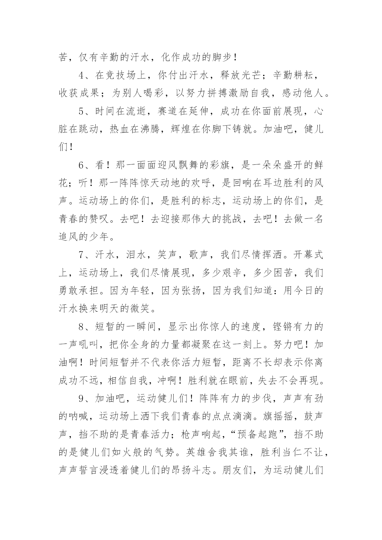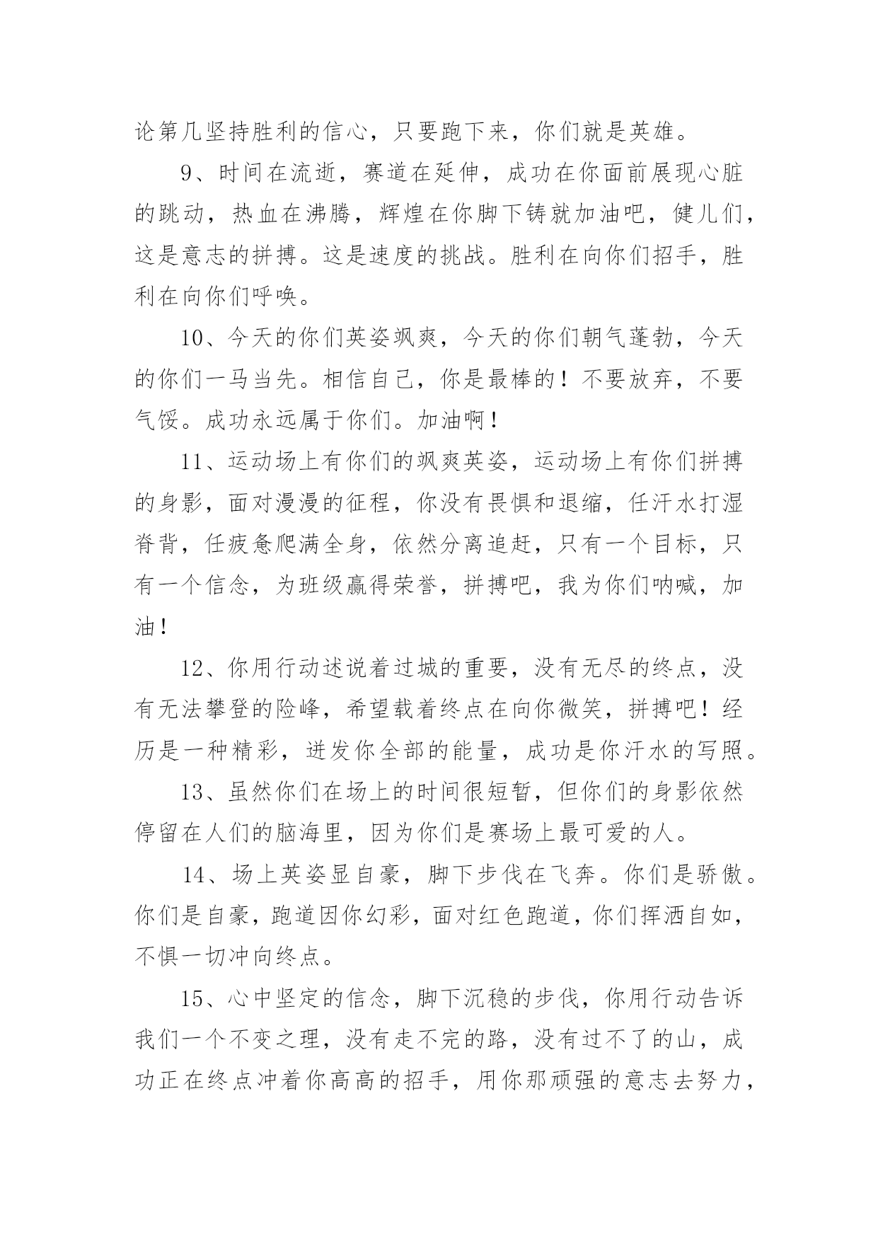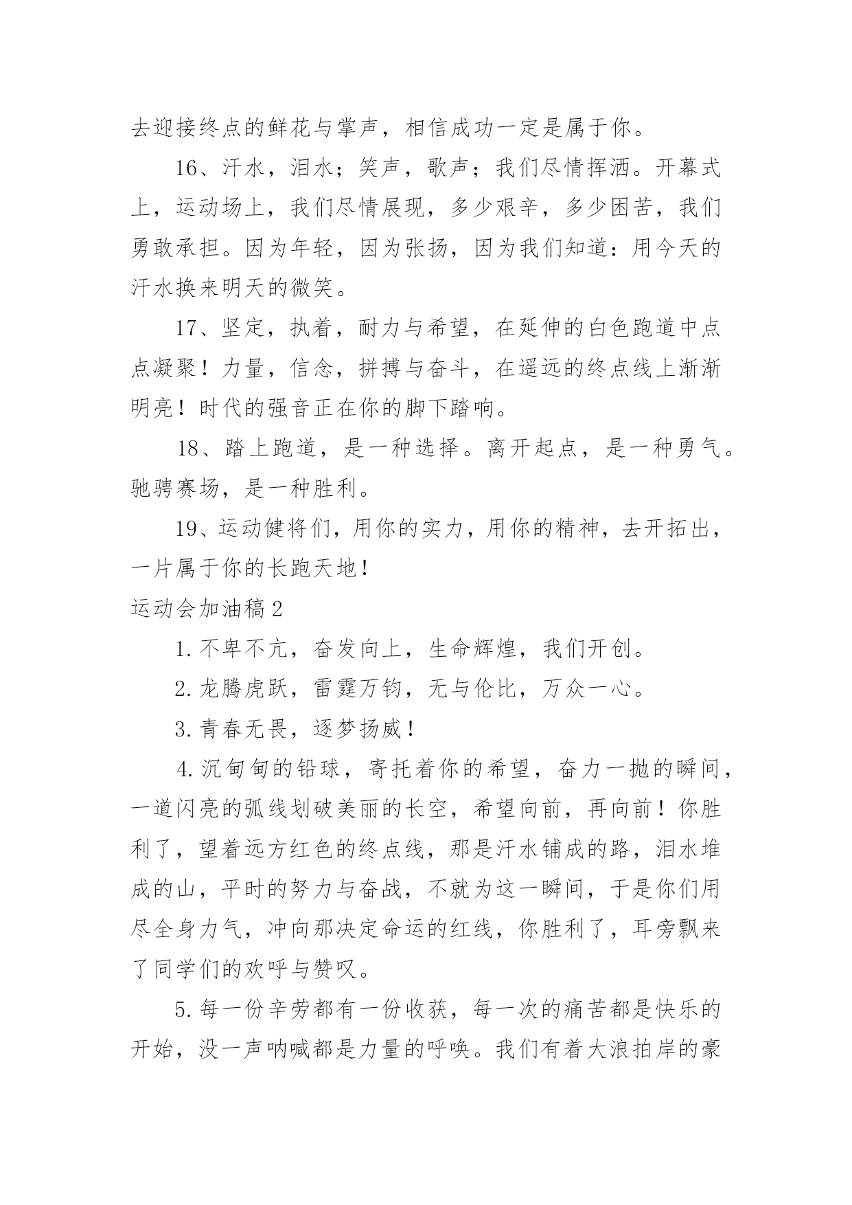 运动会加油稿运动会加油稿随着社会一步步向前发展,我们使用上加油稿的情况与日俱增,加油稿是鼓励激励对方的文稿。怎么写加油稿才能避免踩雷呢?以下是小编精心整理的运动会加油稿,仅供参考,欢迎大家阅读。运动会加油稿11、温暖的阳光洒在赛场上,男子乙组标枪的比赛即将开始。赛场上,一道道优美的弧线将轻盈地划过天空。健儿们用手中的标枪向距离的权限发起一轮又一轮的挑战。标枪在空中轻盈的姿态,是健儿们强健的力量和熟练的技巧的结合。谁能在这场激烈的竞争中获胜?让我们拭目以待,让我们为他们呐喊、助威吧!只有将力量与技巧合二为一的人,才能获得胜利的桂冠!2、有多少次挥汗如雨,伤痛曾添满记忆,只因为始终相信,去拼搏才能胜利。总在鼓舞自己,要成功就得努力。热血在赛场沸腾,巨人在赛场升起。相信自己,你将赢得胜利,创造奇迹;相信自己,梦想在你手中,这是你的天地。当一切过去,你们将是第一。相信自己,你们将超越极限,超越自己!相信自己,加油吧,健儿们,相信你自己。3、年轻的我们自信飞扬,青春的气息如同出生的朝阳,蓬勃的力量如同阳光的挥洒。此时此刻,跑道便是我们精彩的舞台,声声加油便是我们最高的'奖项!论何成功,谈何荣辱,心中的信念只有一个:拼搏!4、广阔的绿茵场,是为你们搭建的舞台。张扬吧,年轻的心,我们将为你永远喝彩!5、泰戈尔在诗中说,天空没有翅膀的影子,但我已飞过;艾青对朋友说,也许有人到达不了彼岸,但我们共同拥有大海。也许你们没有显赫的成绩,但运动场上留下了你们的足迹。也许你们没有奖品,但我们心中留下了你们拼搏的身影。所有的努力都是为了迎接这一刹那,所有的拼搏都是为了这一声令下。6、就像花儿准备了春、秋、冬,就是为了红透整个盛夏。就像雪花经历了春、夏、秋就是为了洁白整个严冬。蹲下,昂首,出发;轻轻的一抬脚,便牵动了全场的目光潇洒的迫挥挥手,便满足了那一份无言的等待。迎着朝阳,你们踏歌而去,背着希望,我们等待你们的归来。7、也许流星并不少见,但它燃烧的刹那,留给人间最美丽的回忆!也许笑脸并不少见,但胜利的喜悦,总会留给世界精彩的一瞬!是的,那些曾经美妙的东西只有短短的一瞬间,但那却把最辉煌的一刻留给了人间。胜利,是每个人所追求的,胜利的喜悦,是胜利与重新开始的转折,胜利是新的开始!8、不长不短的距离,需要的是全身心全程投入,自始至终你们都在拼全力此时此刻,你们处在最风光的一刻,无论第几坚持胜利的信心,只要跑下来,你们就是英雄。9、时间在流逝,赛道在延伸,成功在你面前展现心脏的跳动,热血在沸腾,辉煌在你脚下铸就加油吧,健儿们,这是意志的拼搏。这是速度的挑战。胜利在向你们招手,胜利在向你们呼唤。10、今天的你们英姿飒爽,今天的你们朝气蓬勃,今天的你们一马当先。相信自己,你是最棒的!不要放弃,不要气馁。成功永远属于你们。加油啊!11、运动场上有你们的飒爽英姿,运动场上有你们拼搏的身影,面对漫漫的征程,你没有畏惧和退缩,任汗水打湿脊背,任疲惫爬满全身,依然分离追赶,只有一个目标,只有一个信念,为班级赢得荣誉,拼搏吧,我为你们呐喊,加油!12、你用行动述说着过城的重要,没有无尽的终点,没有无法攀登的险峰,希望载着终点在向你微笑,拼搏吧!经历是一种精彩,迸发你全部的能量,成功是你汗水的写照。13、虽然你们在场上的时间很短暂,但你们的身影依然停留在人们的脑海里,因为你们是赛场上最可爱的人。14、场上英姿显自豪,脚下步伐在飞奔。你们是骄傲。你们是自豪,跑道因你幻彩,面对红色跑道,你们挥洒自如,不惧一切冲向终点。15、心中坚定的信念,脚下沉稳的步伐,你用行动告诉我们一个不变之理,没有走不完的路,没有过不了的山,成功正在终点冲着你高高的招手,用你那顽强的意志去努力,去迎接终点的鲜花与掌声,相信成功一定是属于你。16、汗水,泪水;笑声,歌声;我们尽情挥洒。开幕式上,运动场上,我们尽情展现,多少艰辛,多少困苦,我们勇敢承担。因为年轻,因为张扬,因为我们知道:用今天的汗水换来明天的微笑。17、坚定,执着,耐力与希望,在延伸的白色跑道中点点凝聚!力量,信念,拼搏与奋斗,在遥远的终点线上渐渐明亮!时代的强音正在你的脚下踏响。18、踏上跑道,是一种选择。离开起点,是一种勇气。驰骋赛场,是一种胜利。19、运动健将们,用你的实力,用你的精神,去开拓出,一片属于你的长跑天地!运动会加油稿21.不卑不亢,奋发向上,生命辉煌,我们开创。2.龙腾虎跃,雷霆万钧,无与伦比,万众一心。3.青春无畏,逐梦扬威!4.沉甸甸的铅球,寄托着你的希望,奋力一抛的瞬间,一道闪亮的弧线划破美丽的长空,希望向前,再向前!你胜利了,望着远方红色的终点线,那是汗水铺成的路,泪水堆成的山,平时的努力与奋战,不就为这一瞬间,于是你们用尽全身力气,冲向那决定命运的红线,你胜利了,耳旁飘来了同学们的欢呼与赞叹。5.每一份辛劳都